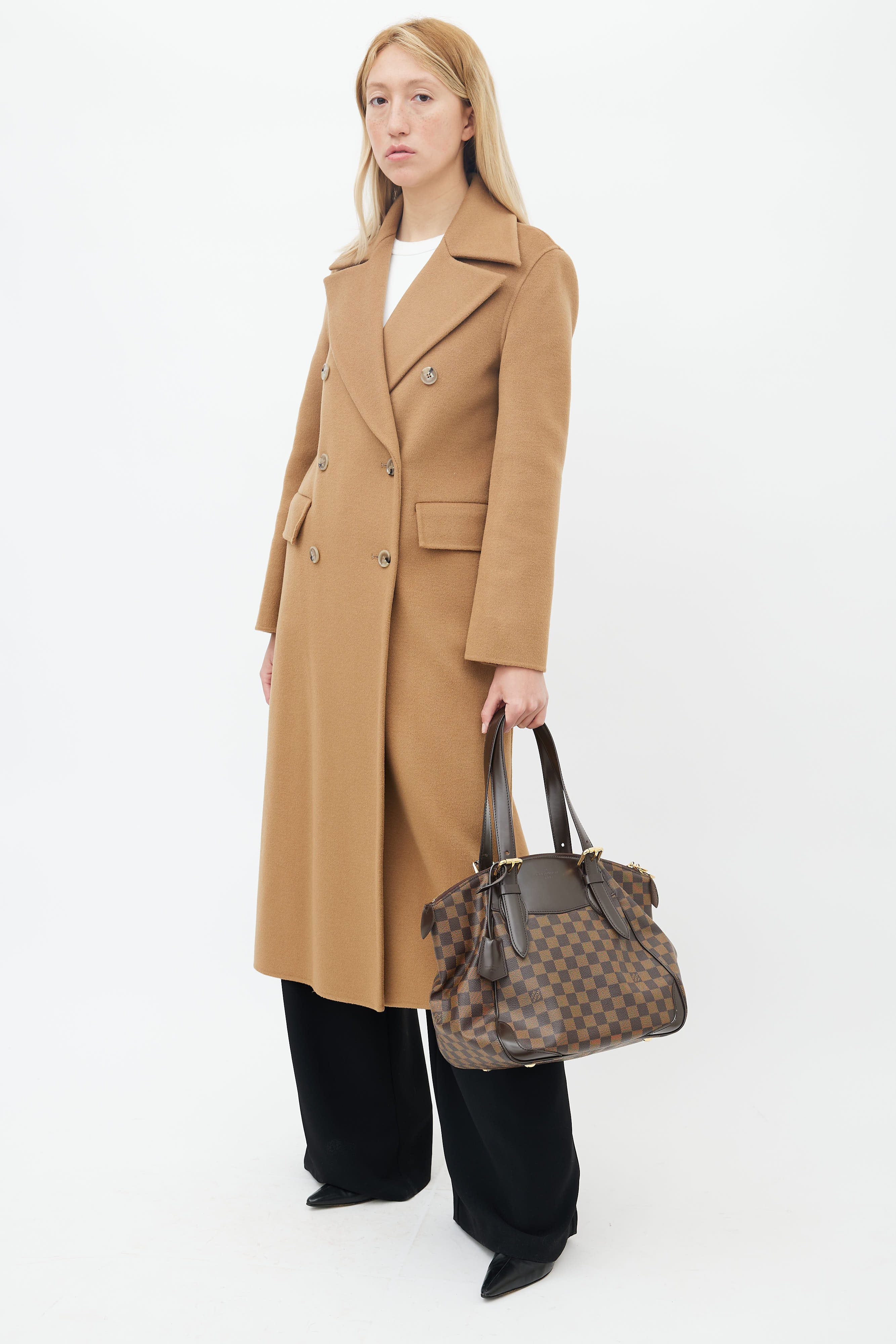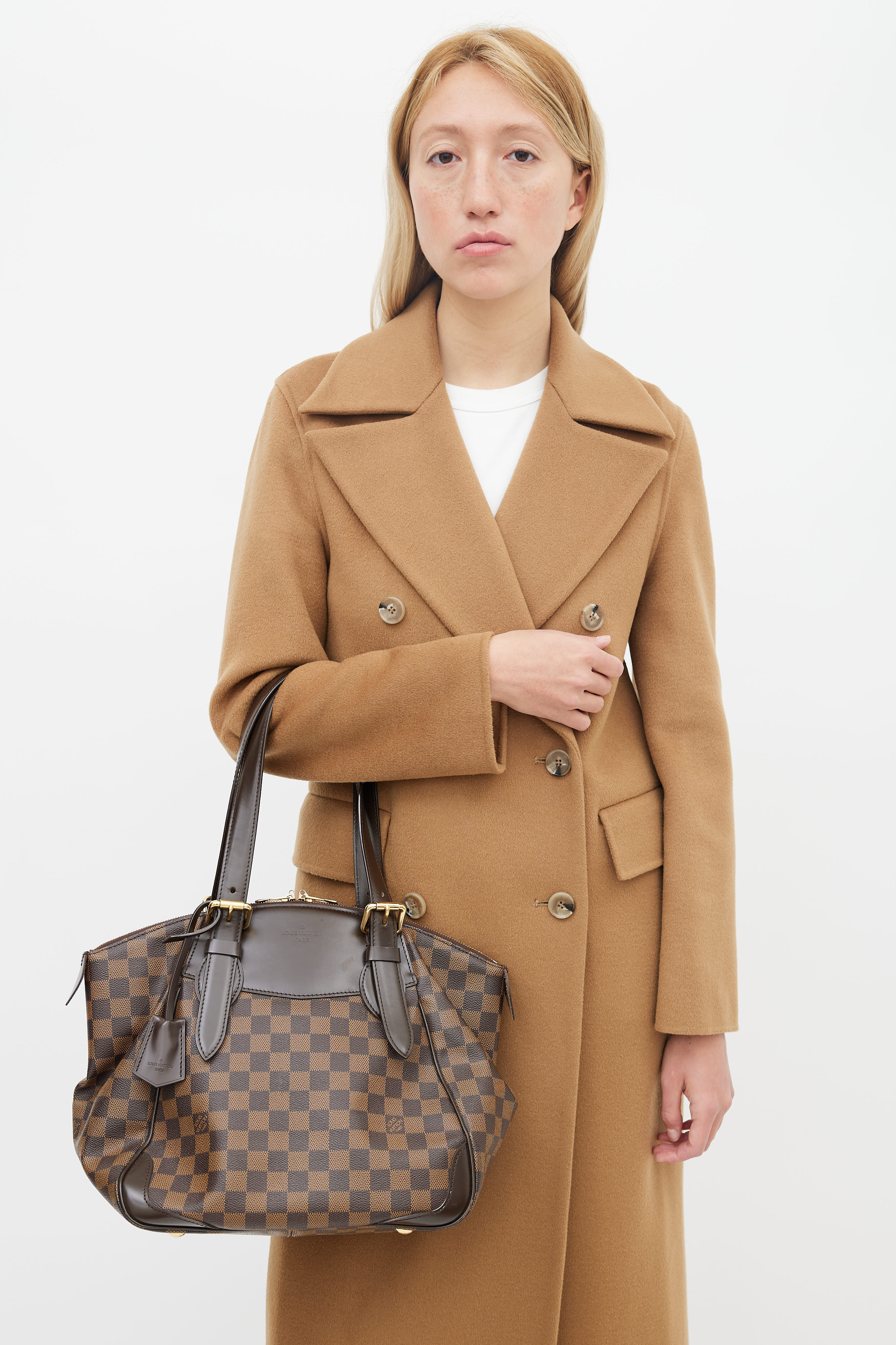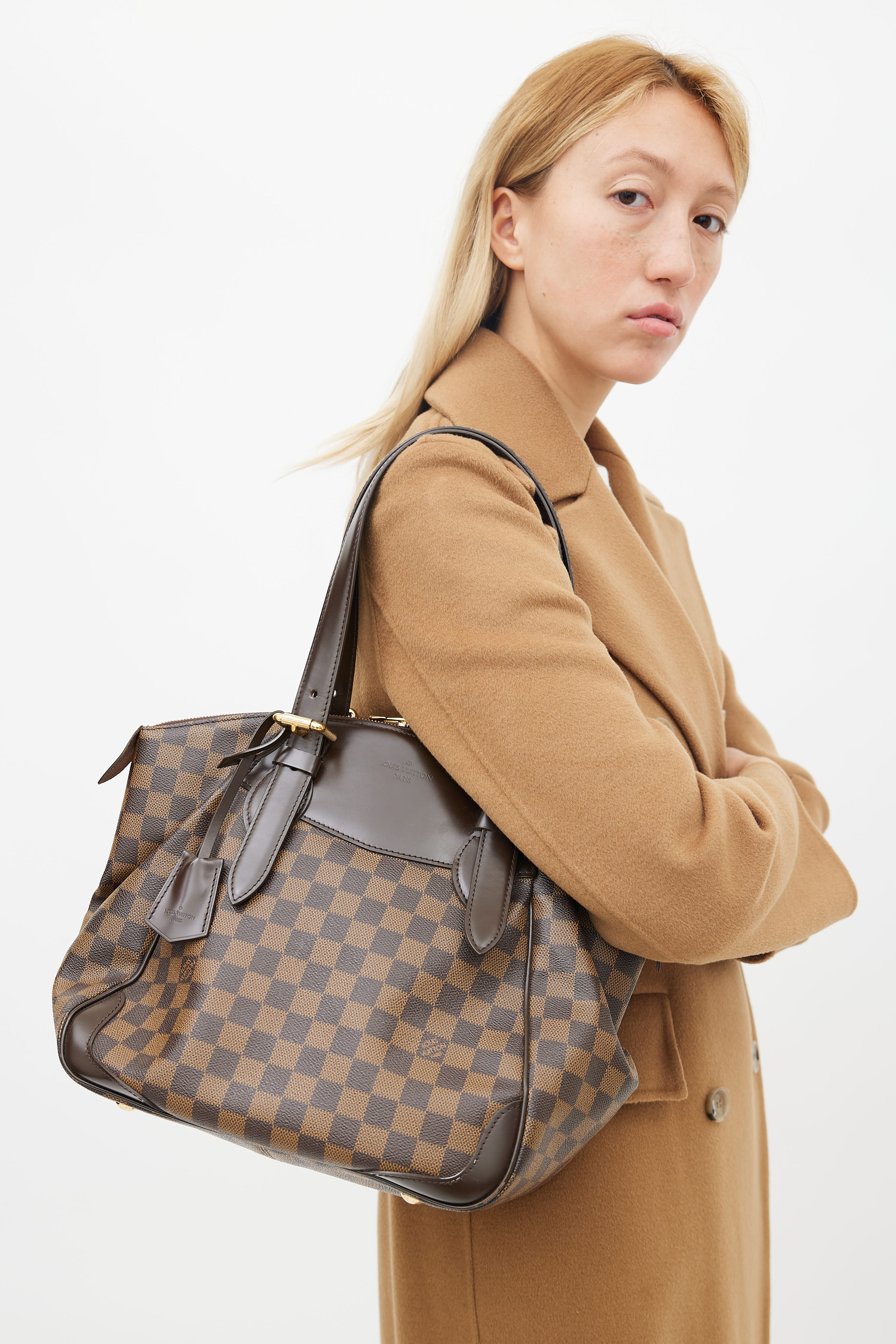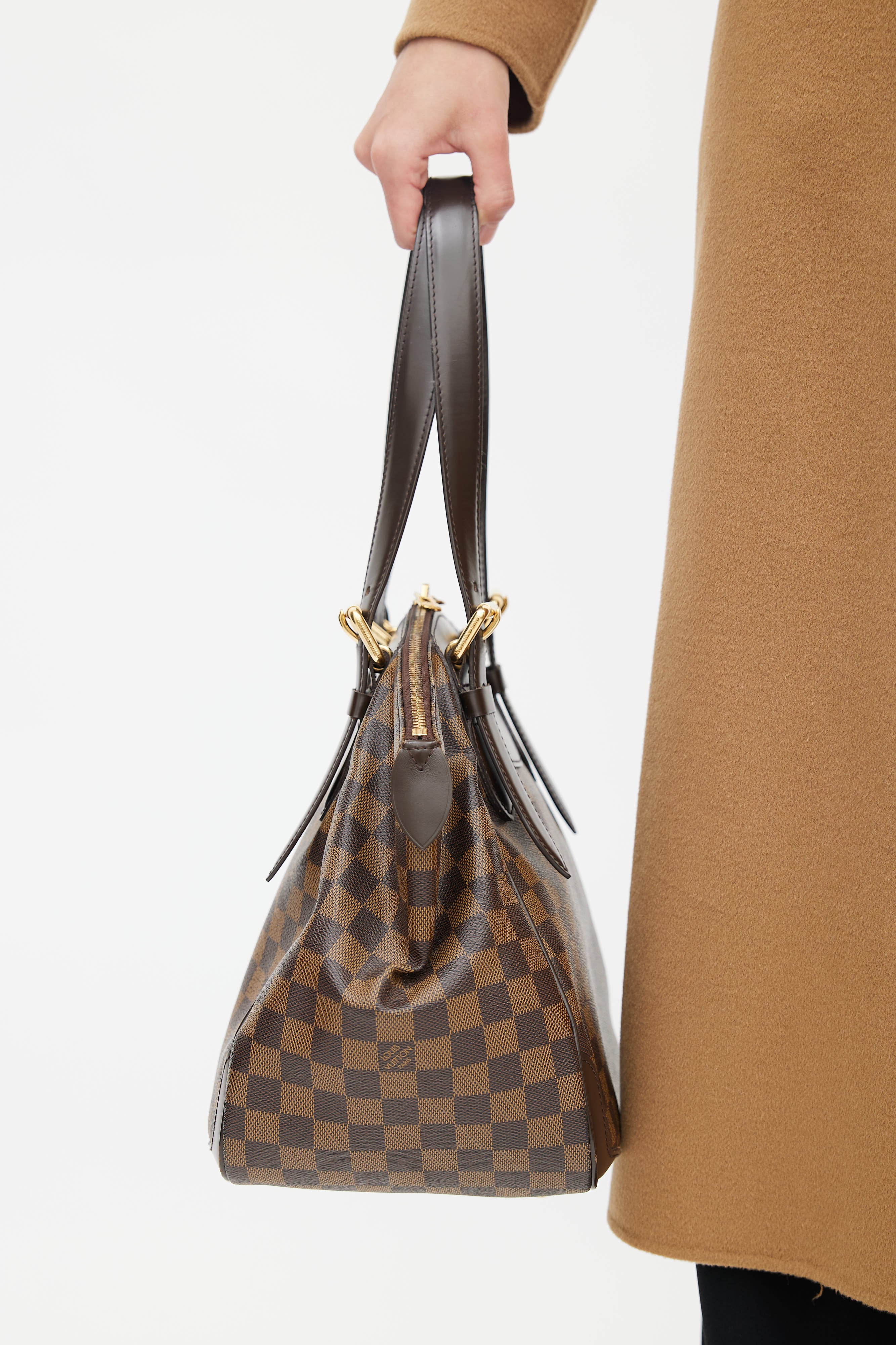 Pre-loved Louis Vuitton Verona MM bag in brown featuring signature Damier Ebene coated canvas, embossed leather logo at top, gold-tone hardware, adjustable flat top handles with buckles fastening, top zip closure, dark brown leather trim throughout, D-ring inside, detachable bag tag, two interior slip pockets, logo leather patch inside, and metal feet. Original dust bag included.