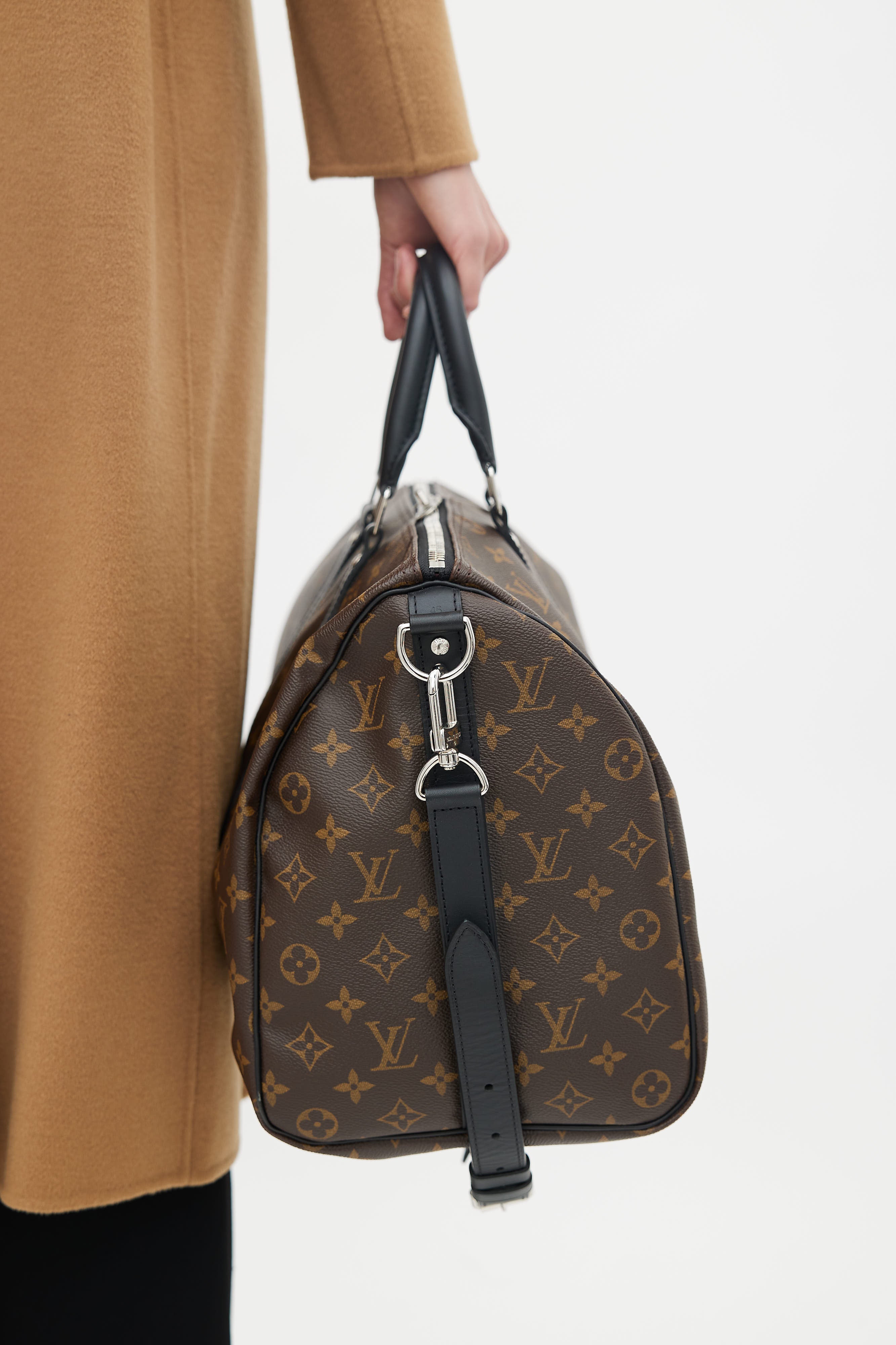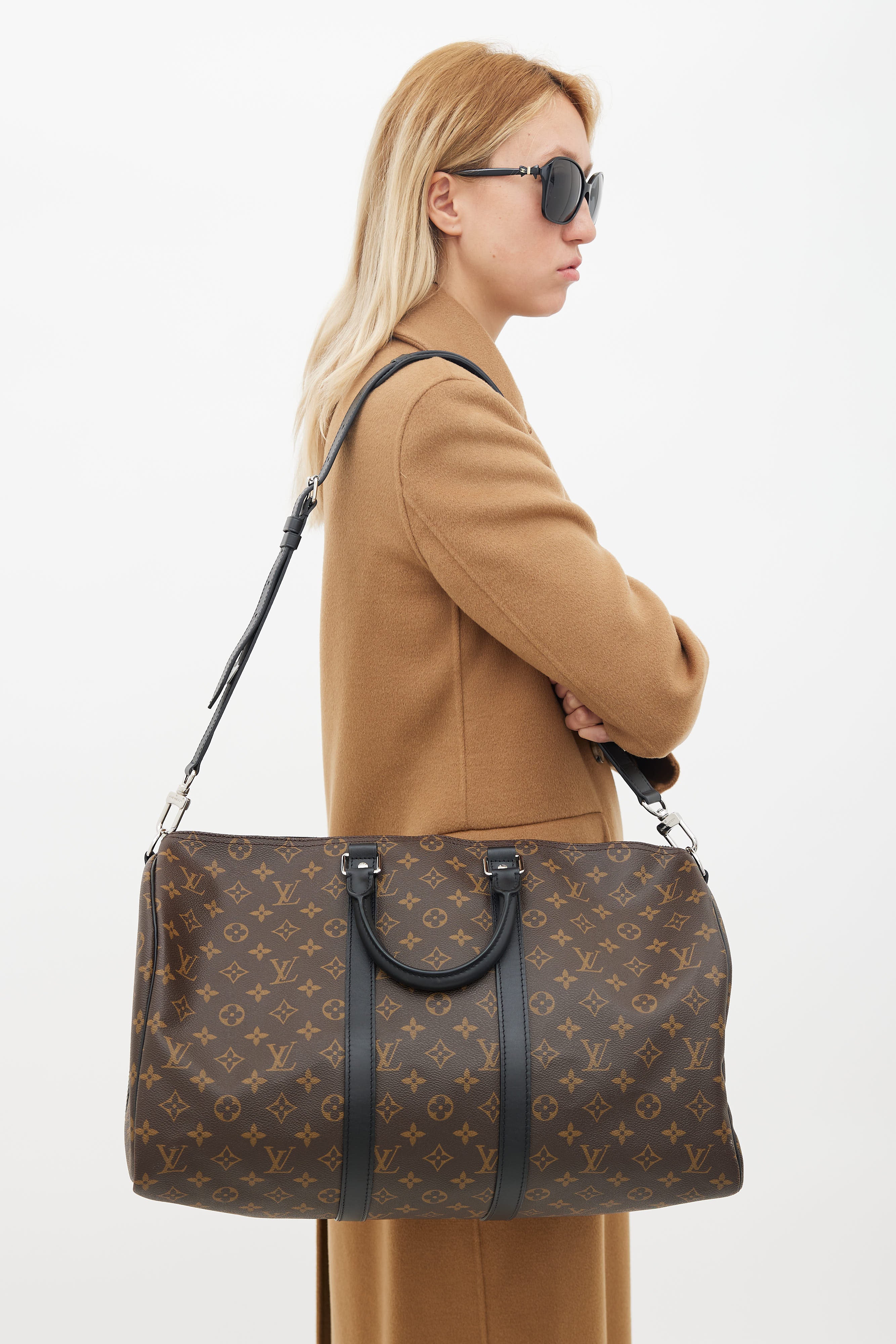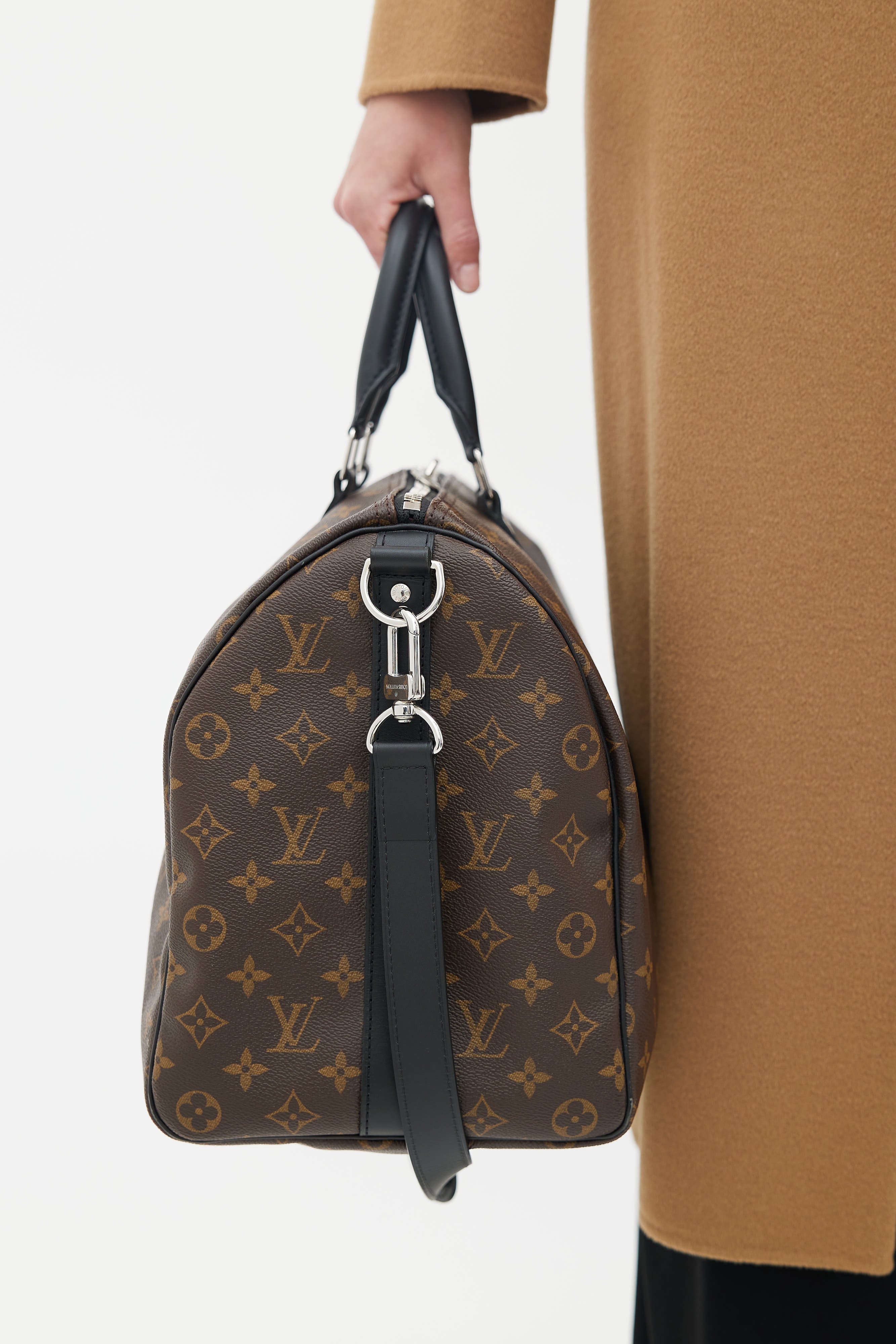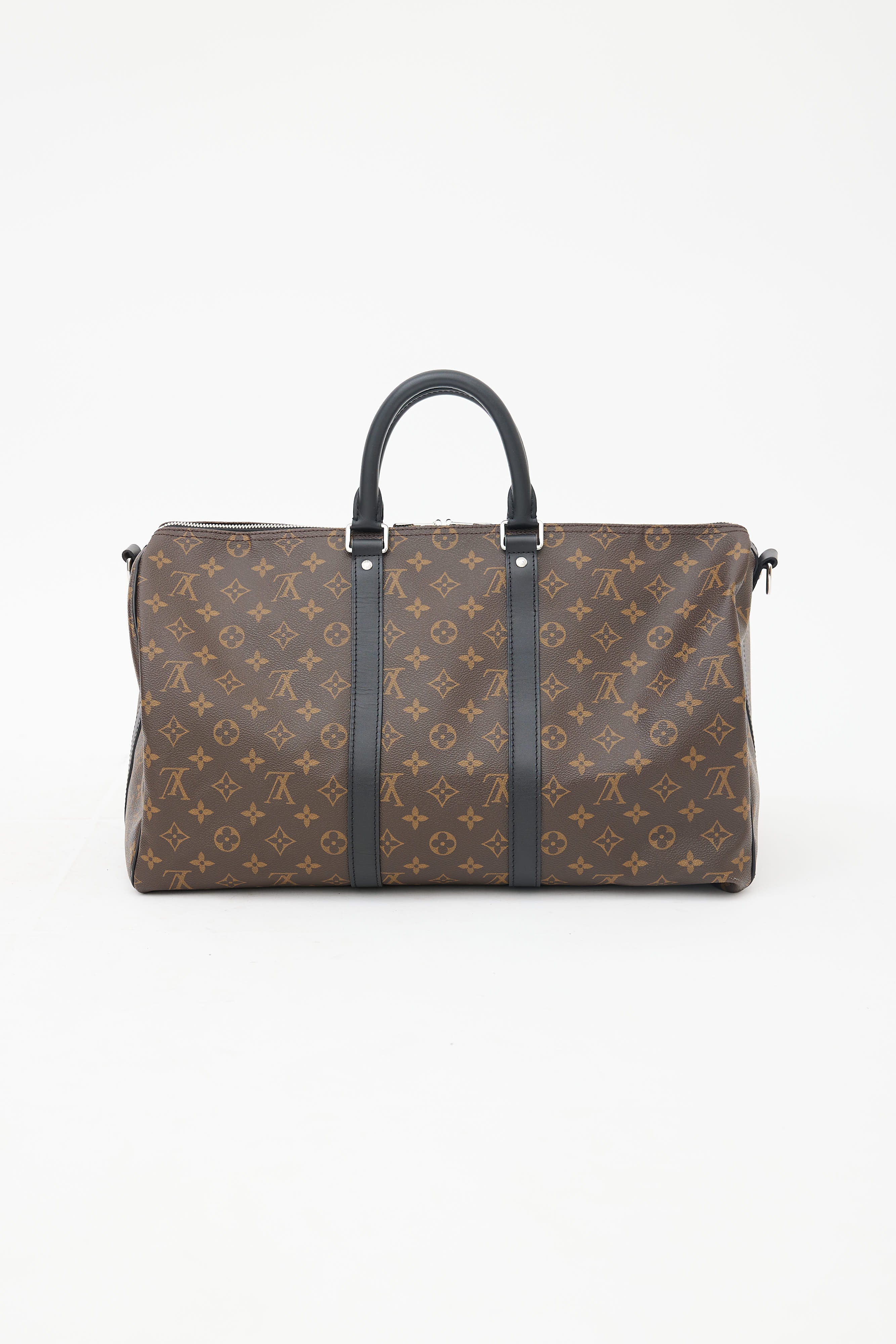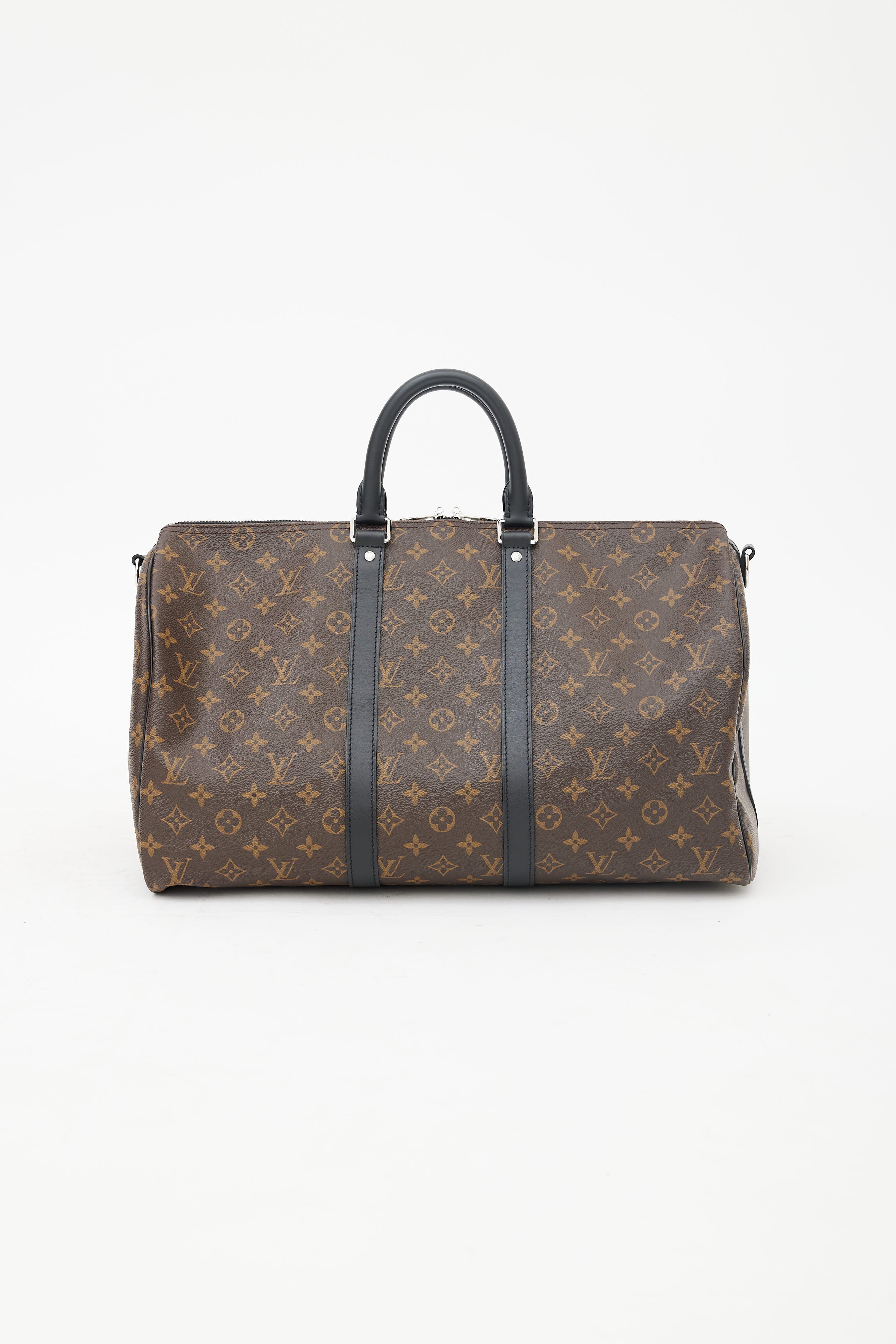 Pre-loved Louis Vuitton Keepall Bandoulière 45 in brown featuring Monogram Macassar colorway, black leather trim, silver-tone hardware, detachable shoulder strap, dual rolled top handle with buckle fastening, zip closure at top, single main compartment, interior zip pocket, and cotton lining. Entrupy Certificate included.
