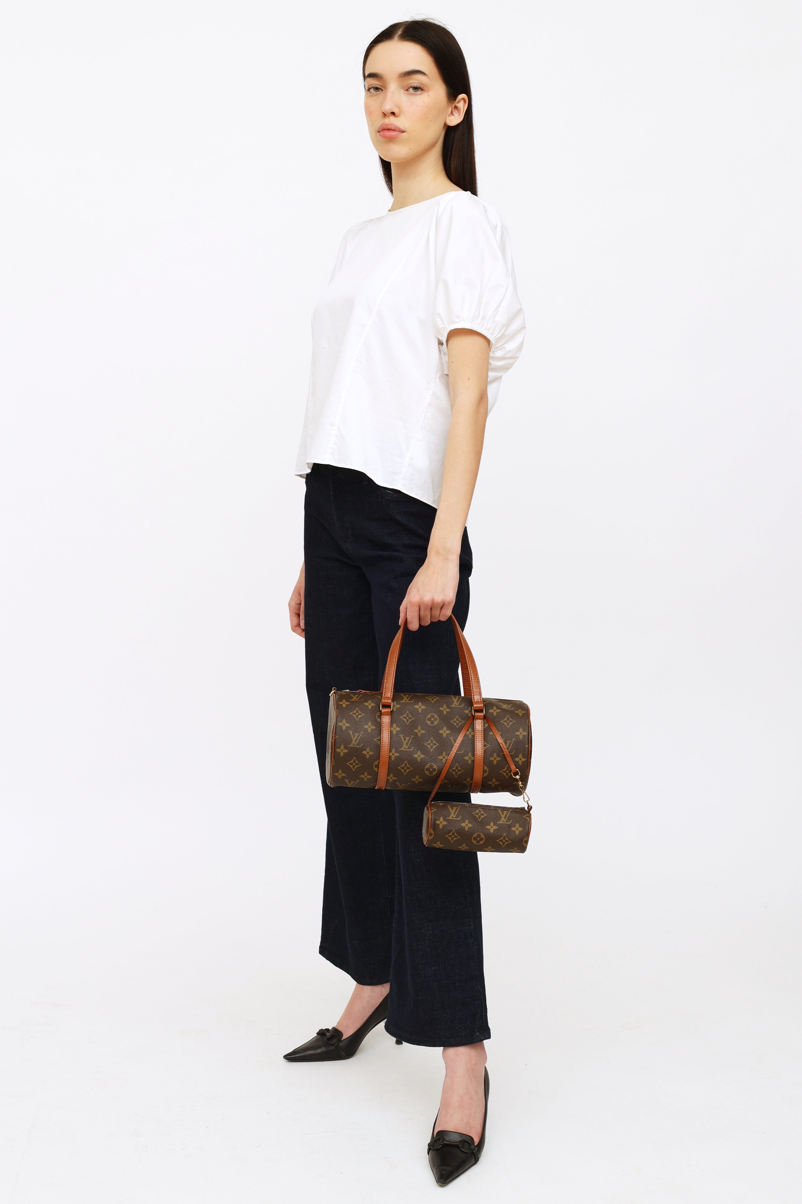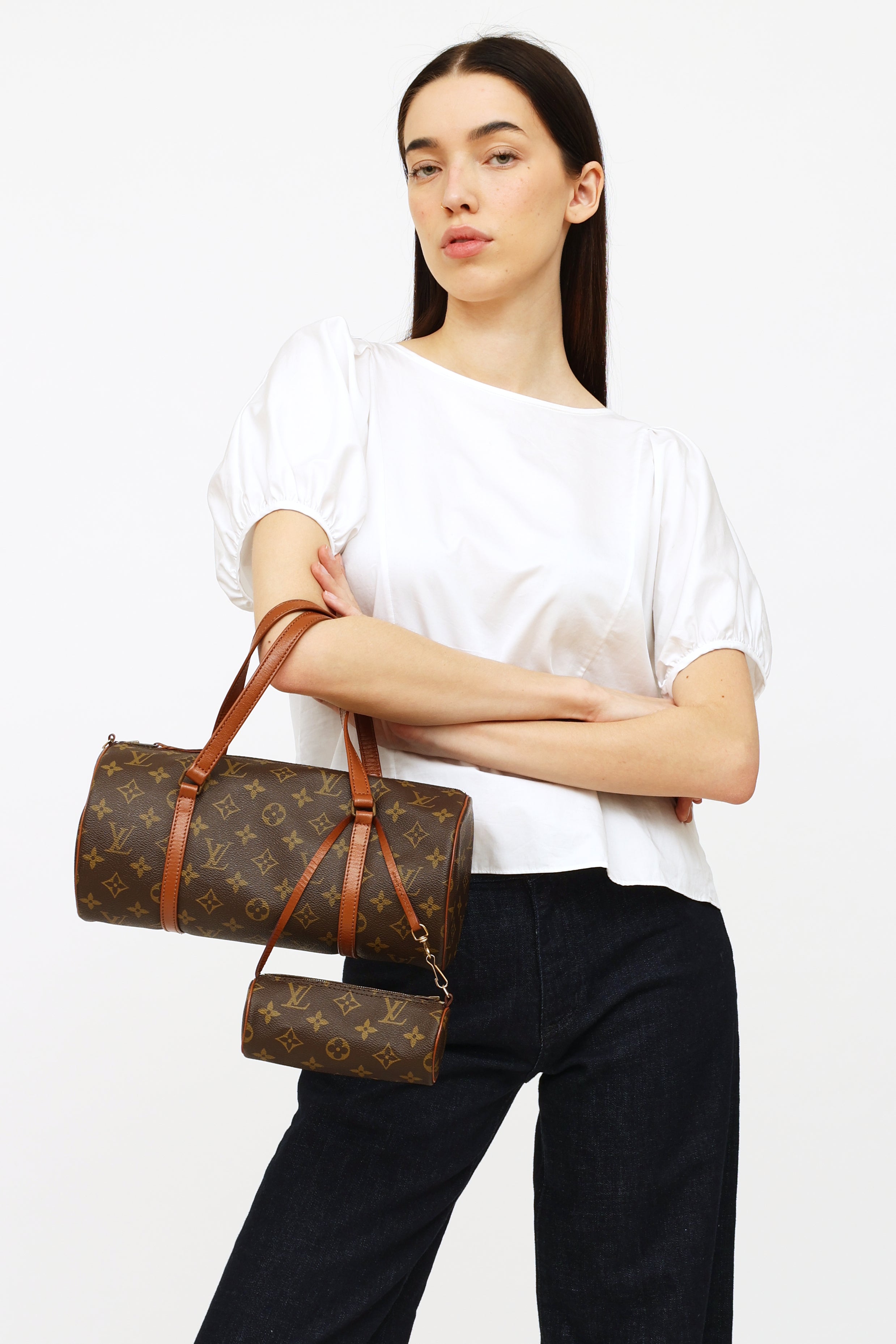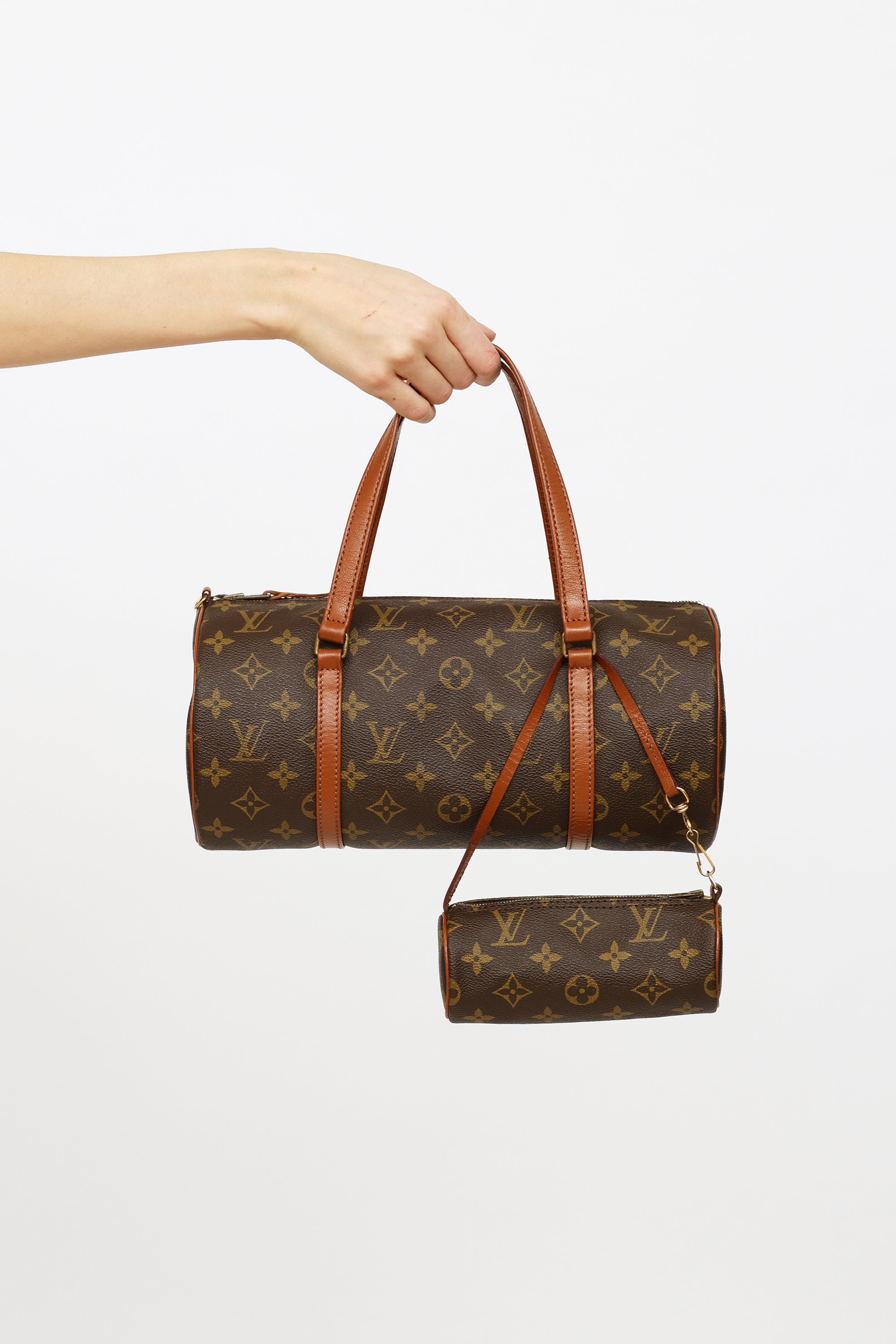 Pre-owned Louis Vuitton Papillon bag in brown features monogram coated canvas two brown top handles, brown cross-grain leather interior, brass hardware, top zipper closure and matching detachable mini Papillon bag.