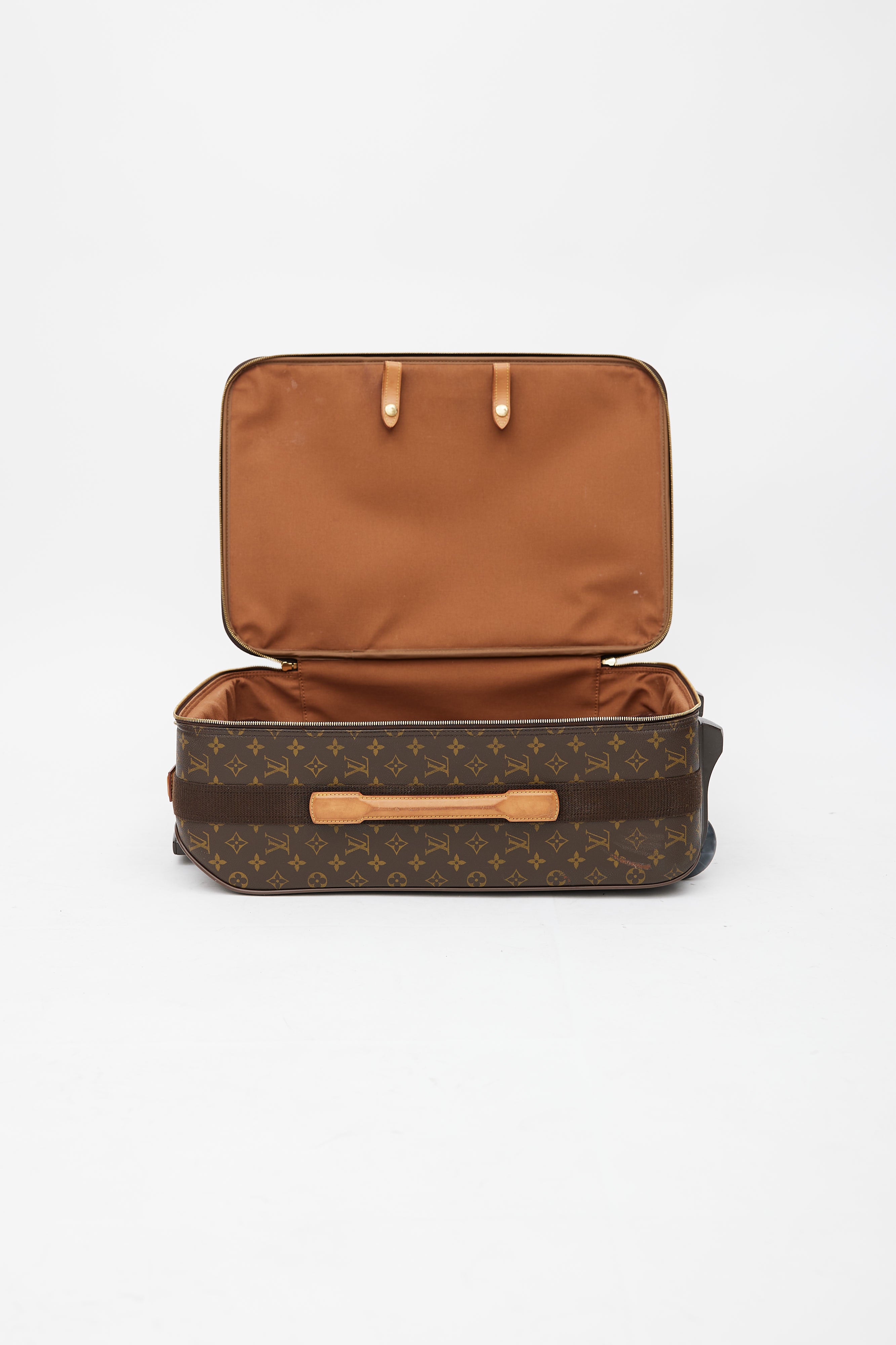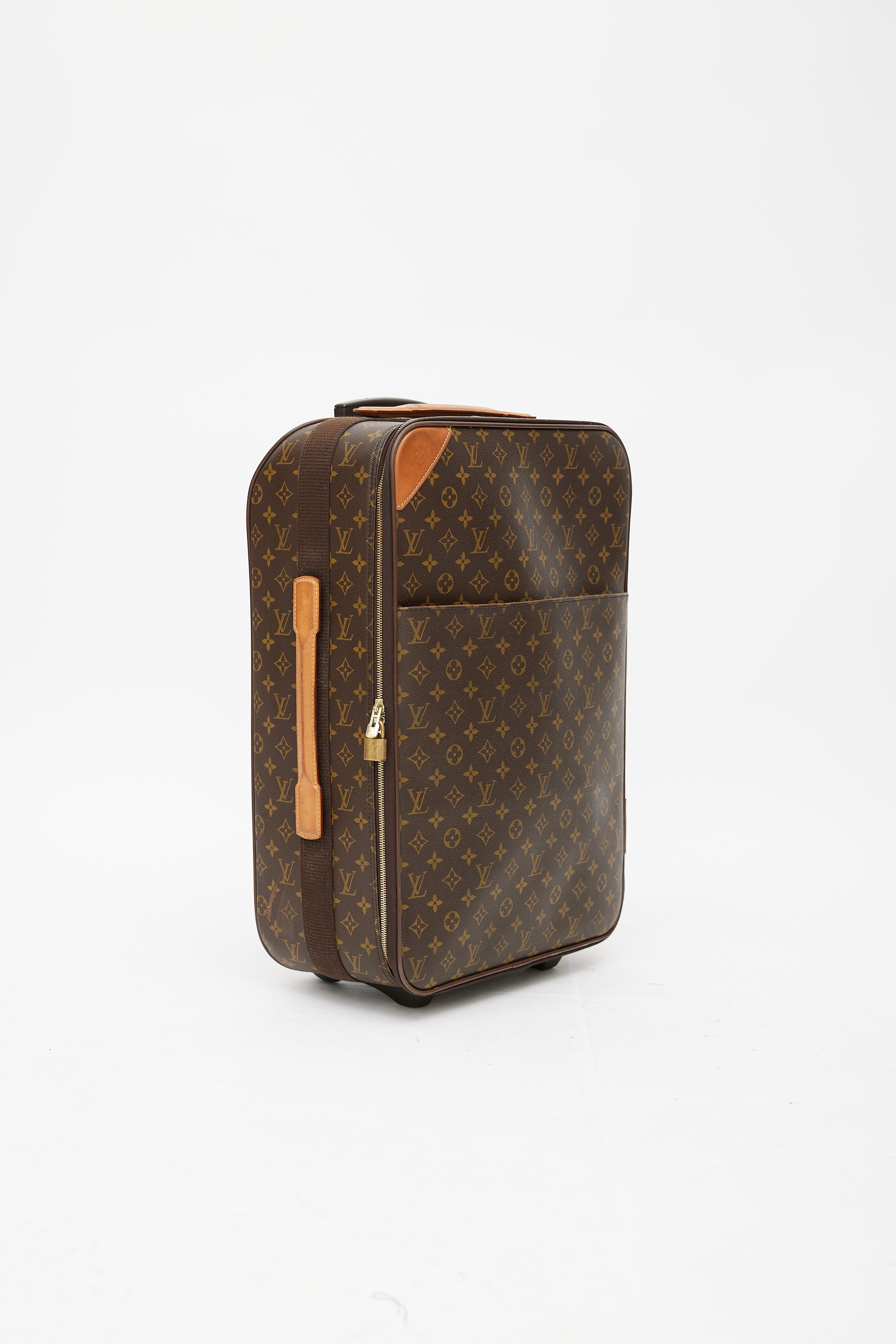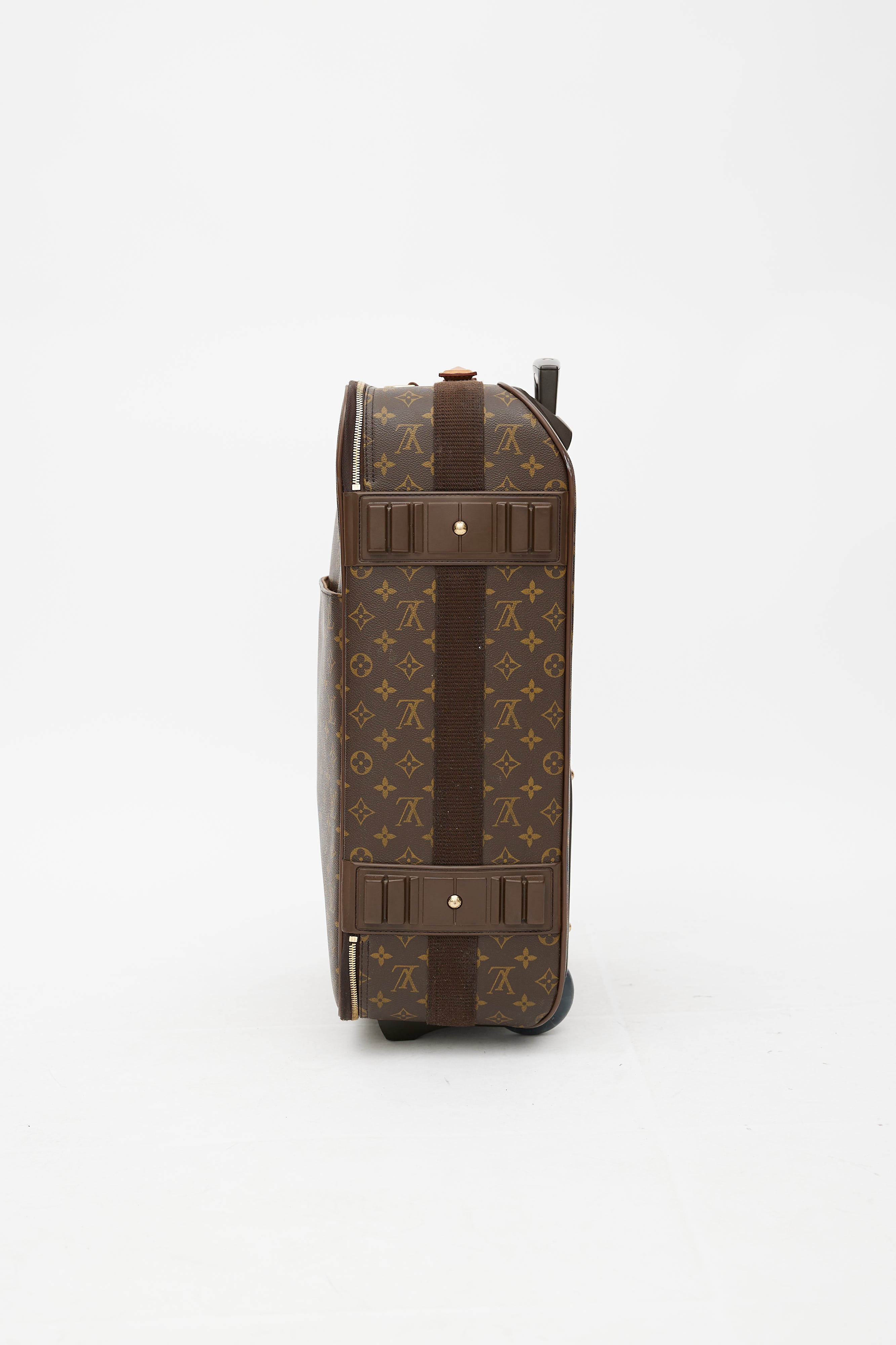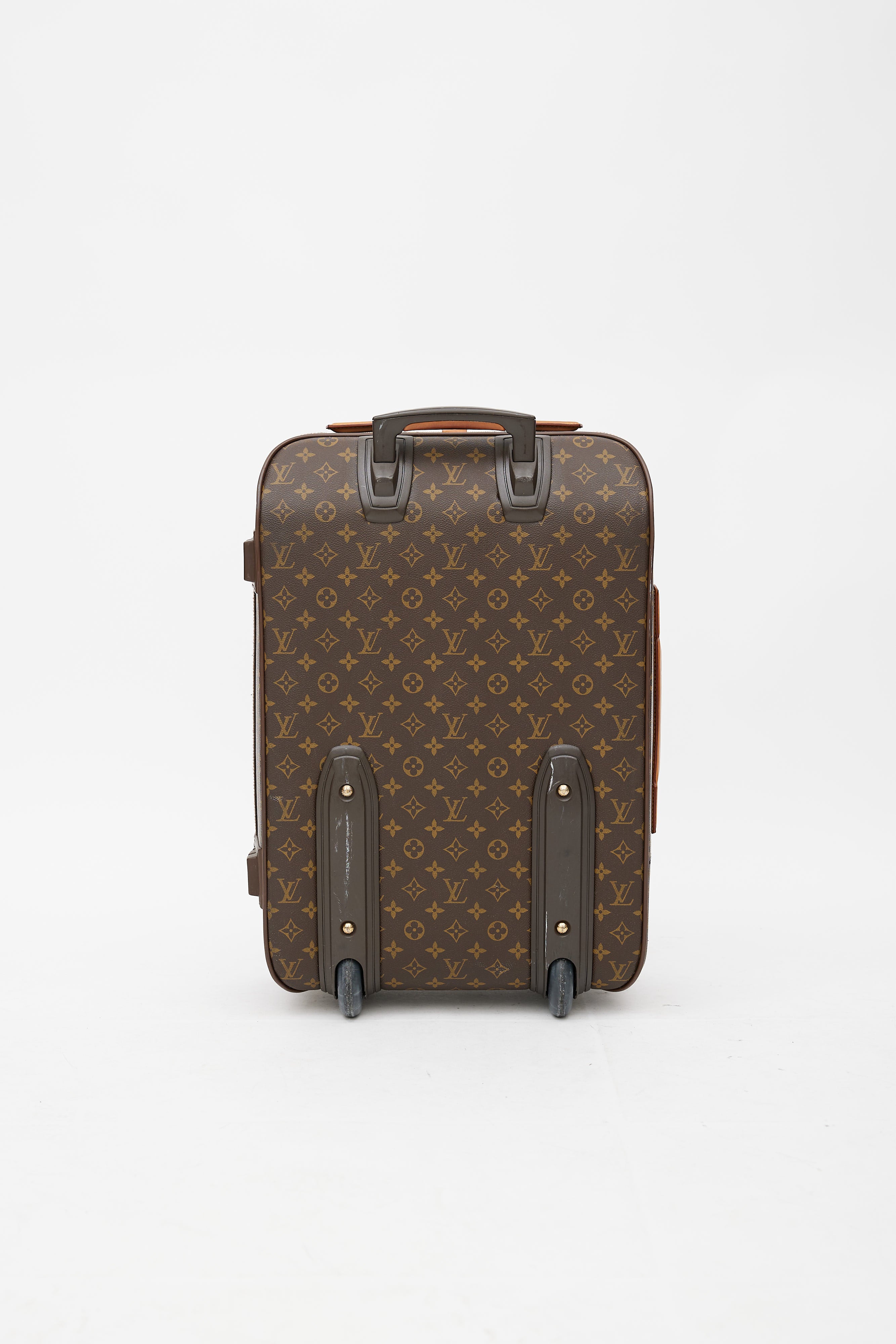 Pre-owned Louis Vuitton brown Pégase 55 suitcase featuring Monogram coated canvas, brown leather trim, exterior pocket, two way zip closure, attached lock, single top handle, D-ring at top, single side handle, metal protective feet at side and bottom, two wheels at bottom, canvas lining, detachable luggage tag, garment strap with clasp fastening, and two attached loops inside.
