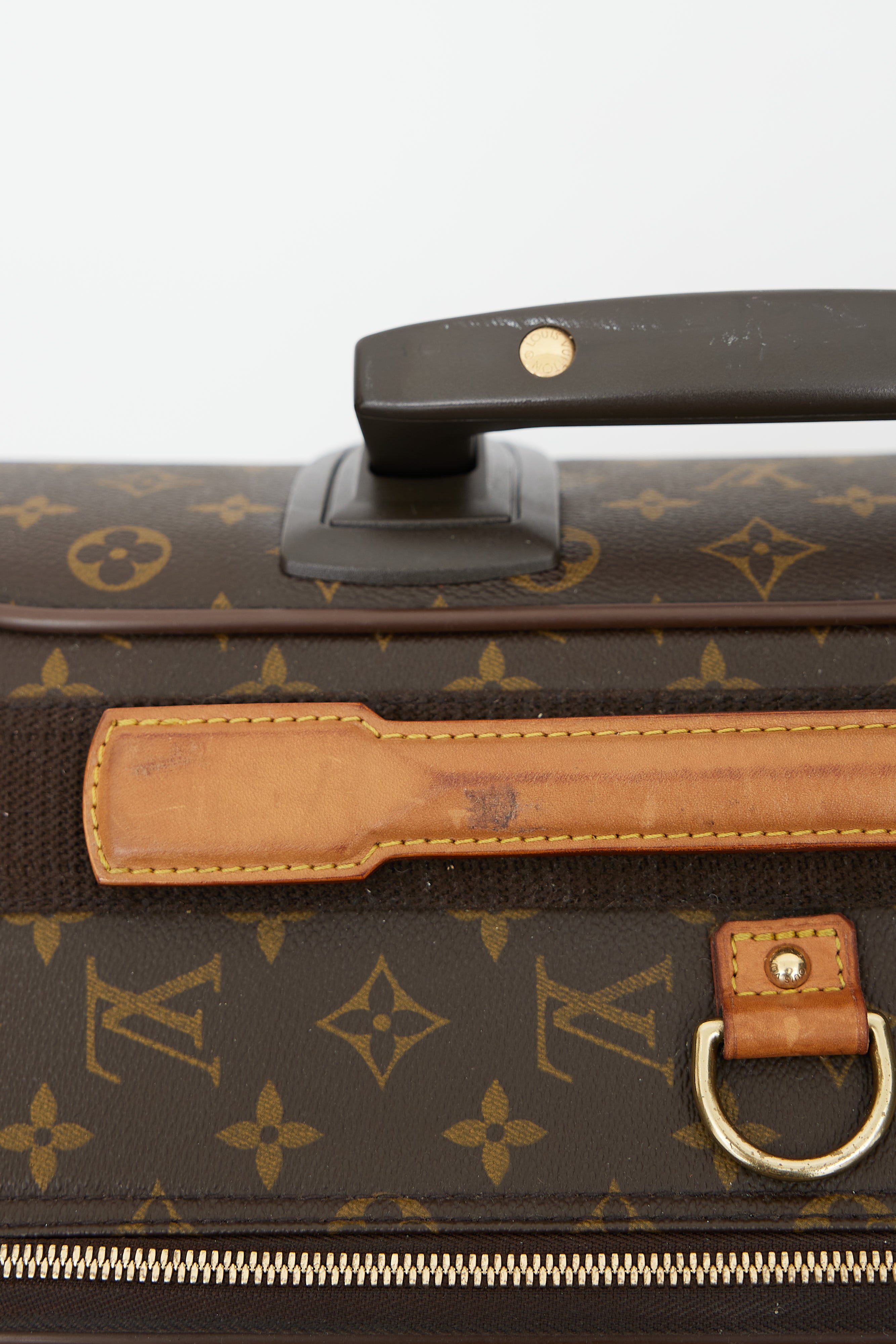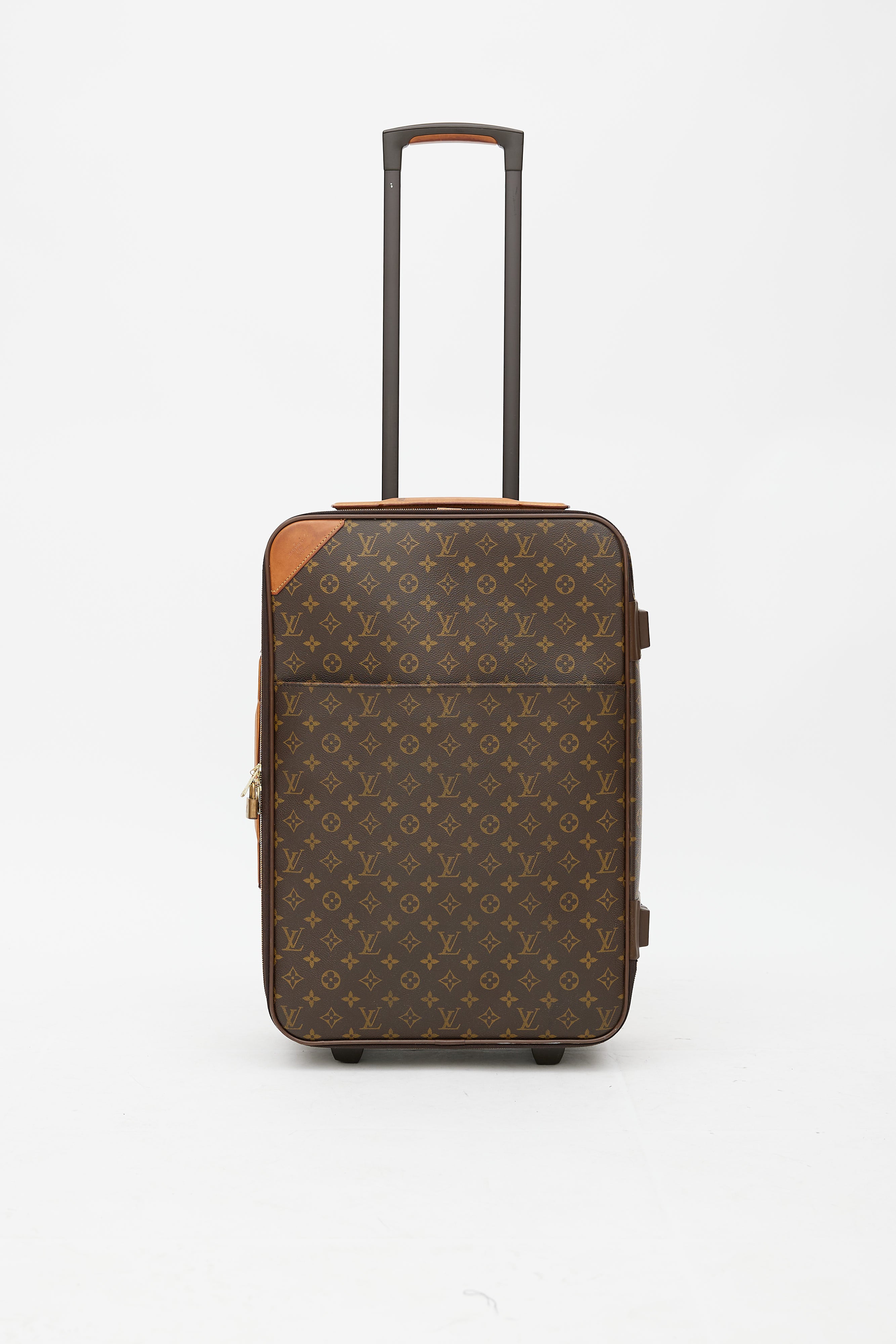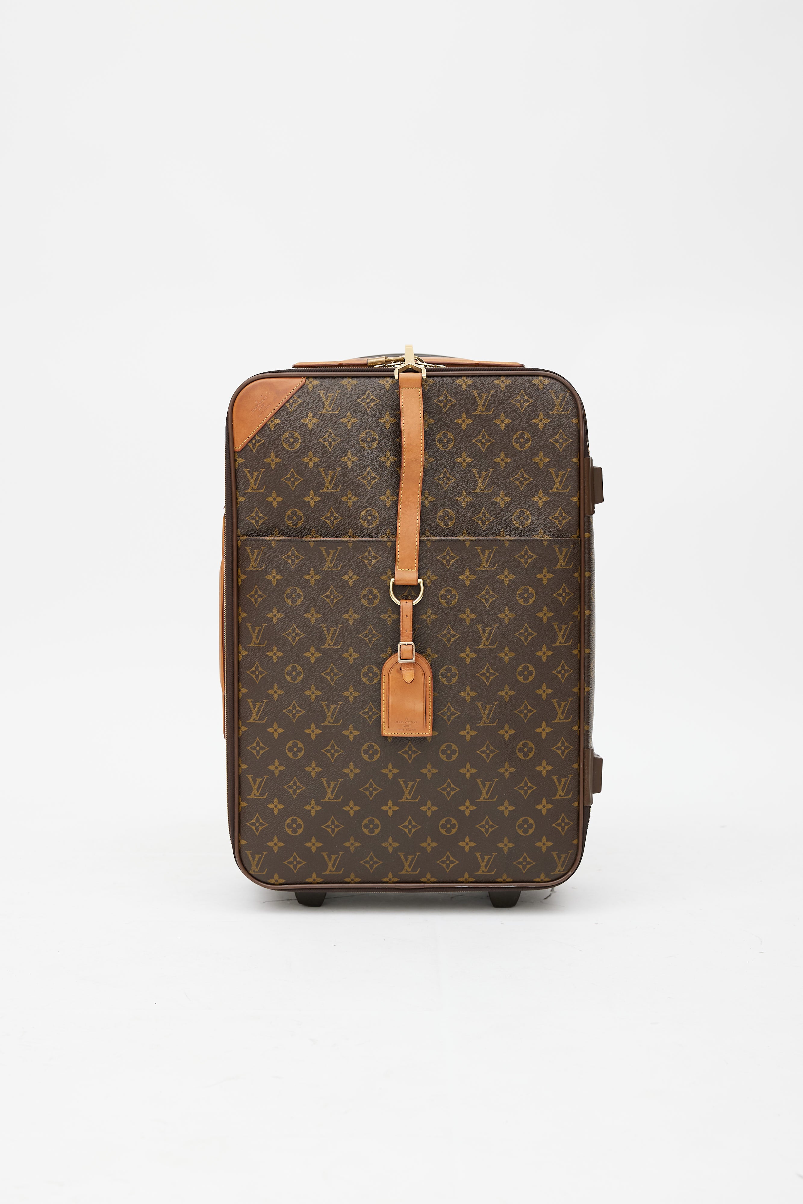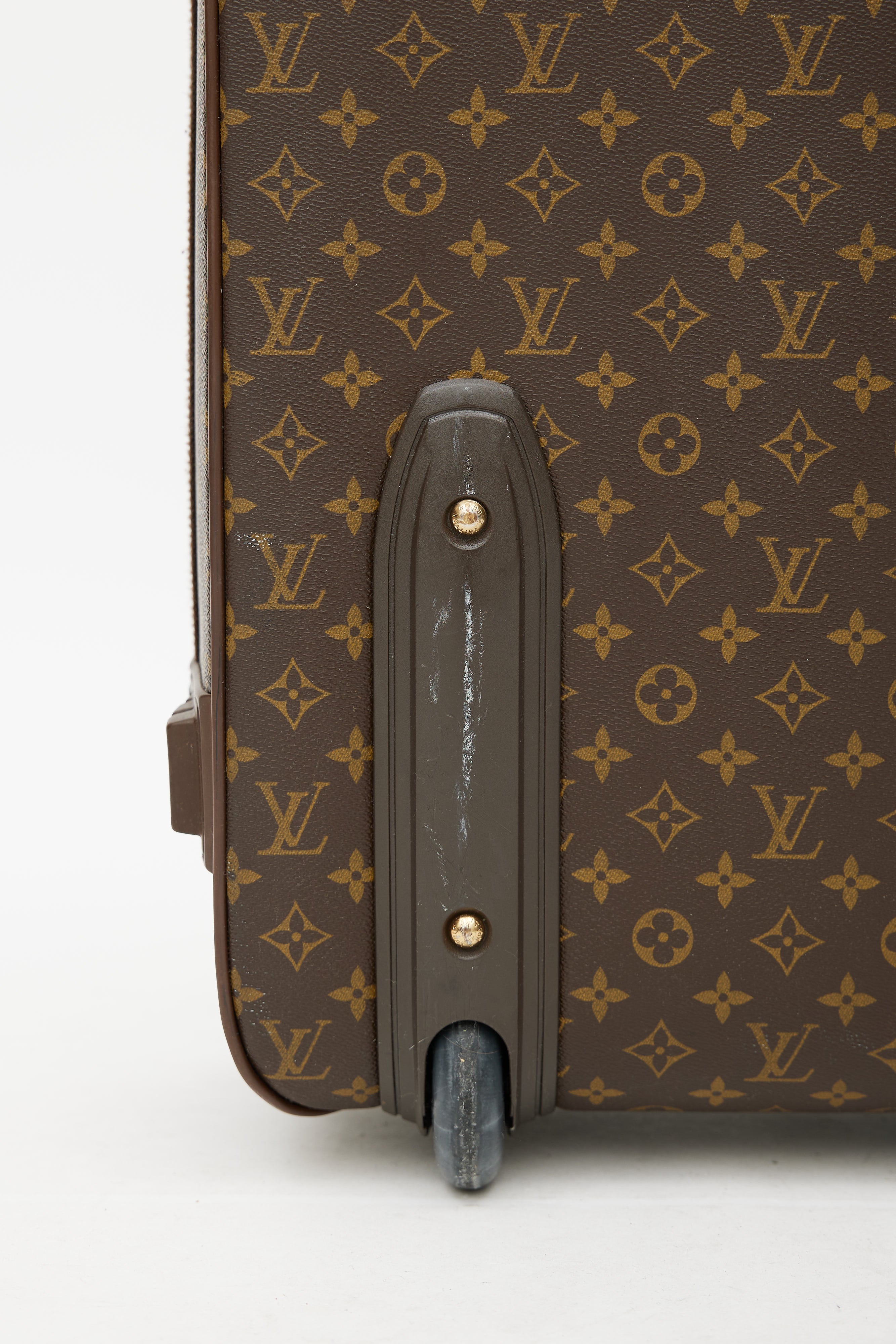 Pre-owned Louis Vuitton brown Pégase 55 suitcase featuring Monogram coated canvas, brown leather trim, exterior pocket, two way zip closure, attached lock, single top handle, D-ring at top, single side handle, metal protective feet at side and bottom, two wheels at bottom, canvas lining, detachable luggage tag, garment strap with clasp fastening, and two attached loops inside.