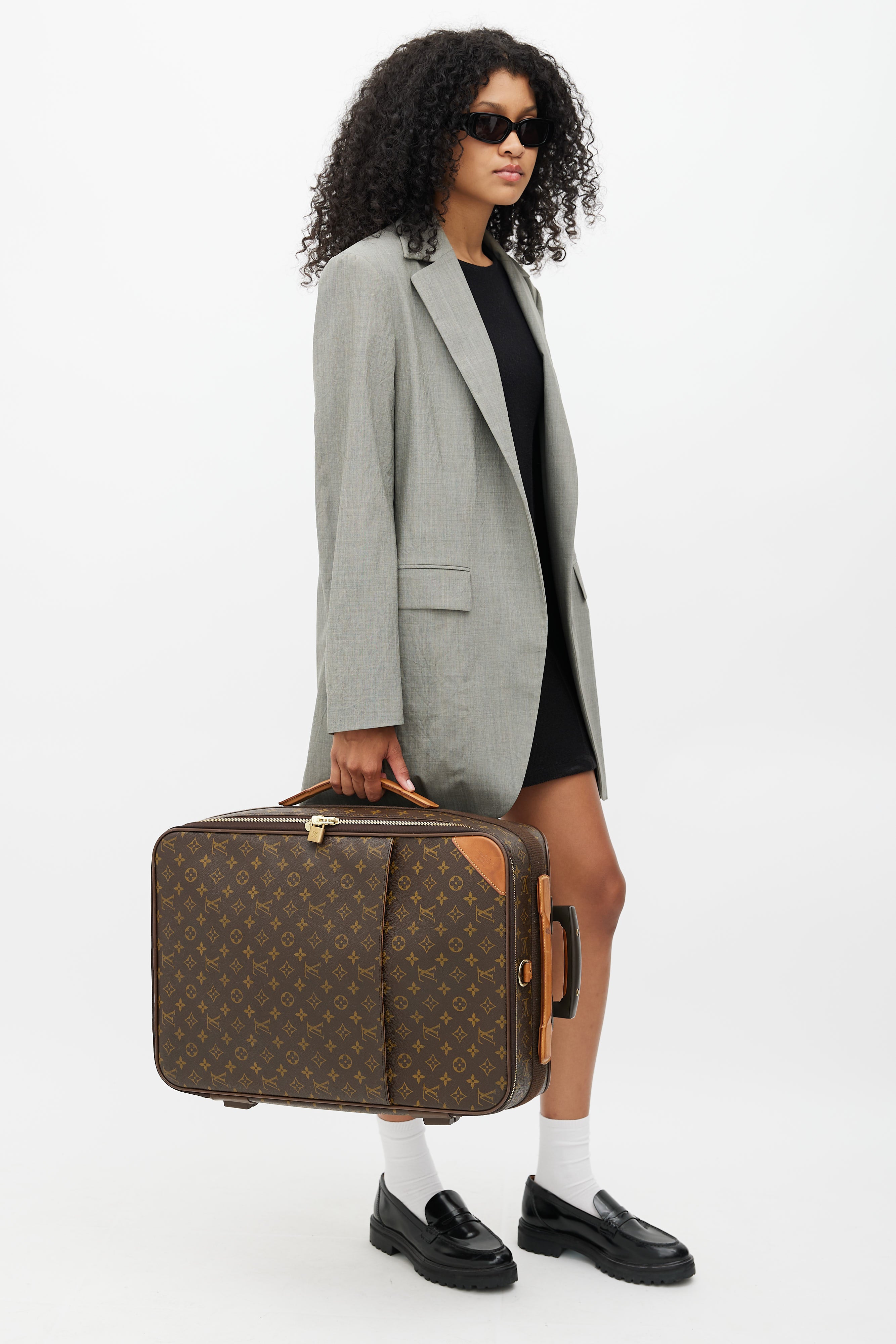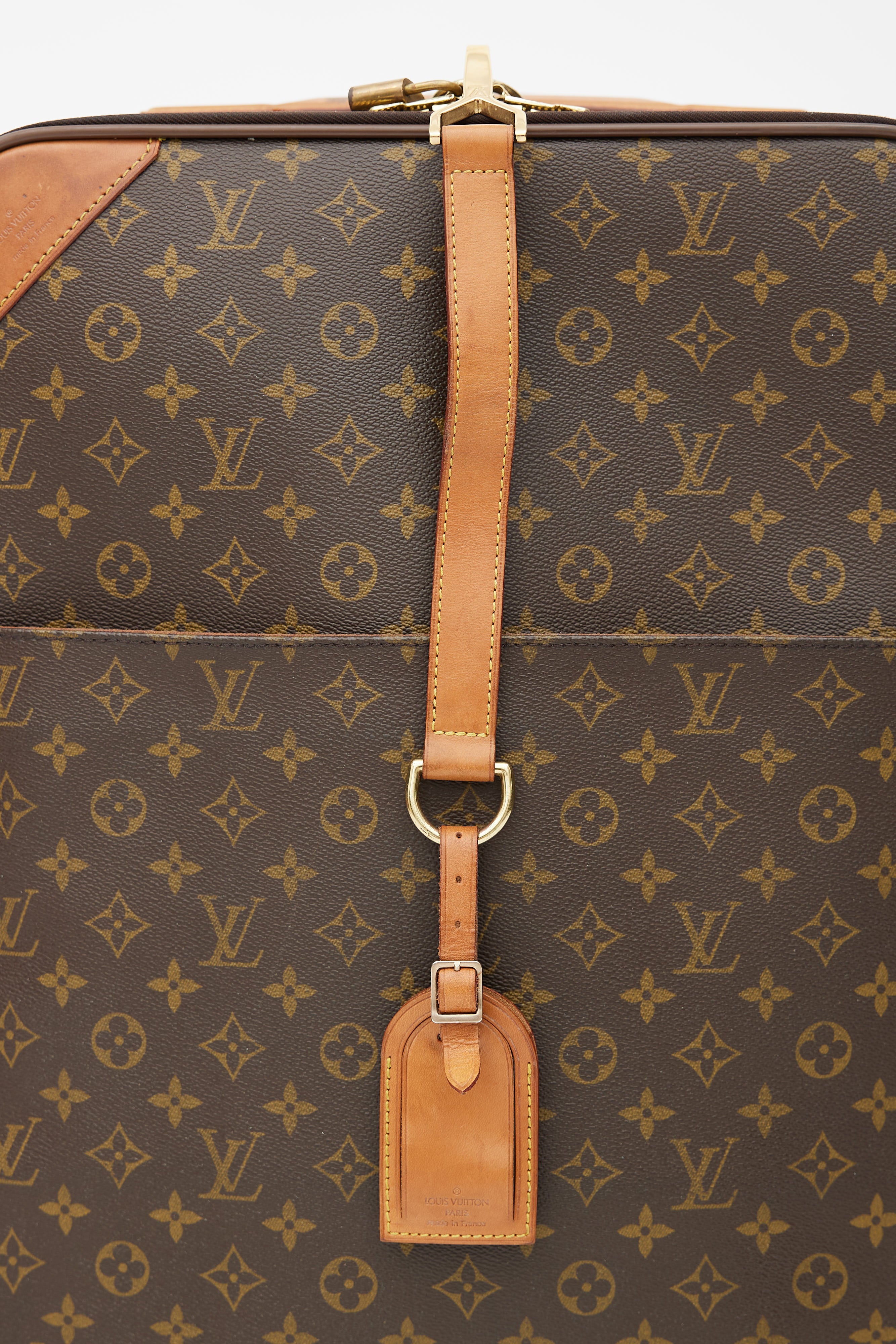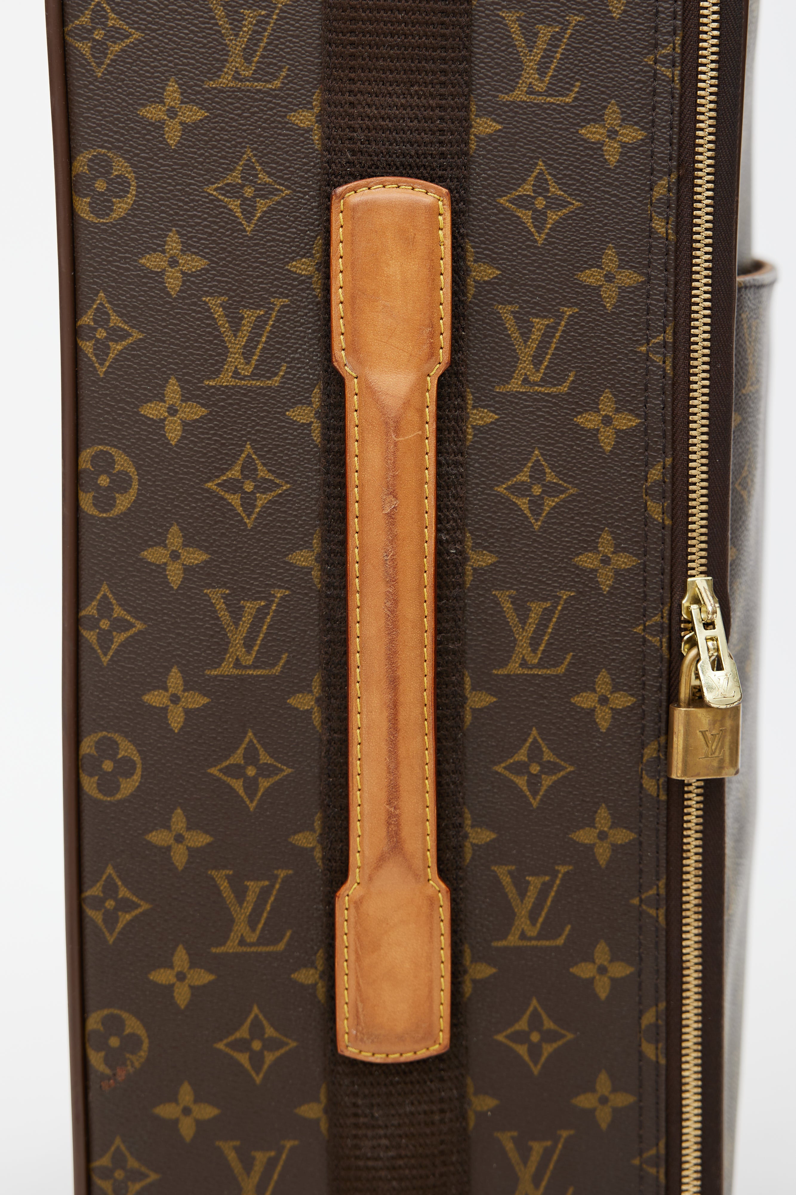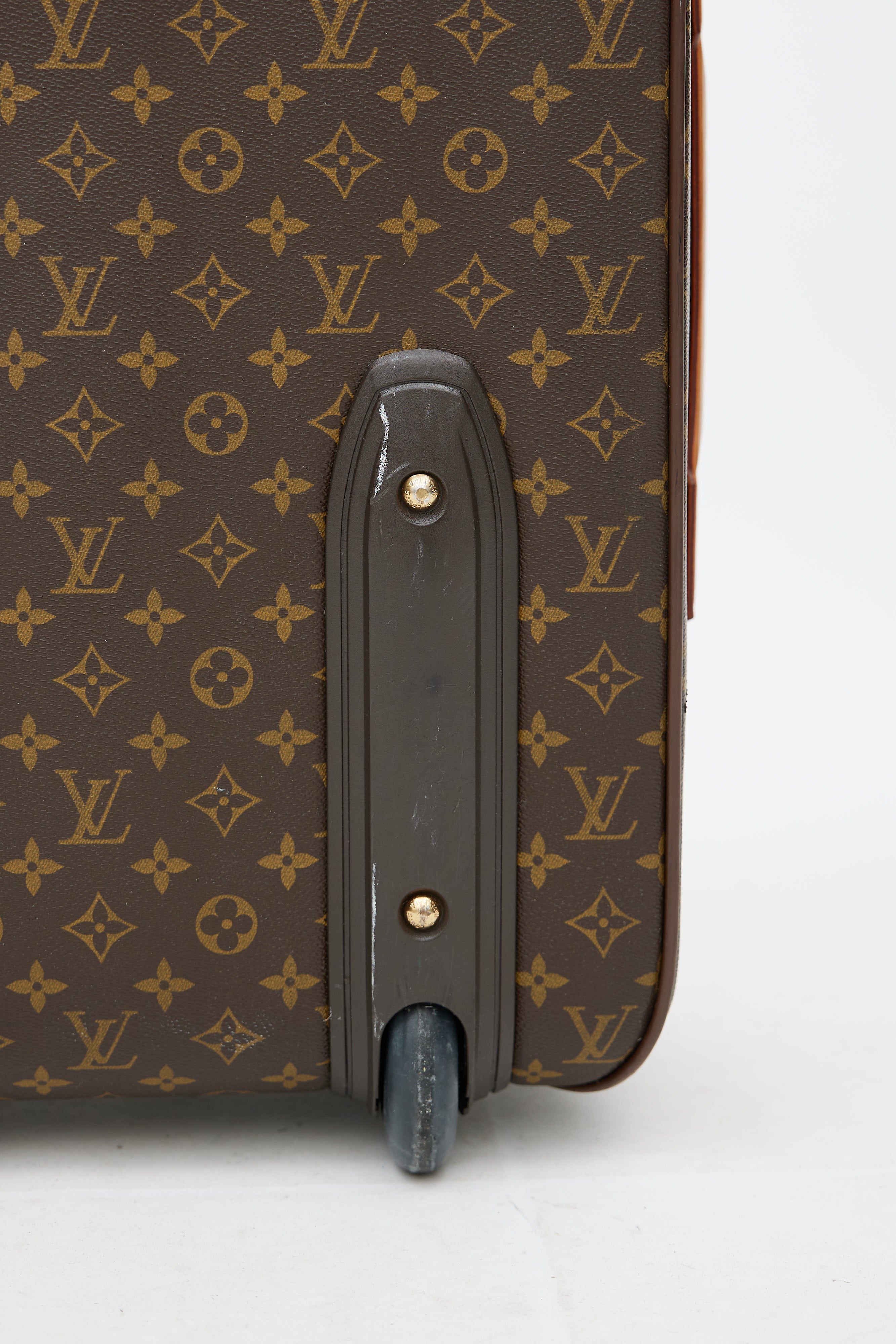 Pre-owned Louis Vuitton brown Pégase 55 suitcase featuring Monogram coated canvas, brown leather trim, exterior pocket, two way zip closure, attached lock, single top handle, D-ring at top, single side handle, metal protective feet at side and bottom, two wheels at bottom, canvas lining, detachable luggage tag, garment strap with clasp fastening, and two attached loops inside.