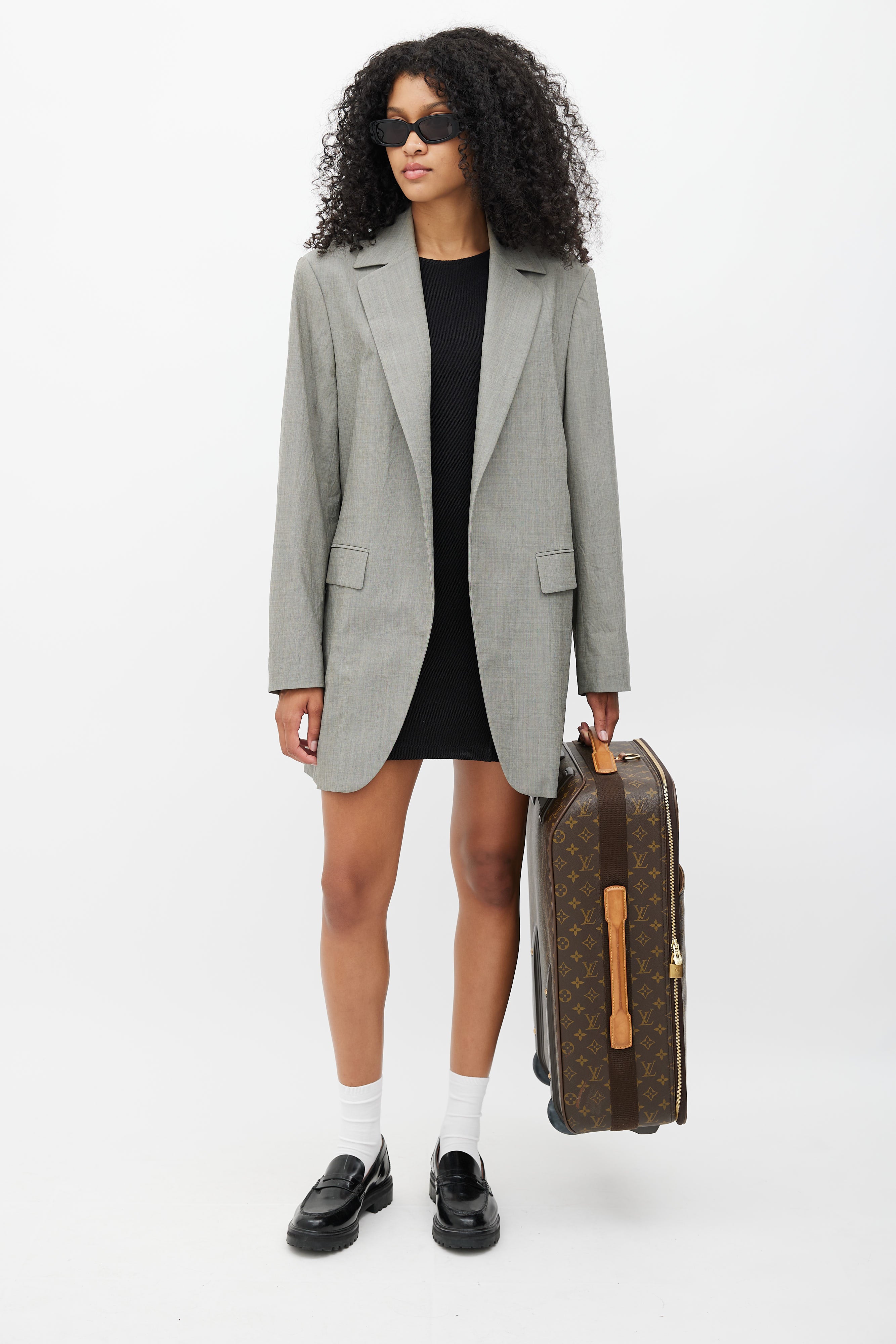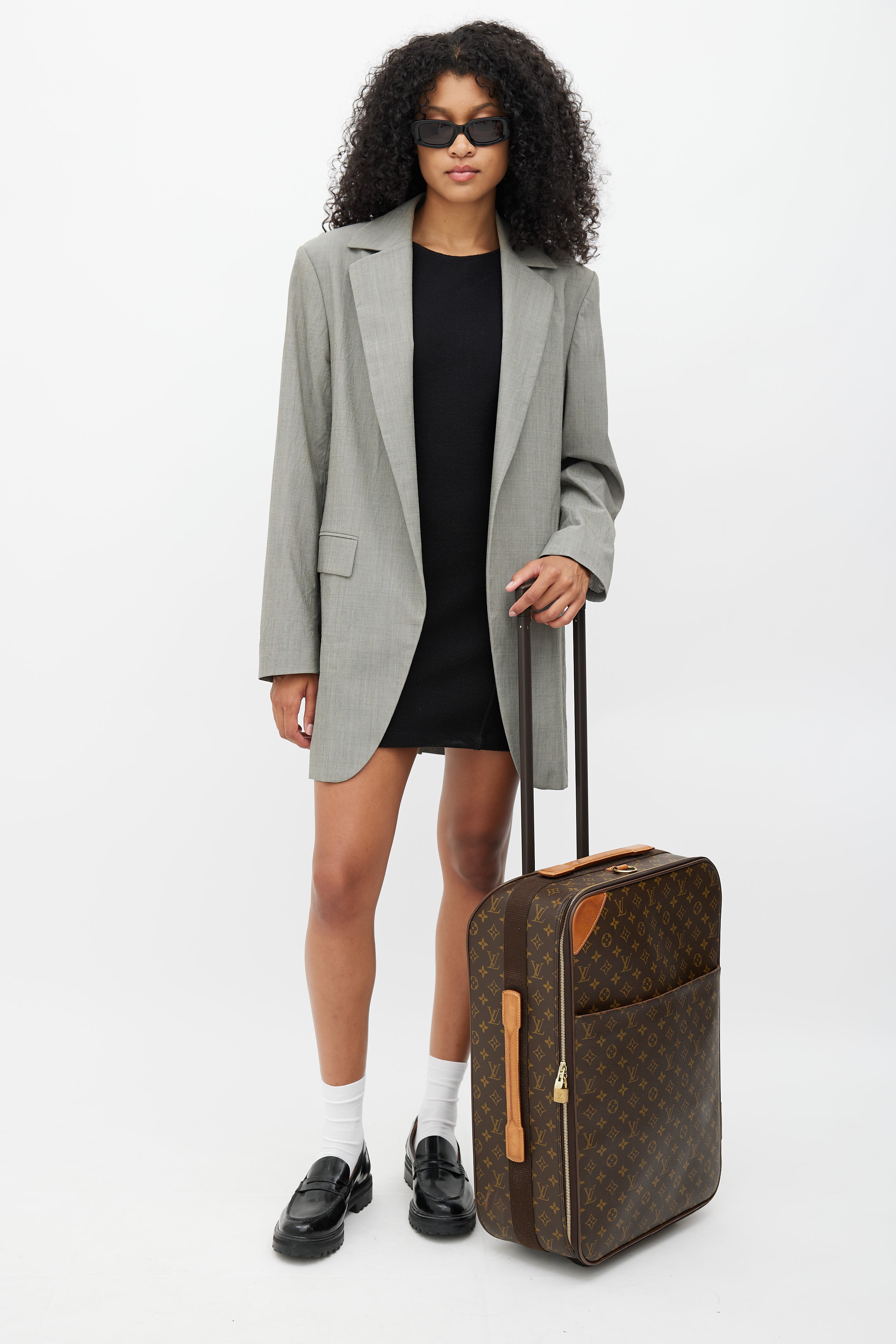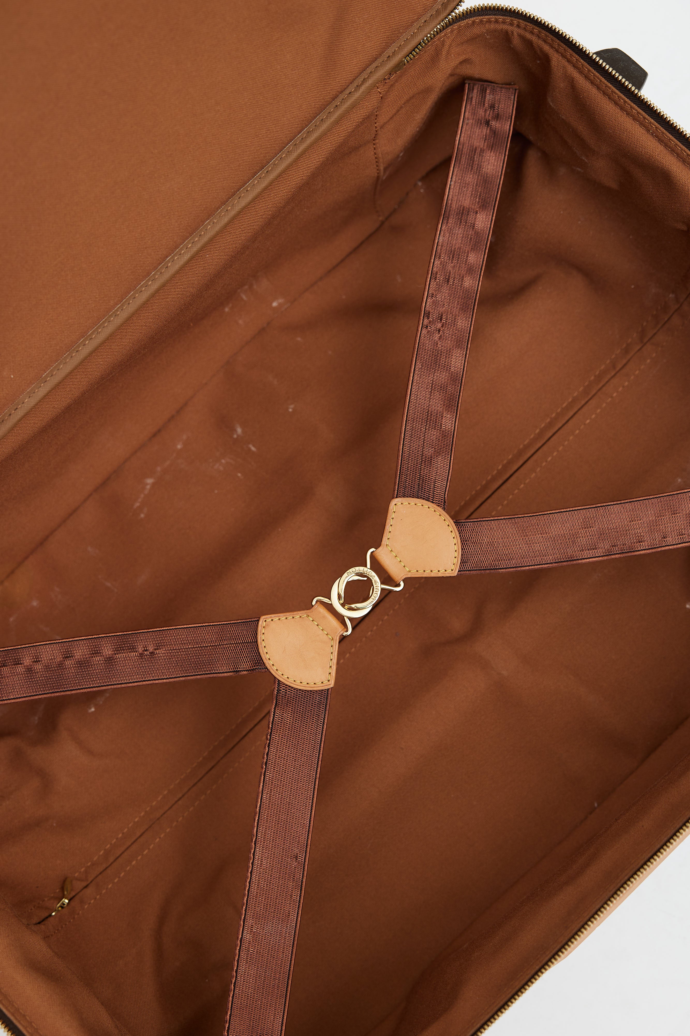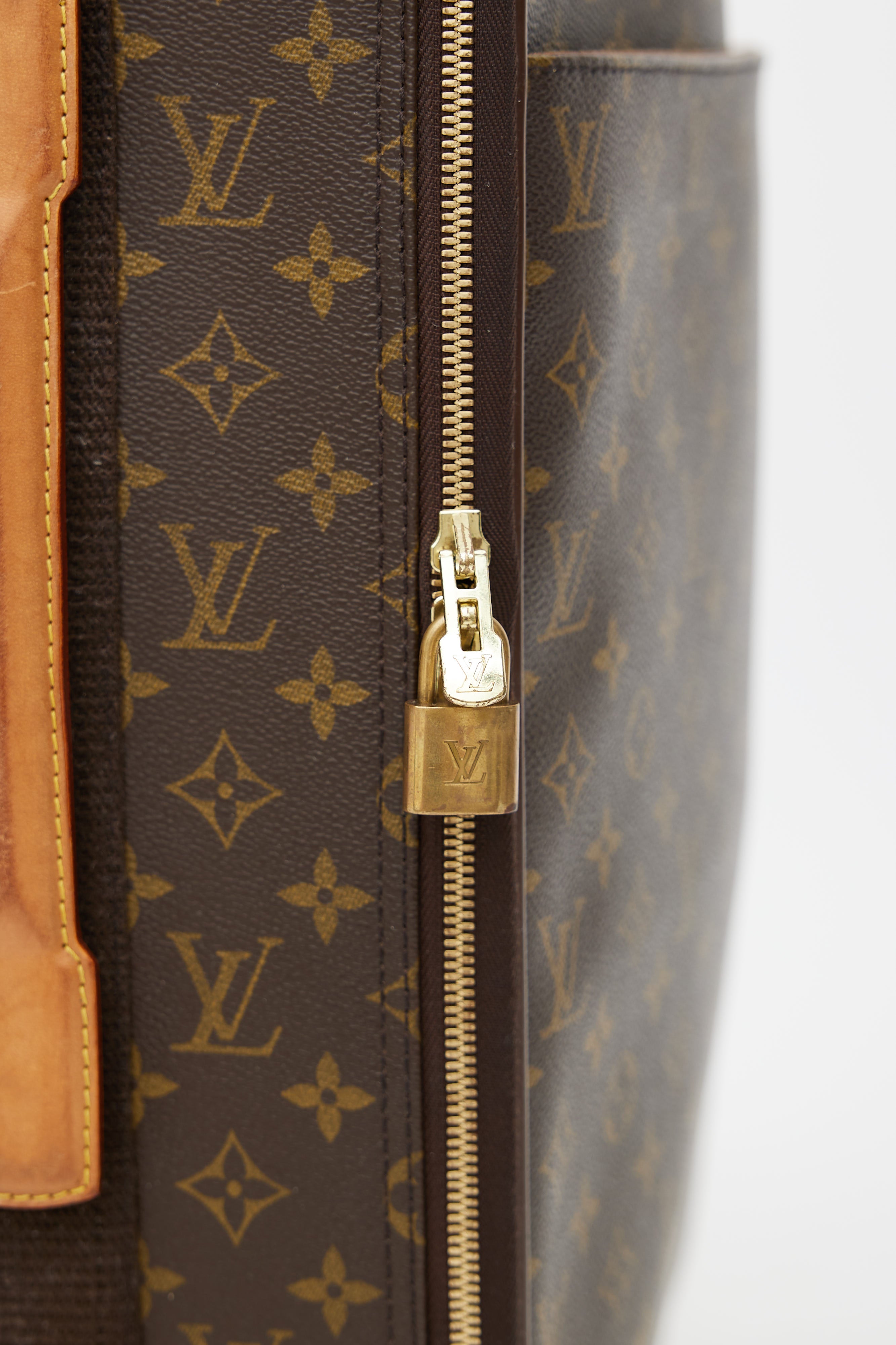 Pre-owned Louis Vuitton brown Pégase 55 suitcase featuring Monogram coated canvas, brown leather trim, exterior pocket, two way zip closure, attached lock, single top handle, D-ring at top, single side handle, metal protective feet at side and bottom, two wheels at bottom, canvas lining, detachable luggage tag, garment strap with clasp fastening, and two attached loops inside.