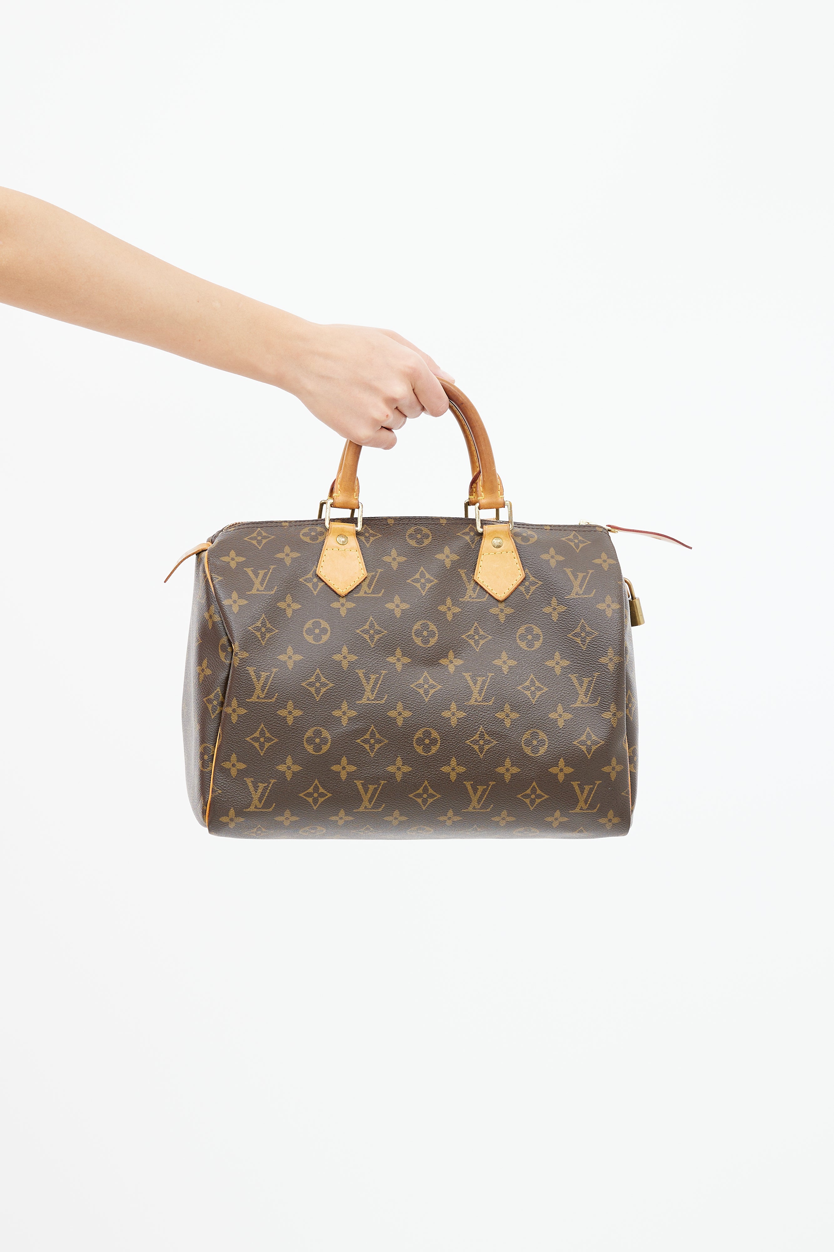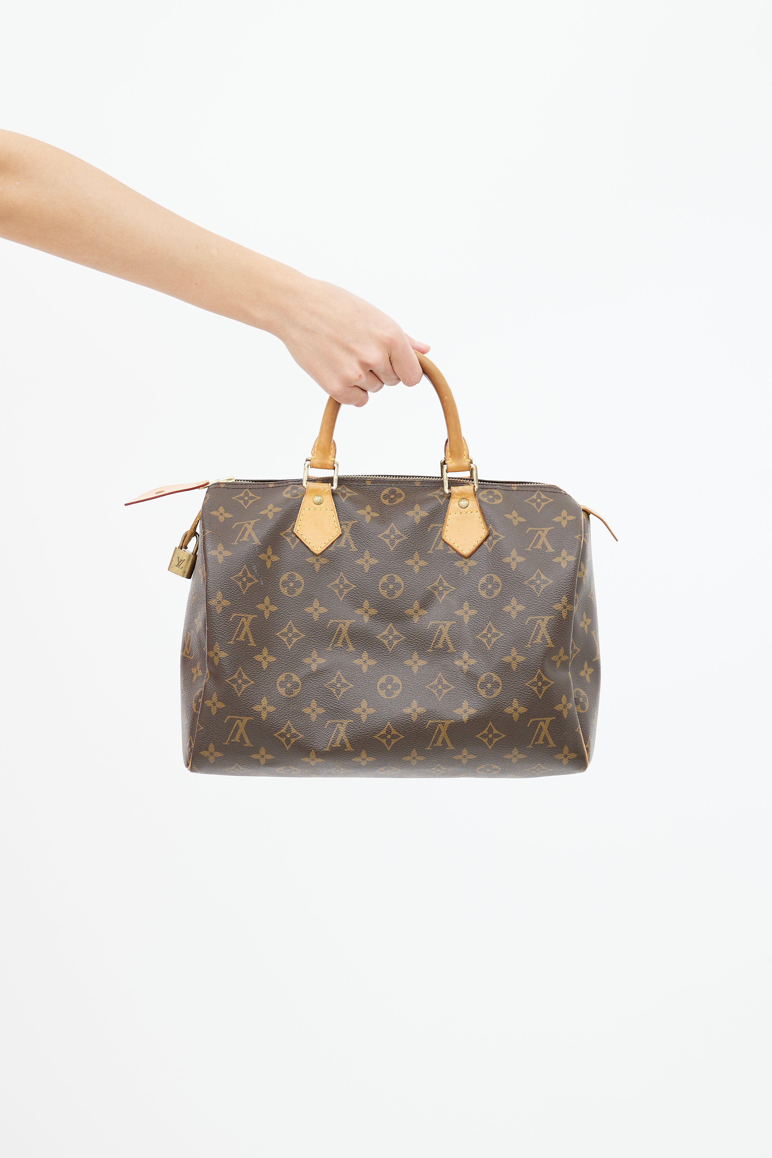 Pre-owned Louis Vuitton Speedy 30 bag in brown monogram coated canvas featuring dual rolled leather top handles, top zip closure, gold-tone hardware, lined interior with one slip pocket.