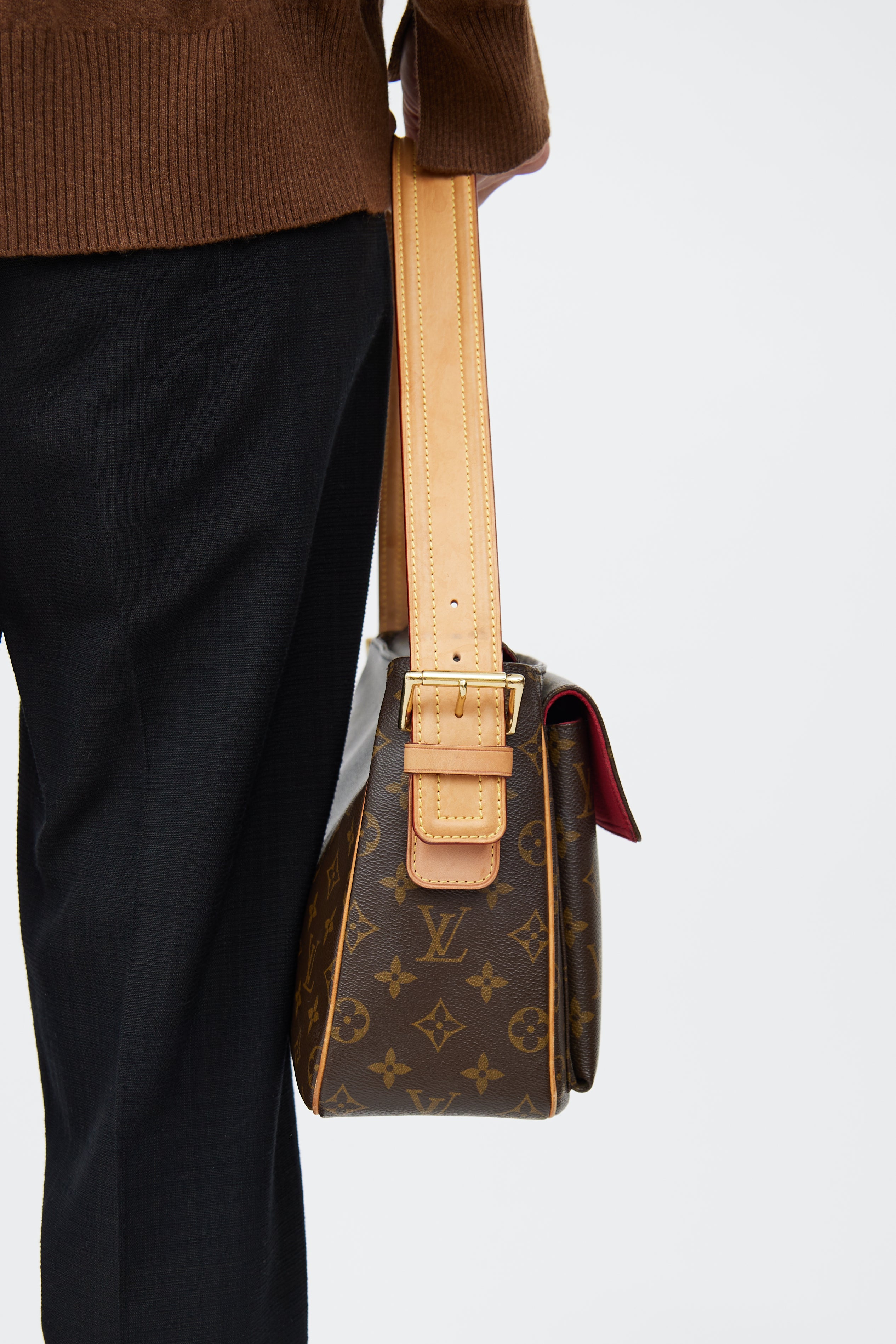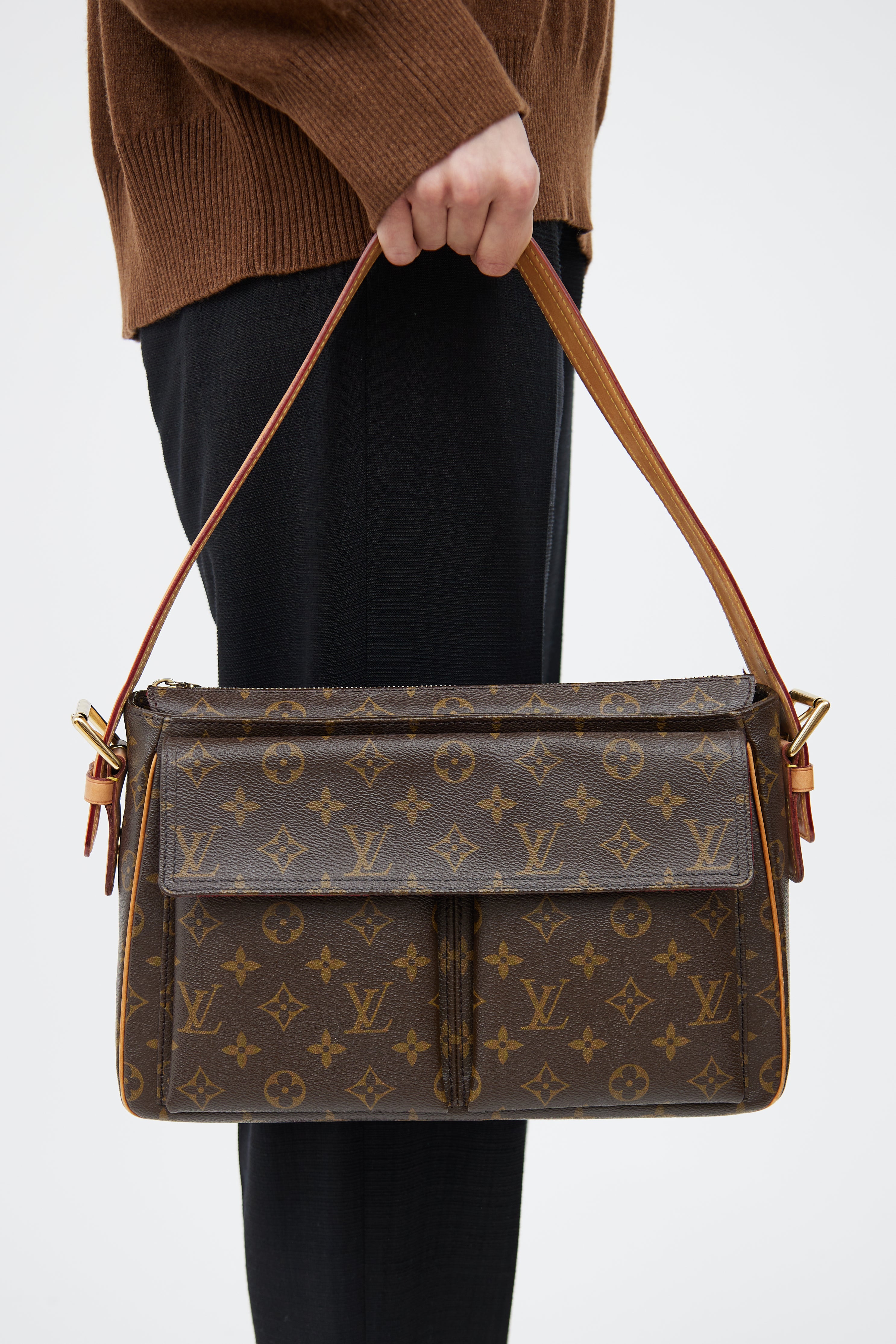 Pre-owned Louis Vuitton brown Viva-Cite GM bag in monogram coated canvas featuring two flap pockets at front, adjustable leather shoulder strap, one main compartment with two slip pockets, and top zip closure. Includes original dust bag.