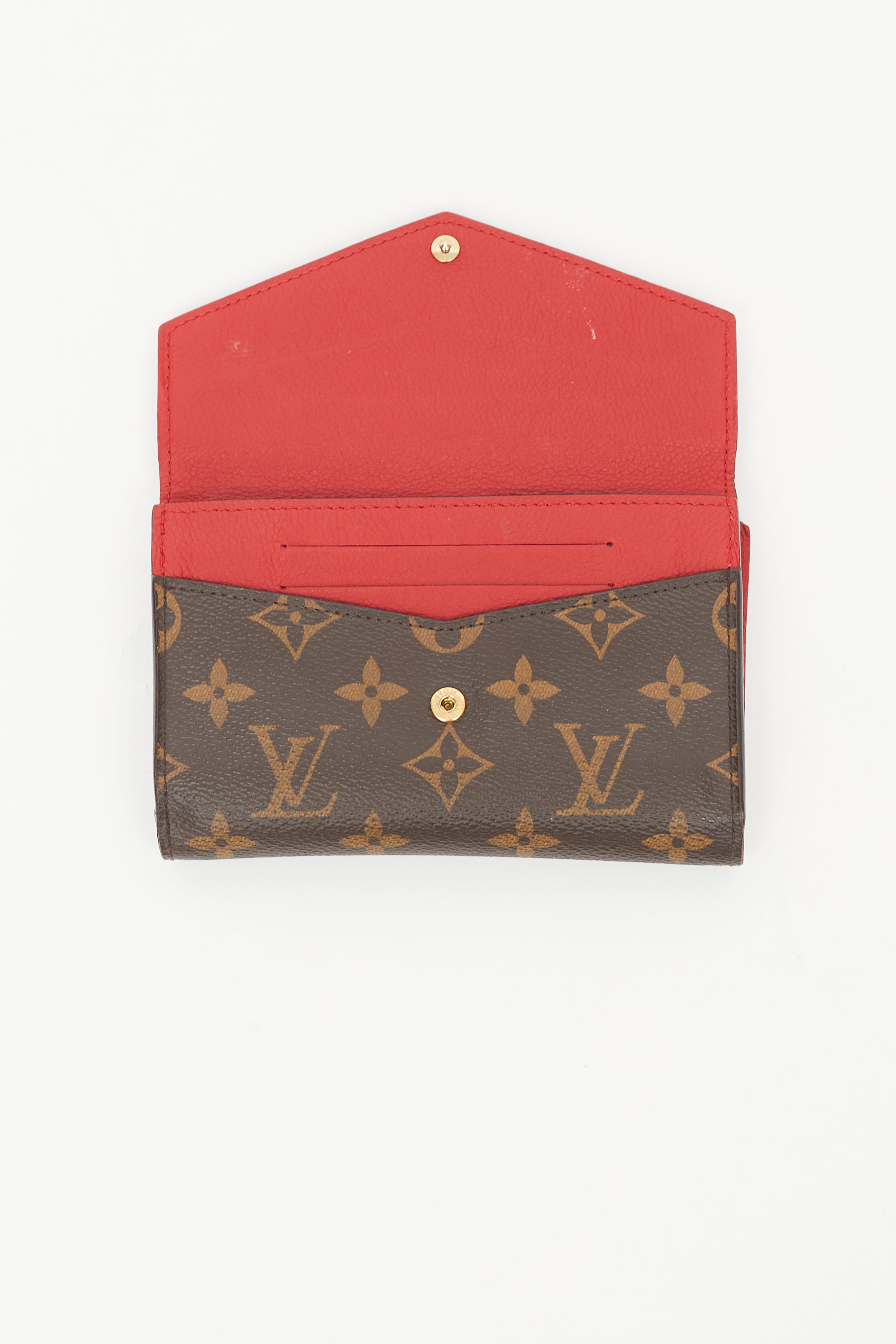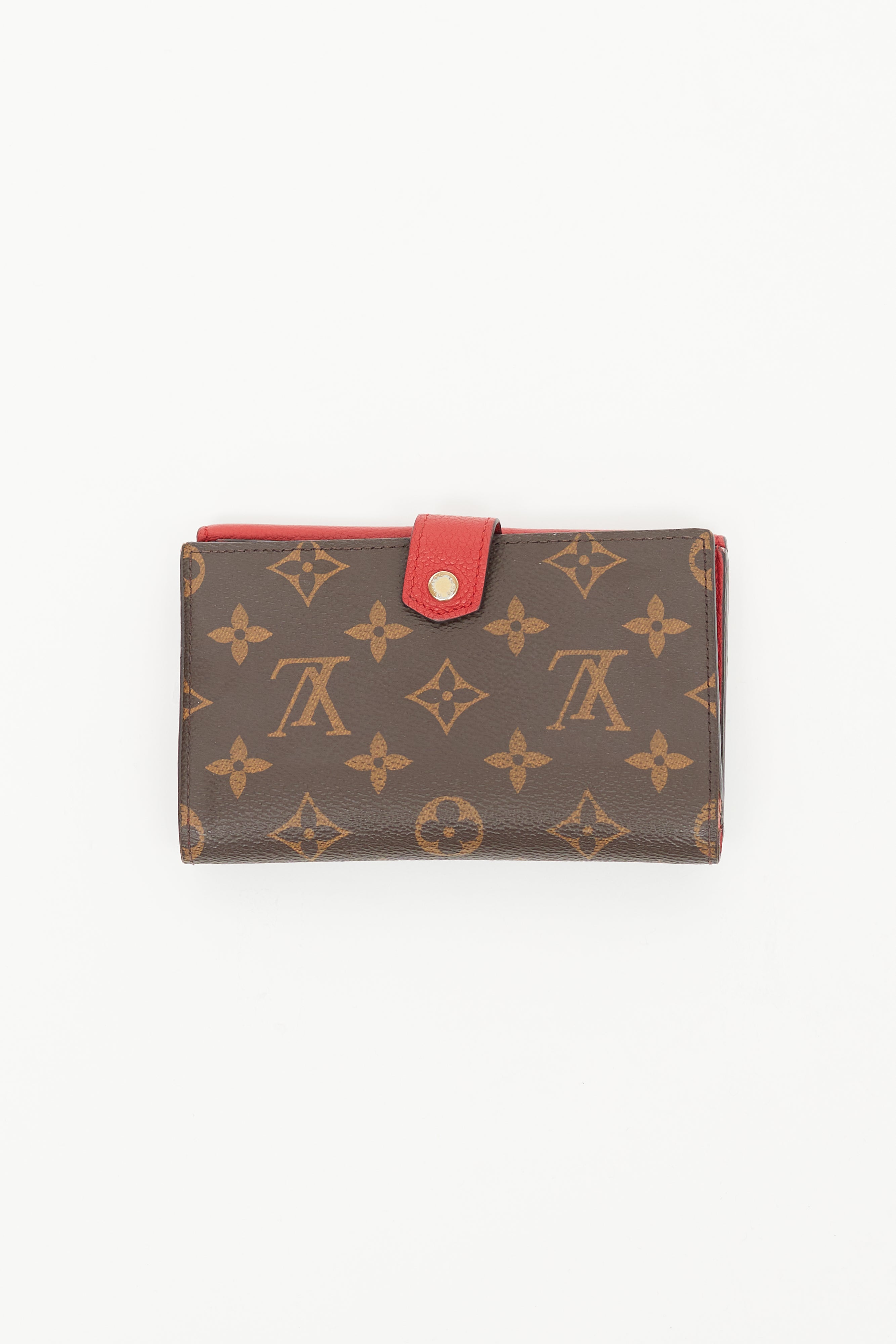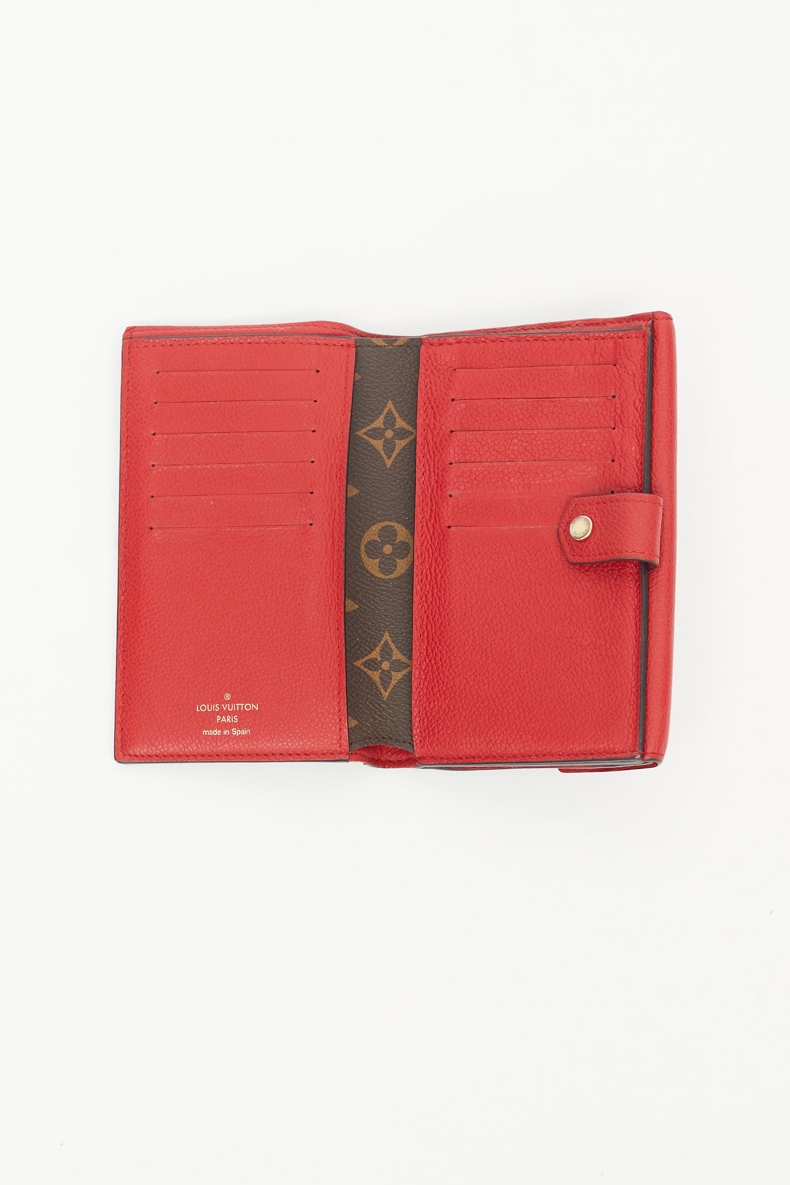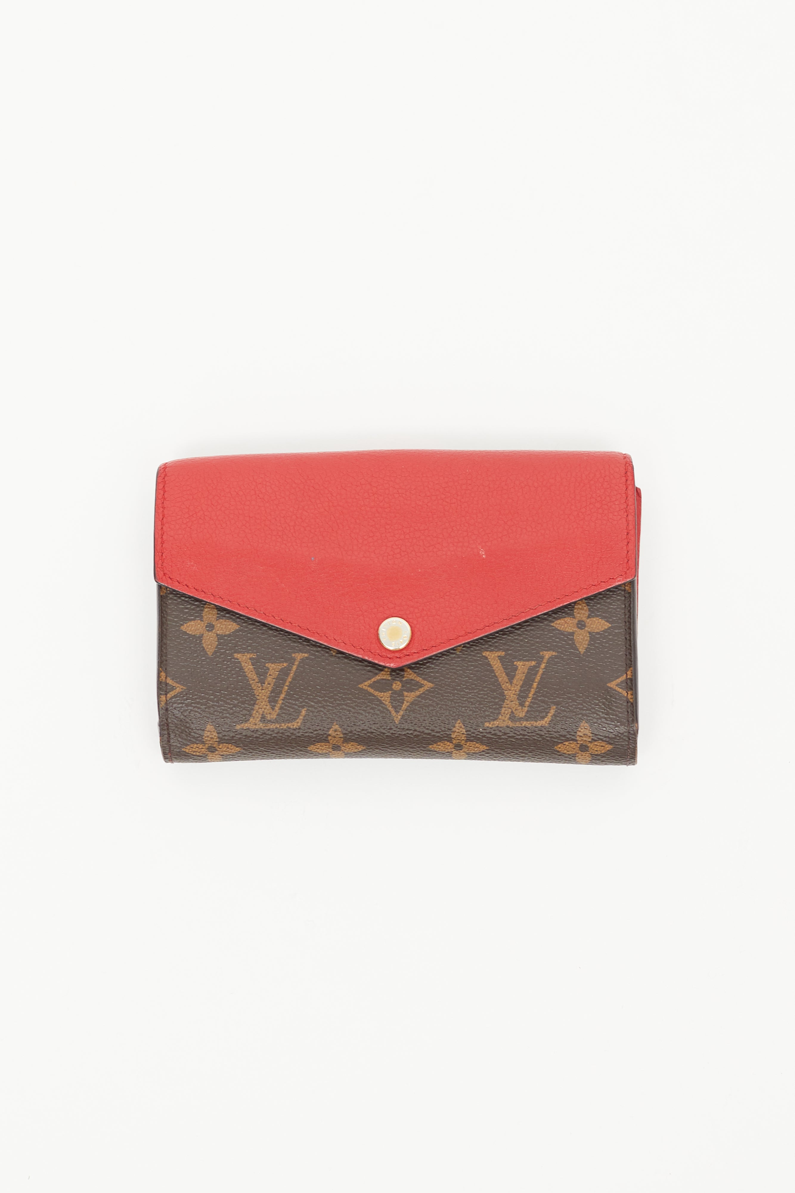 Pre-owned Louis Vuitton Pallas Compact wallet featuring LV monogram coated canvas at exterior, red leather flap with snap closure, one large slip pocket, four smaller slip pockets and fourteen card slots.