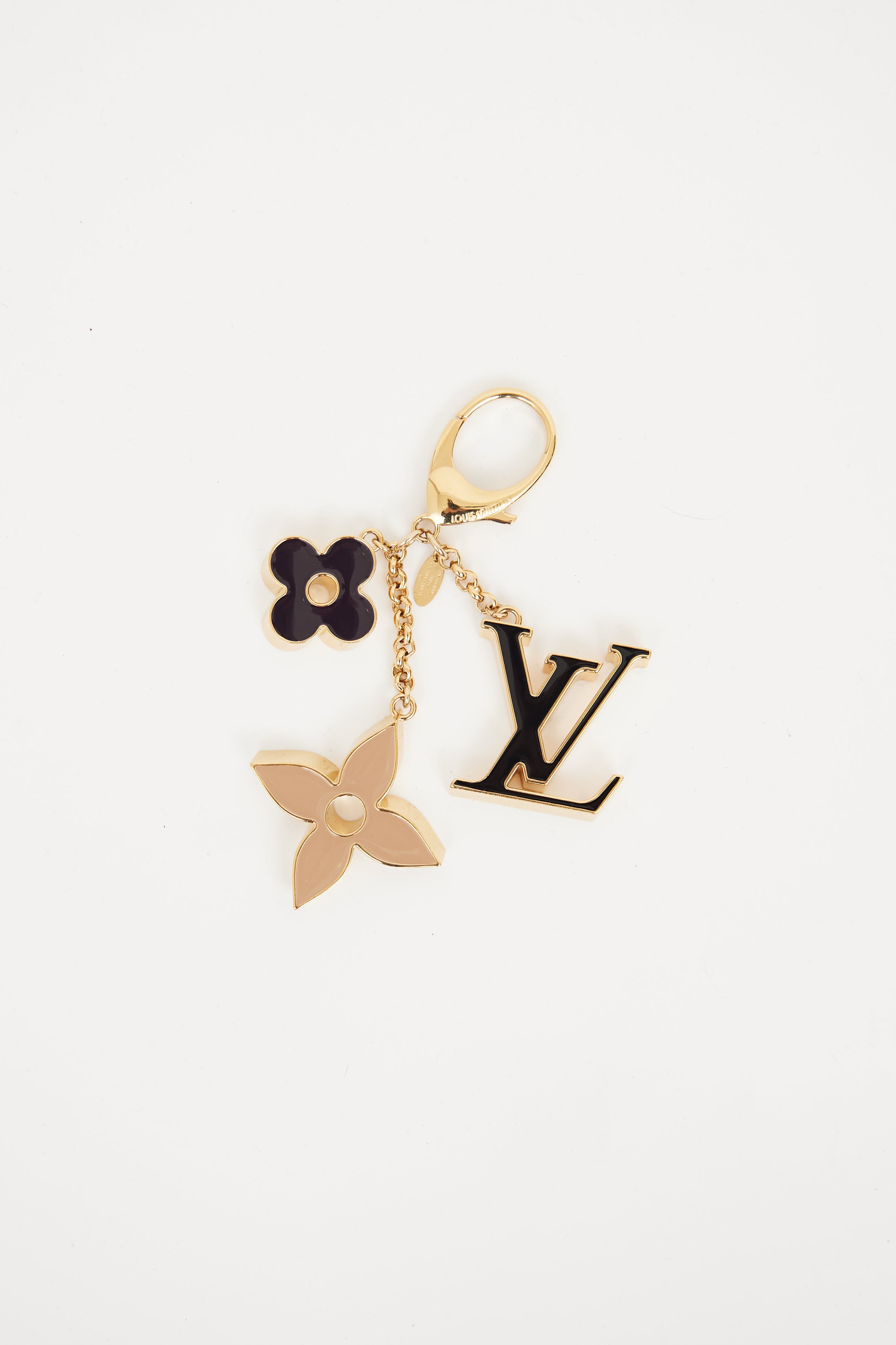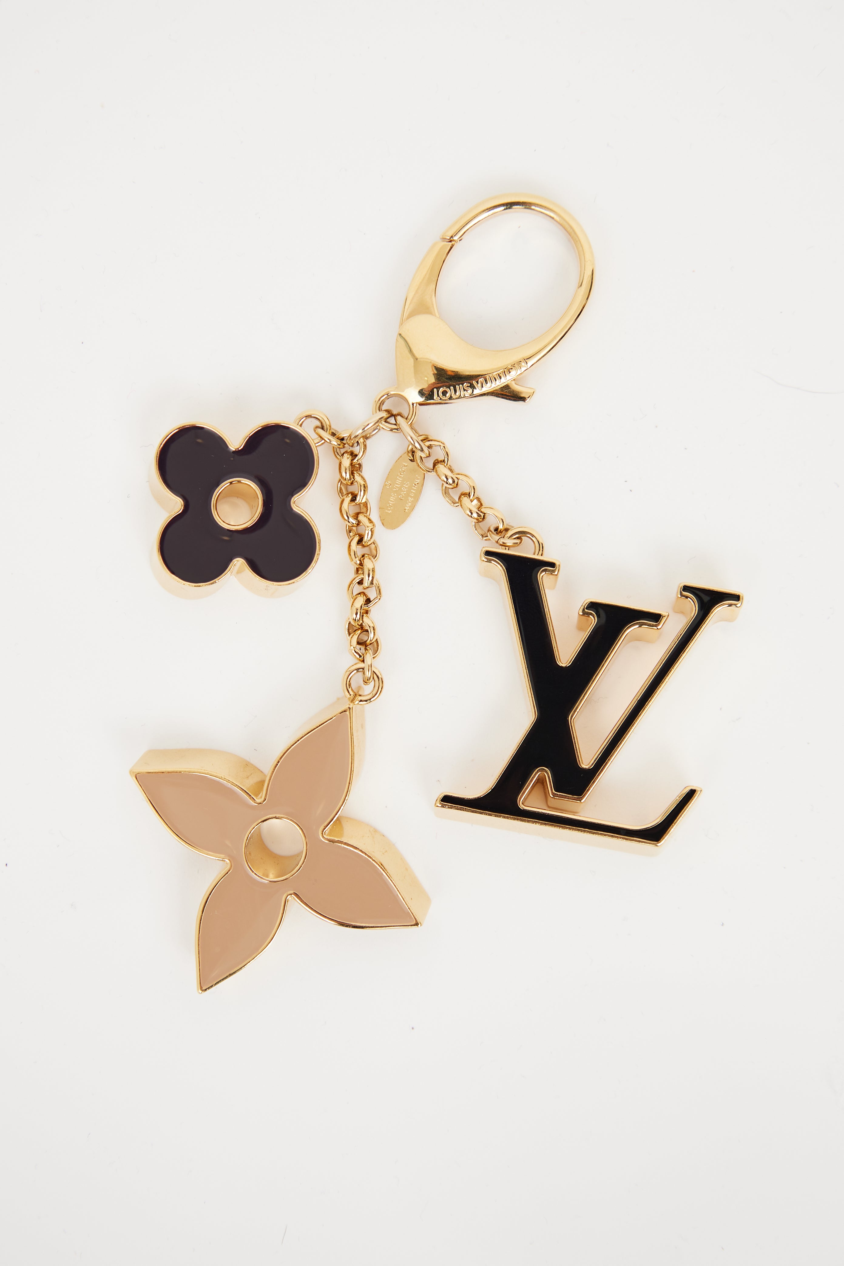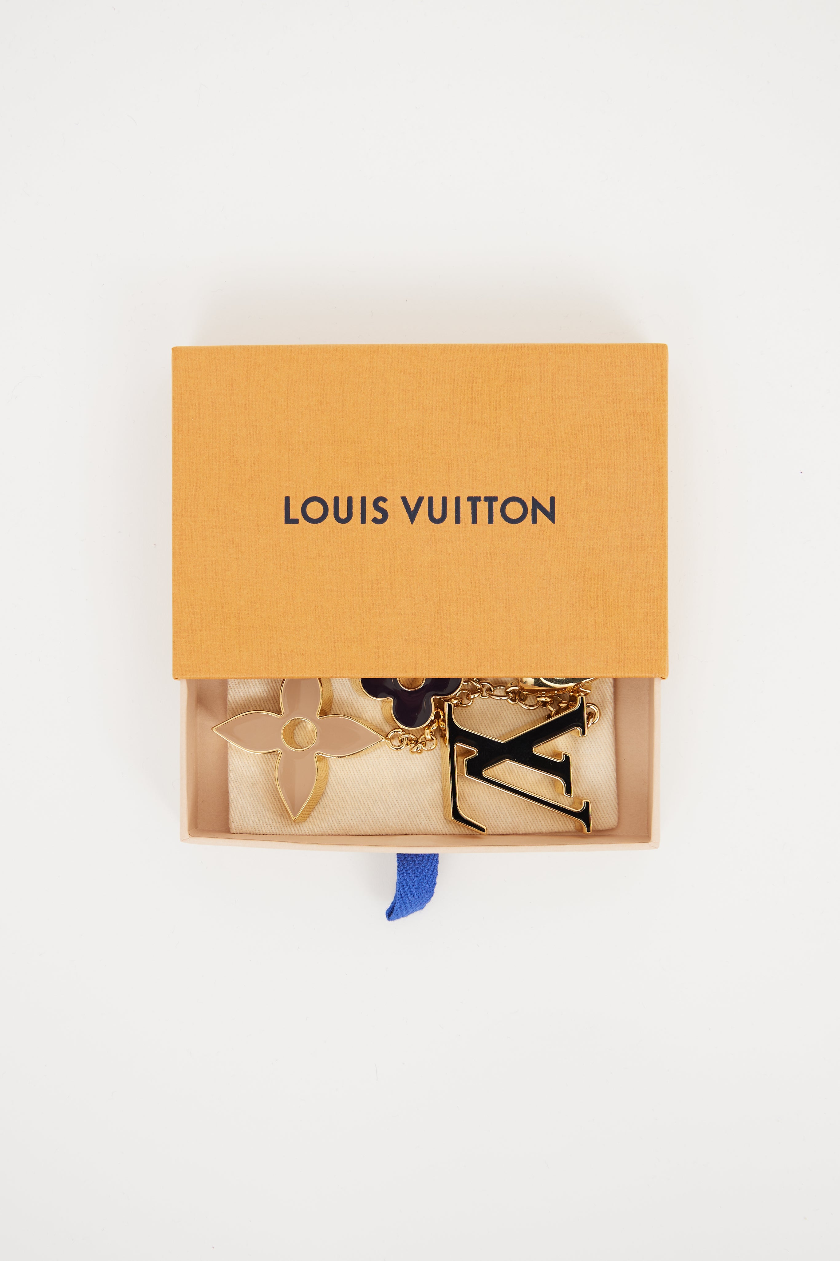 Pre-owned Louis Vuitton gold enamel bag charm featuring three charms on chain link and logo text stamped lobster clasp closure.