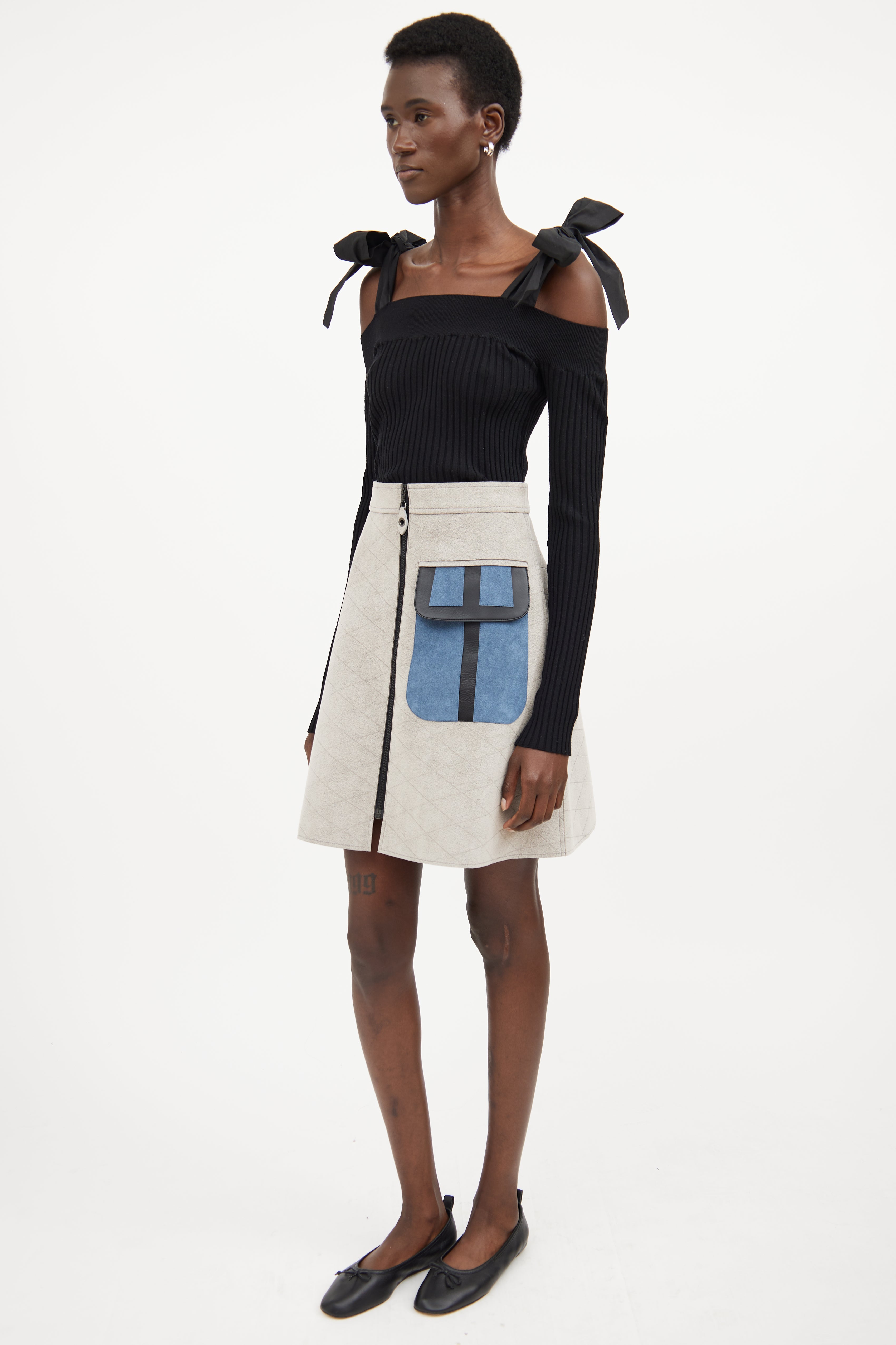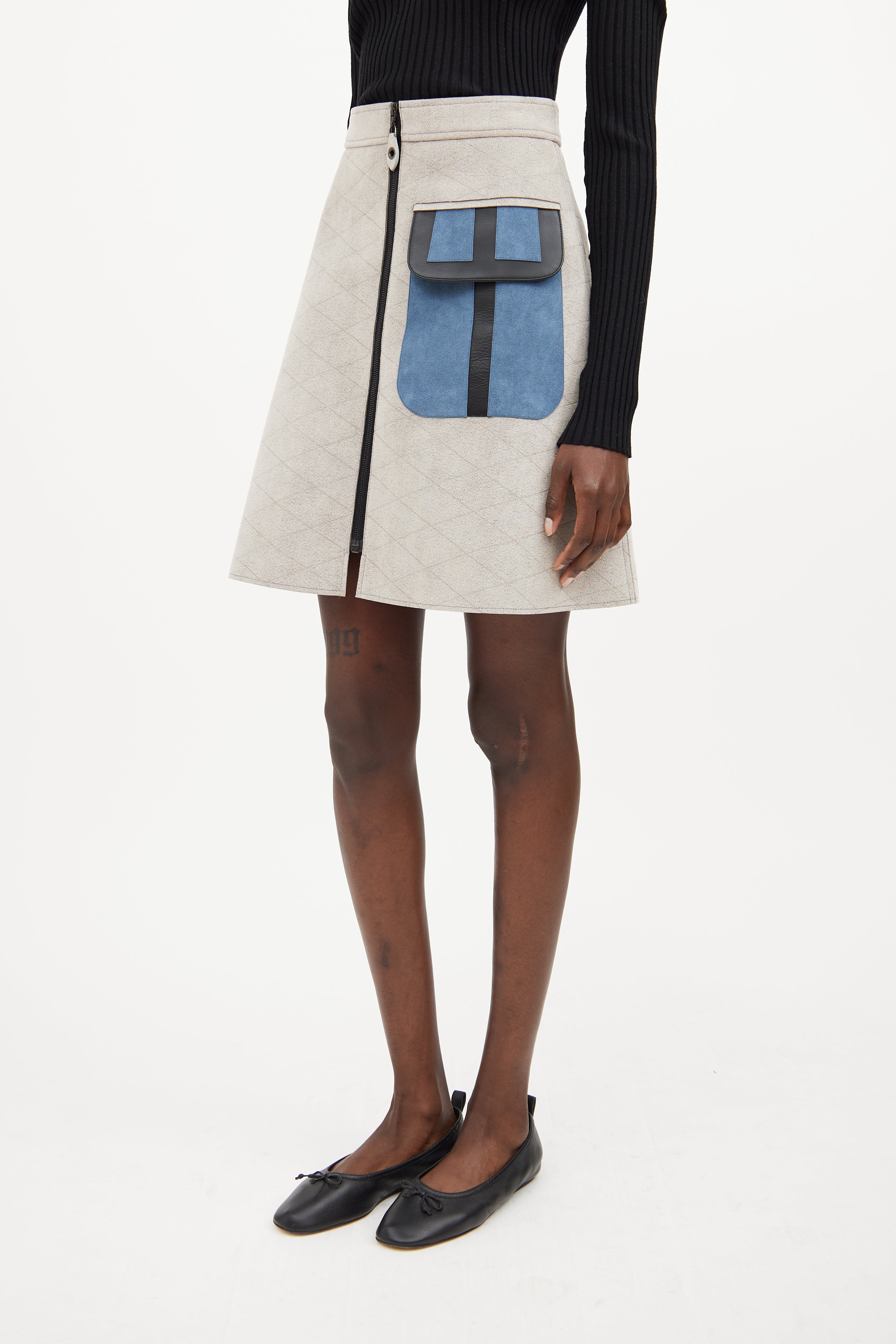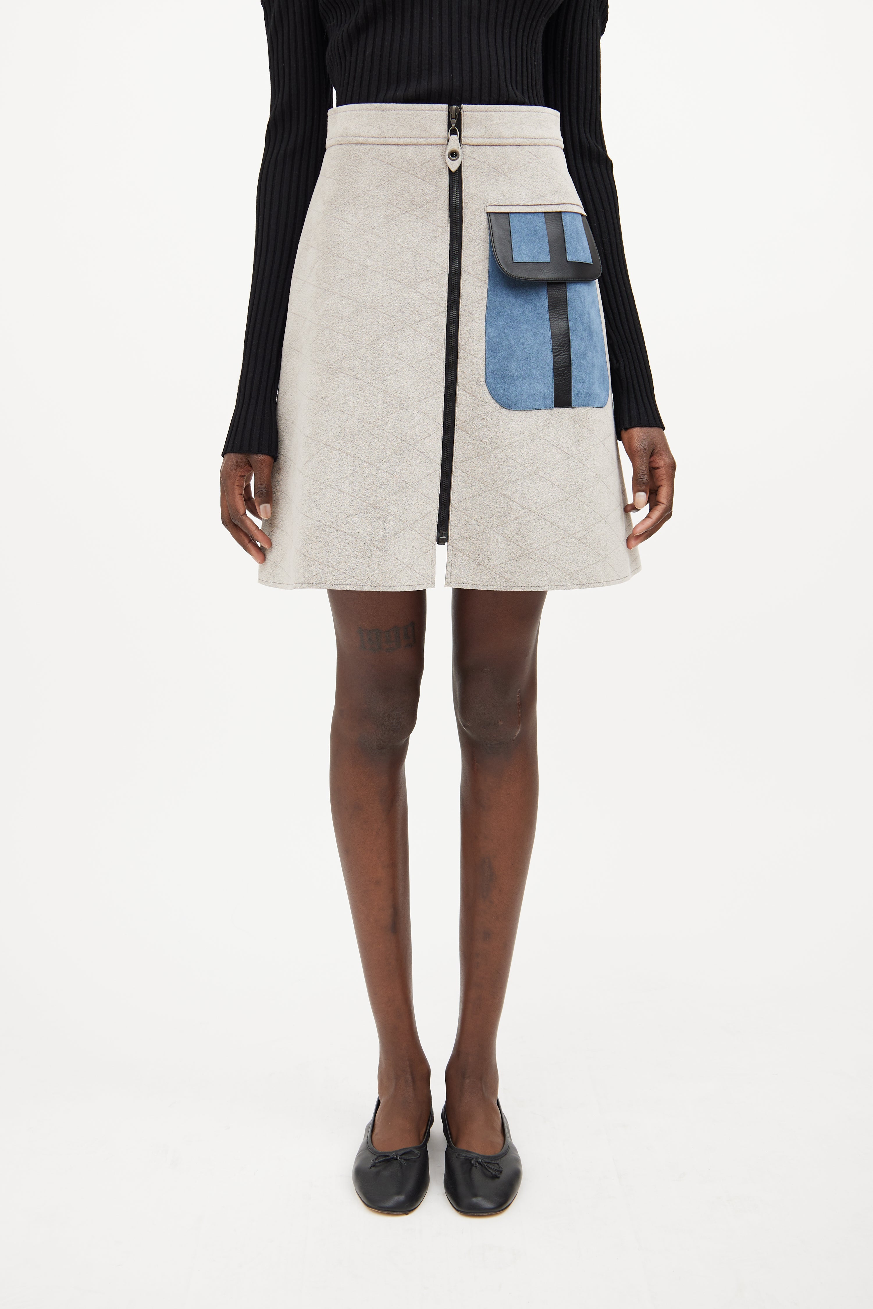 Pre-owned Louis Vuitton grey faux suede skirt featuring a blue leather flap pocket at front, quilted stitching, and zip front closure.