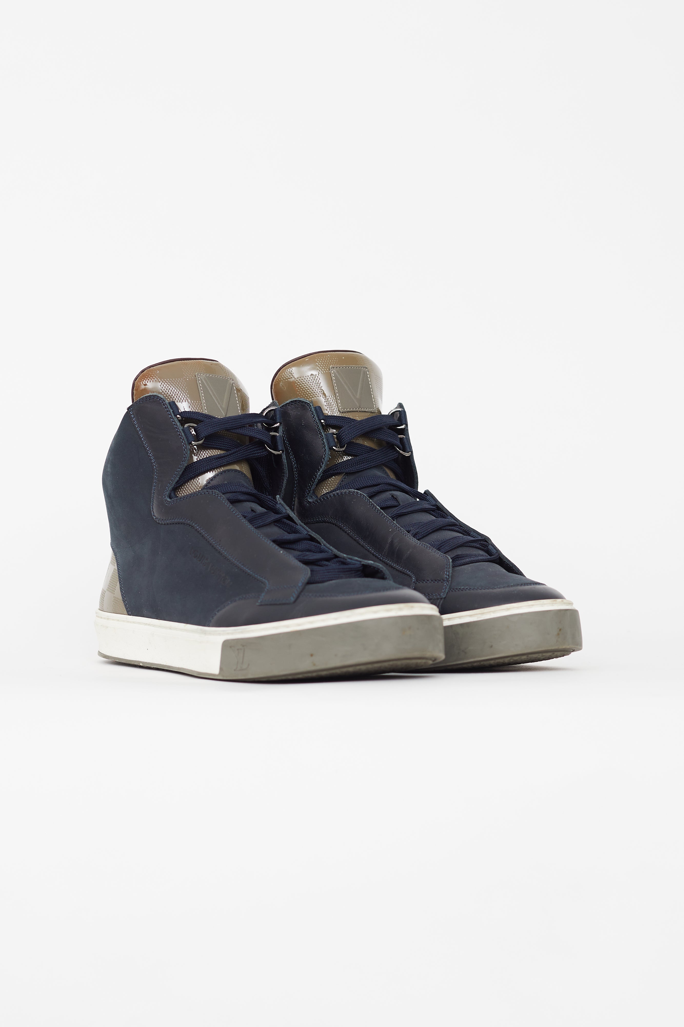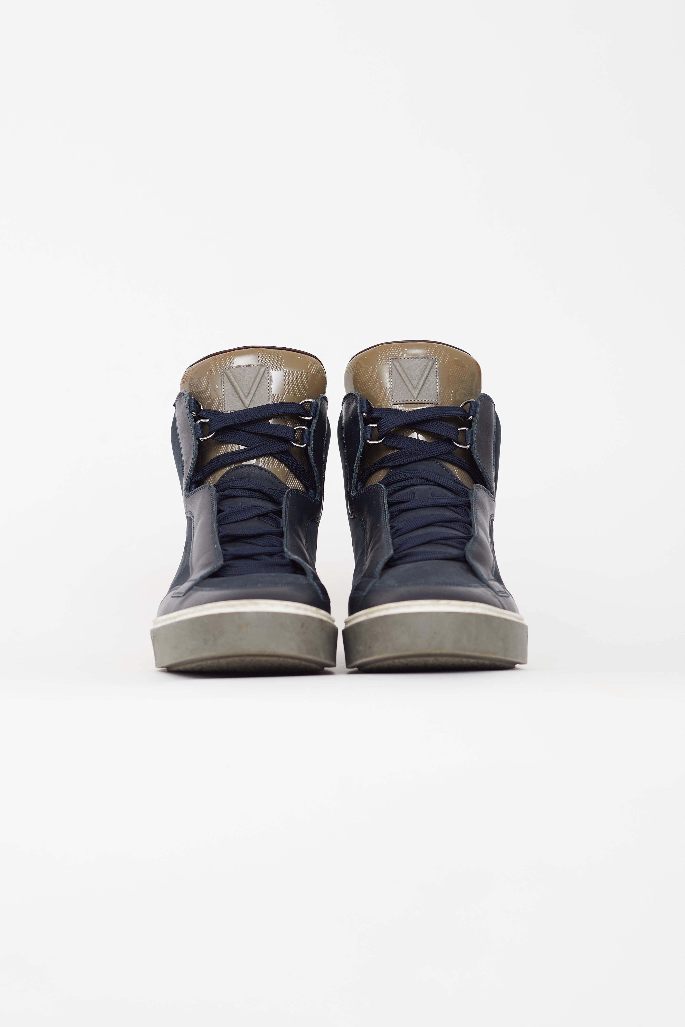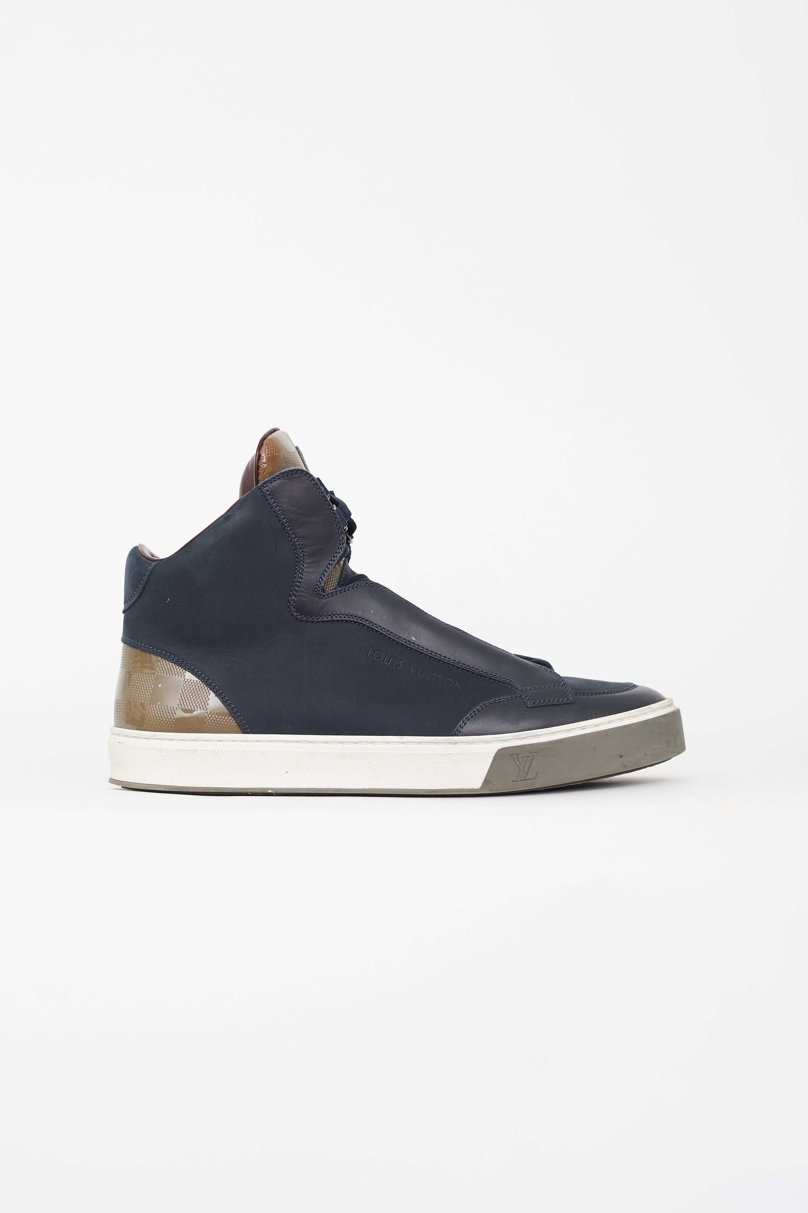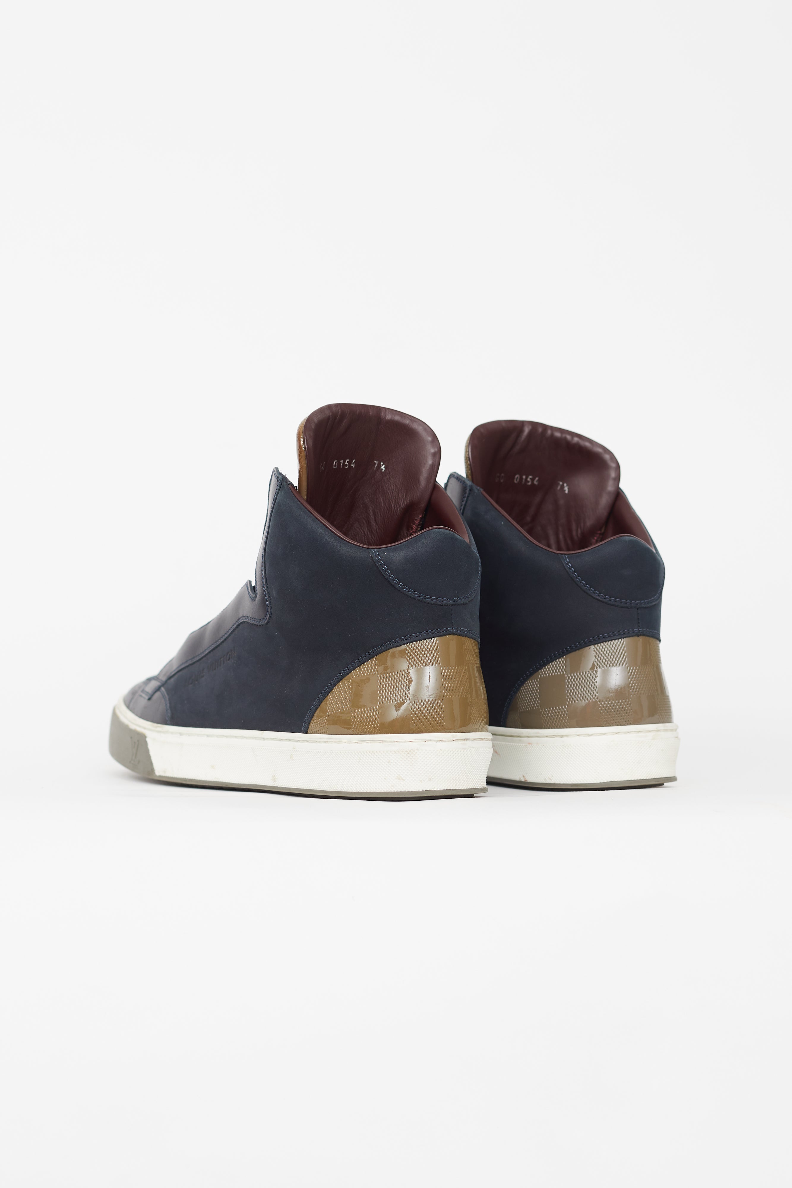 Pre-owned Louis Vuitton navy high top sneakers featuring rounded toe, embossed logo at side, lace up vamp, khaki green Damier print at tongue and heel counter, V logo tab at tongue, and leather insole. Comes with original dust bag.