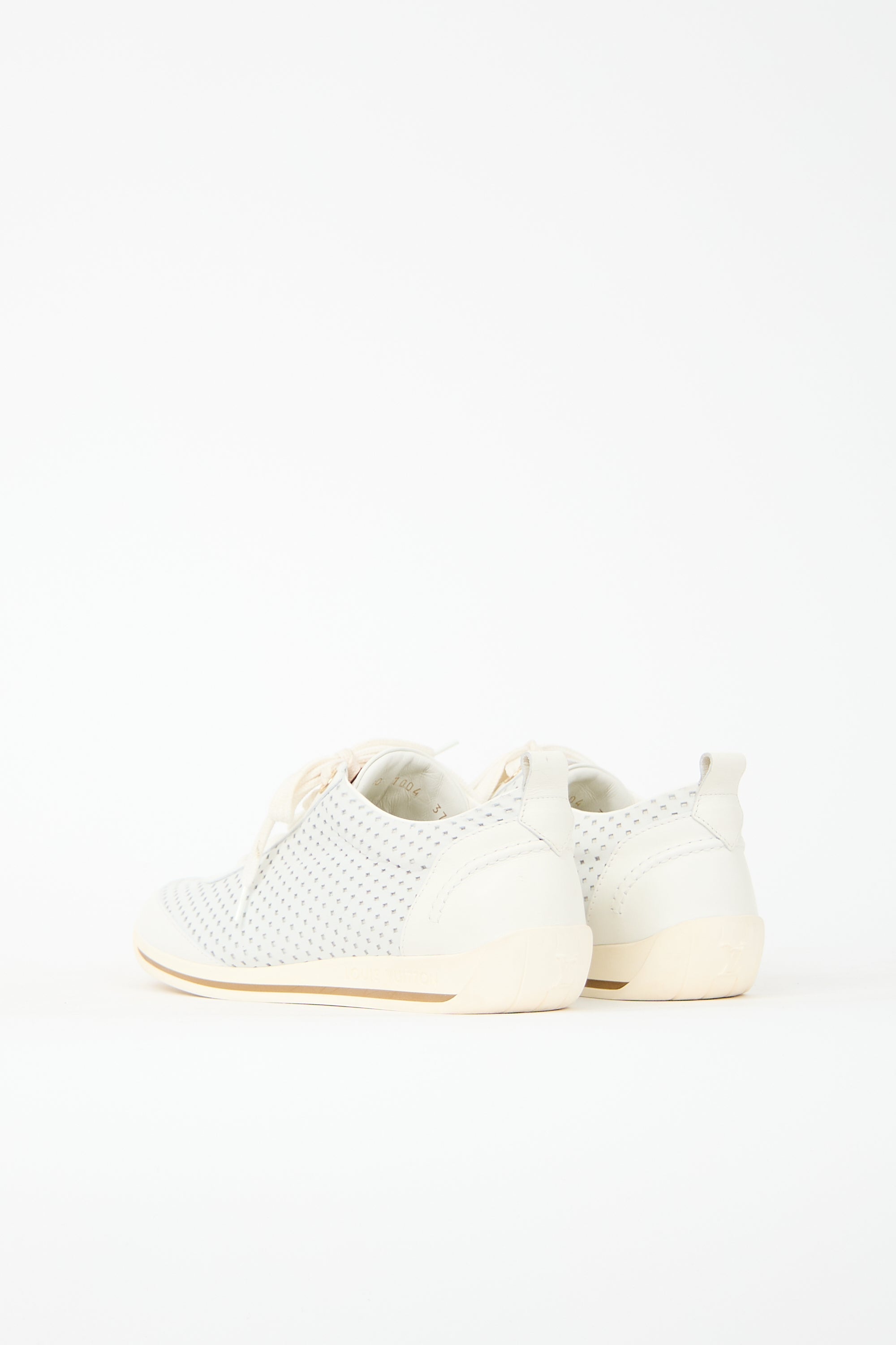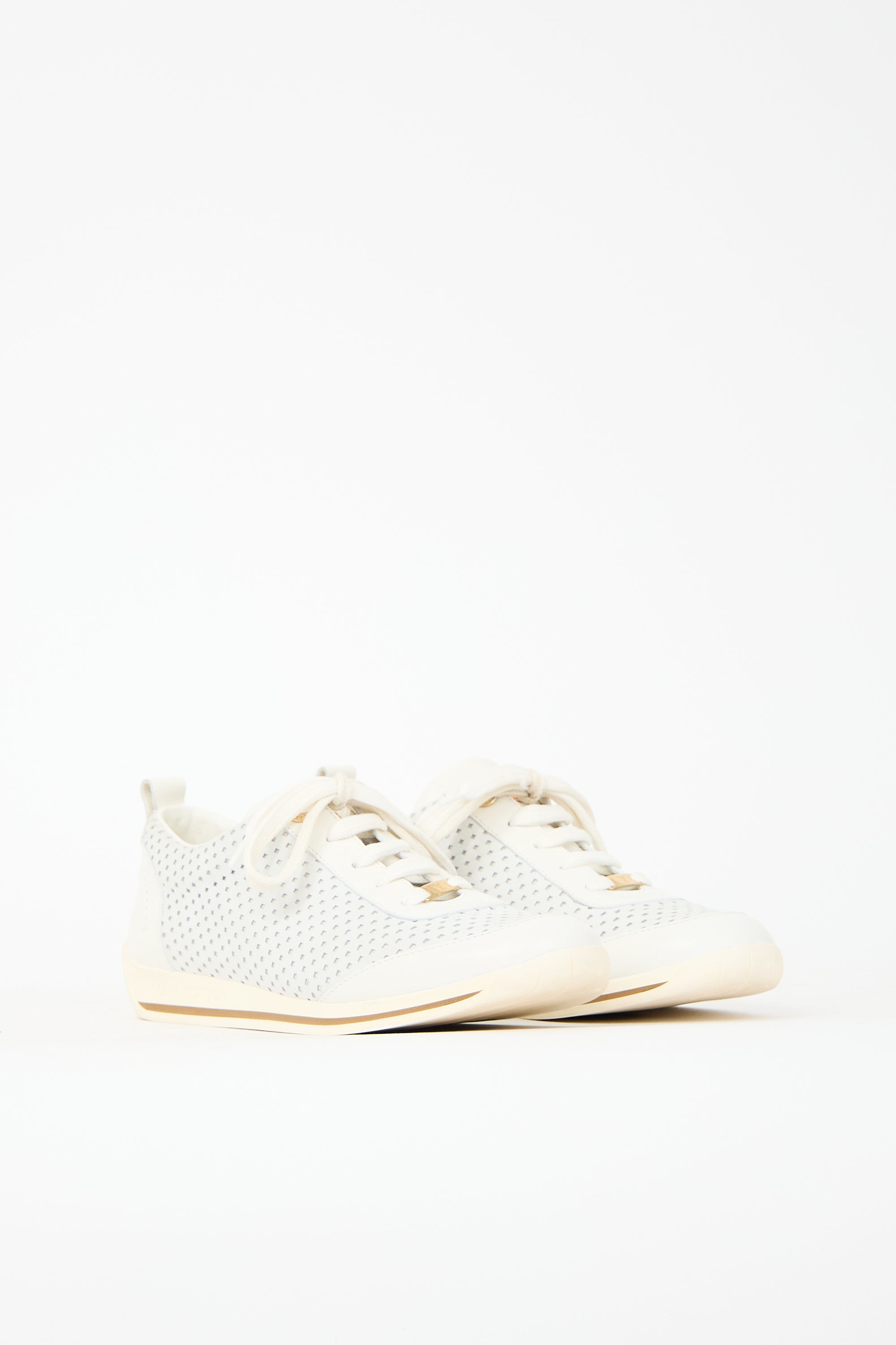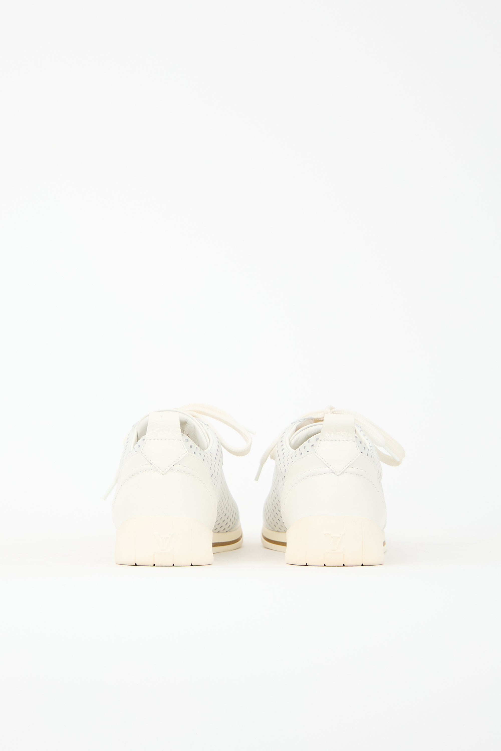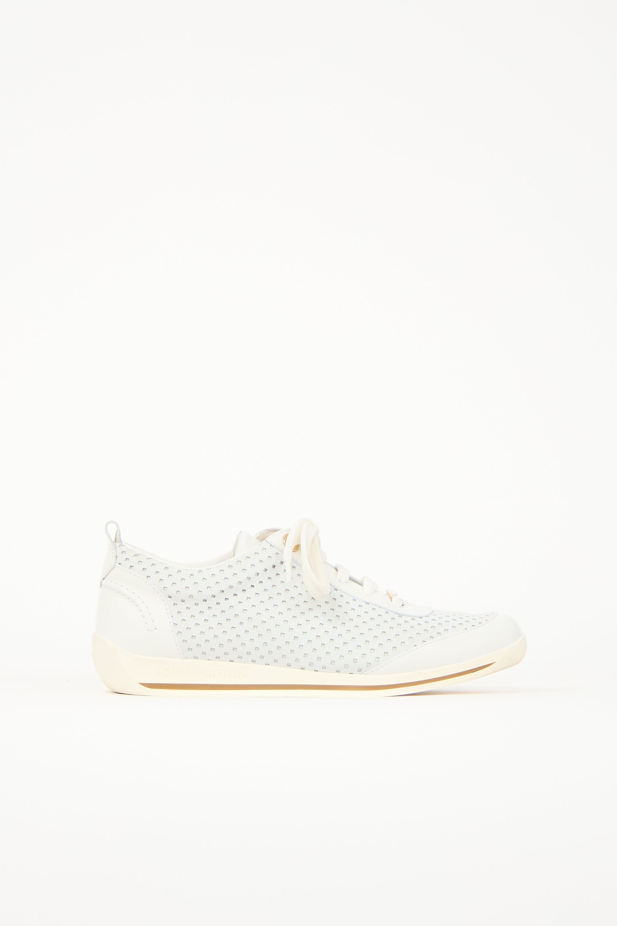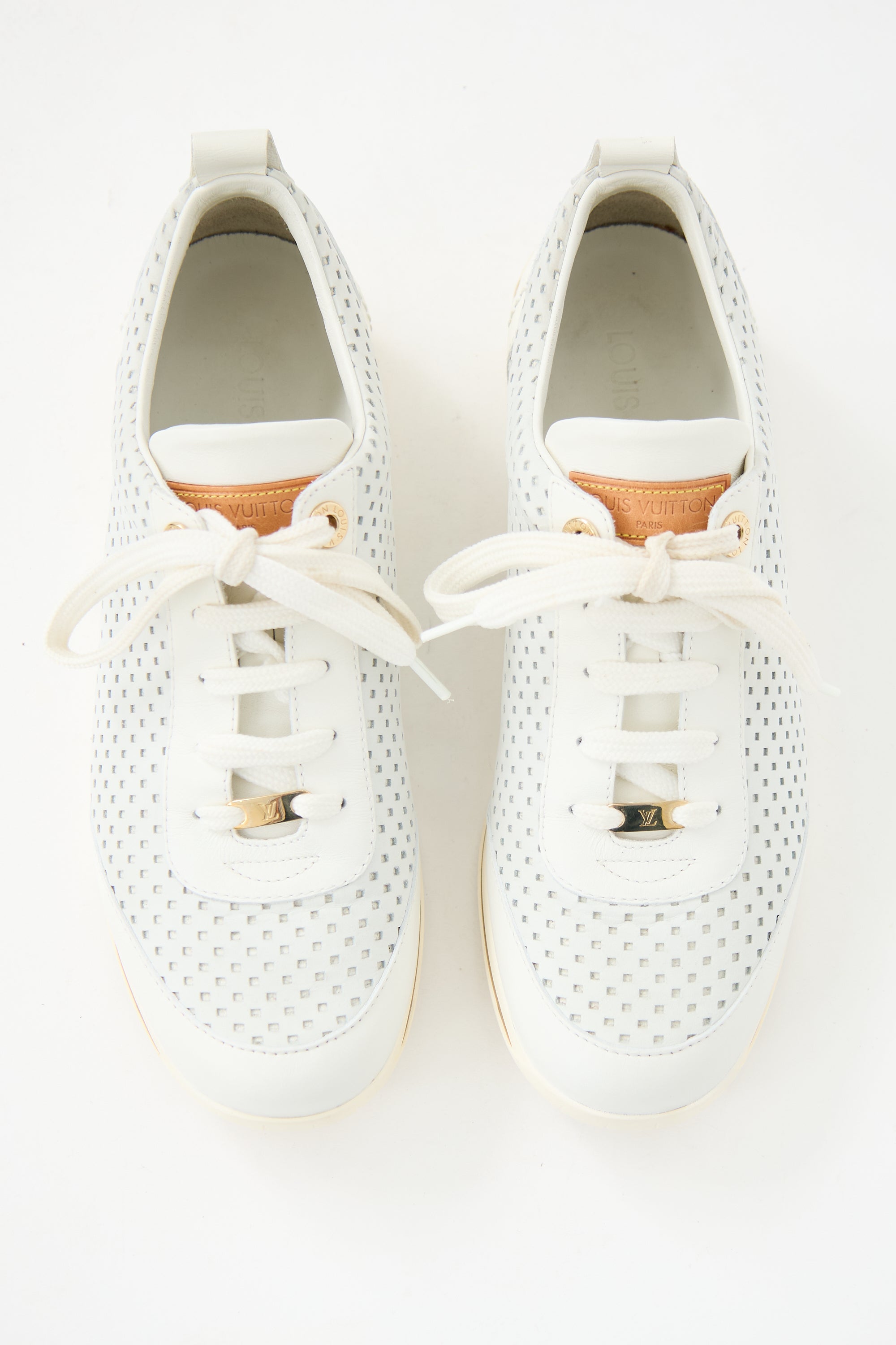 Pre-owned Louis Vuitton white and grey sneakers featuring a rounded toe, perforated leather upper, lace up front, gold tone logo eyelet at collar, logo debossed outsole, and rubber sole. Comes with original box.