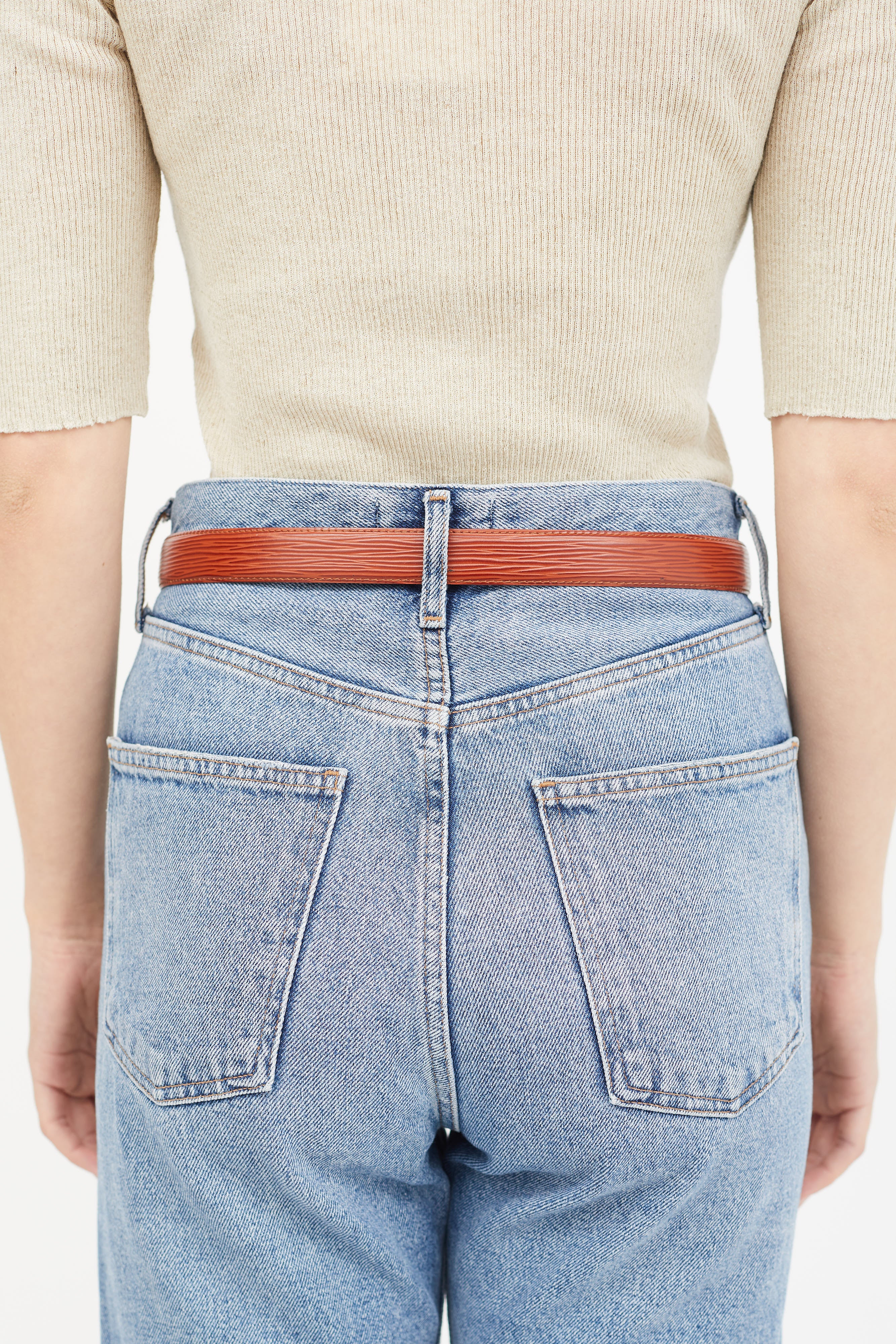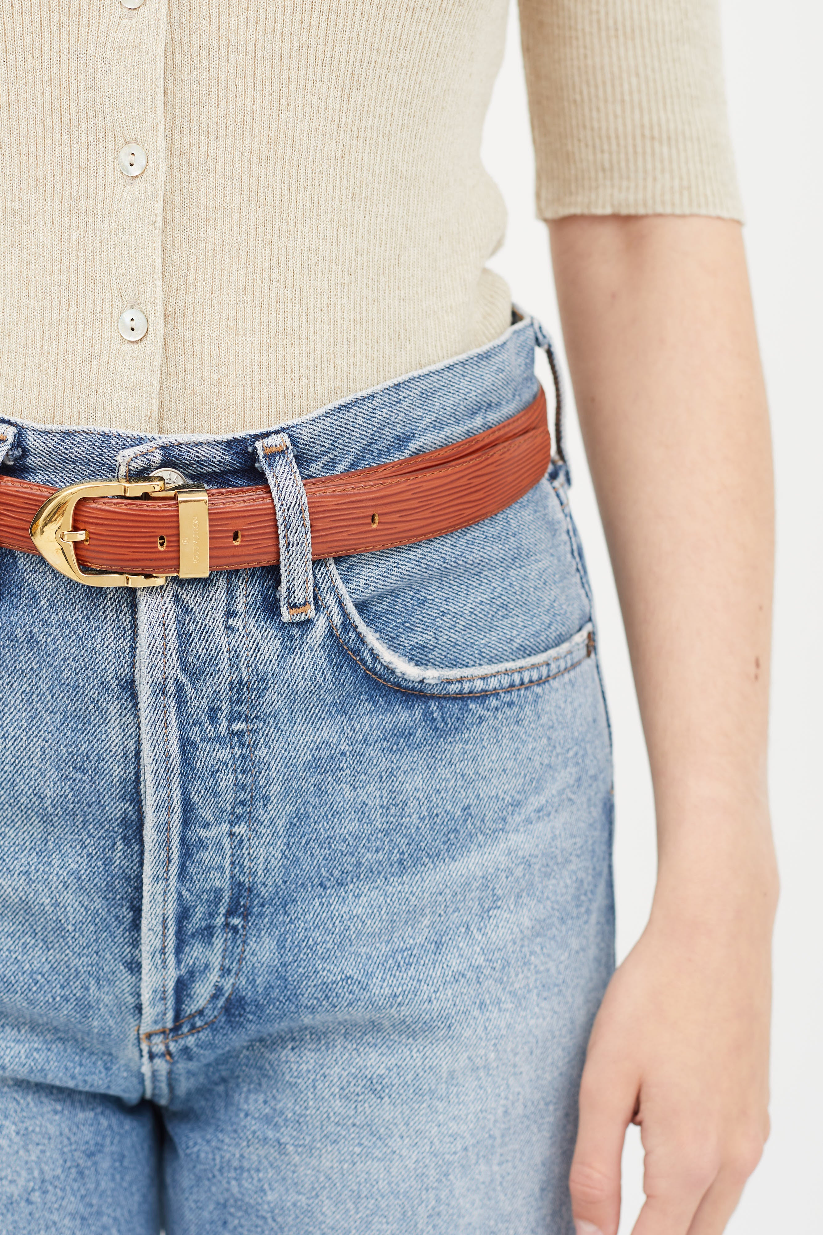 Pre-owned Louis Vuitton red Epi leather gold buckle belt featuring a red textured Epi leather strap, geometric gold tone buckle with embossed logo and a classic belt buckle closure.