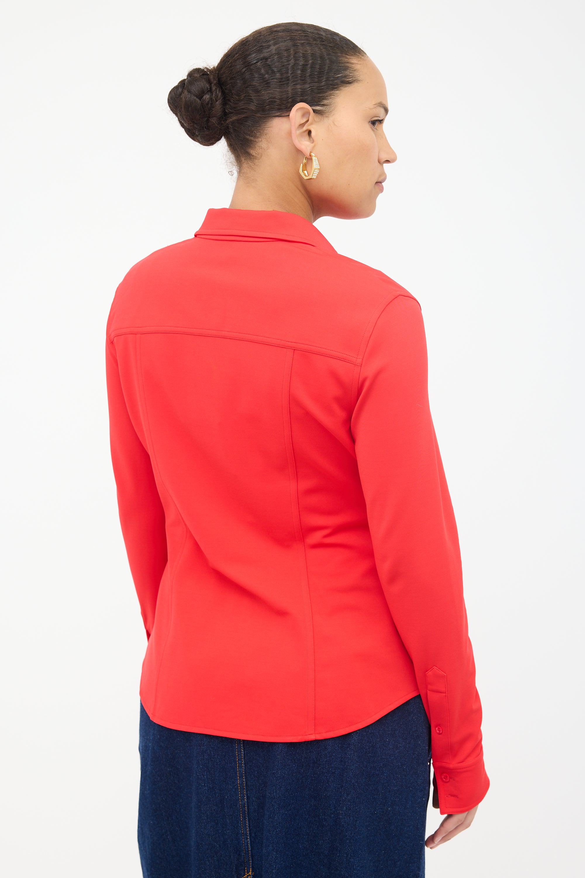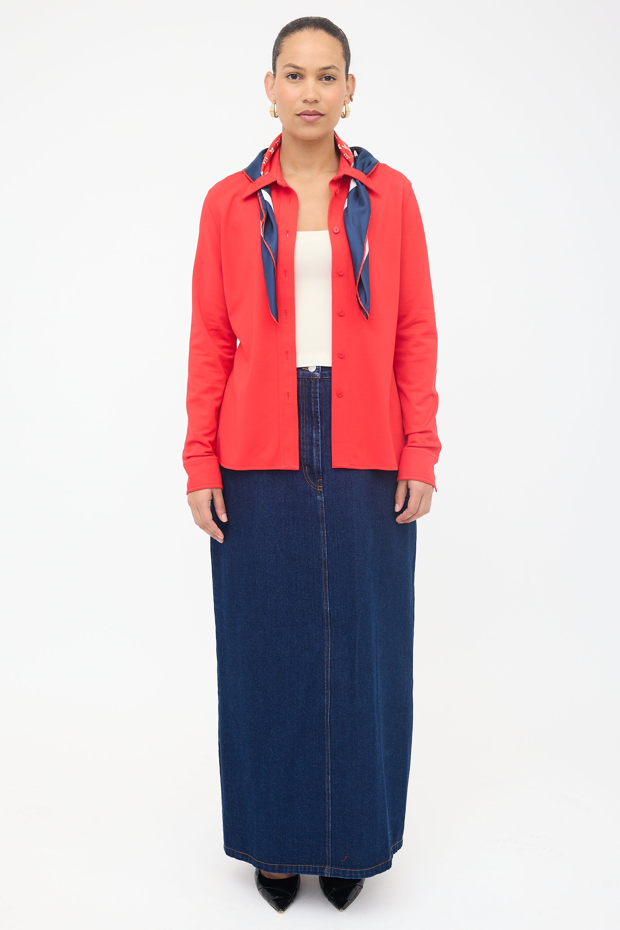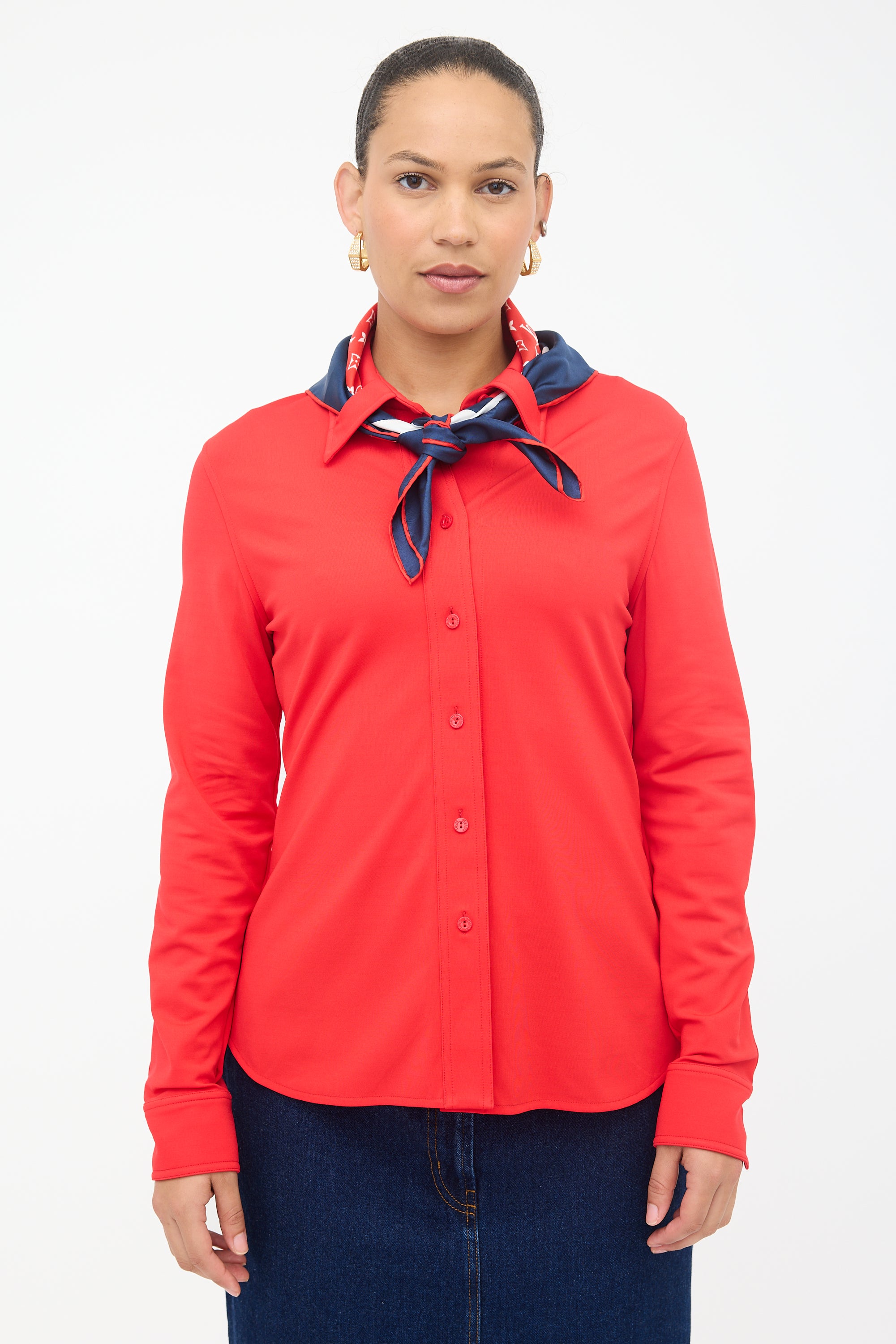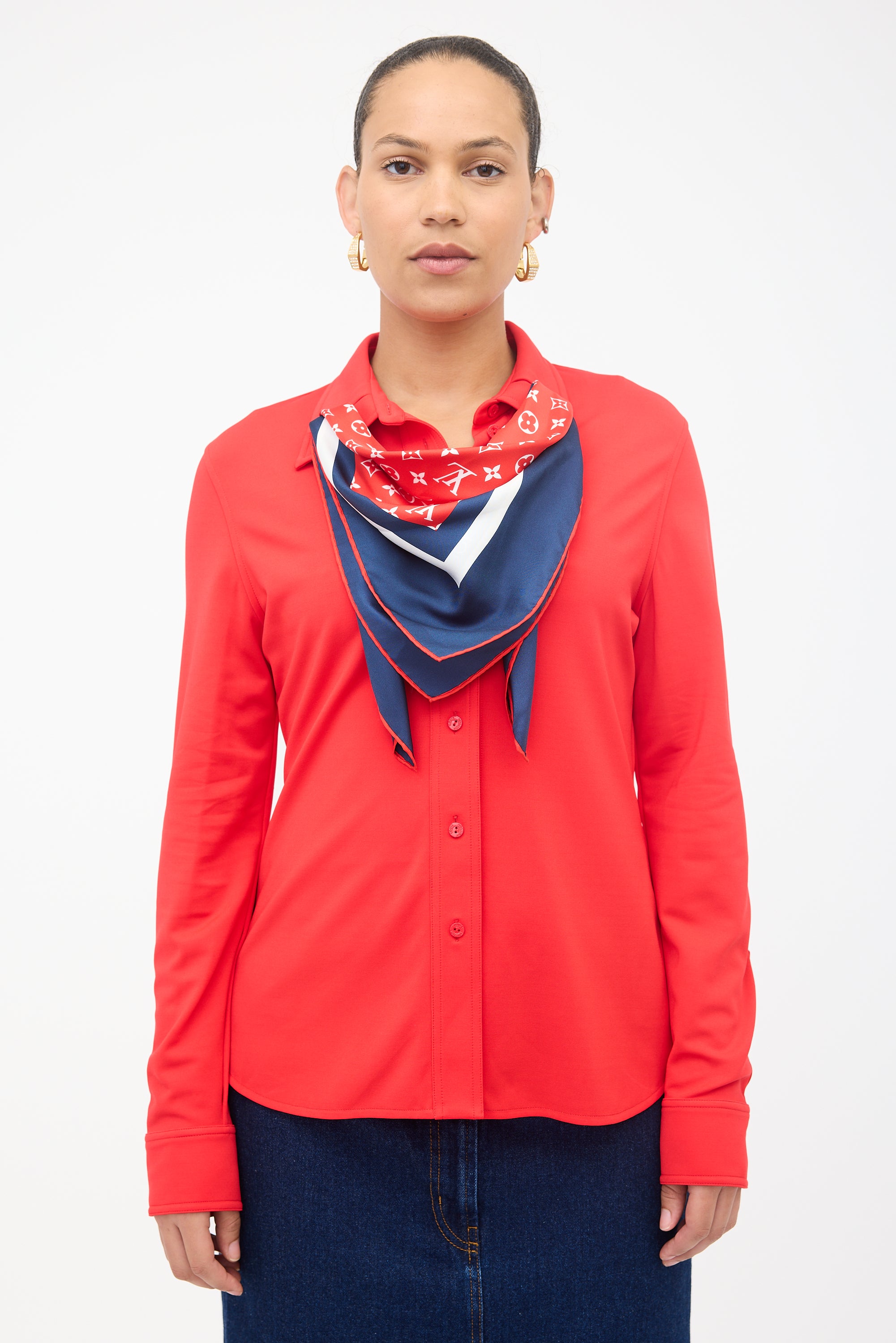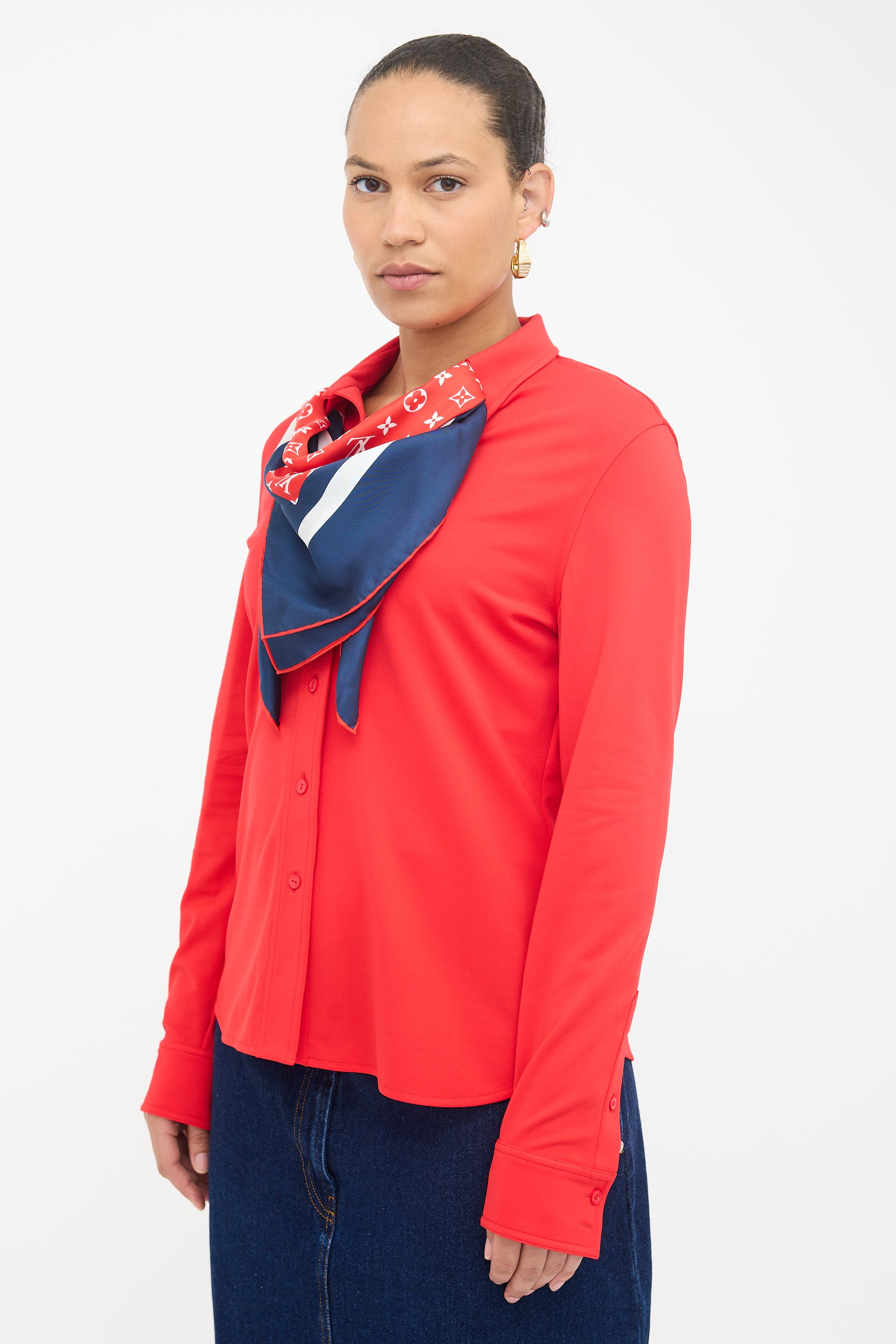 Louis Vuitton Japan exclusive red shirt featuring a point collar with red and blue silk scarf attachment, button front, and buttoned cuffs.