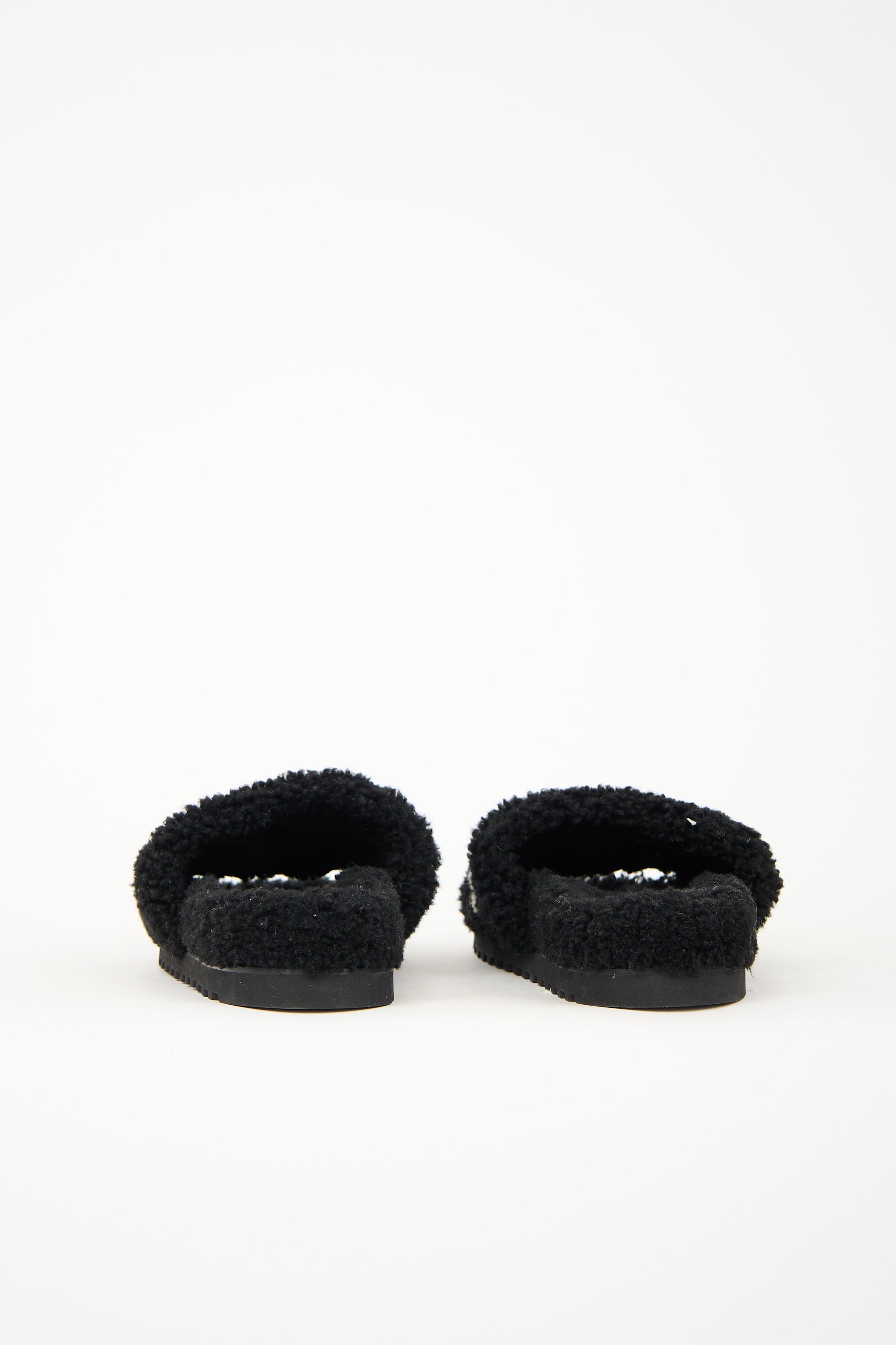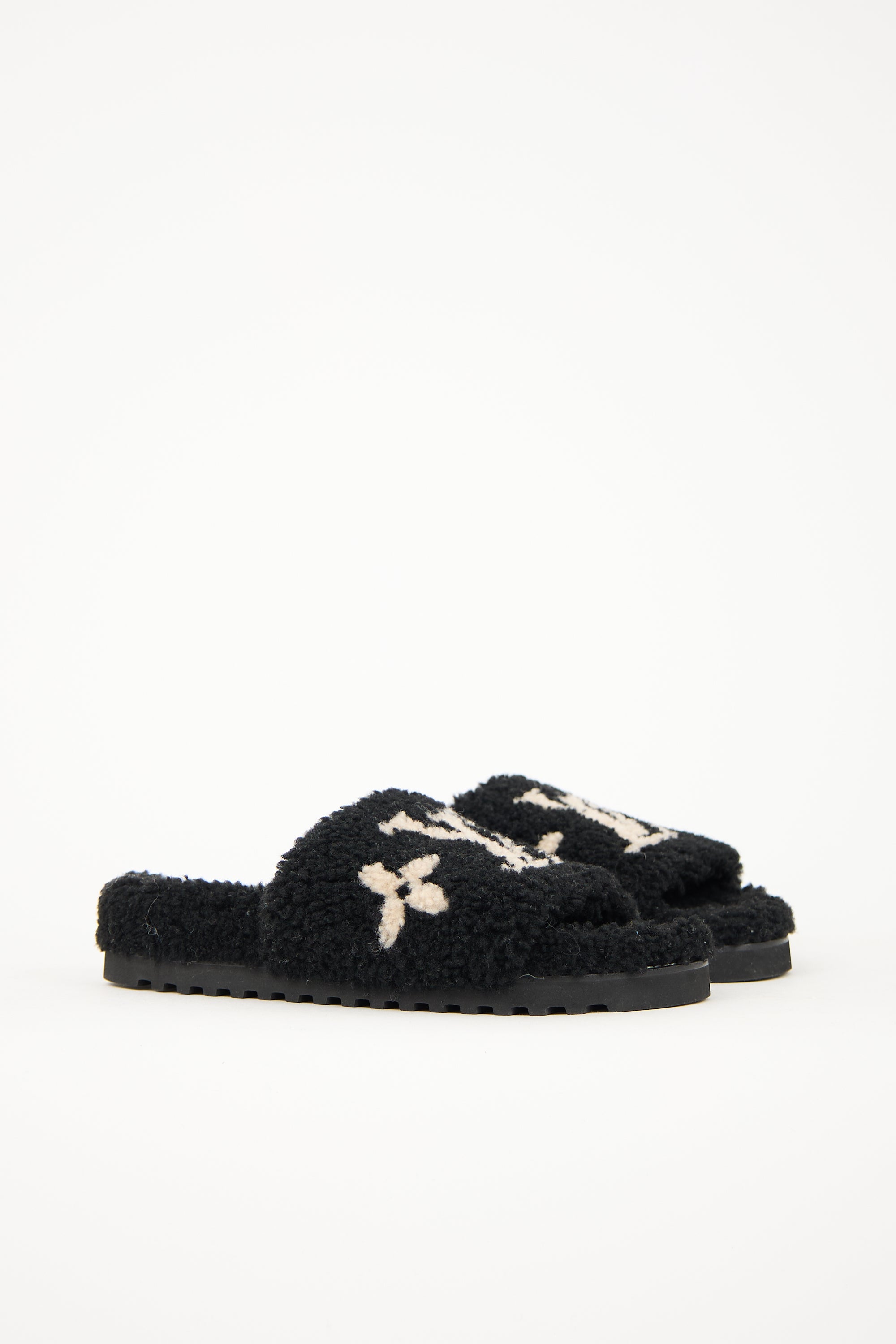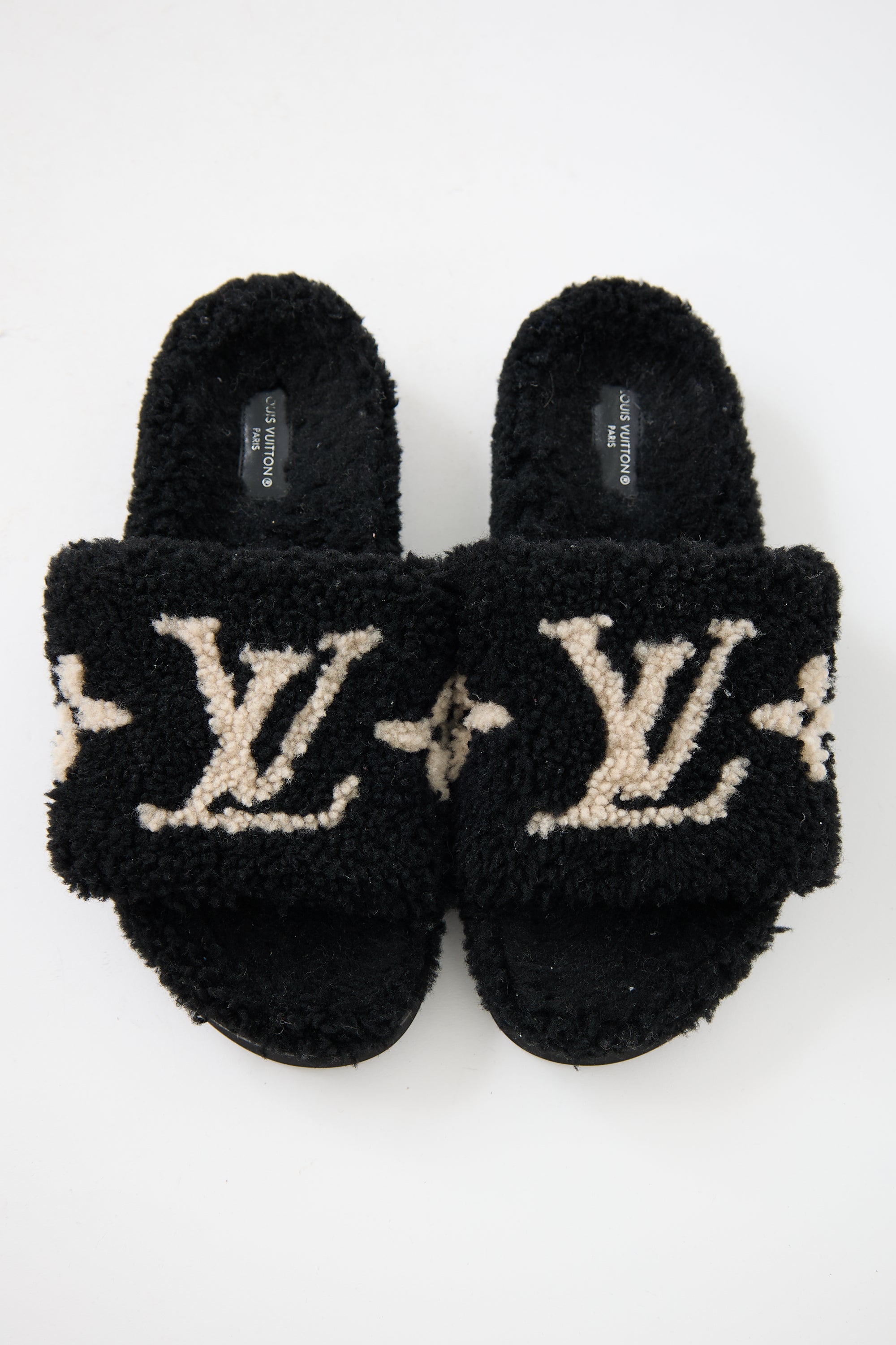 Pre-owned Louis Vuitton black and cream shearling Bom Dia slides featuring open rounded toe, logo strap, and rubber outsole.