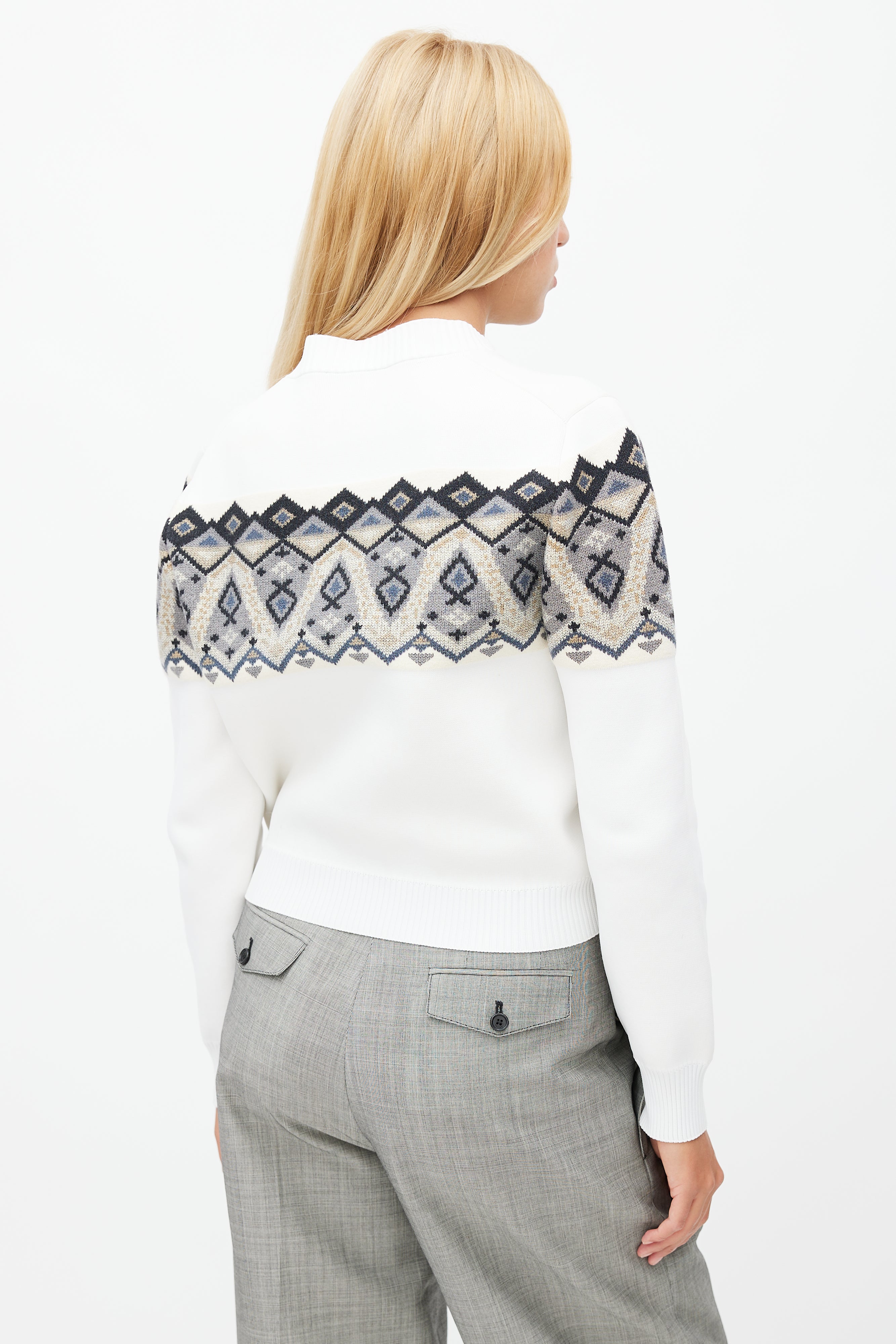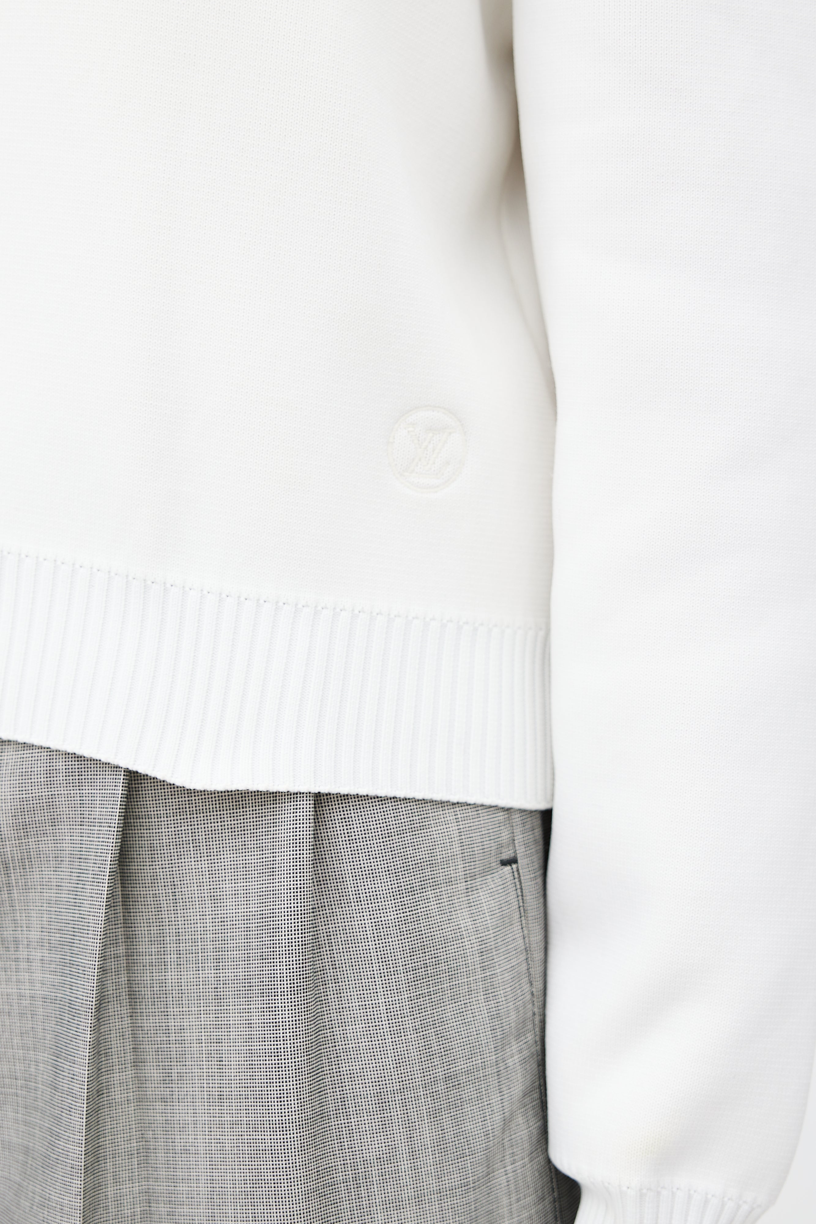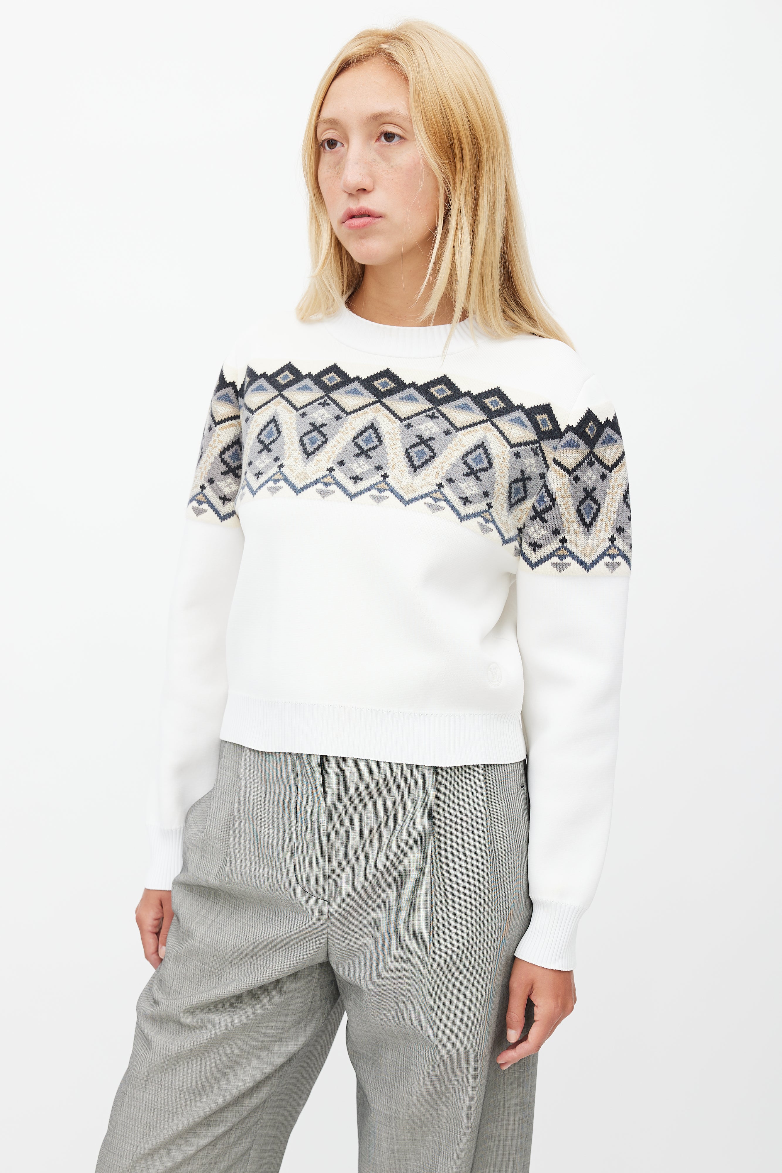 Pre-owned Louis Vuitton white sweater featuring ribbed collar, multicolour knit intarsia at chest, and embroidered logo at left hem.