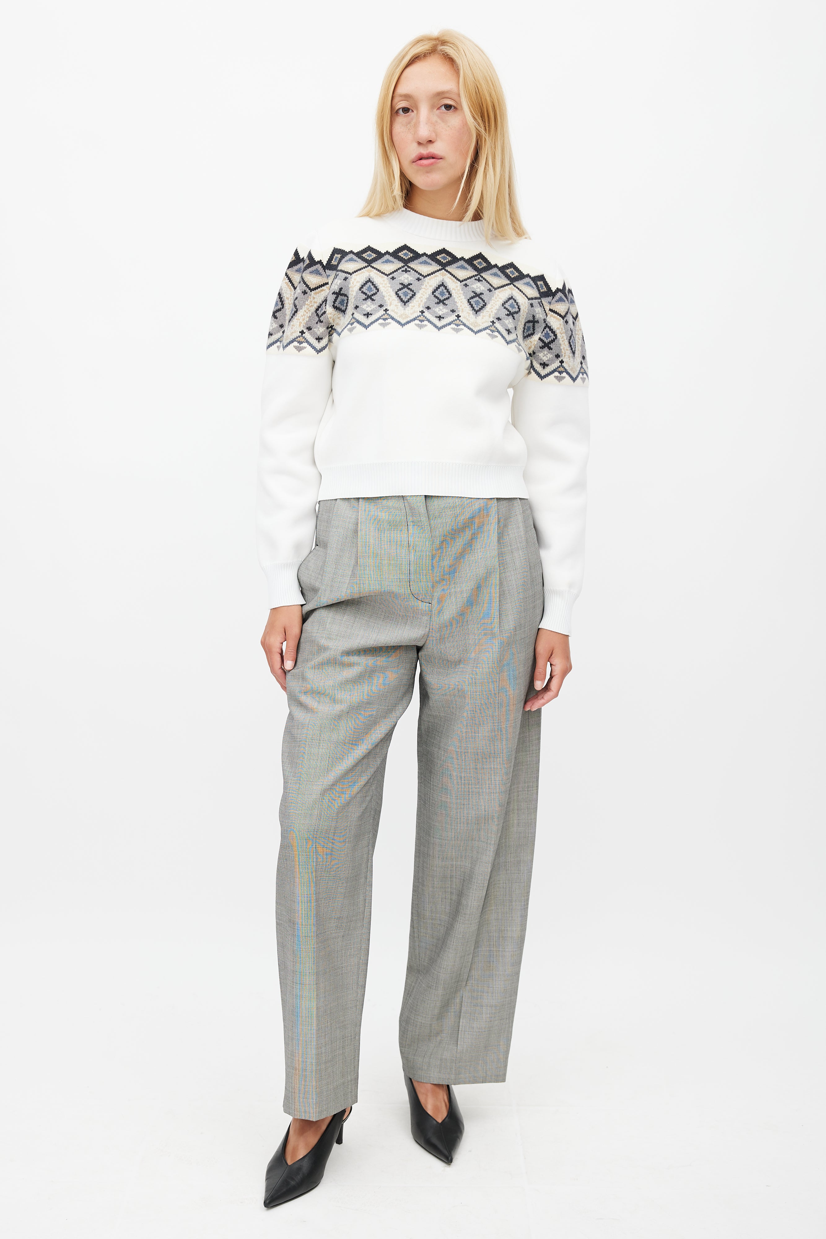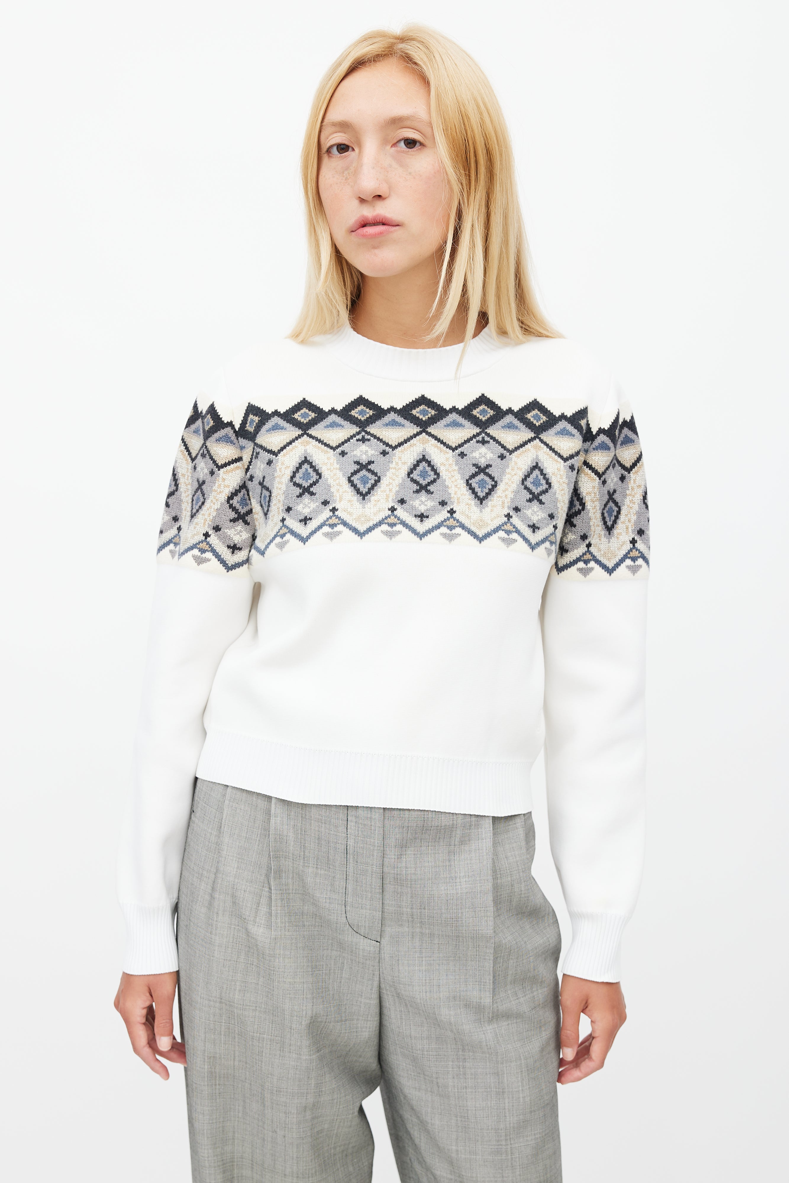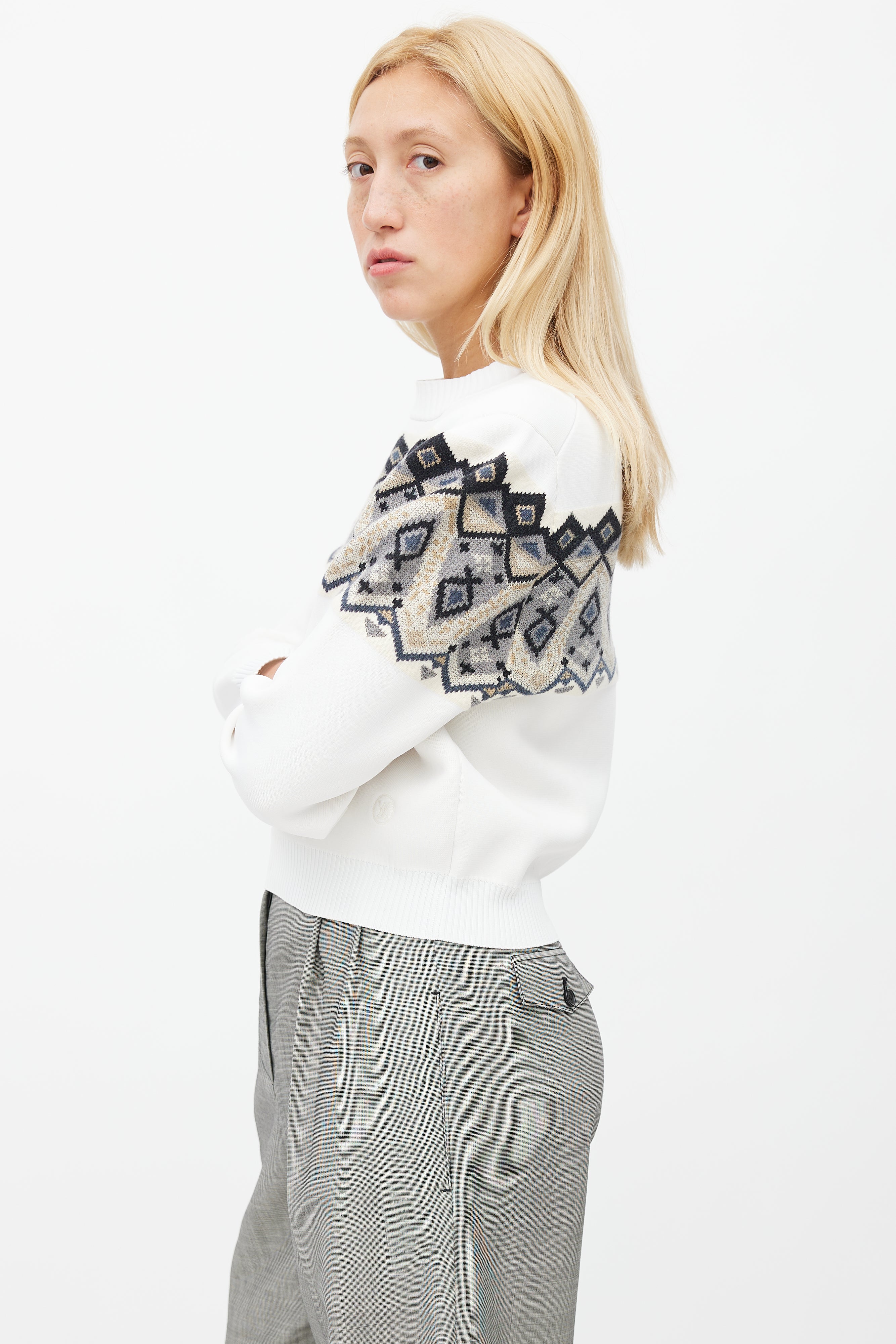 Pre-owned Louis Vuitton white sweater featuring ribbed collar, multicolour knit intarsia at chest, and embroidered logo at left hem.