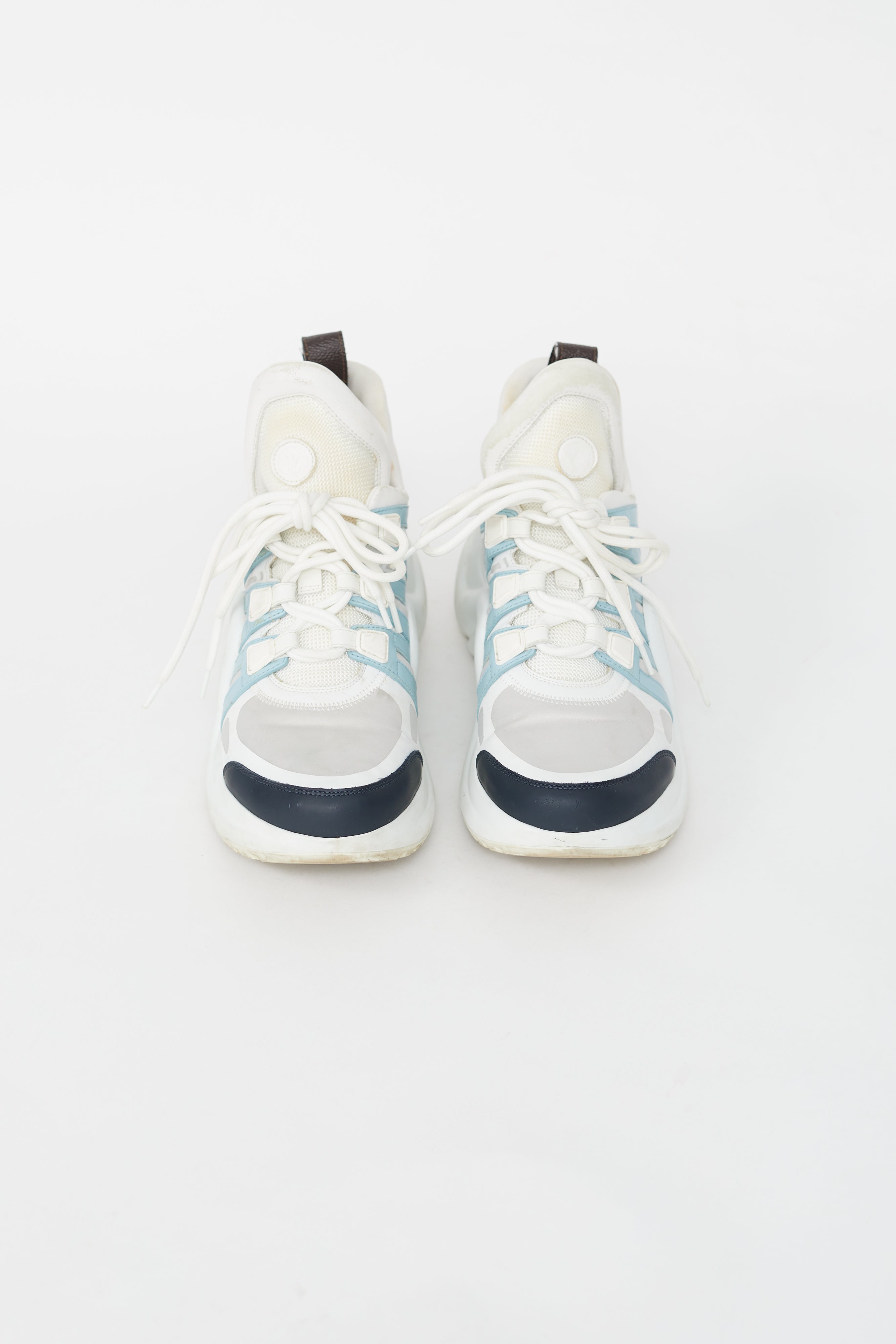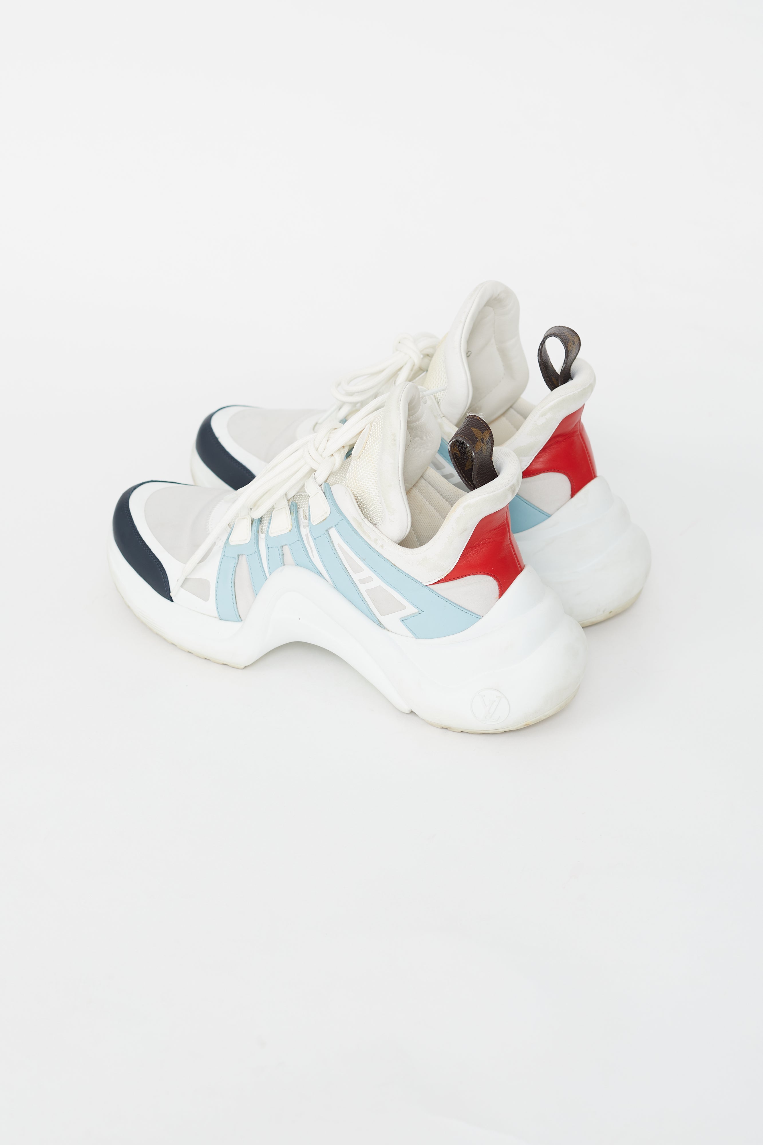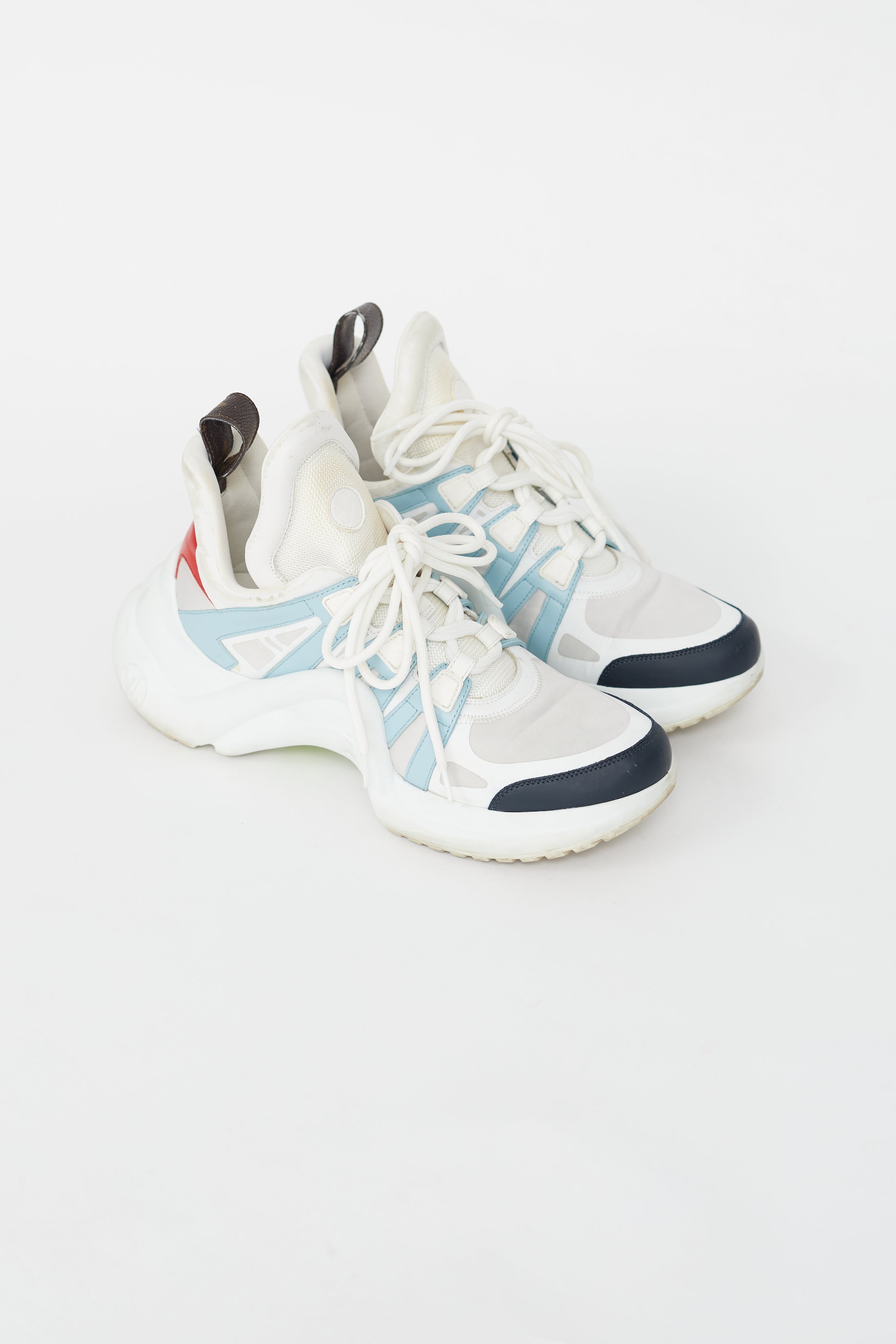 Pre-owned Louis Vuitton Archlight sneaker featuring a narrow rounded toe, white nylon upper with mesh tongue, white lace up vamp, coated canvas logo on pull tab at heel, high arch design and leather panels in light blue, red and navy on upper.
