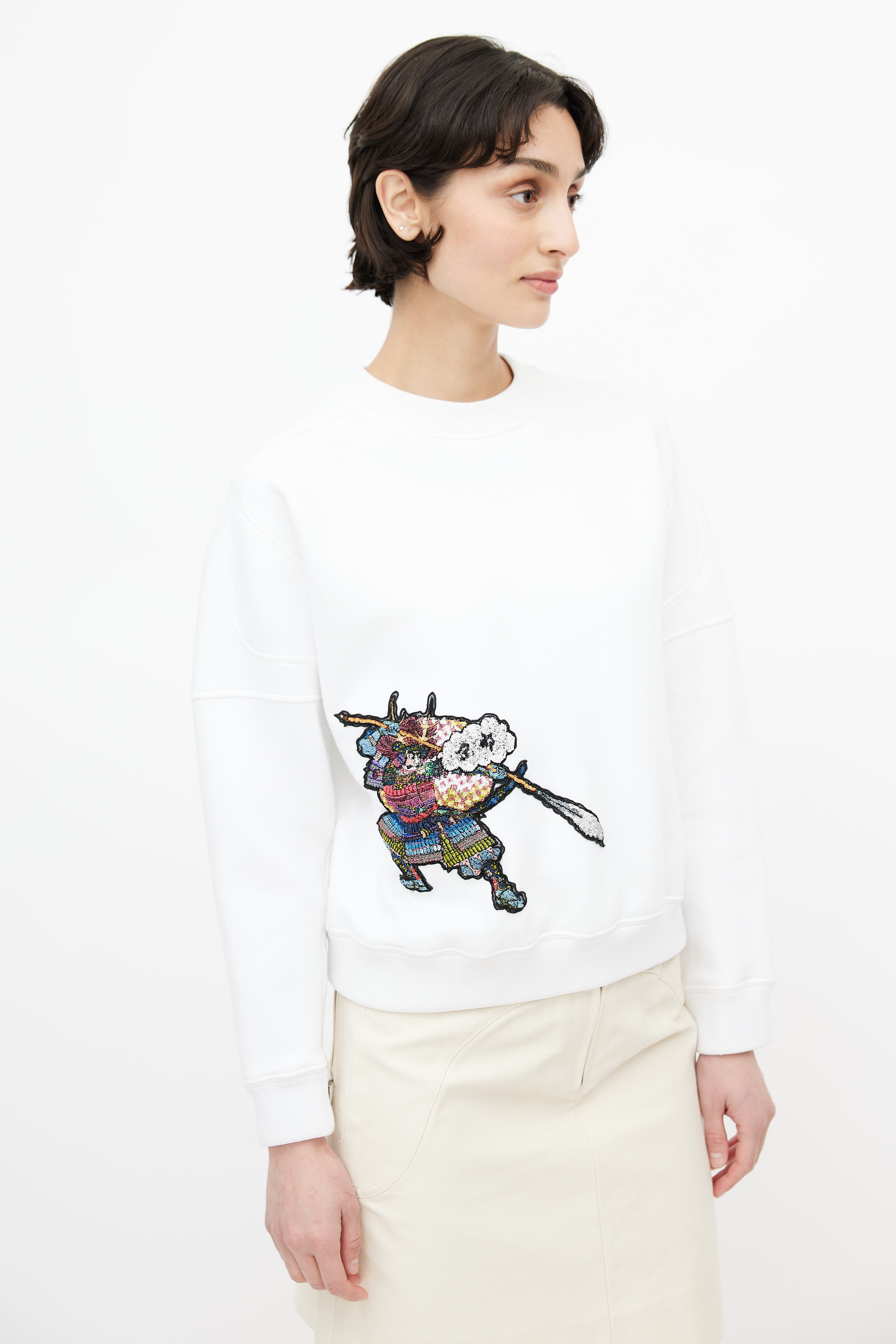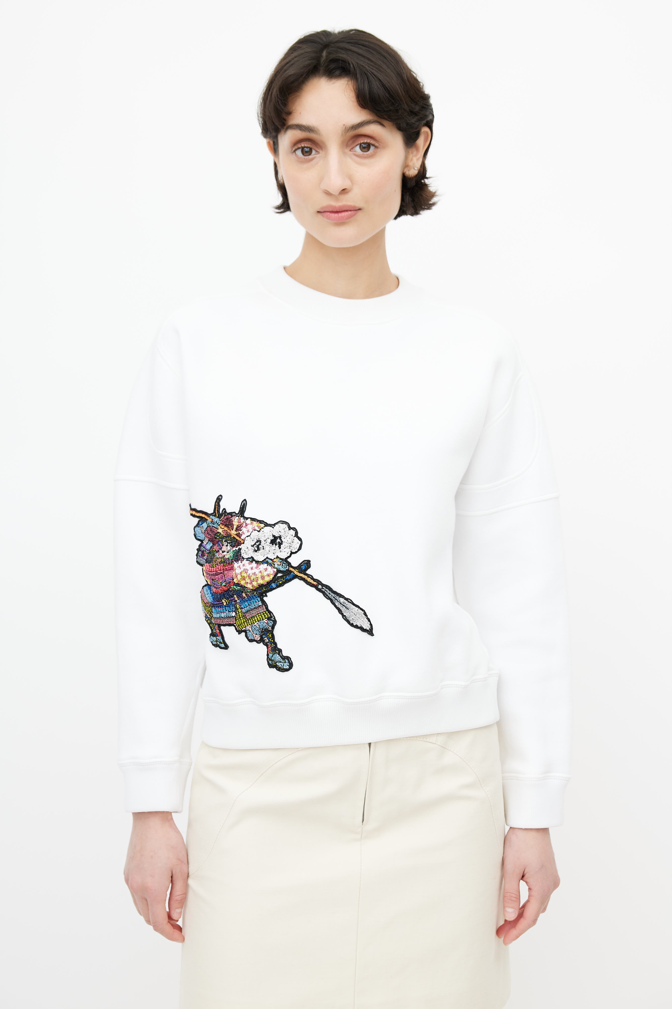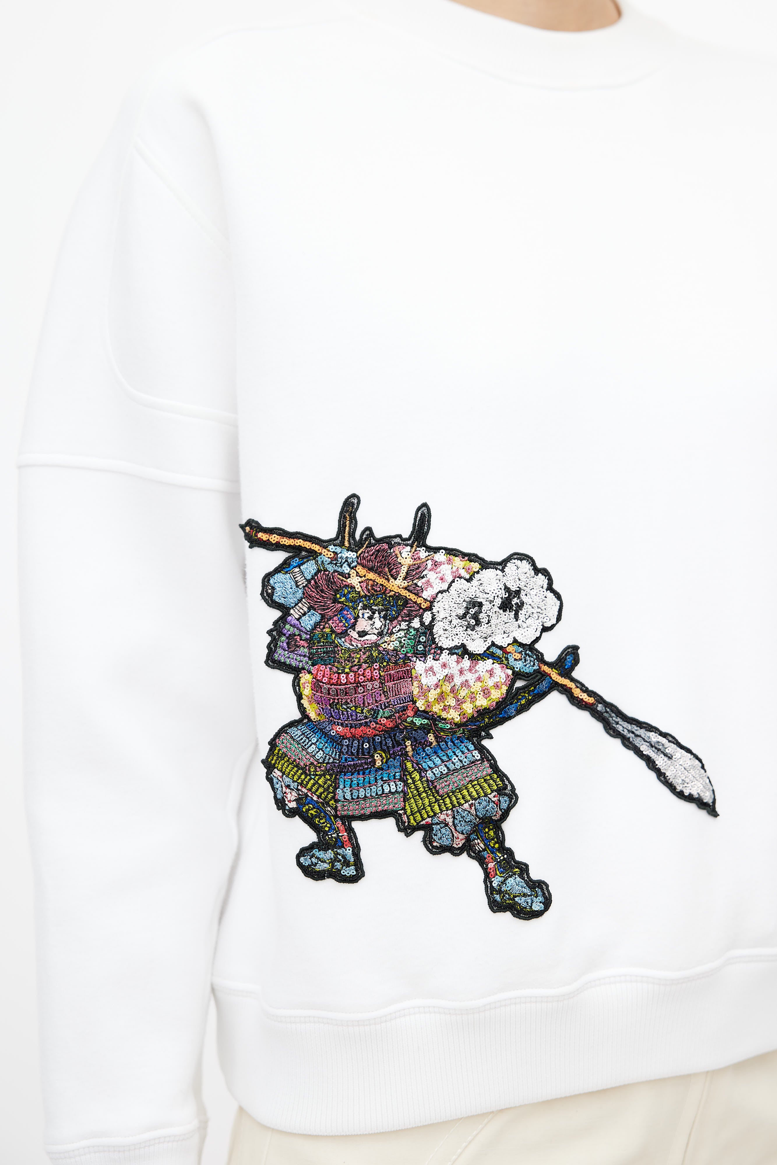 Pre-owned Louis Vuitton white sweatshirt featuring crew neckline, ribbed cuffs and hem, and multicolour samurai sequin embellishment at front.