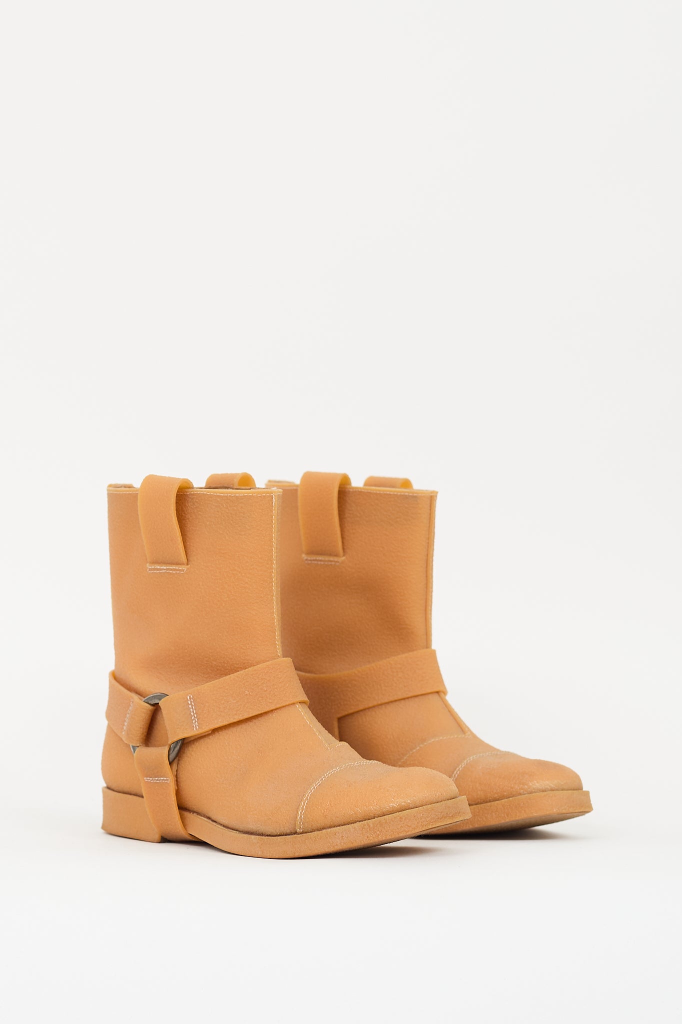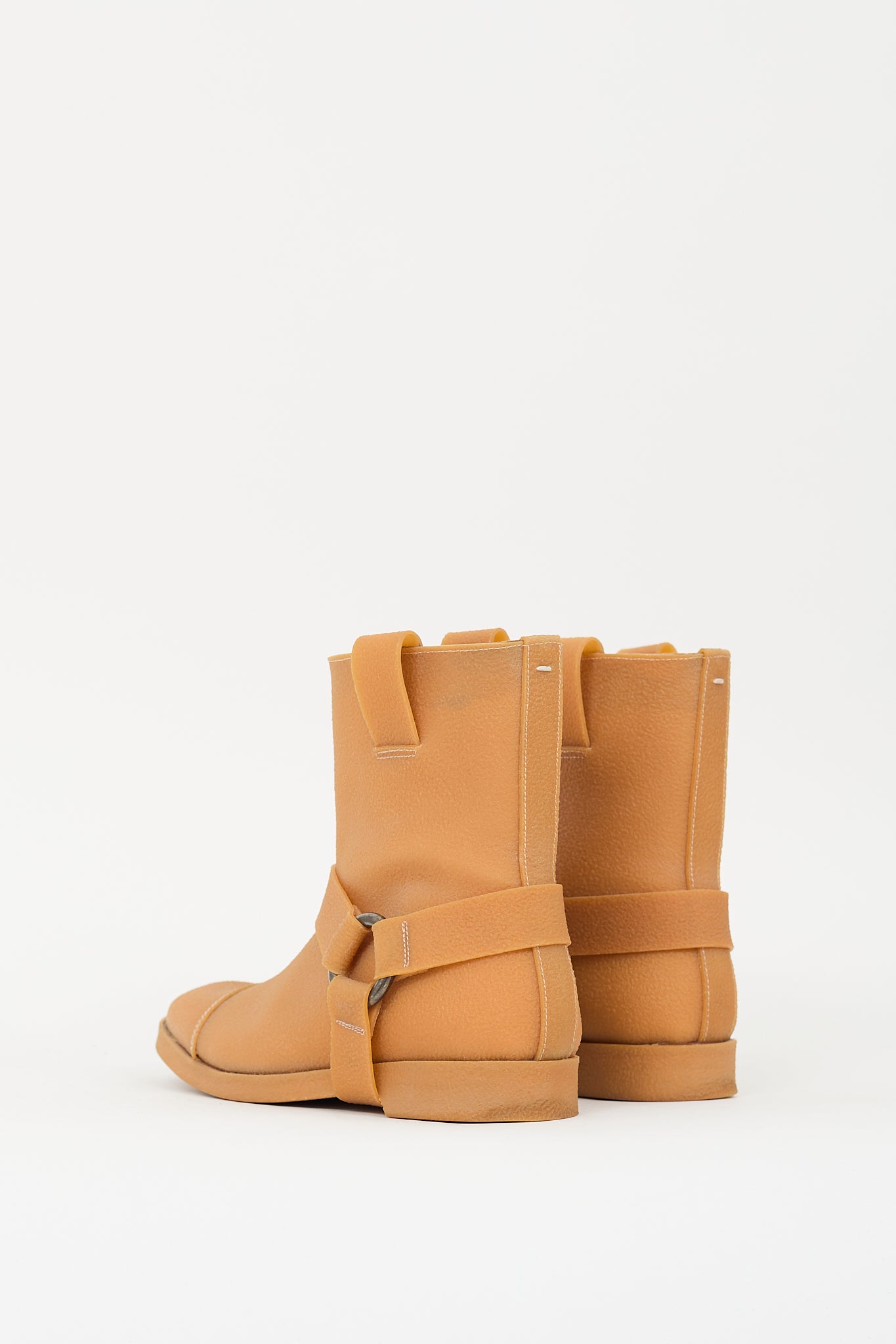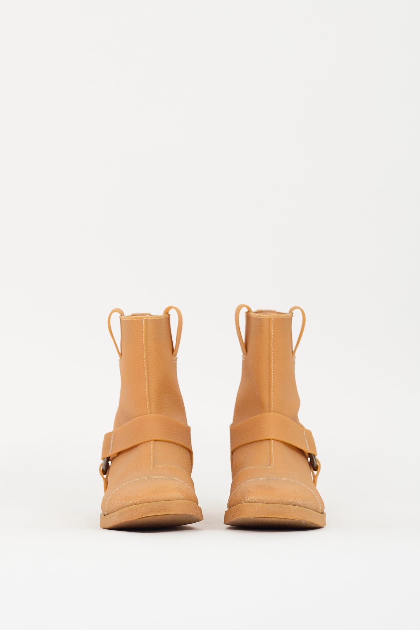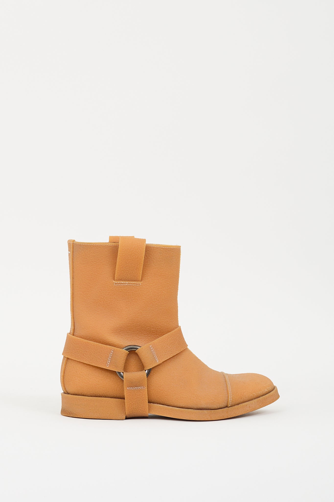 Pre-owned Maison Margiela brown rubber ankle boots featuring rounded cap toe, silver tone buckle harness at sides, and pull tabs at opening.