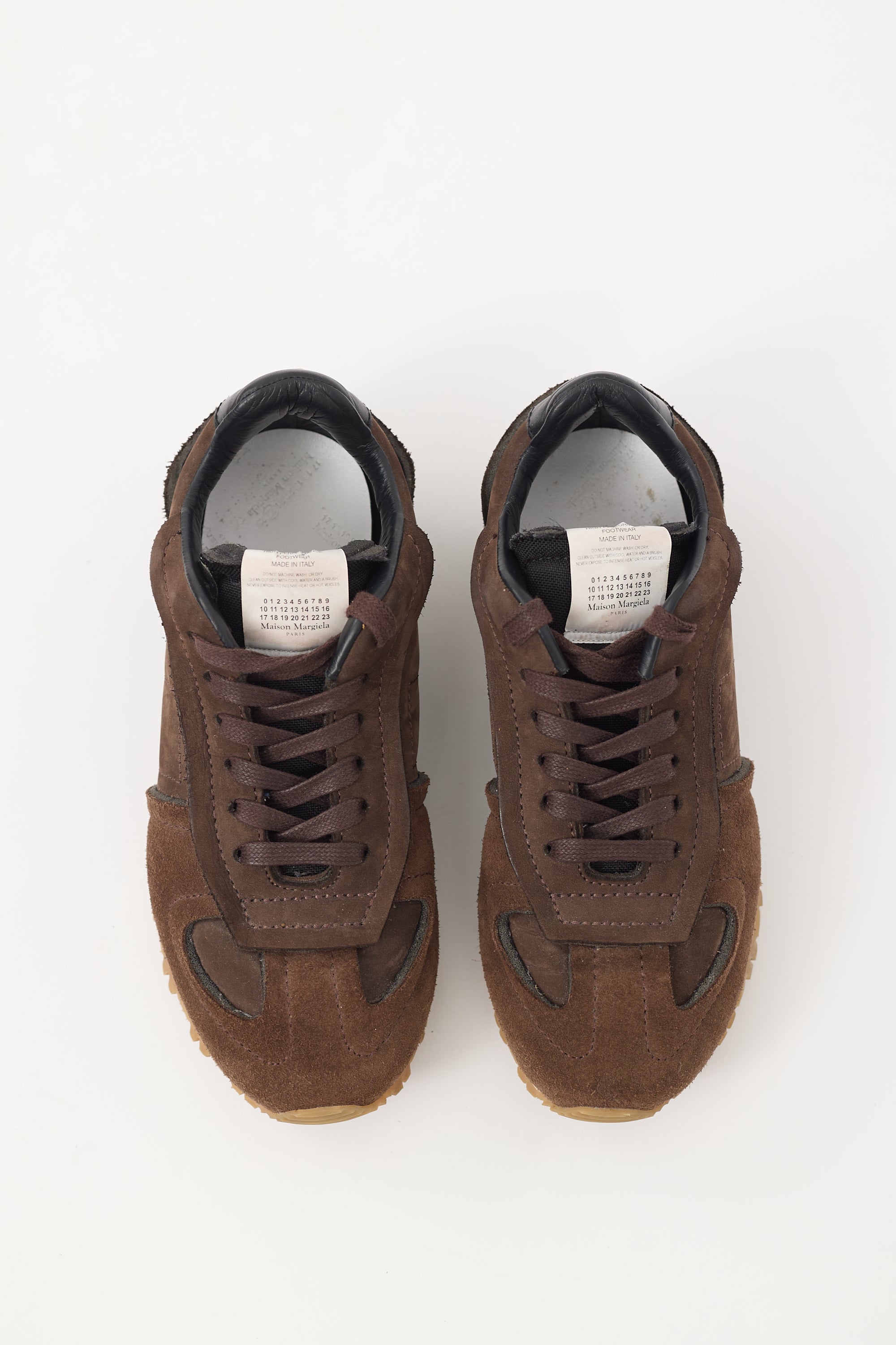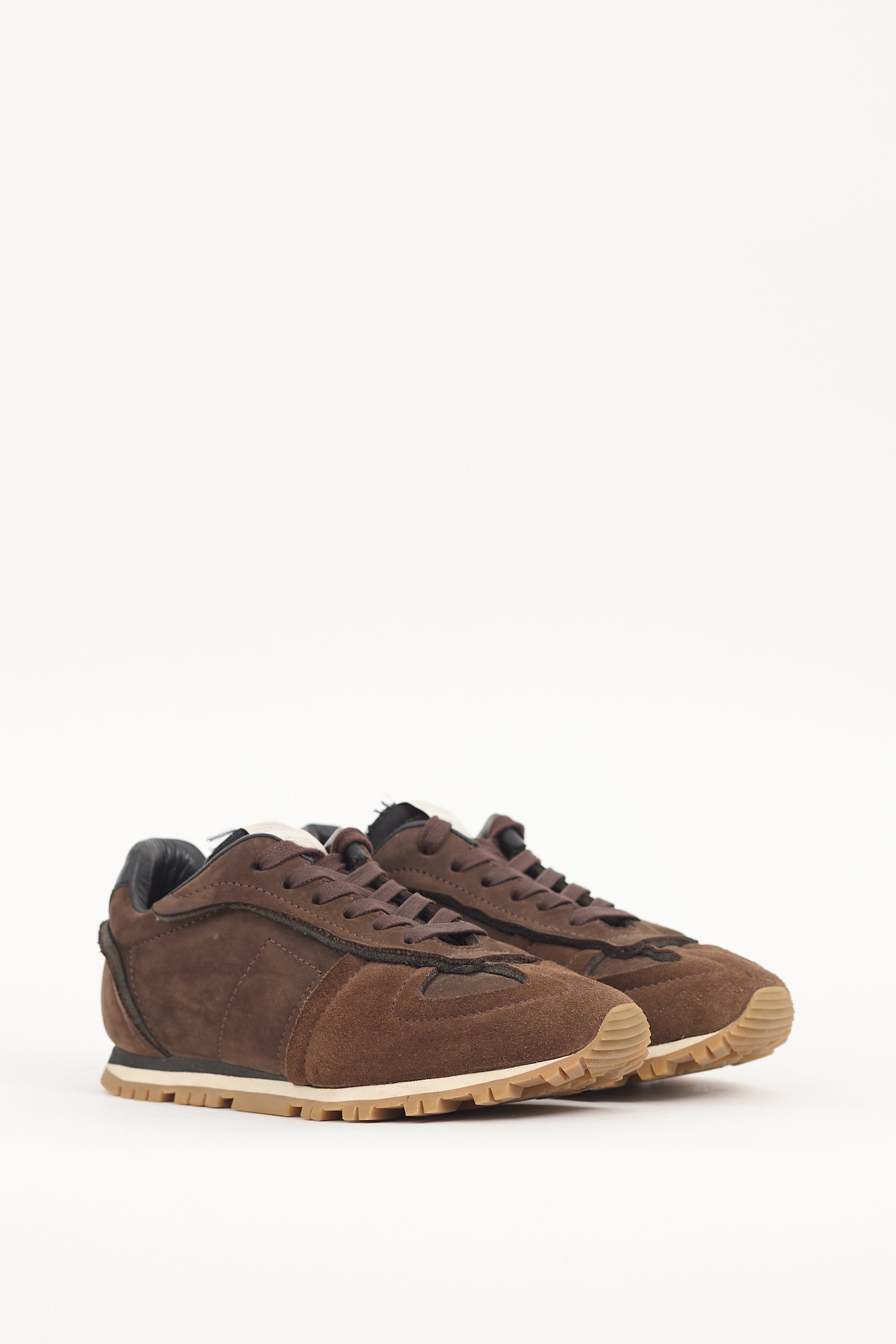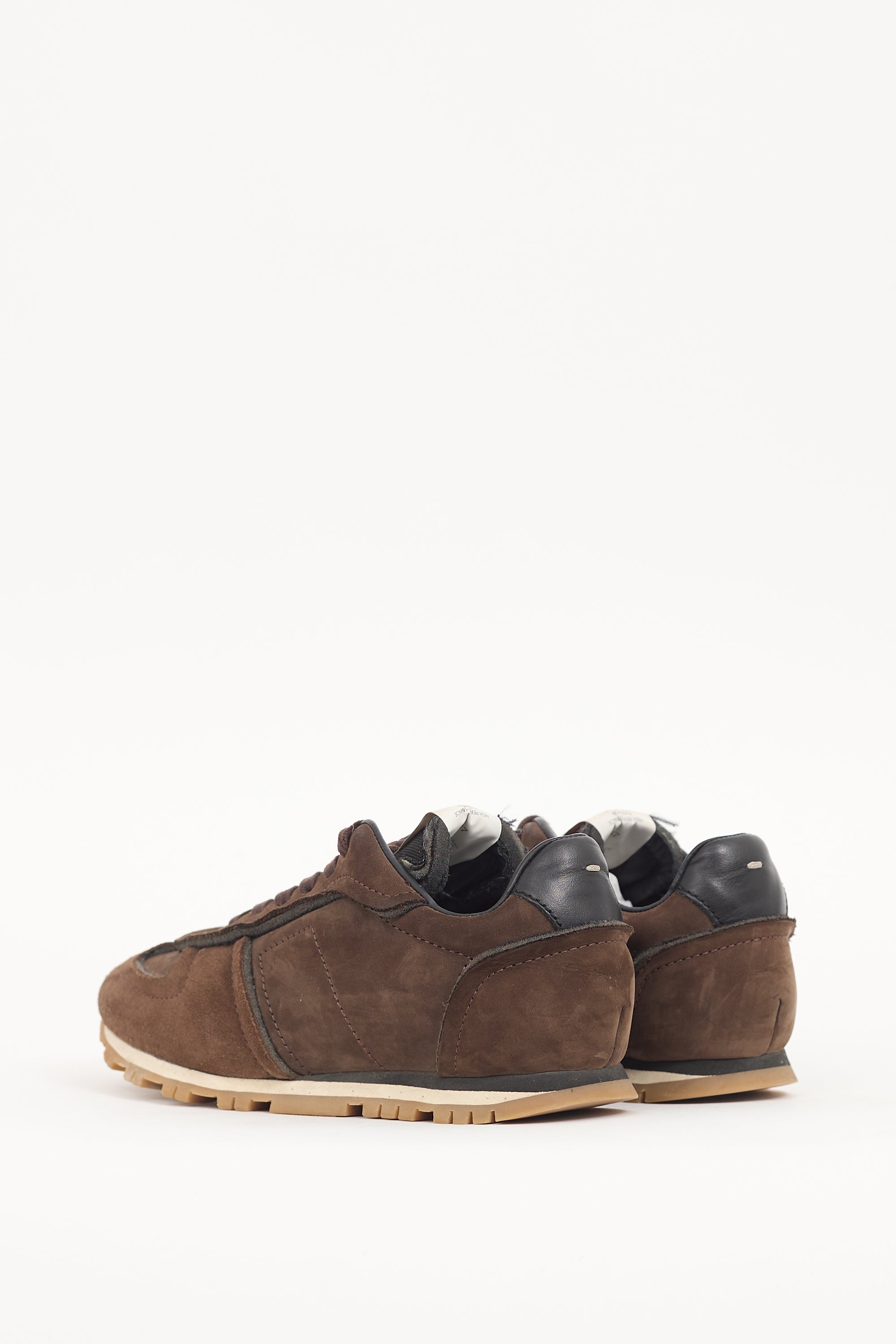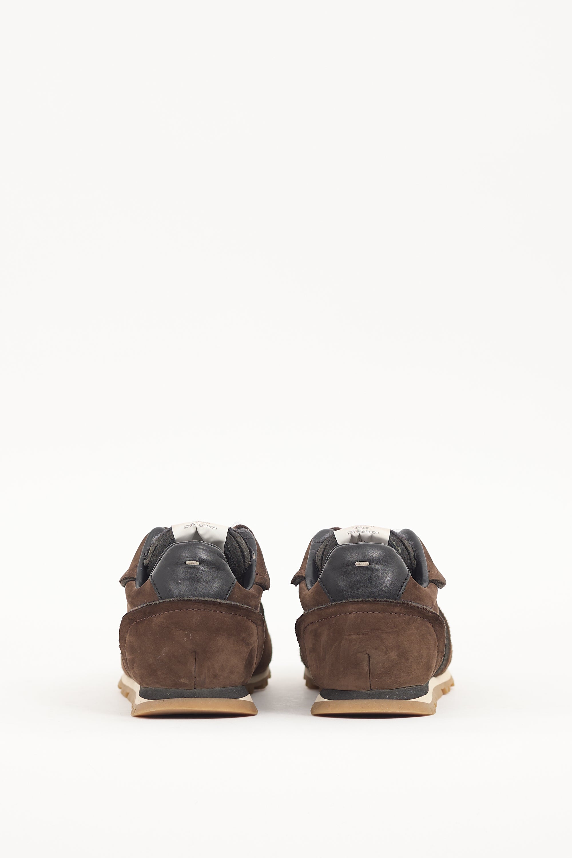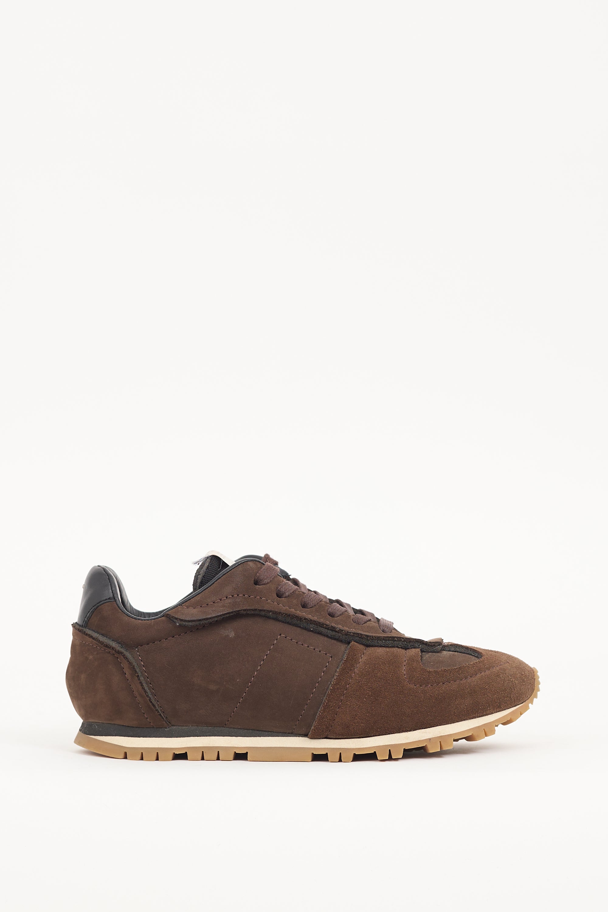 Pre-owned Maison Margiela brown suede Retro Runner sneakers featuring panelled upper, lace up vamp, logo tab at tongue, black leather panel with signature whit stitch at counter, and layered rubber sole.