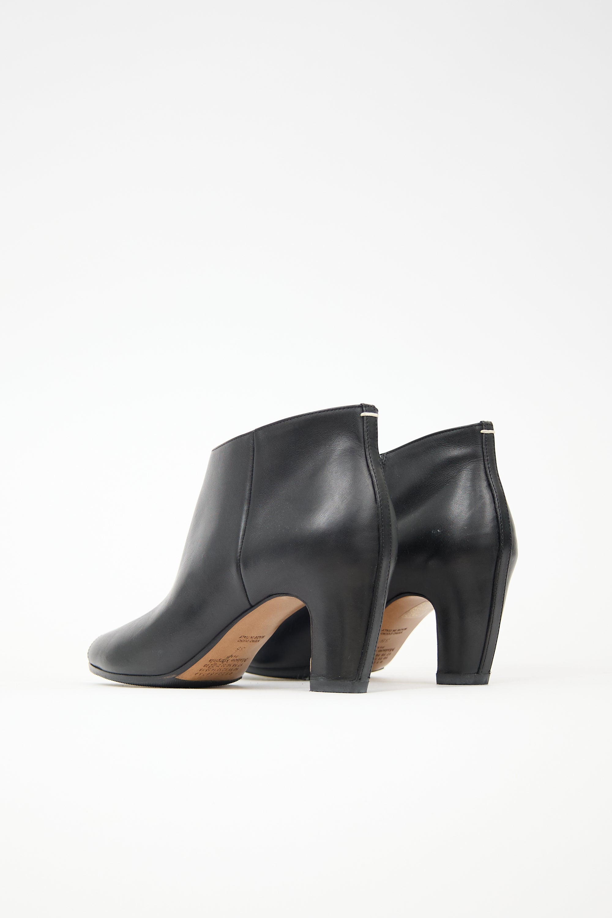 Pre-owned Maison Margiela black leather booties featuring a rounded peep toe, inner zip closure, signature white stitch at counter, and a curved heel.