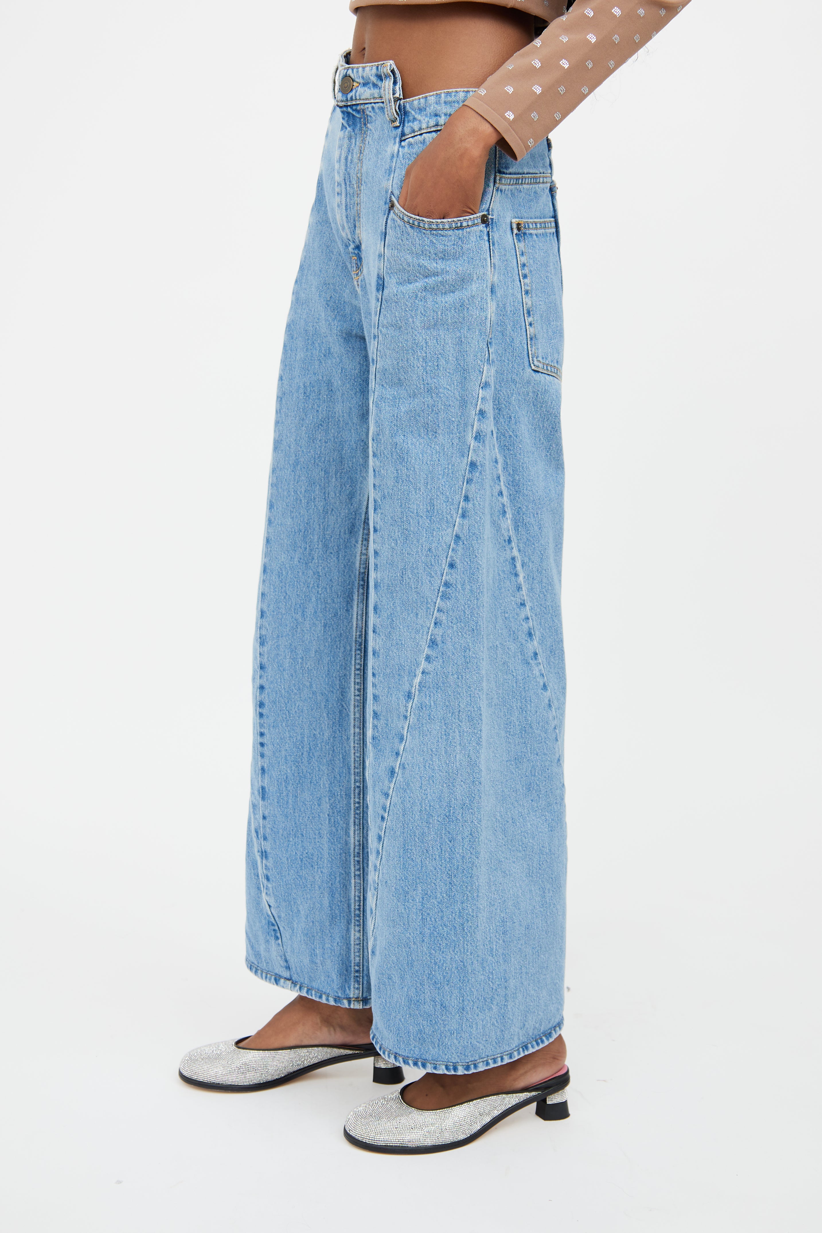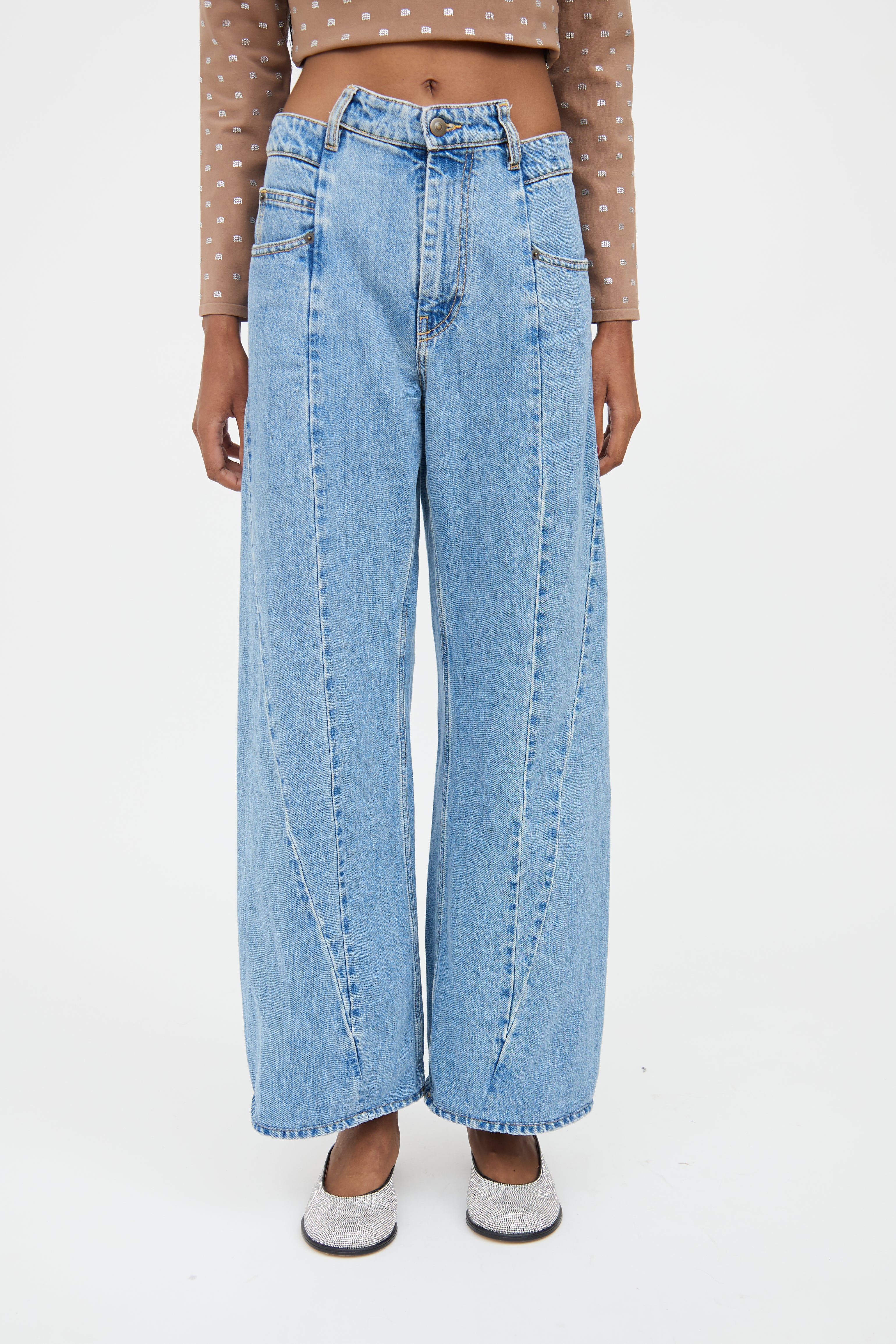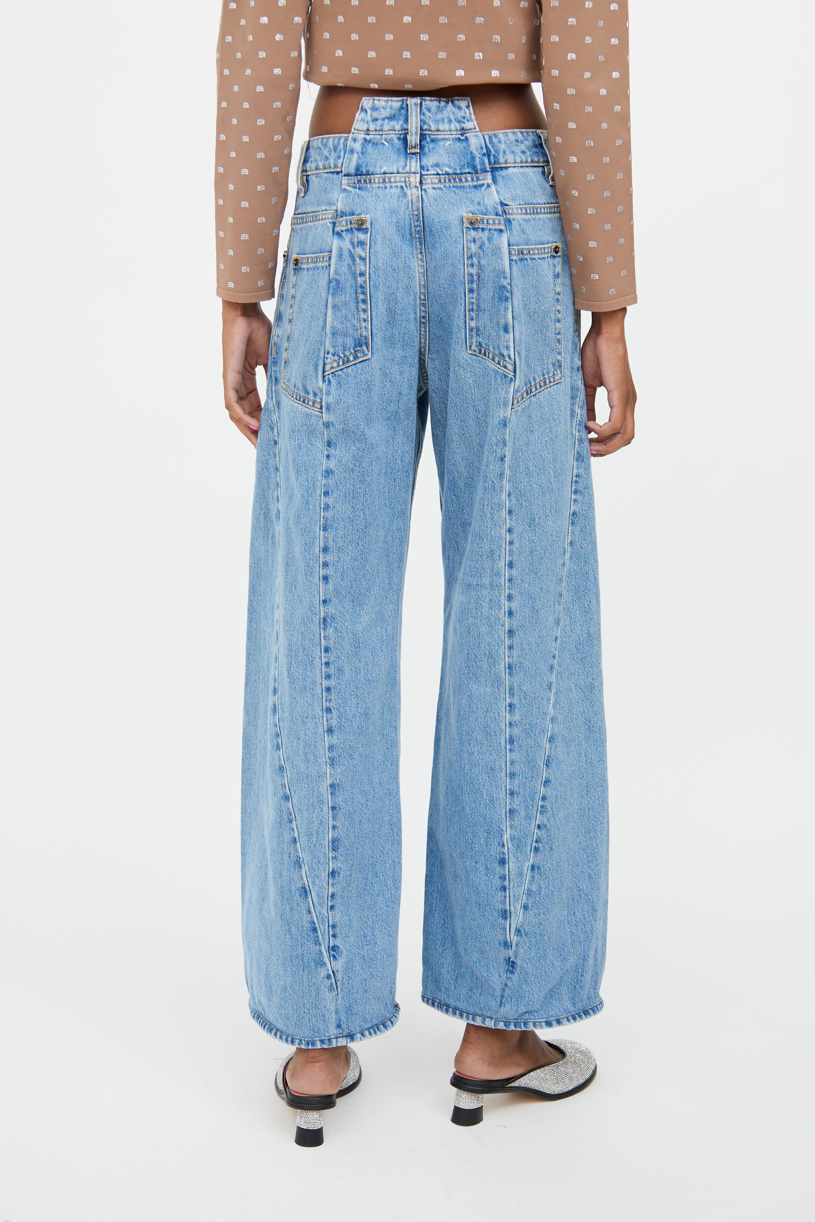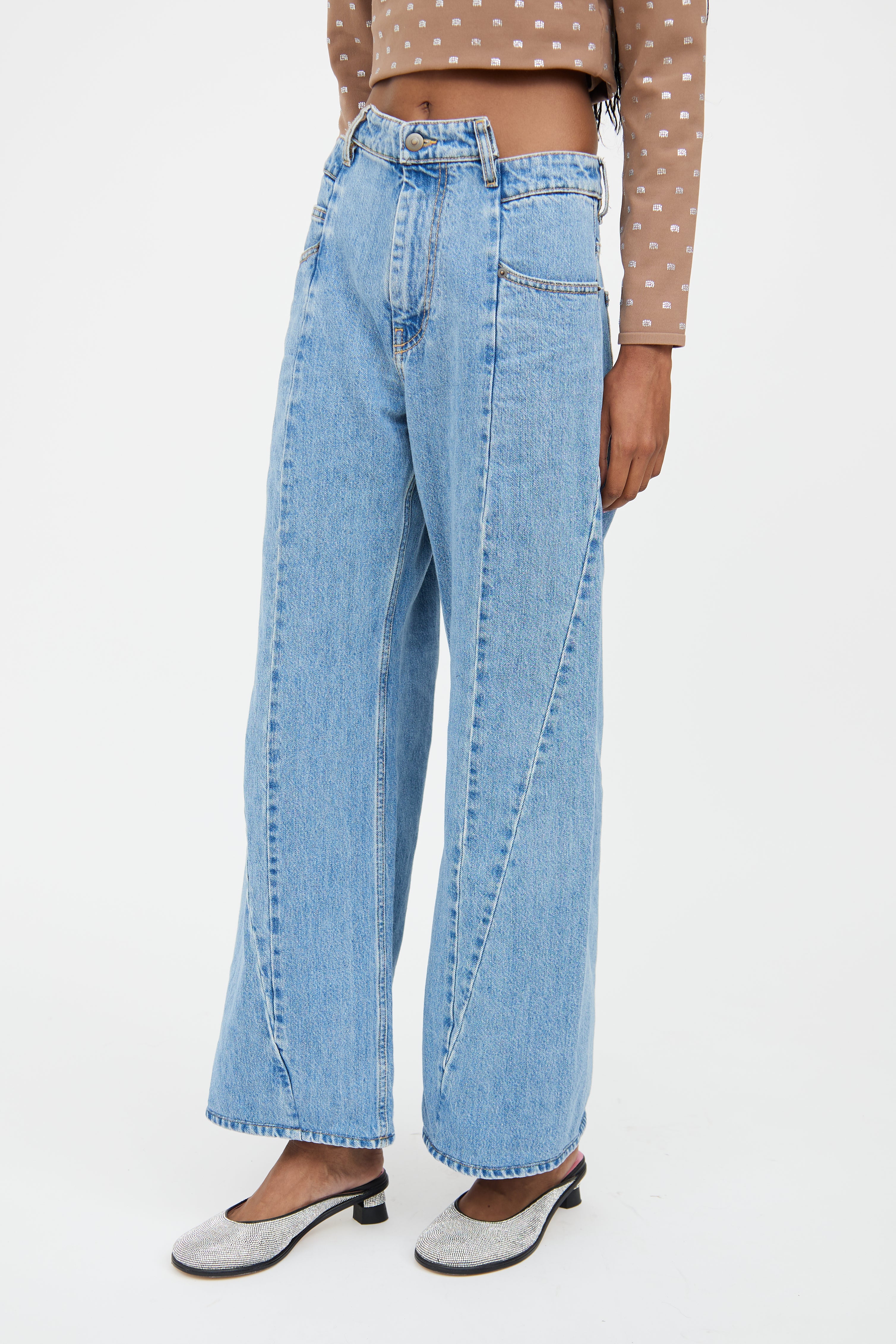 Pre-owned Maison Margiela medium wash Décortiqué jeans featuring an asymmetrical waist, five pocket styling, panelled seams, wide leg, and zip fly with button closure.