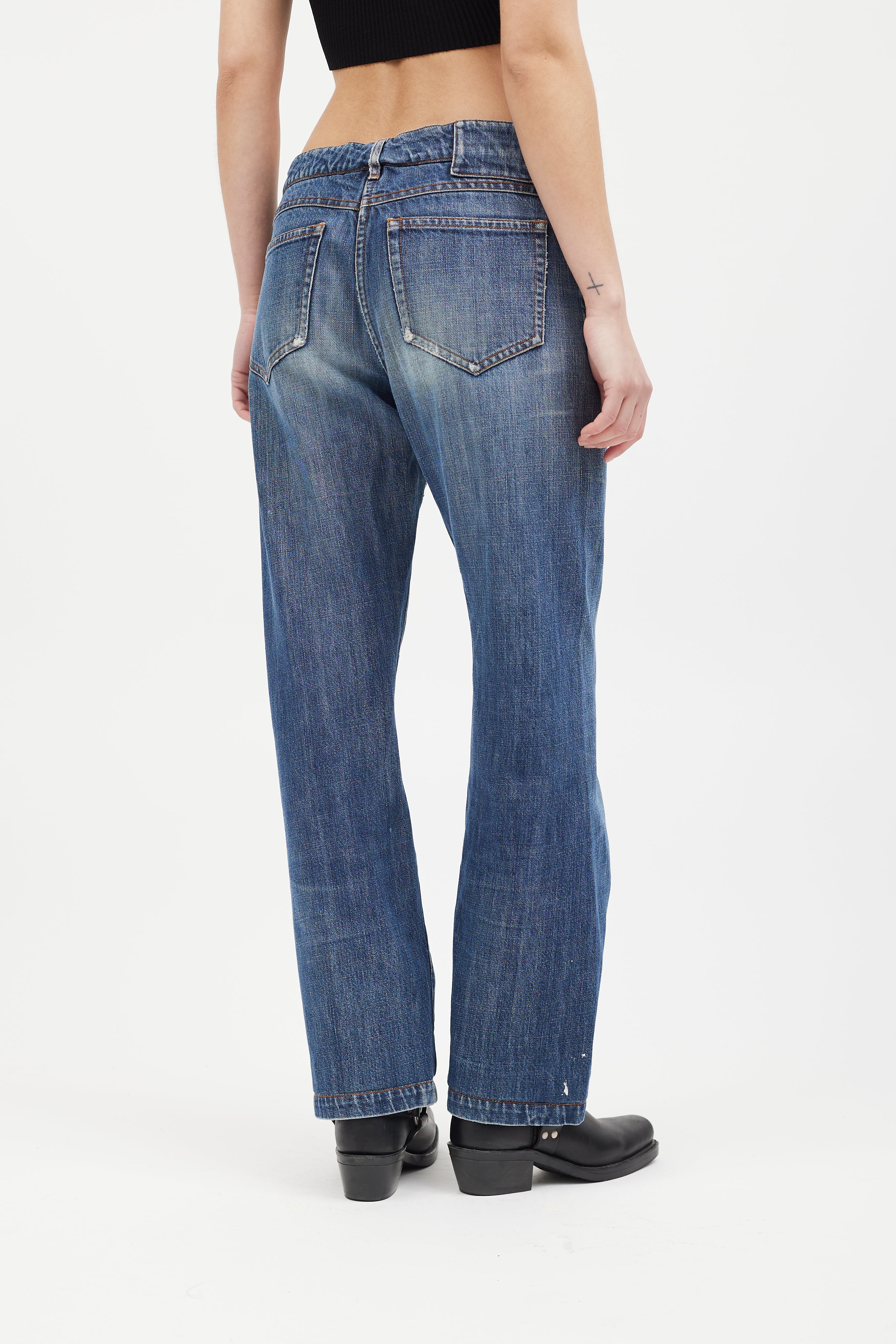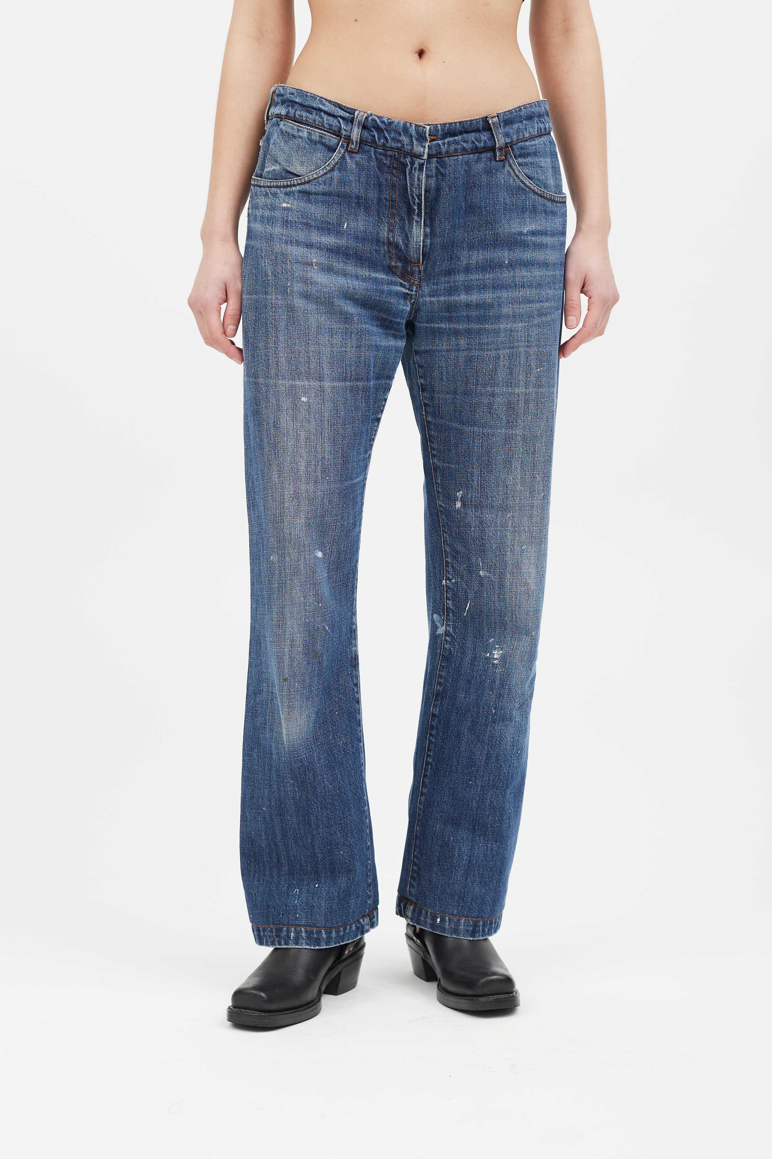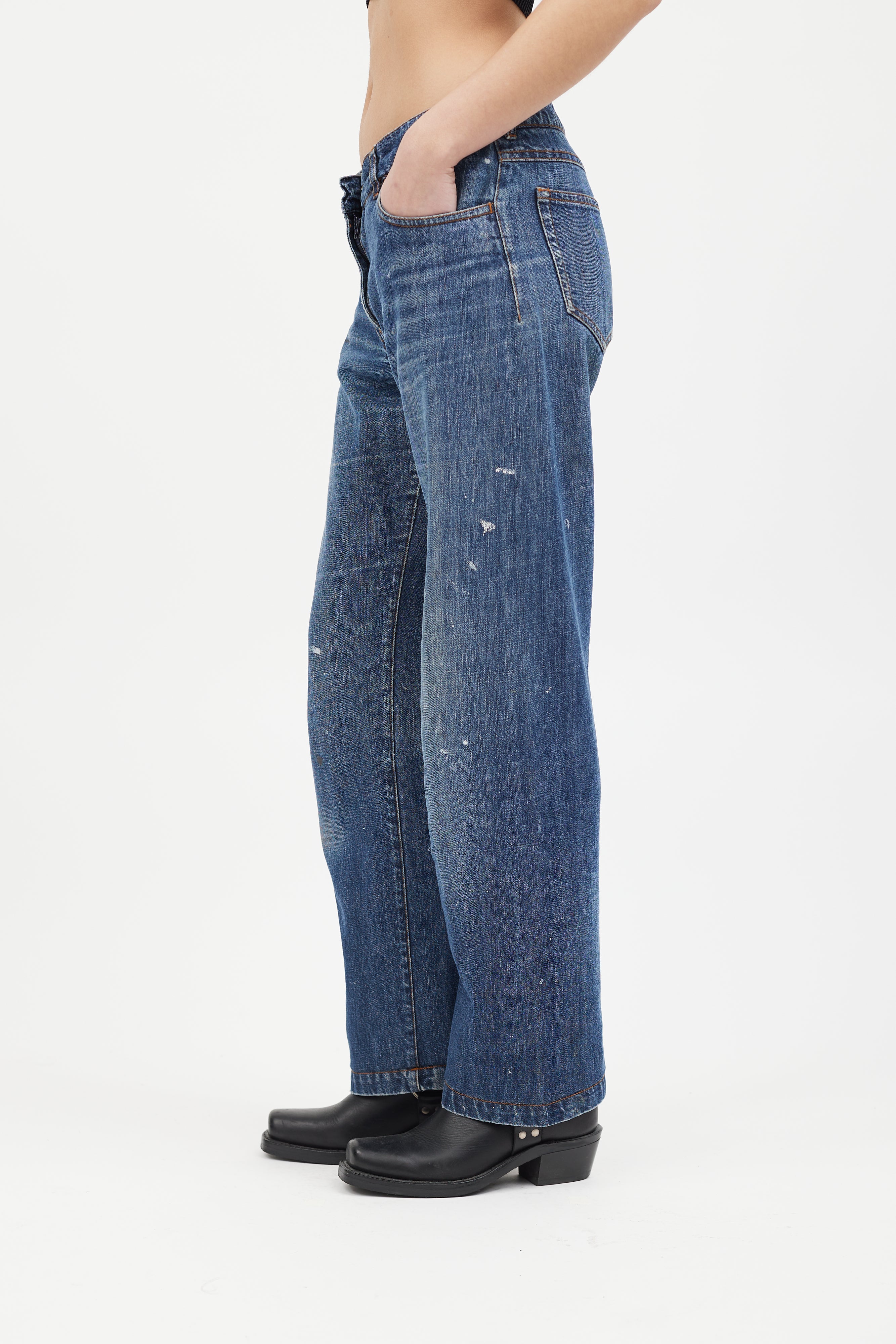 Pre-owned Maison Margiela medium wash jeans featuring five pocket styling, belt loops, zip fly, and white paint splatter throughout.