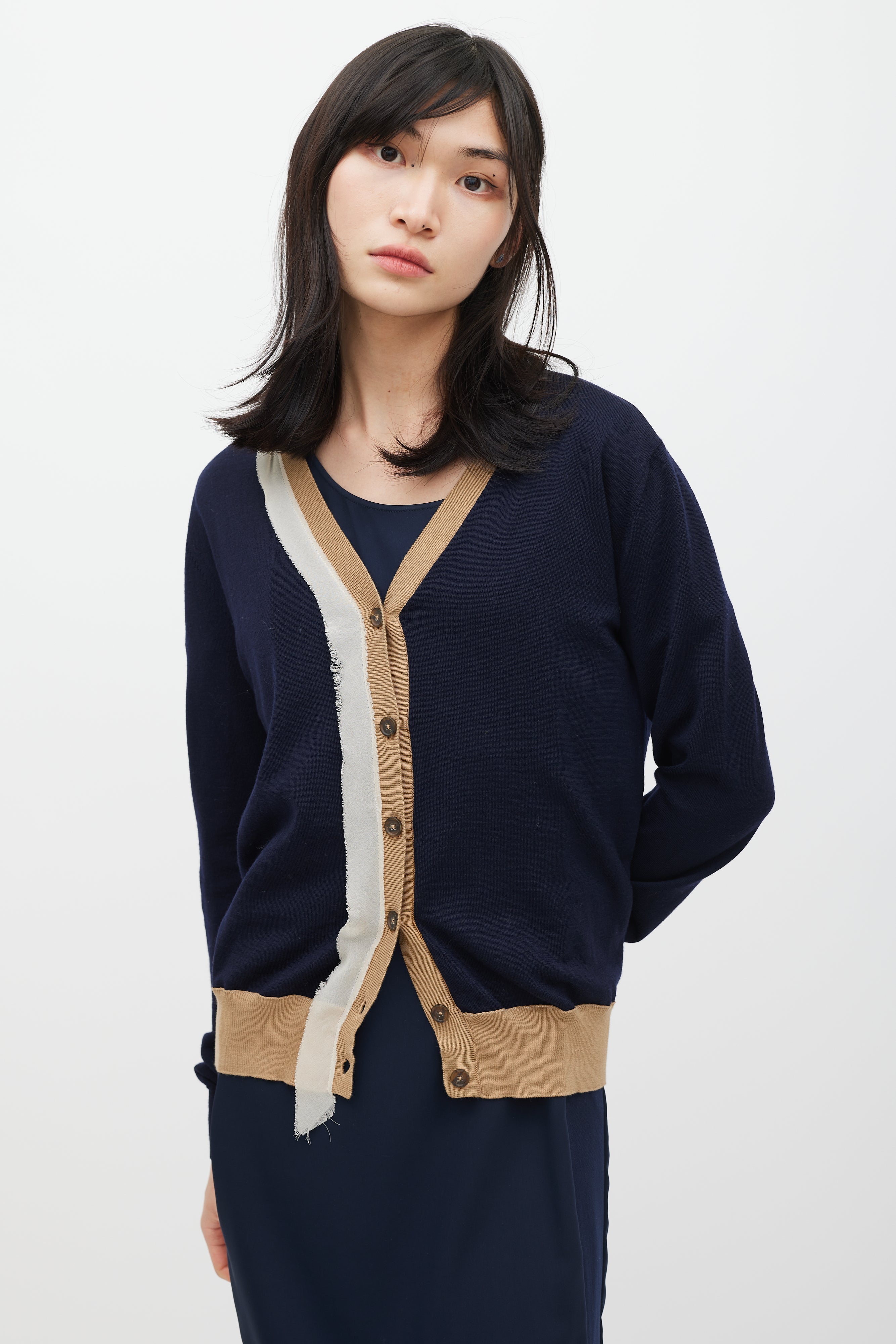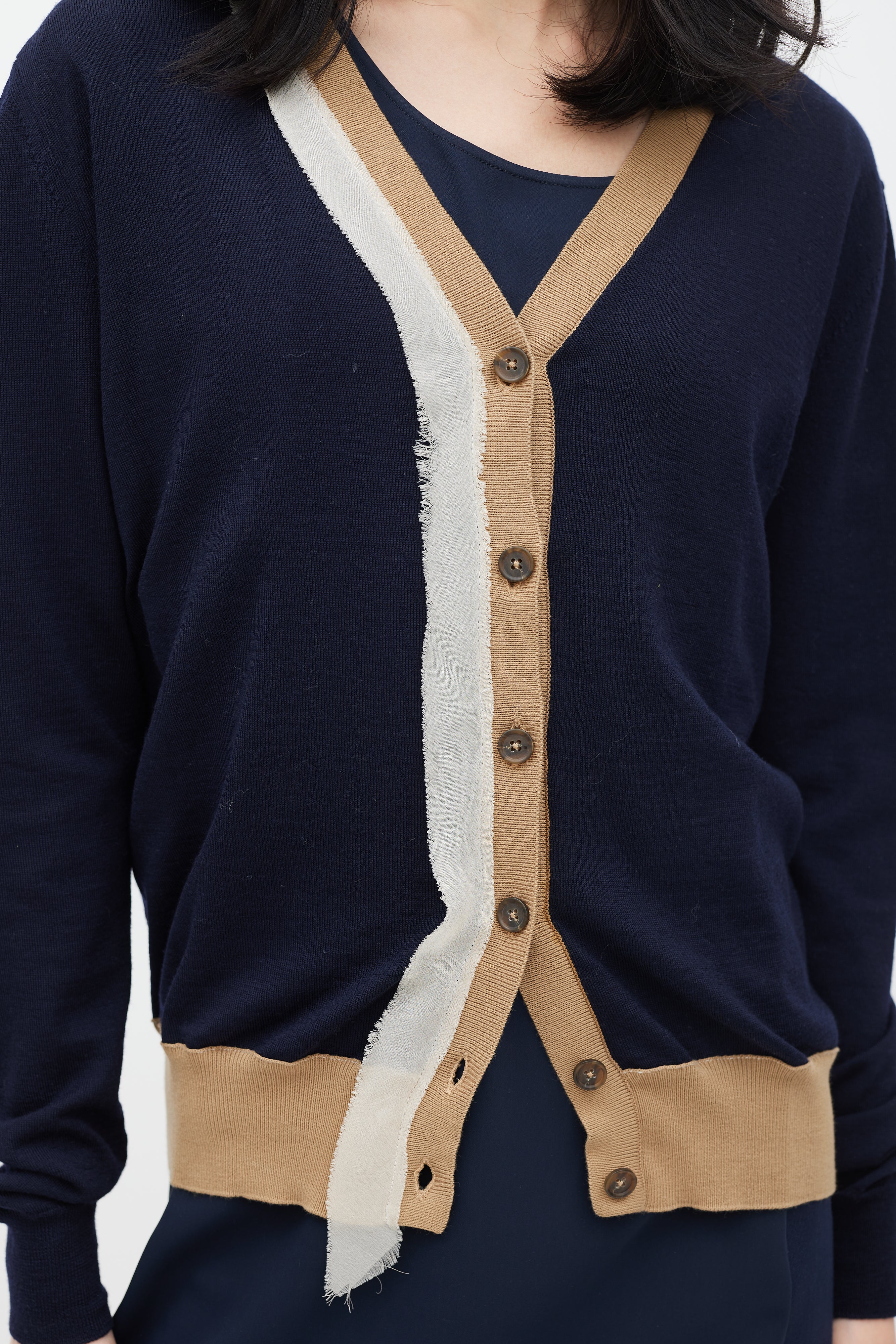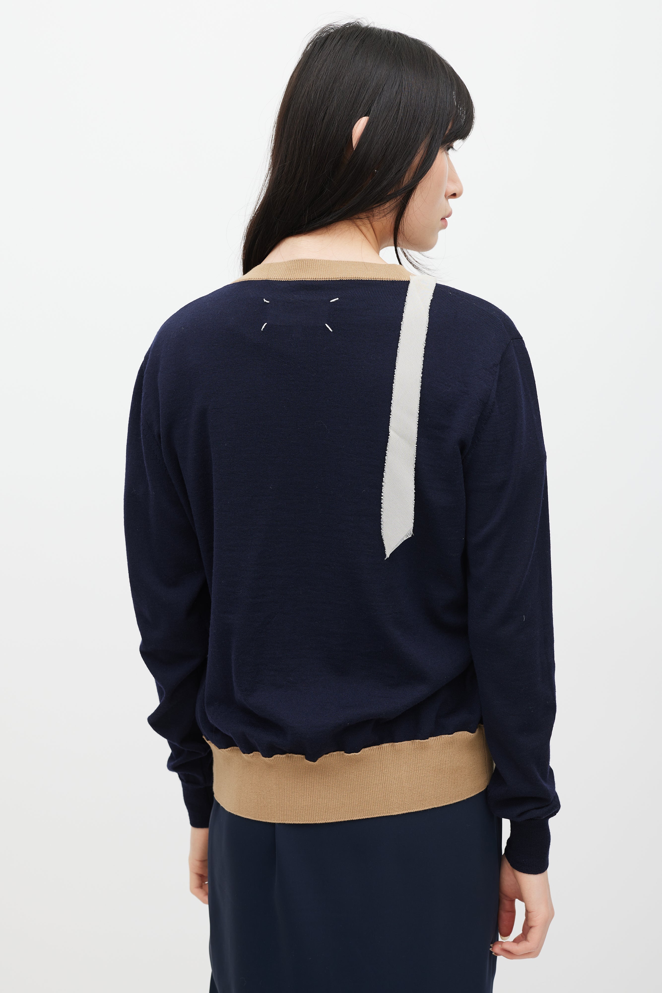 Pre-owned Maison Margiela navy wool cardigan featuring V-neckline, button up front, signature four stitches at back, brown ribbed knit trim, and beige silk trim at front.