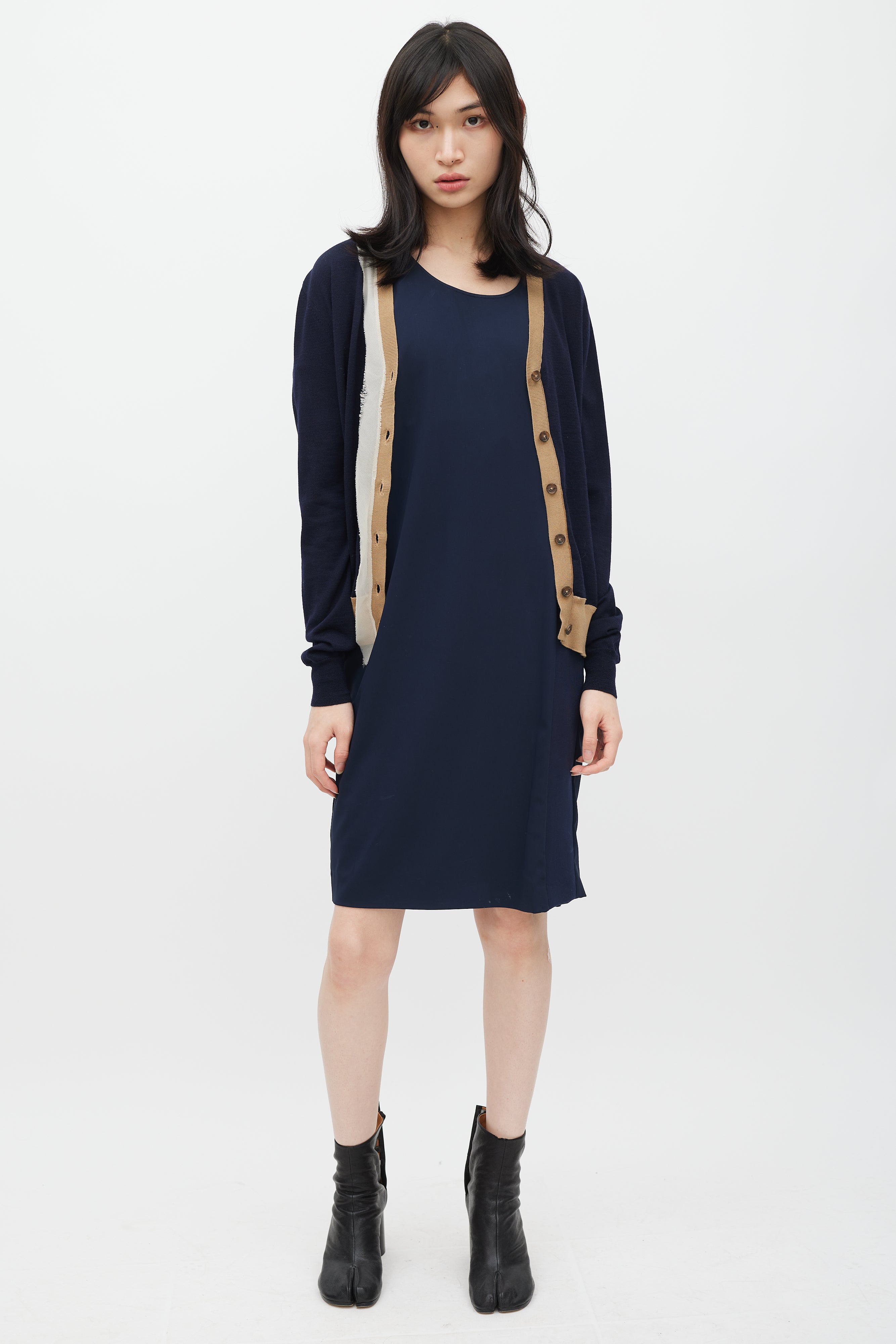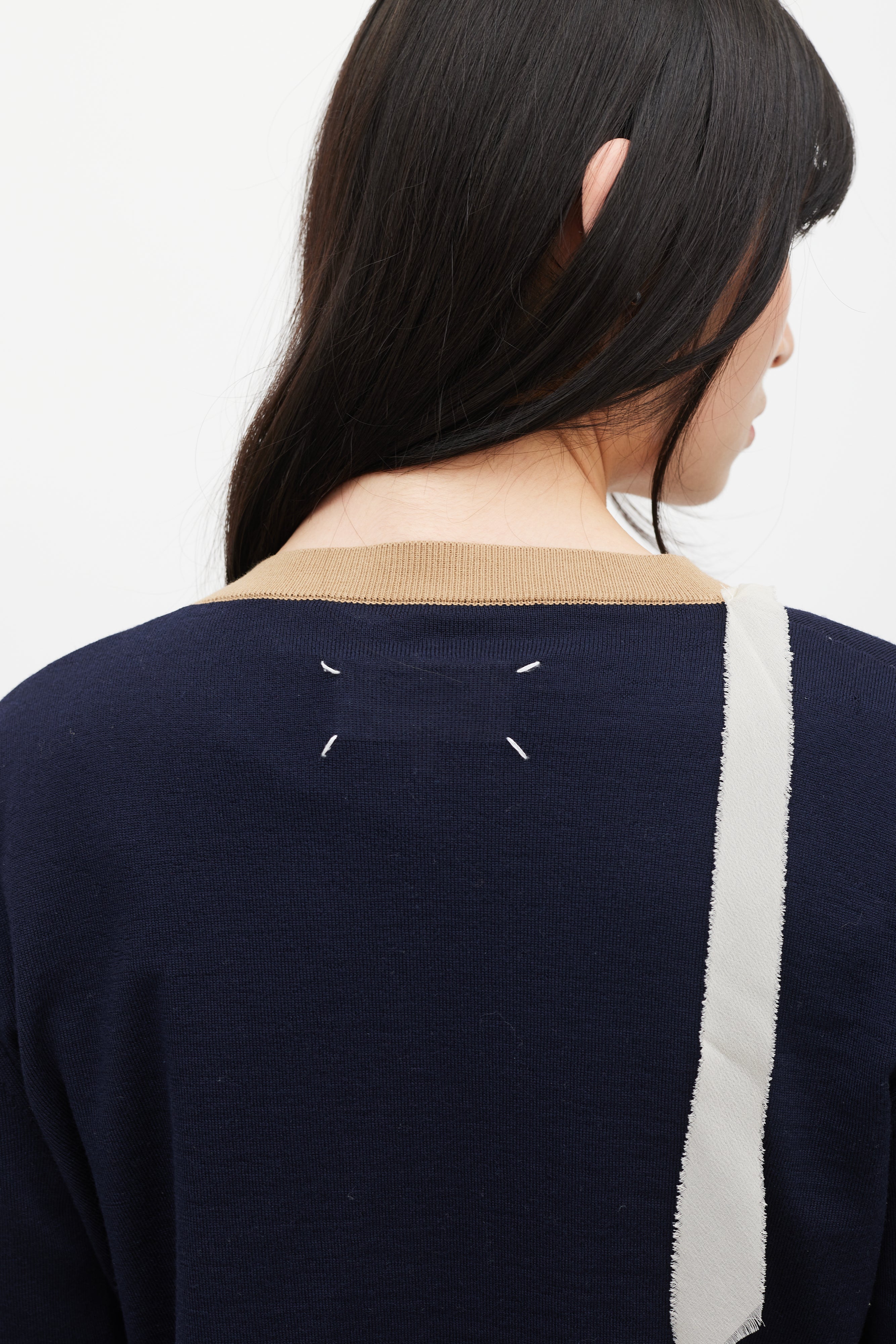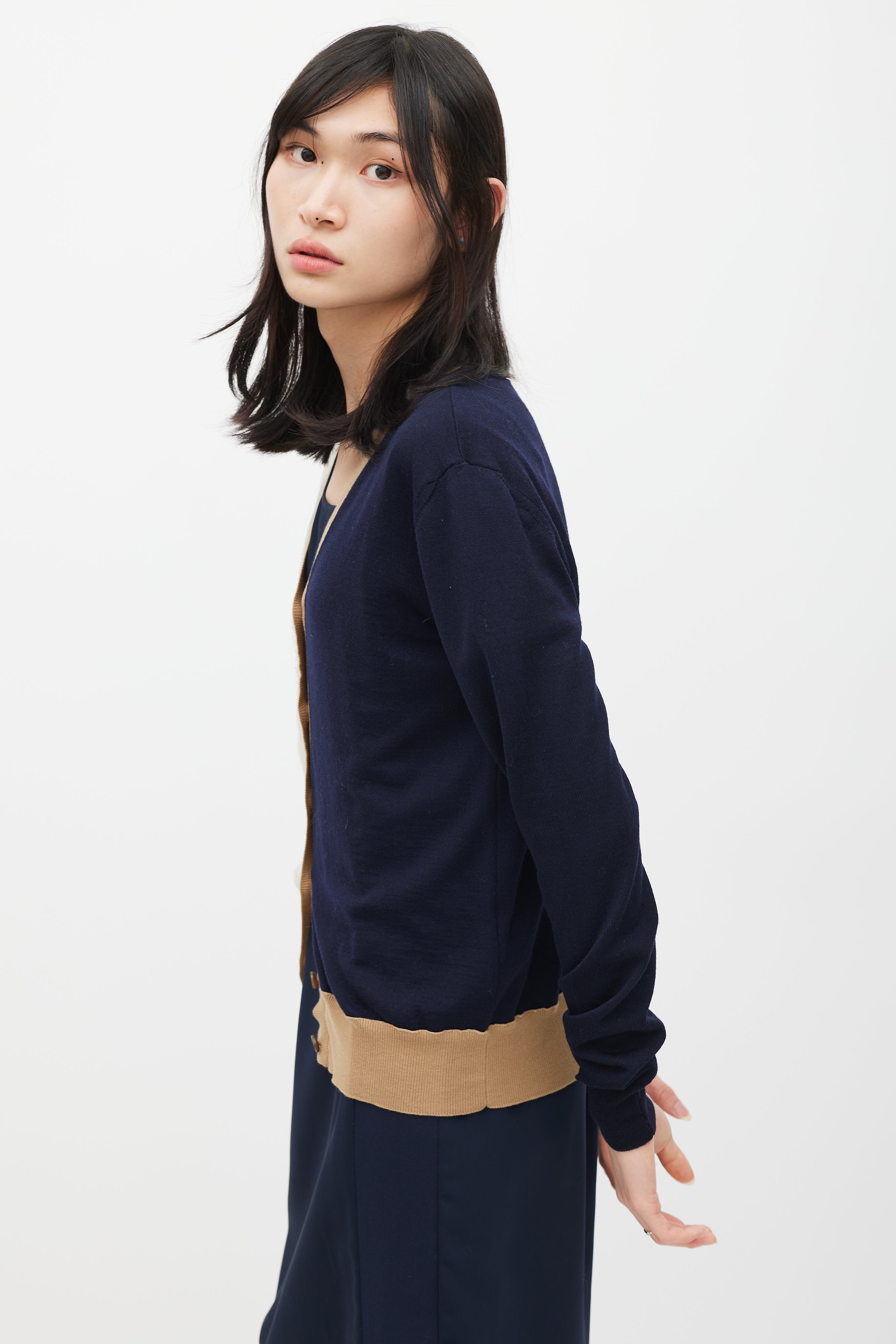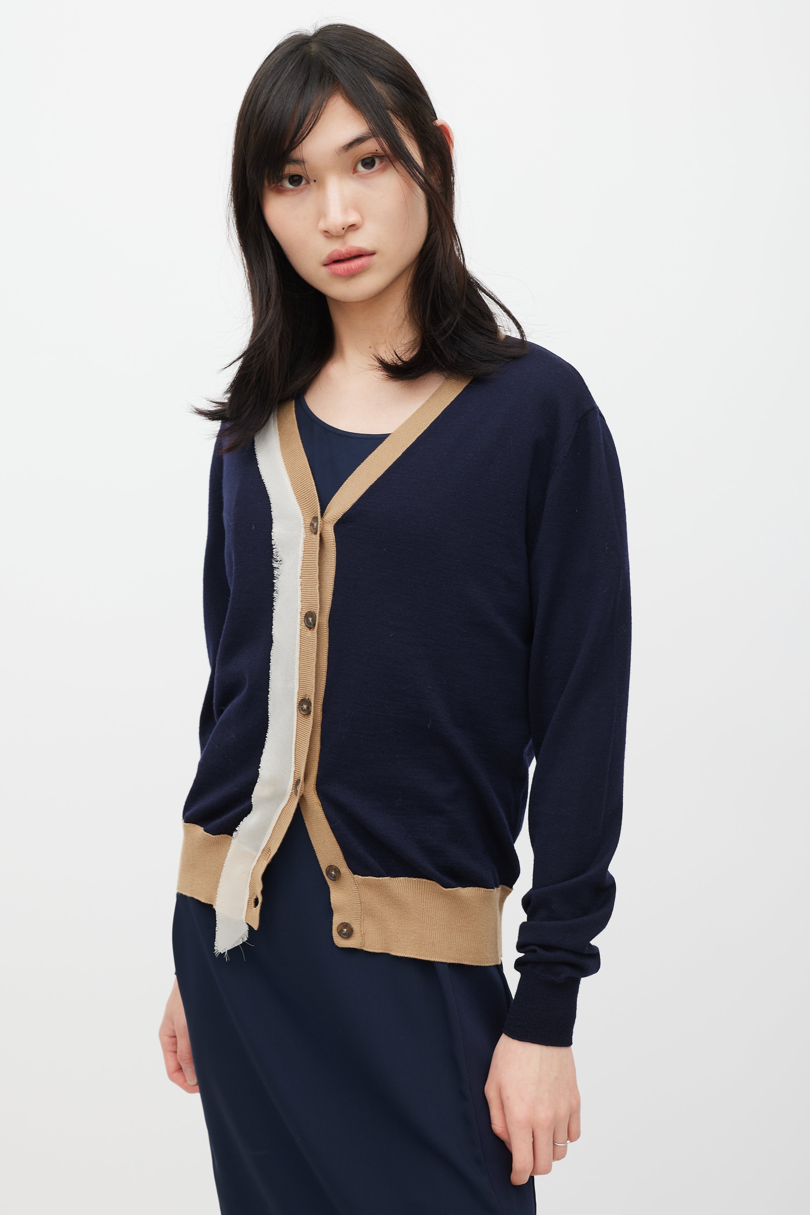 Pre-owned Maison Margiela navy wool cardigan featuring V-neckline, button up front, signature four stitches at back, brown ribbed knit trim, and beige silk trim at front.