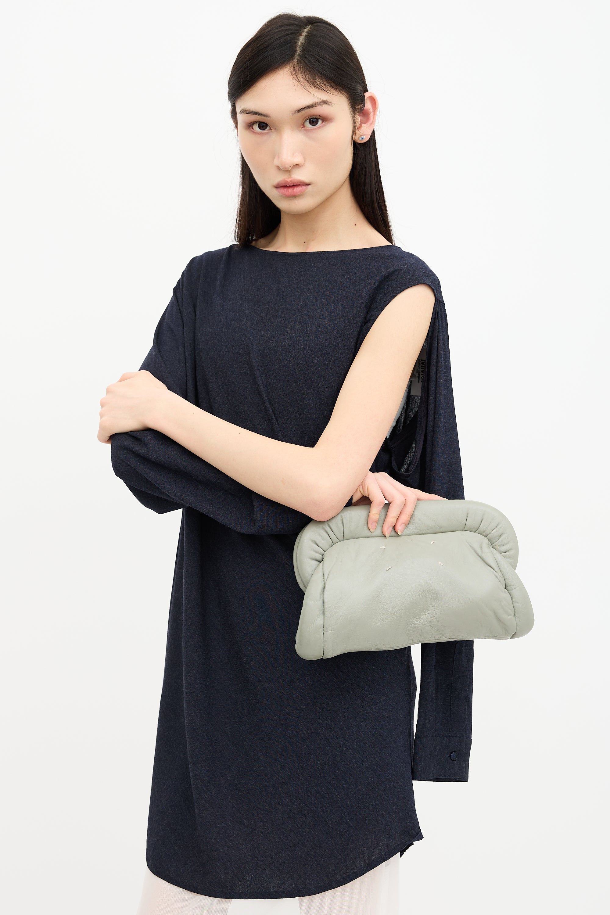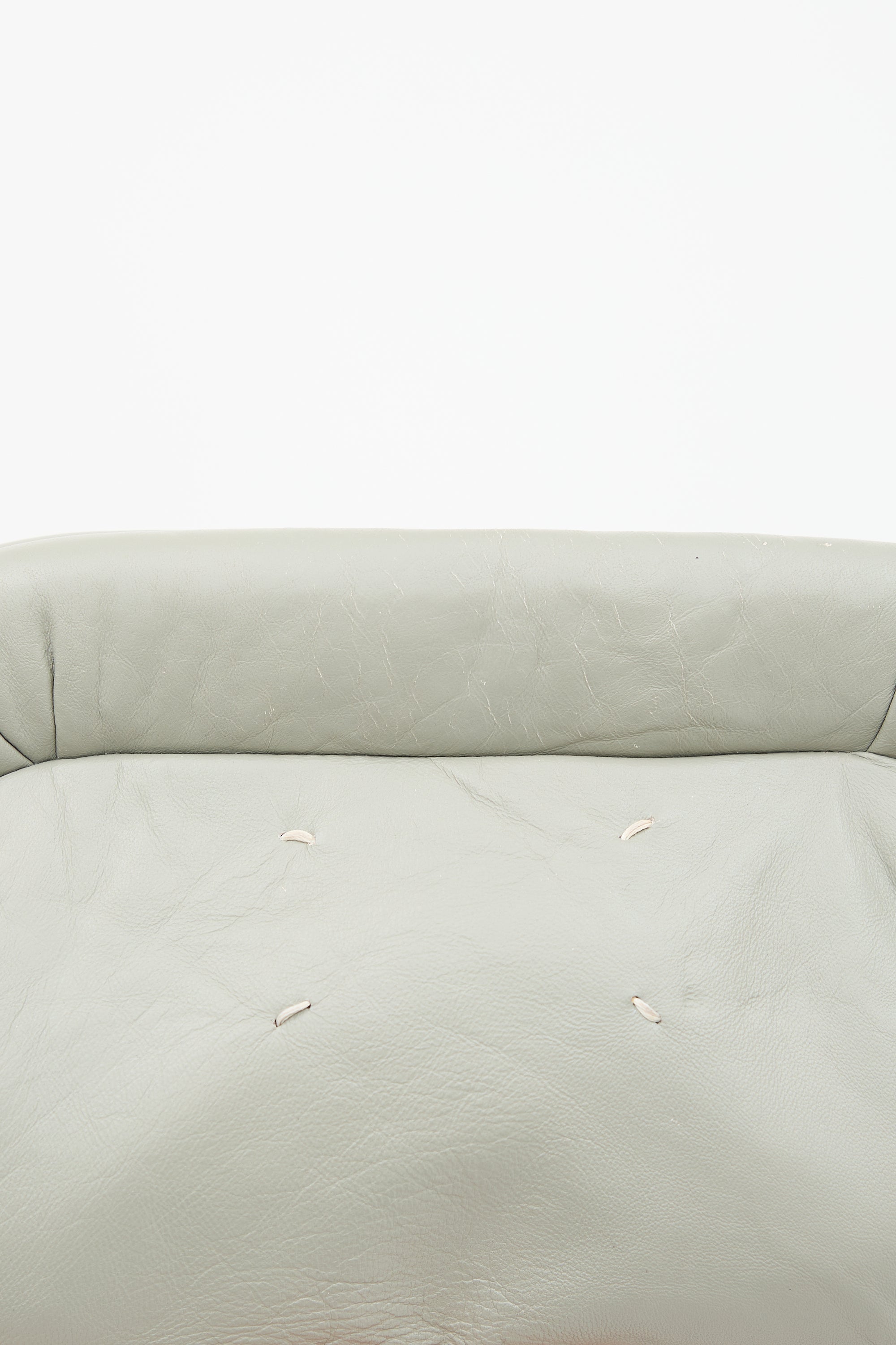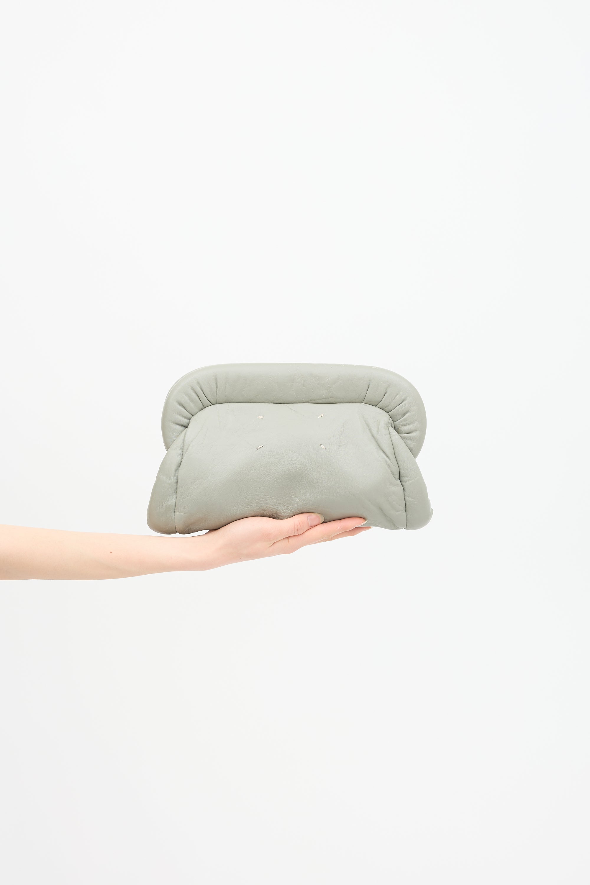 Pre-owned Maison Margiela grey clutch bag featuring a magnetic top closure, padded sides, signature white stitching, fabric lining, and one interior zip pocket.