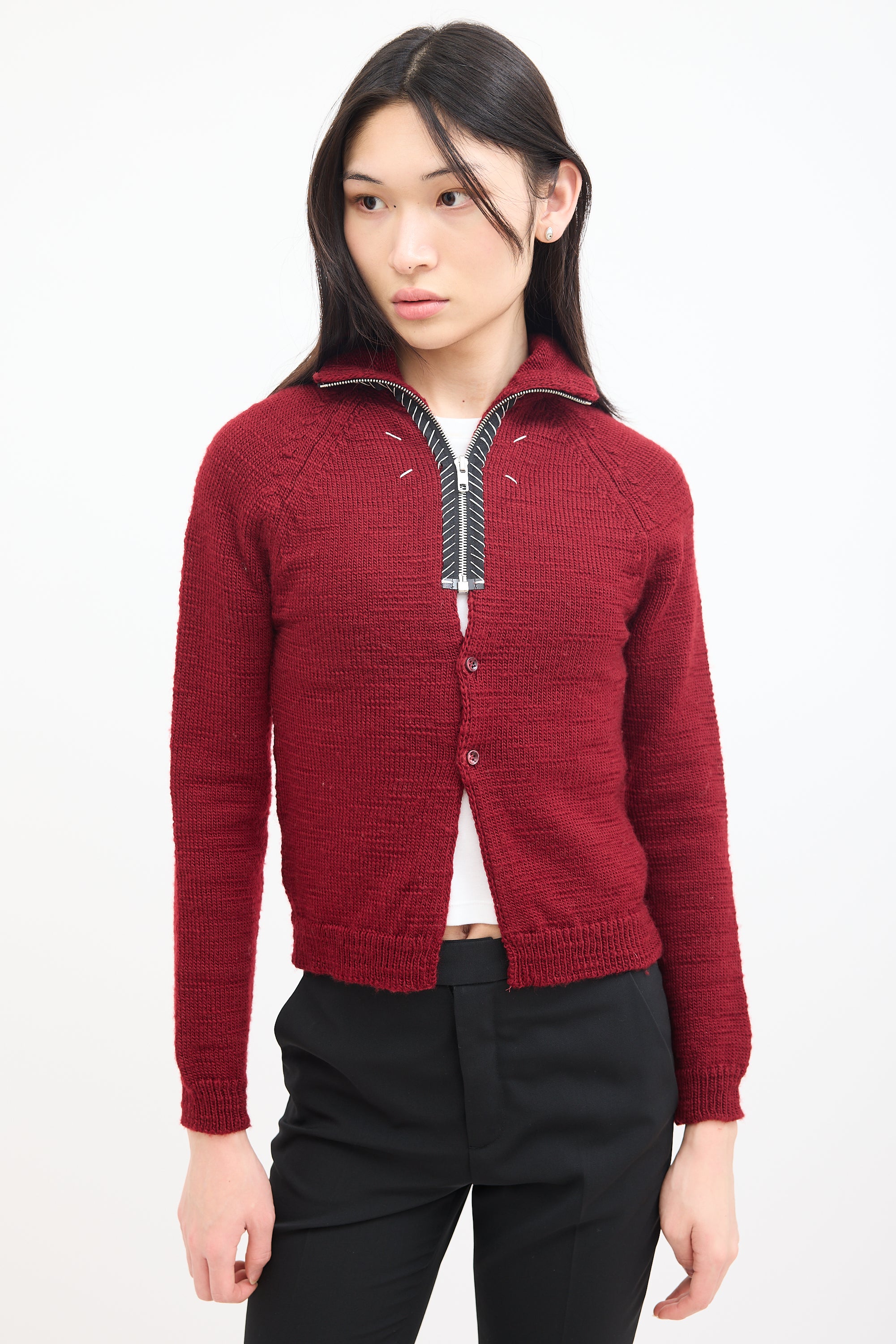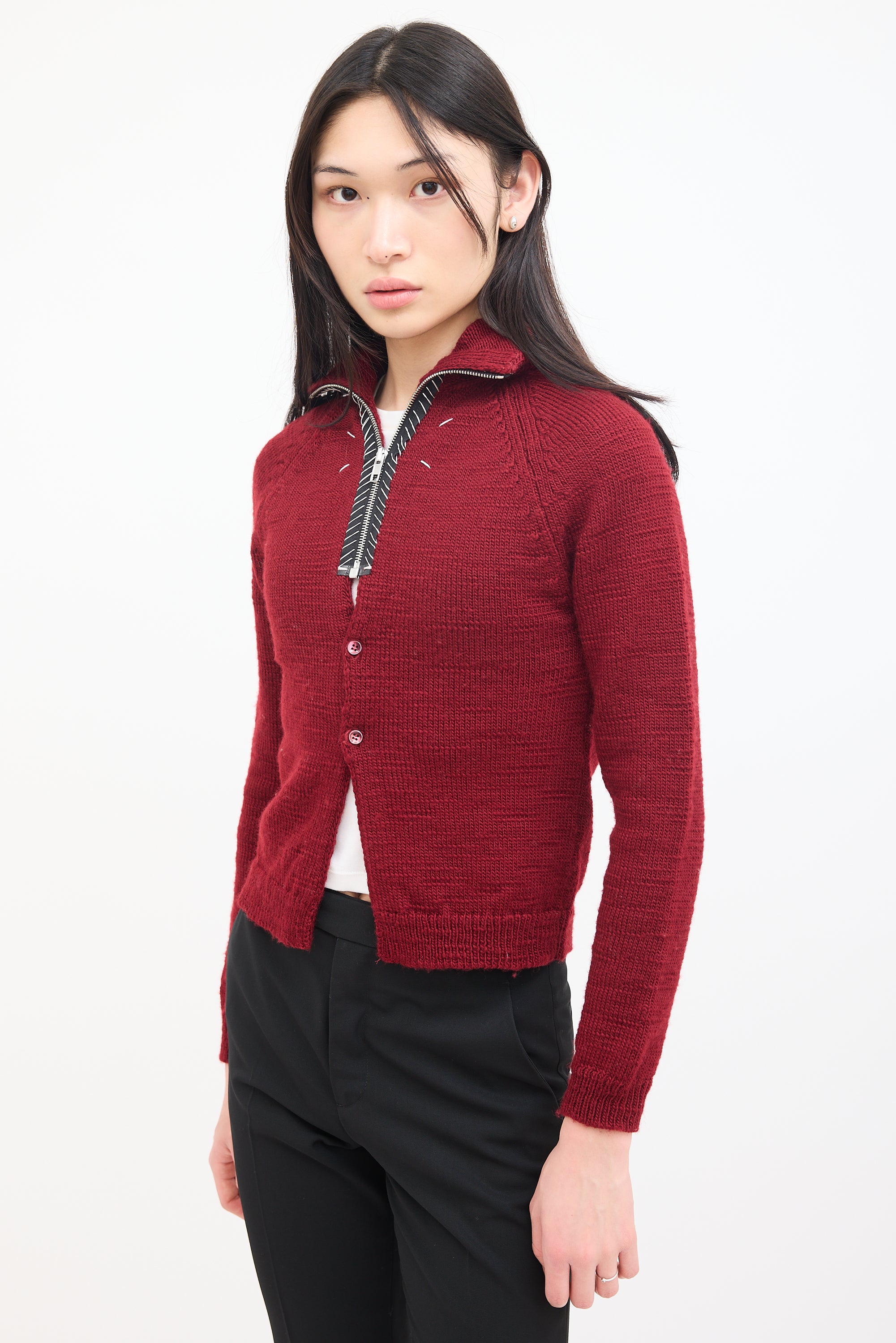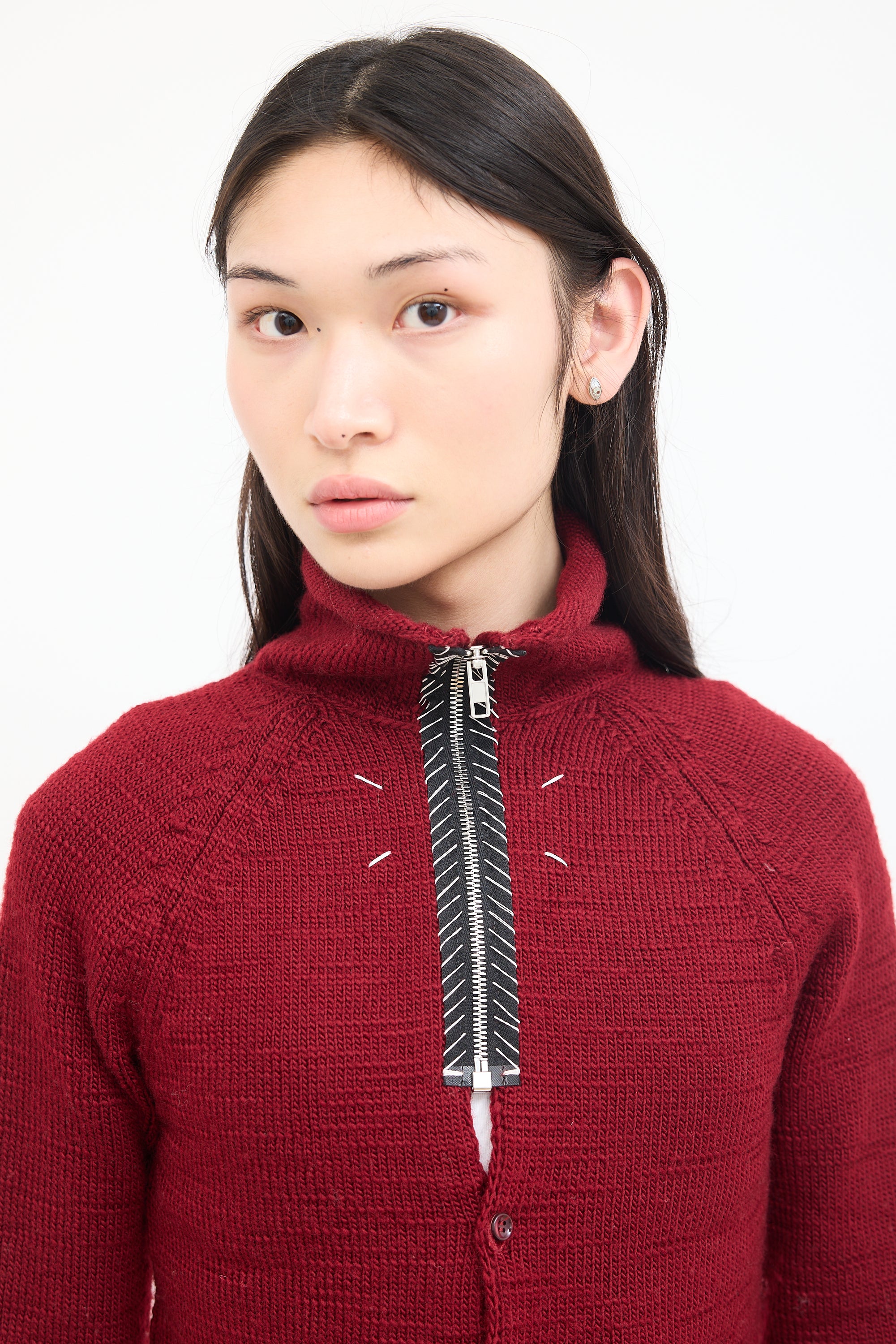 Pre-owned Maison Margiela red wool sweater featuring a funnel collar, upper quarter zip front closure with deconstructed design, bottom button up front closure, long raglan sleeves, ribbed hem and cuffs, and signature four white stitches at upper chest.