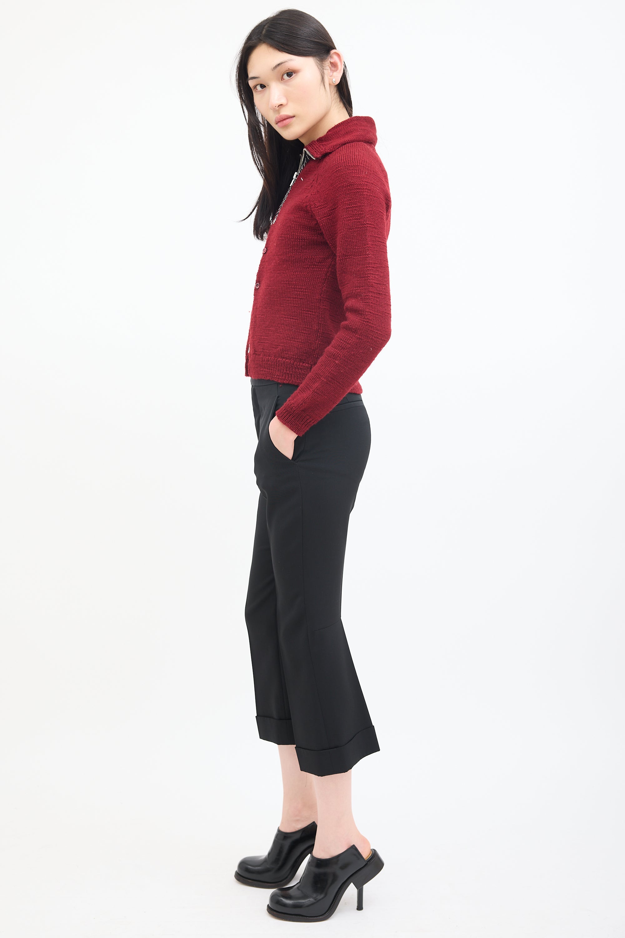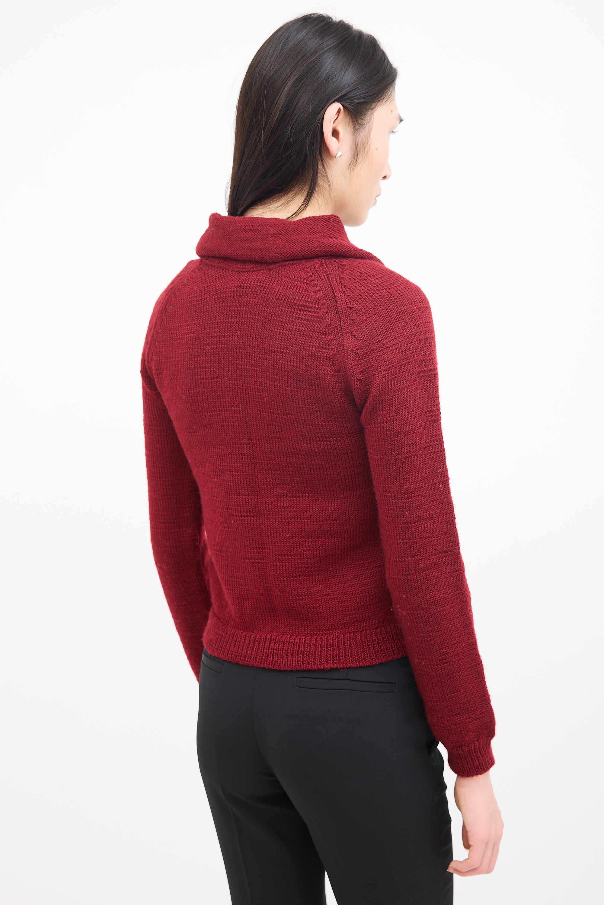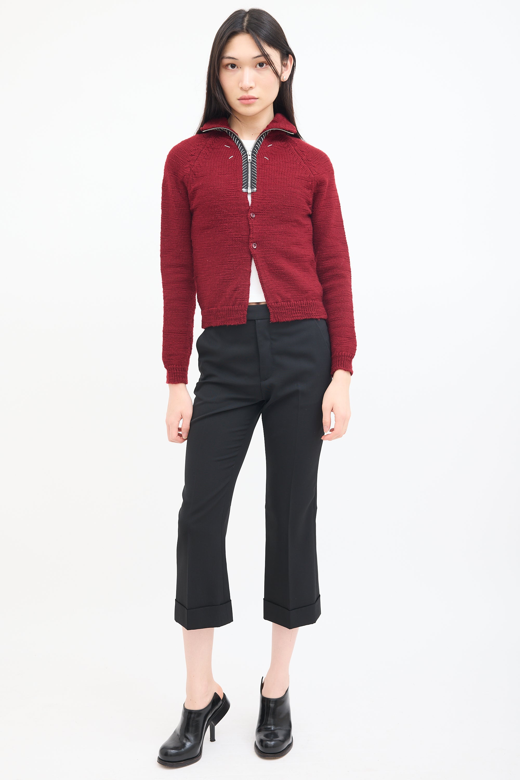 Pre-owned Maison Margiela red wool sweater featuring a funnel collar, upper quarter zip front closure with deconstructed design, bottom button up front closure, long raglan sleeves, ribbed hem and cuffs, and signature four white stitches at upper chest.