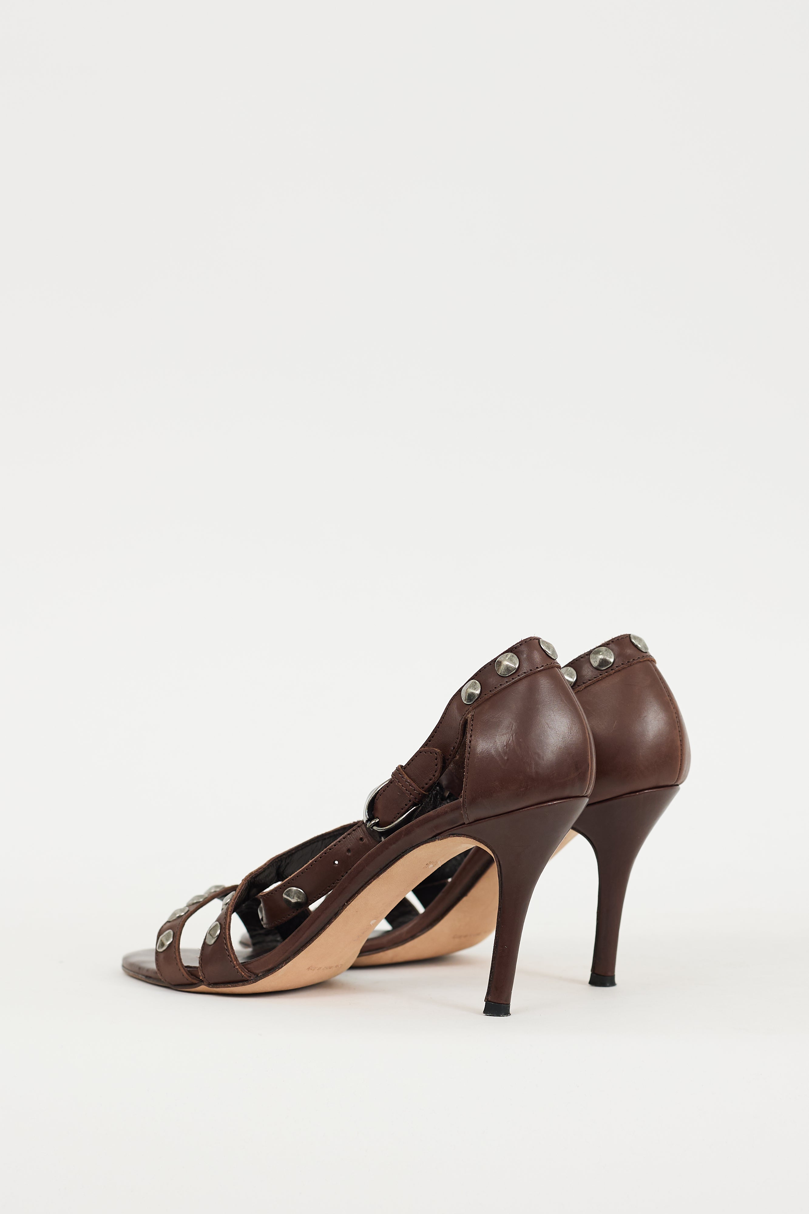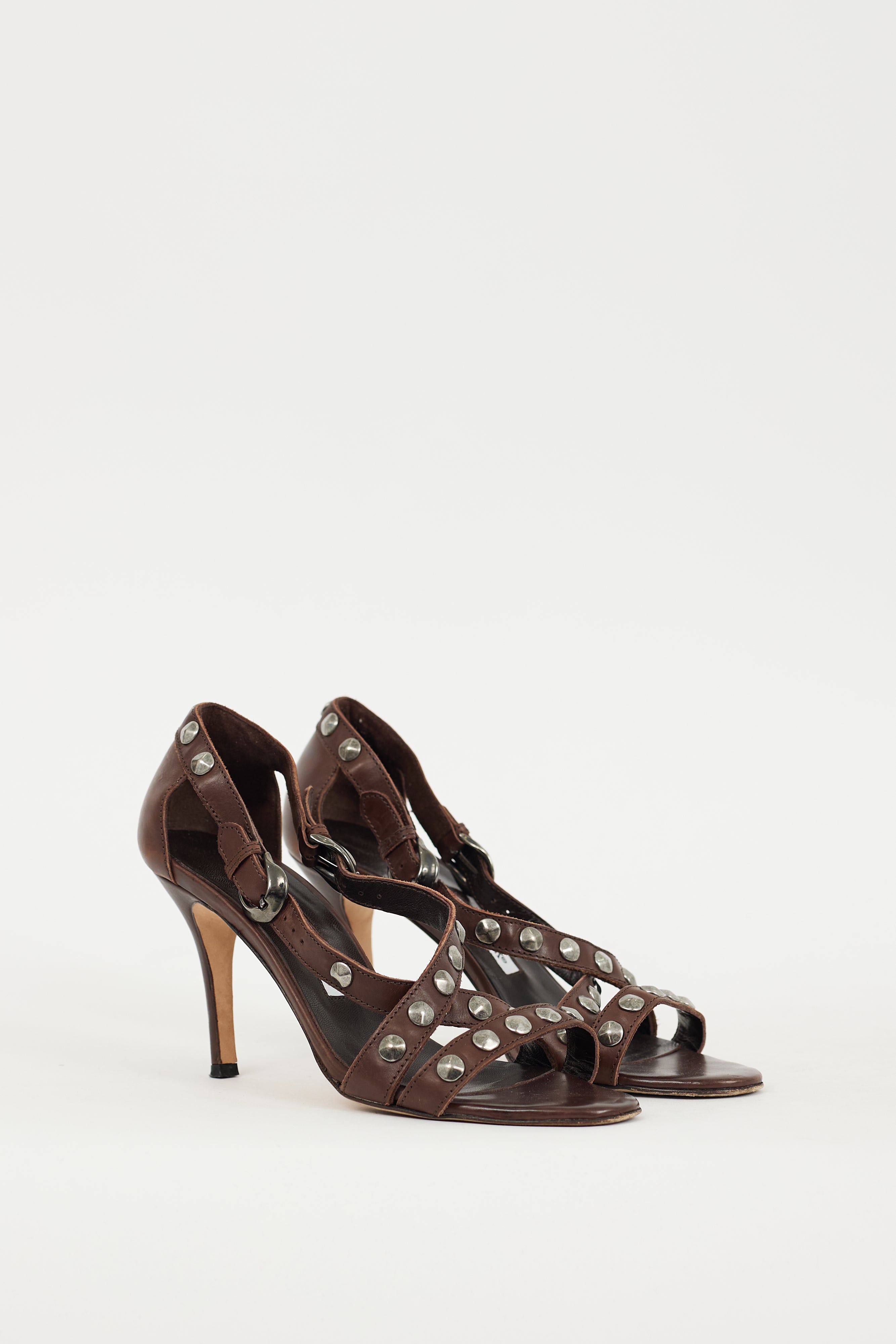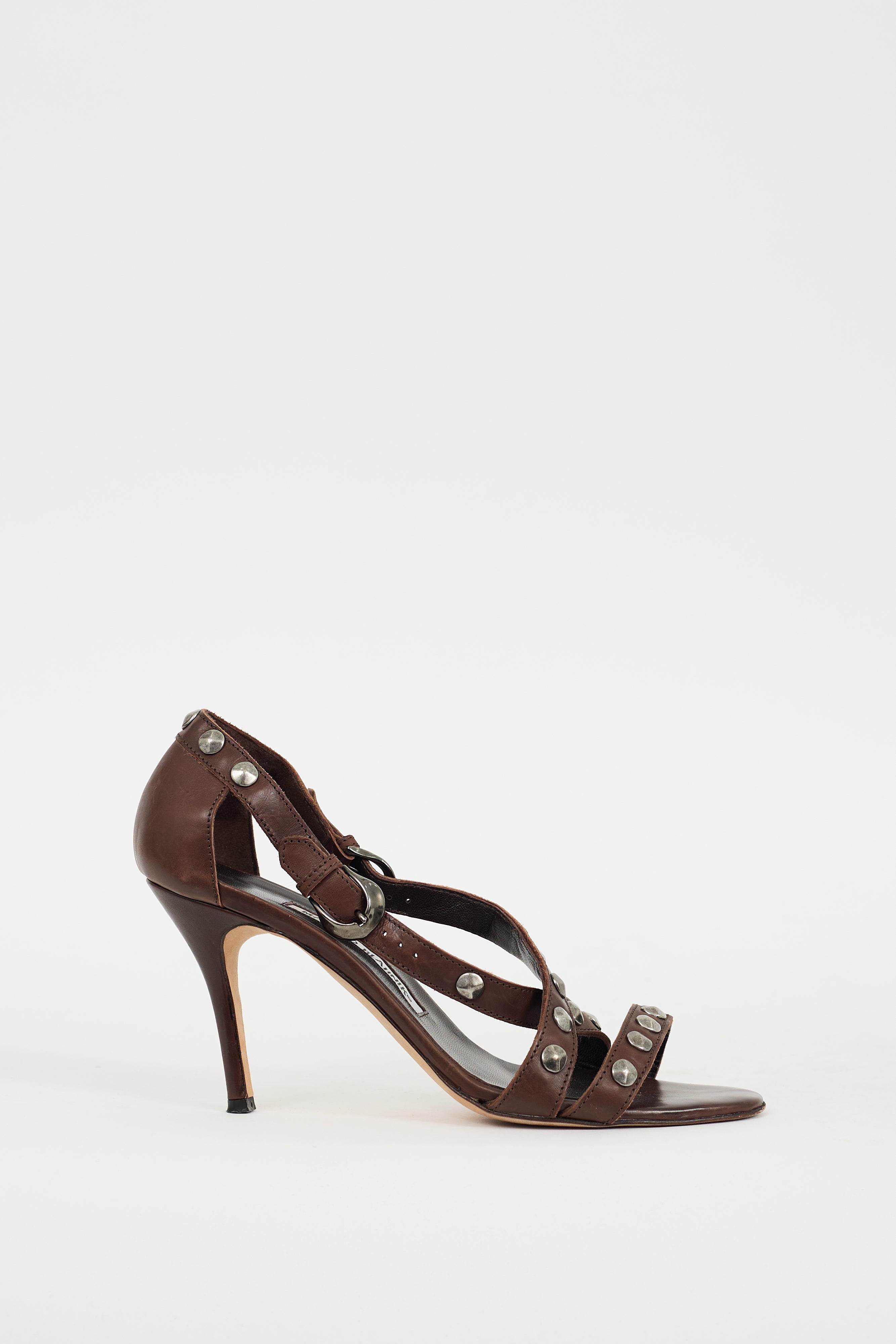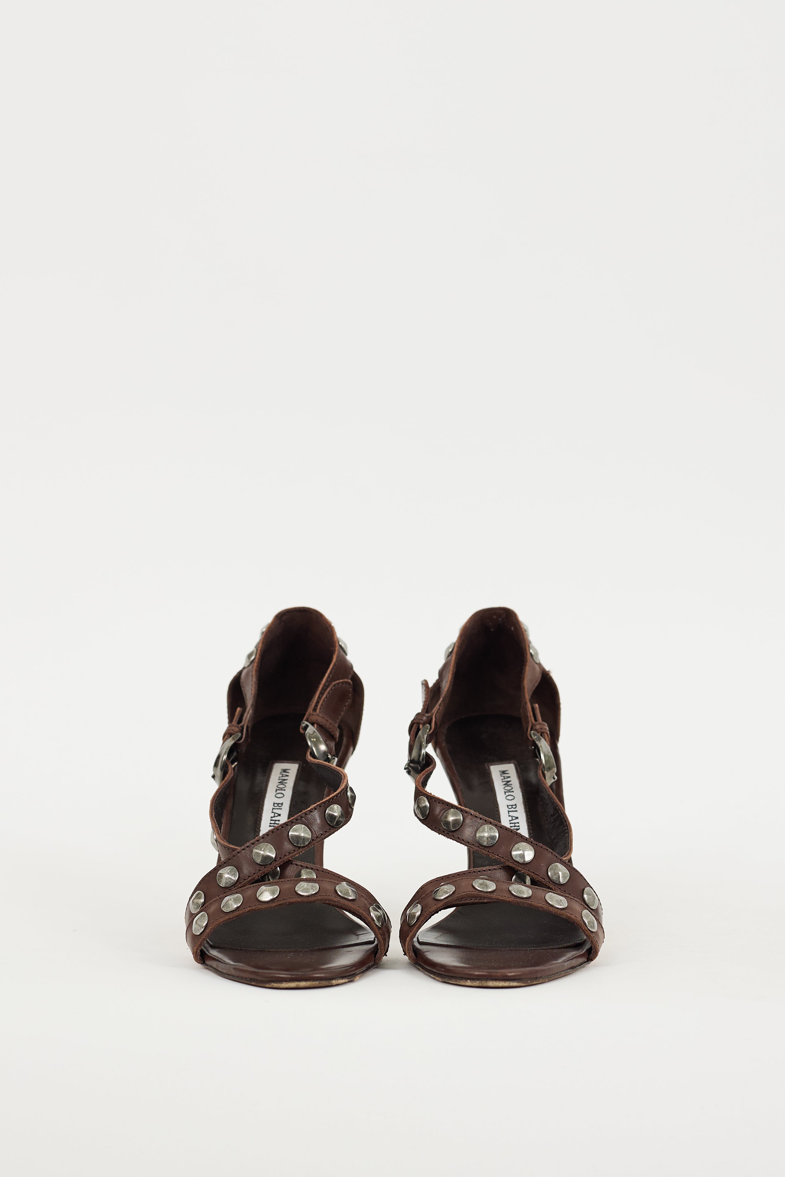 Pre-owned Manolo Blahnik brown Ningia leather sandals featuring silver tone studded embellishment, open round toe, strap at vamp, criss cross straps at upper, wrapped stiletto heel, and adjustable straps at ankle.