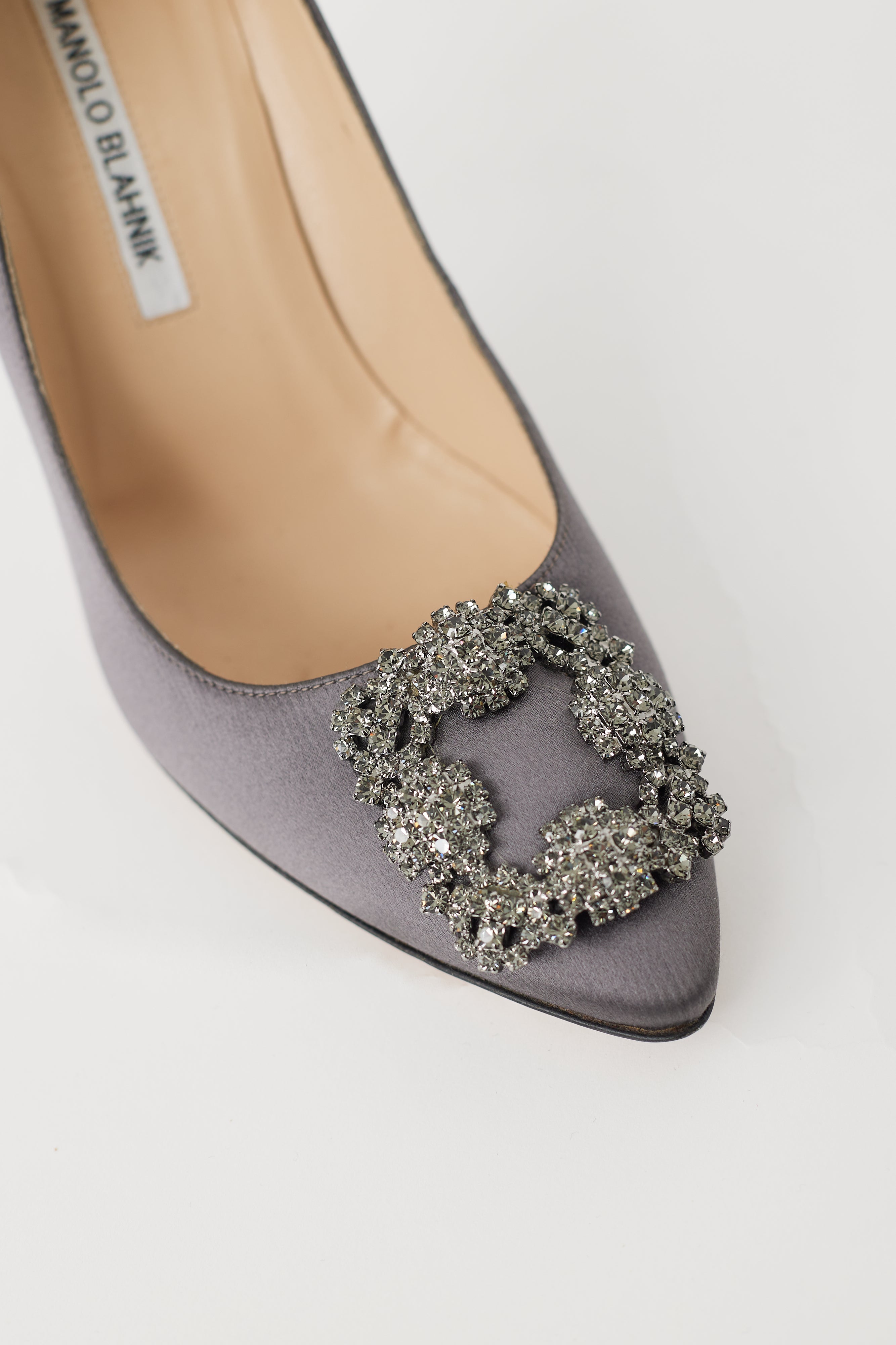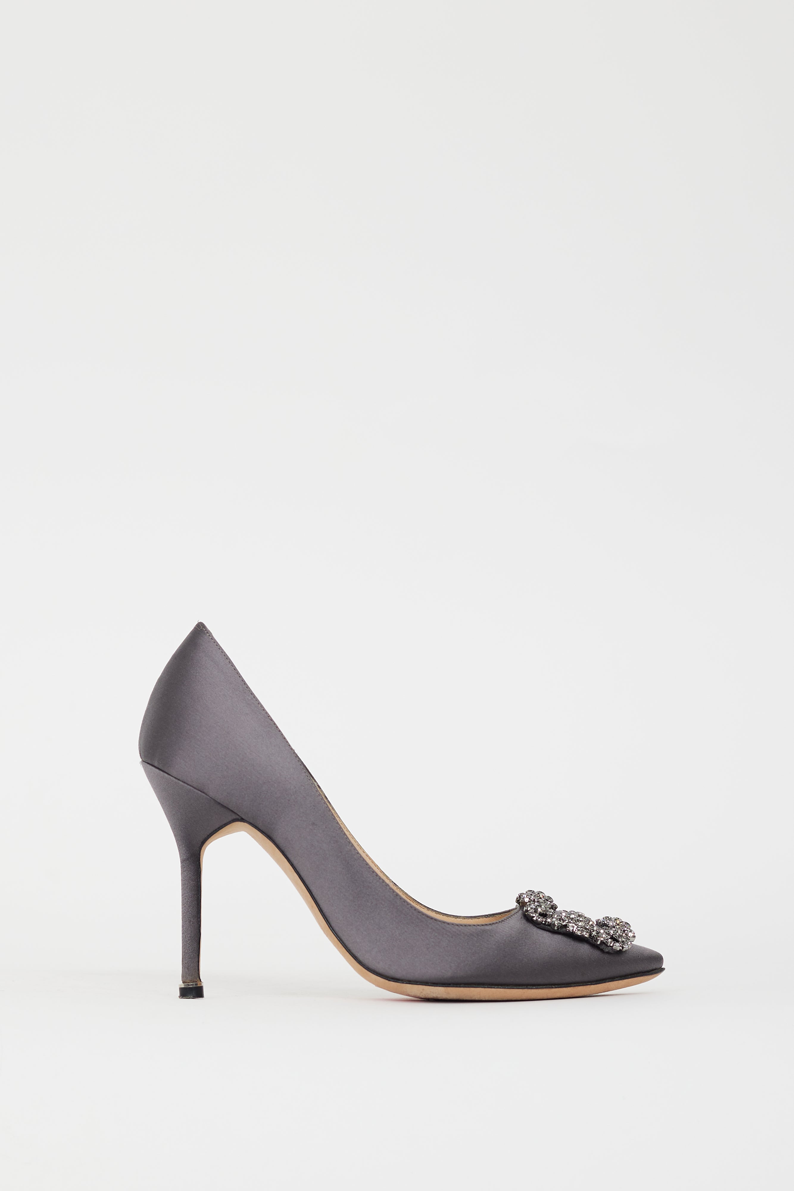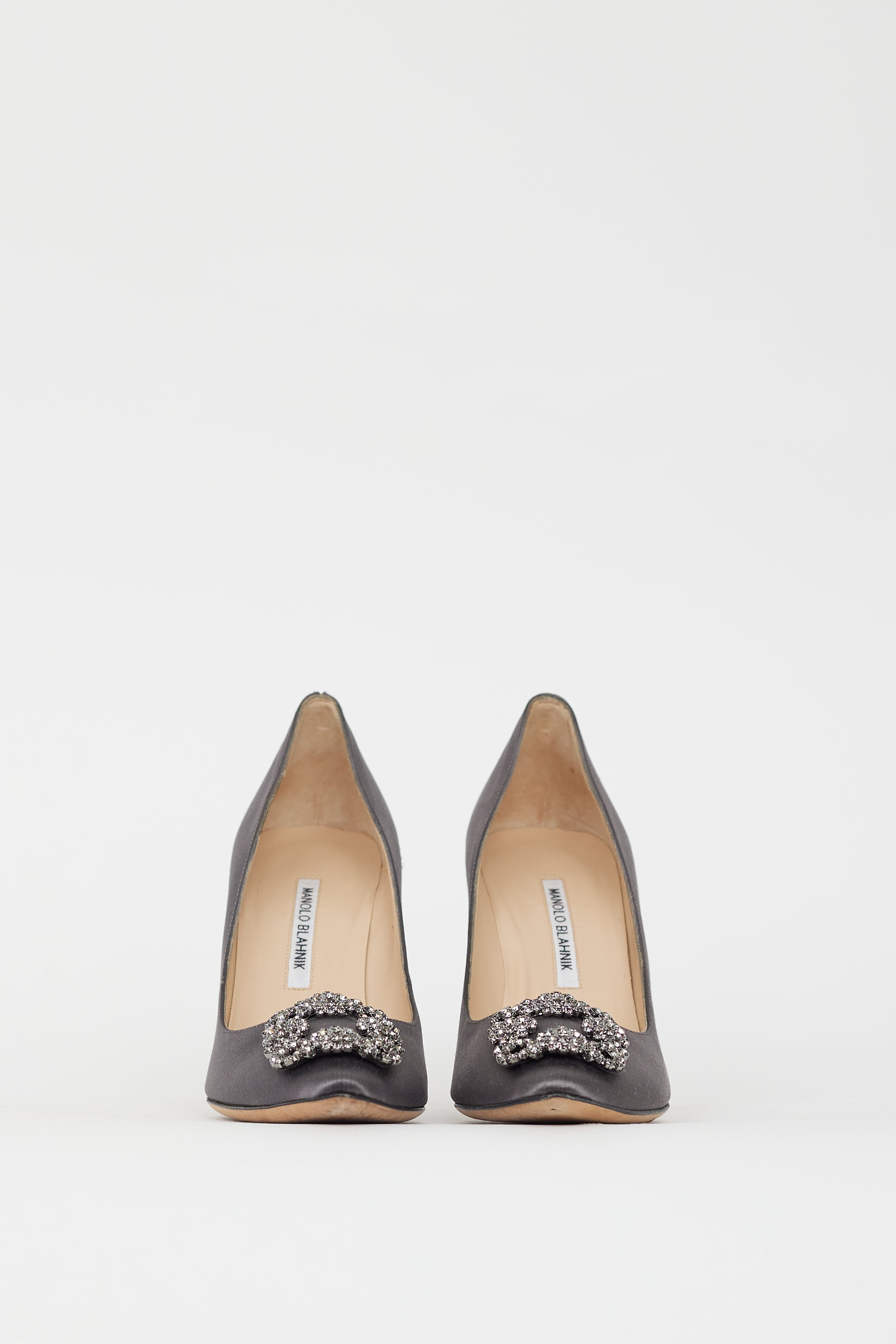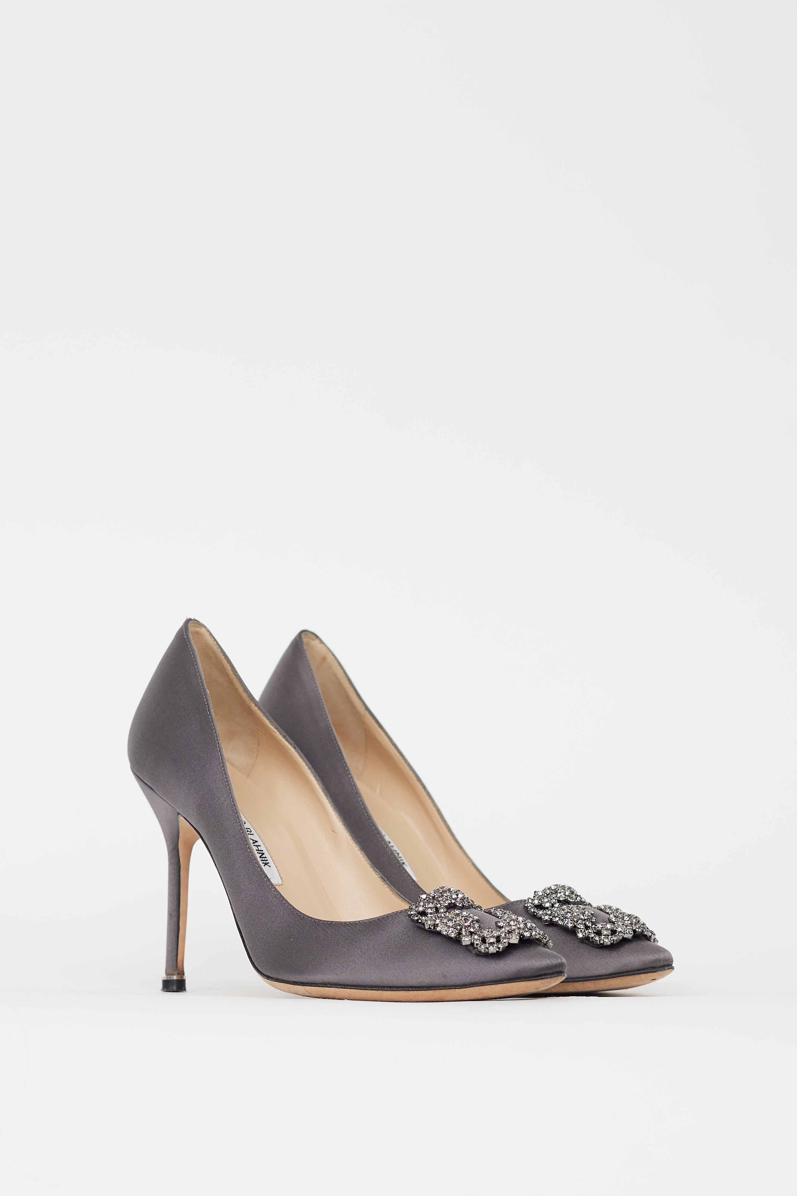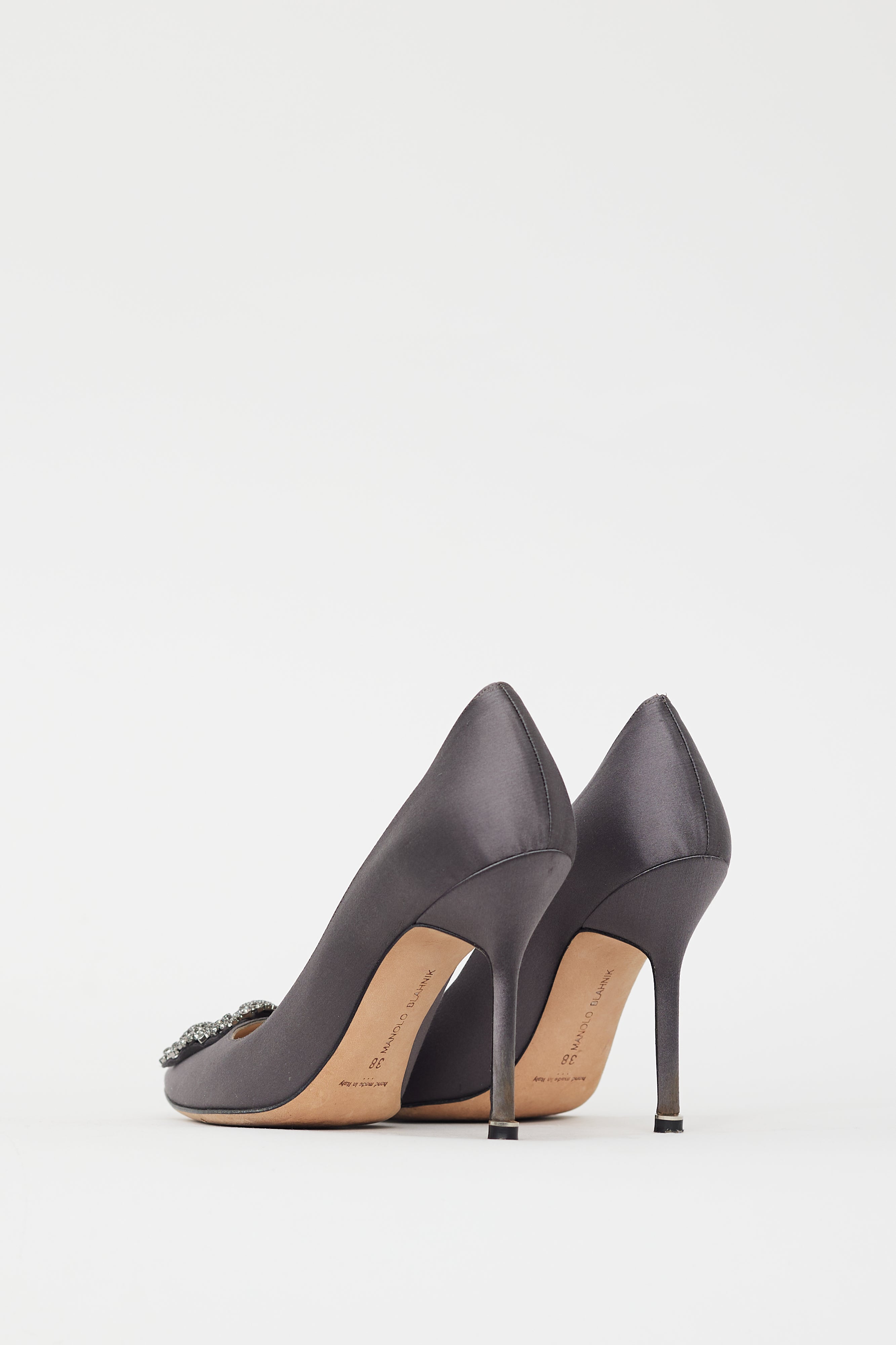 Pre-owned Manolo Blahnik grey satin Hangisi pumps featuring a pointed toe, jewel embellished brooch detail, wrapped stiletto heel, and slip on entry. Comes with original dust bags.
