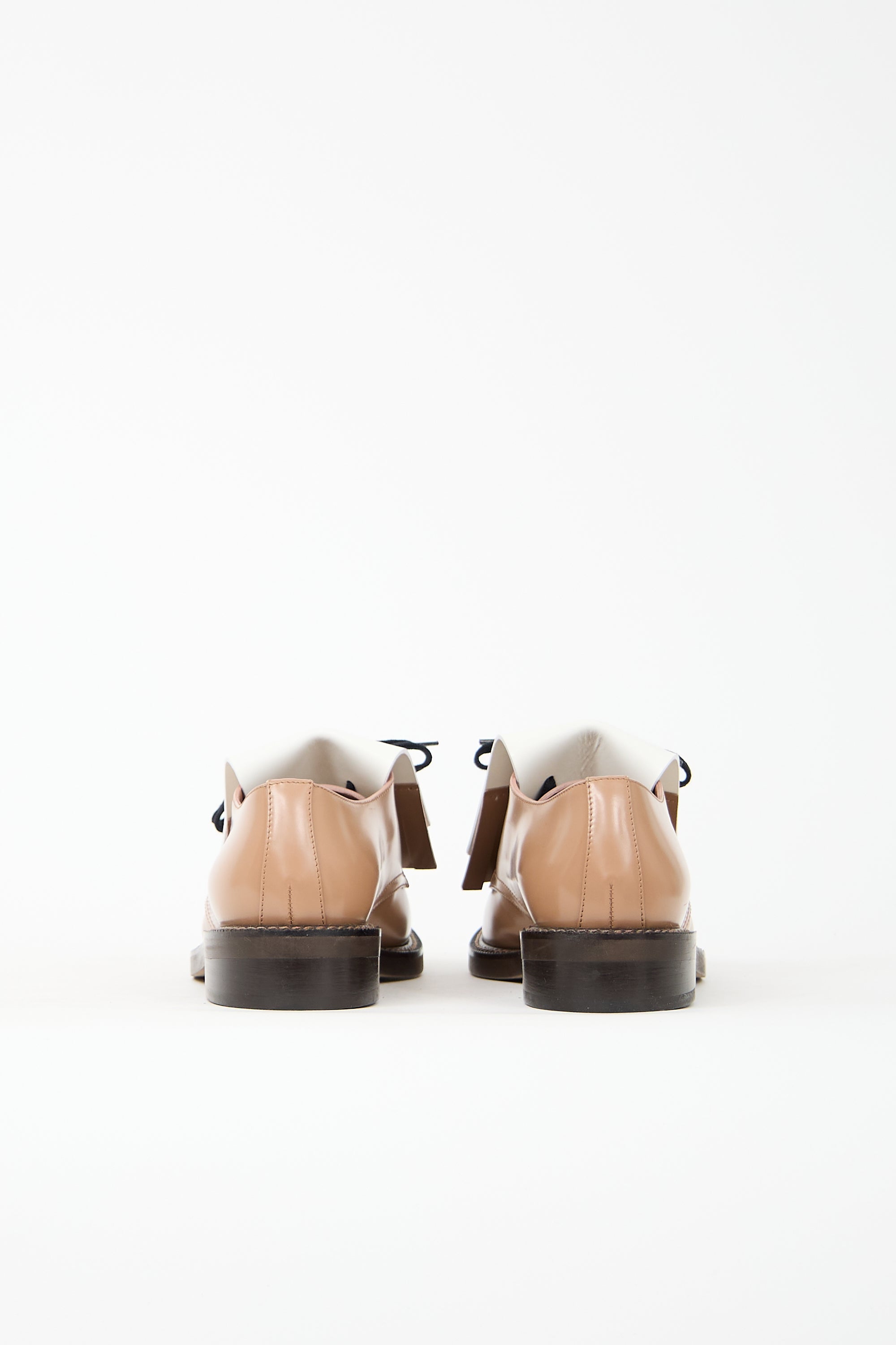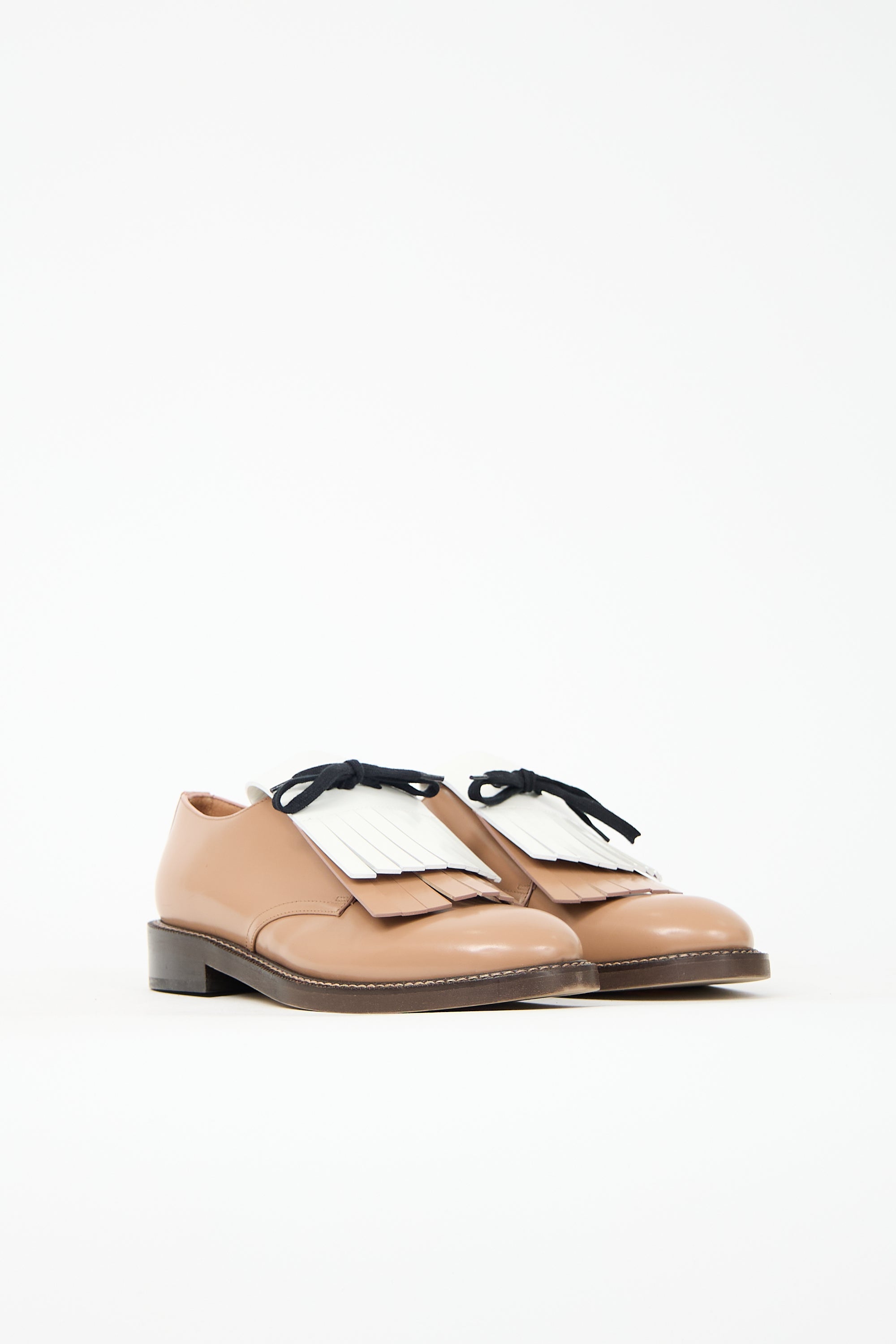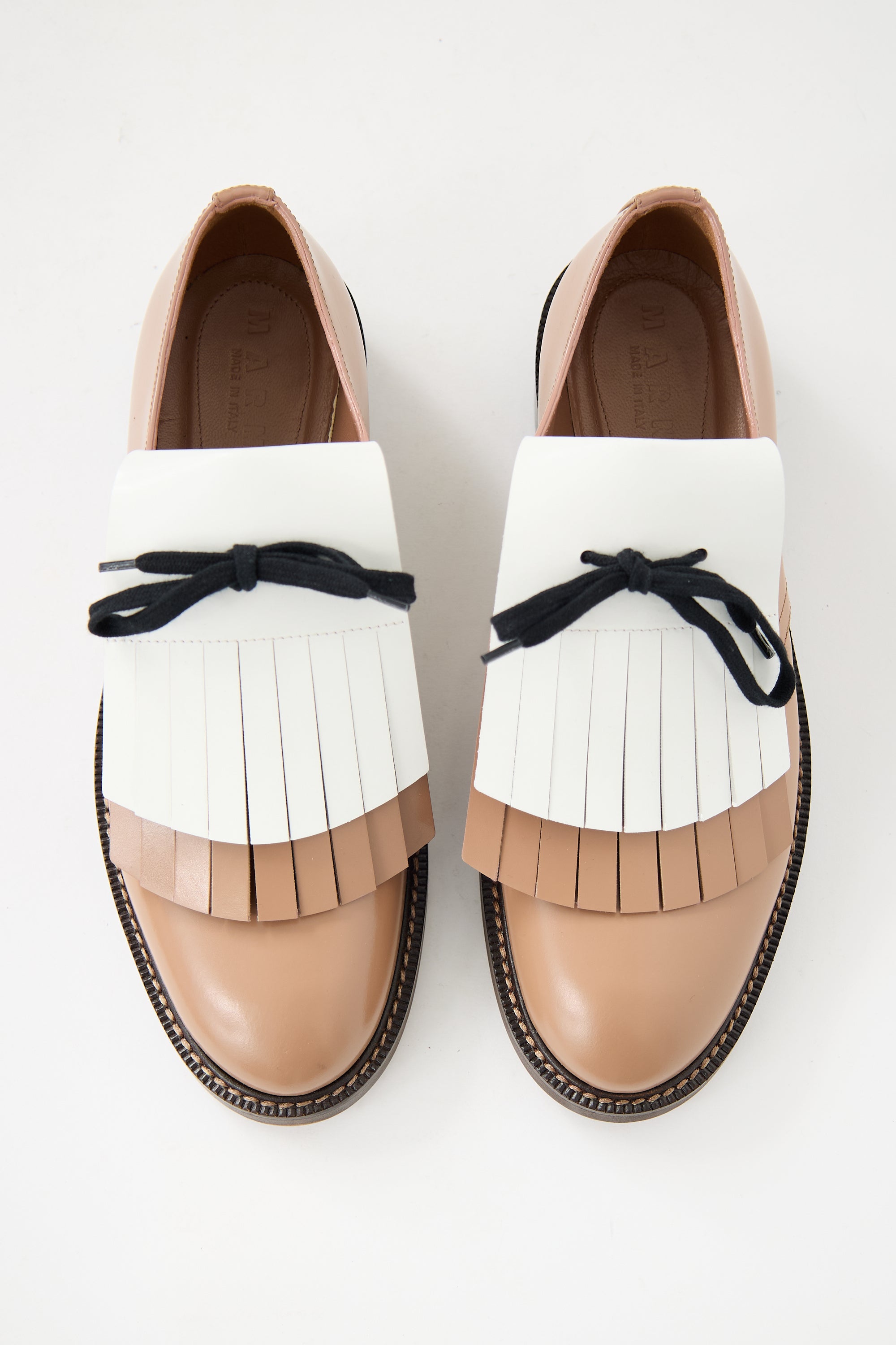 Pre-owned Marni brown leather derbys featuring a rounded toe, brown and white kiltie fringe at vamp, lace up front, and stacked heel.