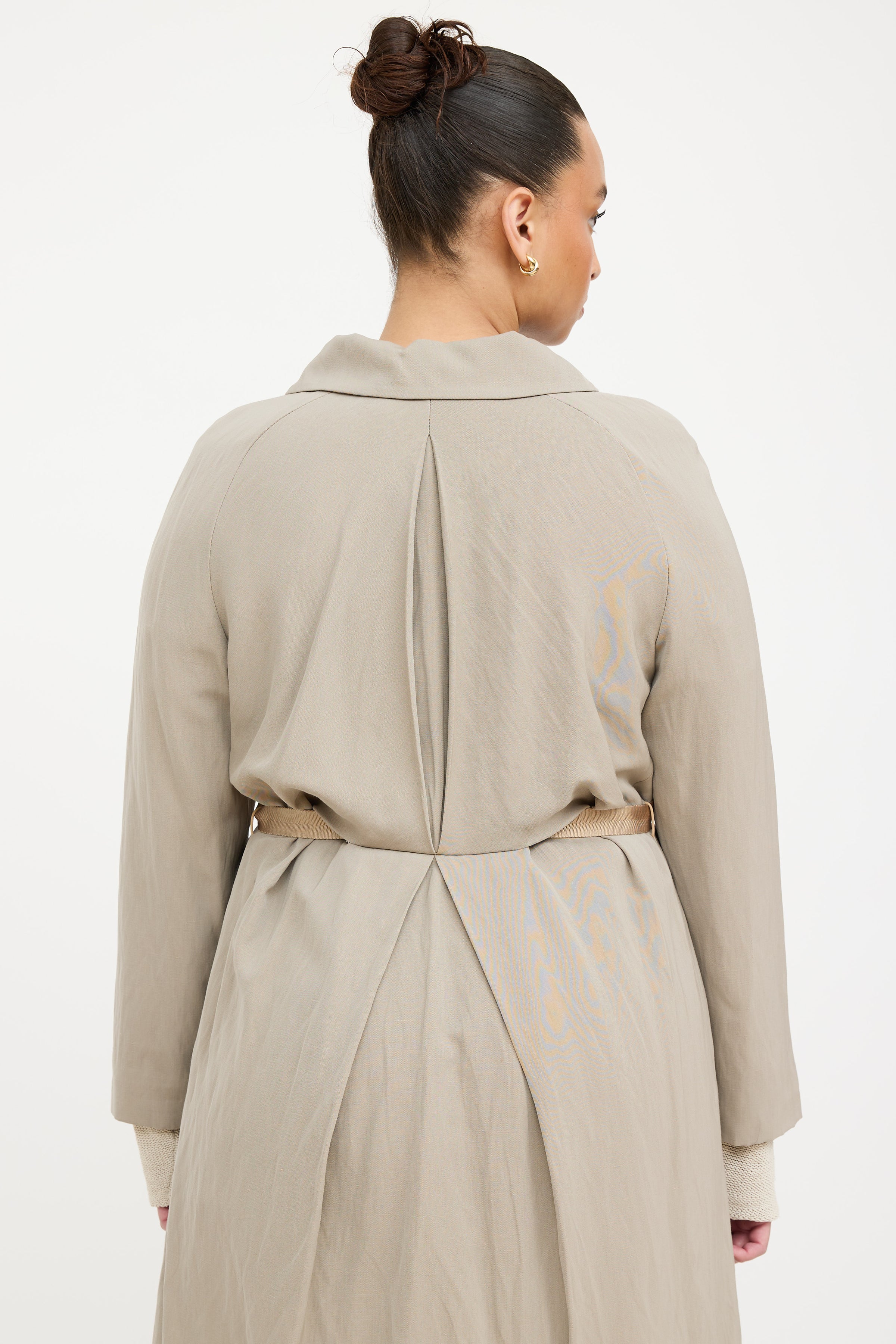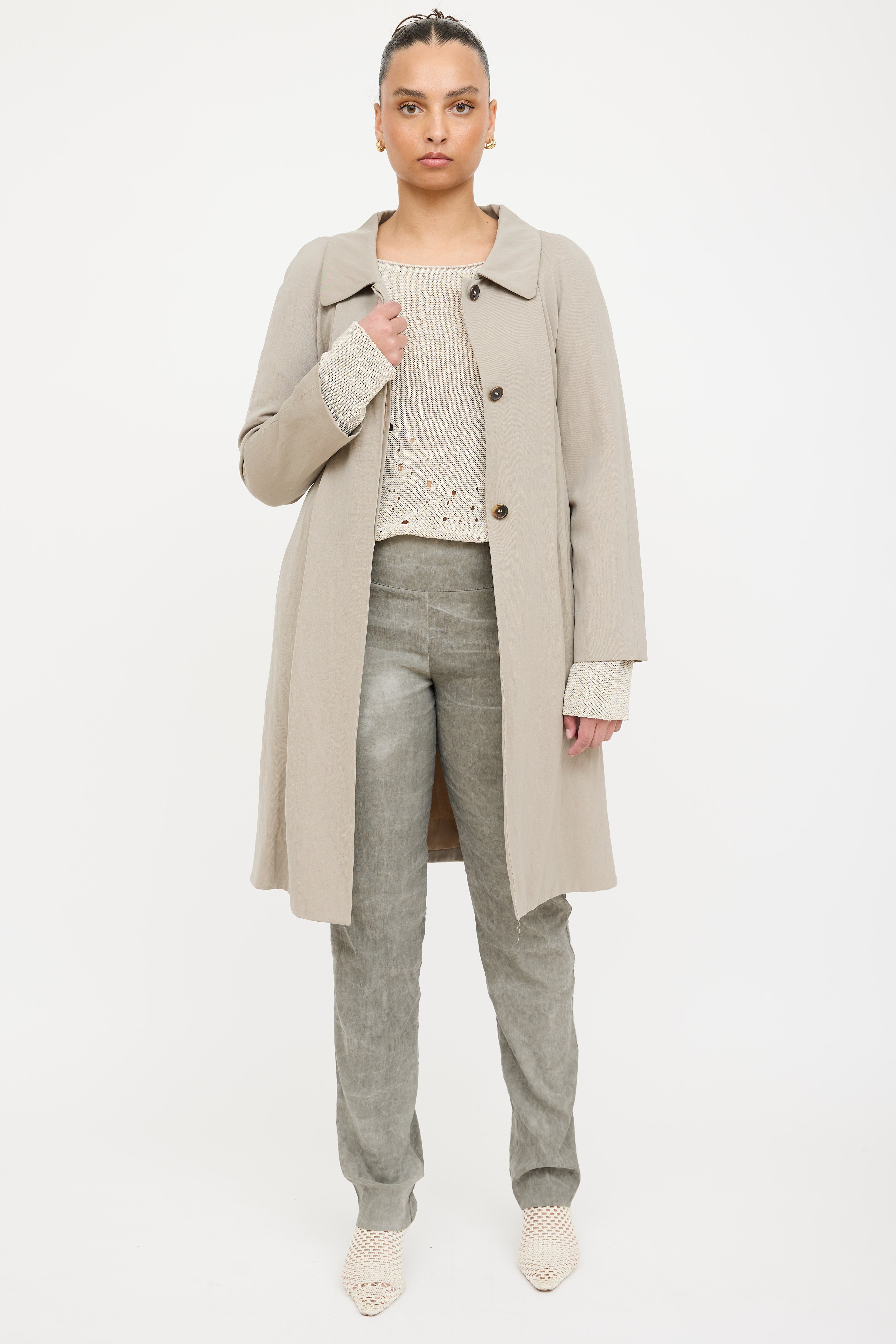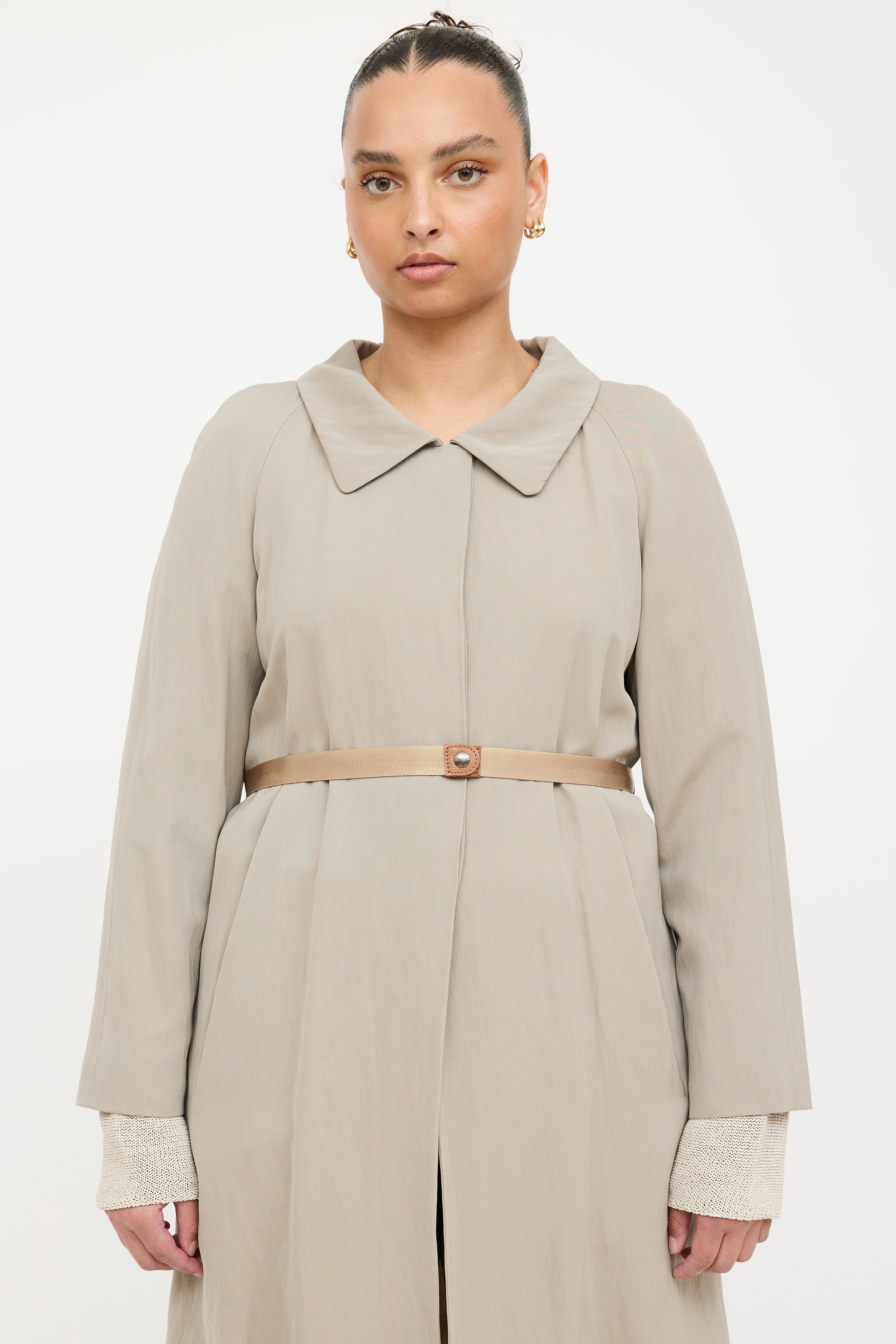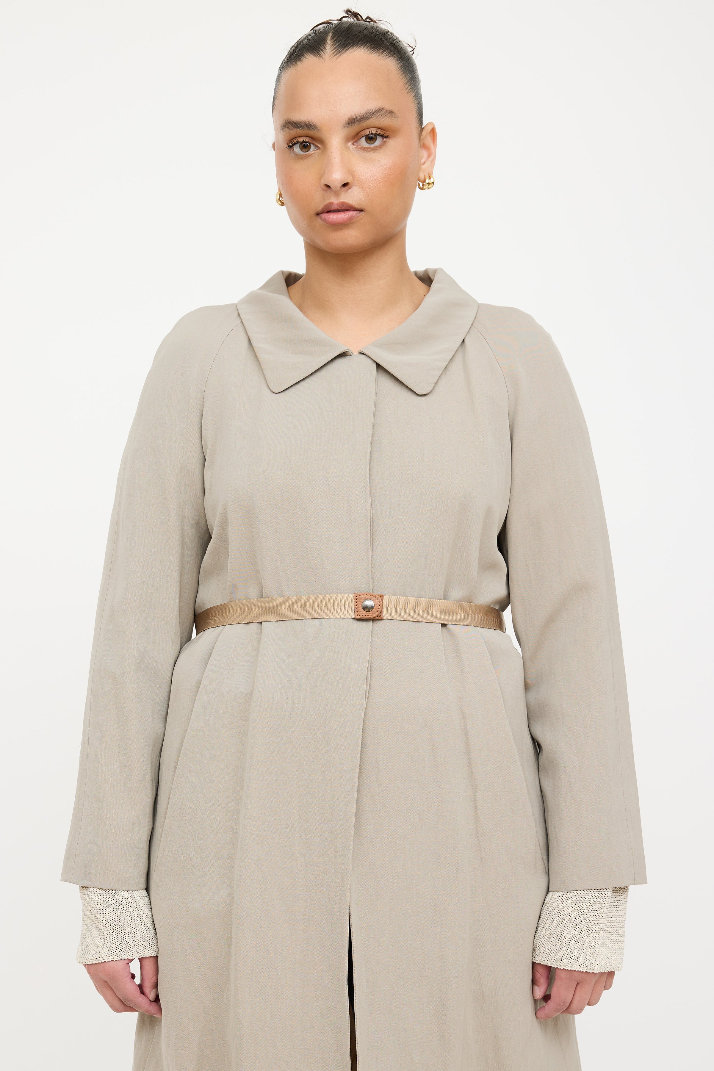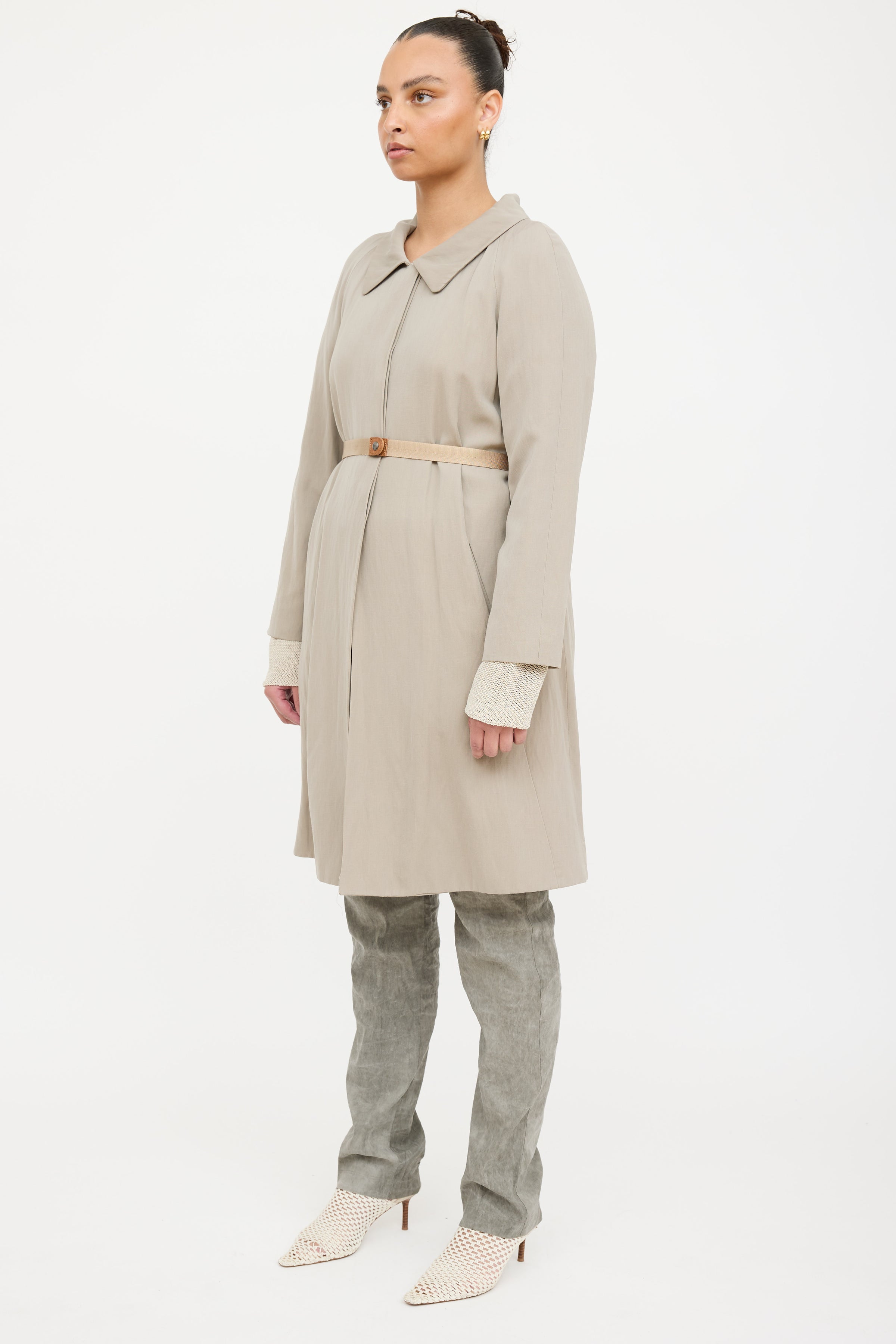 Pre-owned Marni beige wool balmacaan coat featuring a pointed collar, long raglan sleeves, snap button belt at waist, two slip pockets at hip, and button up closure. Lined.