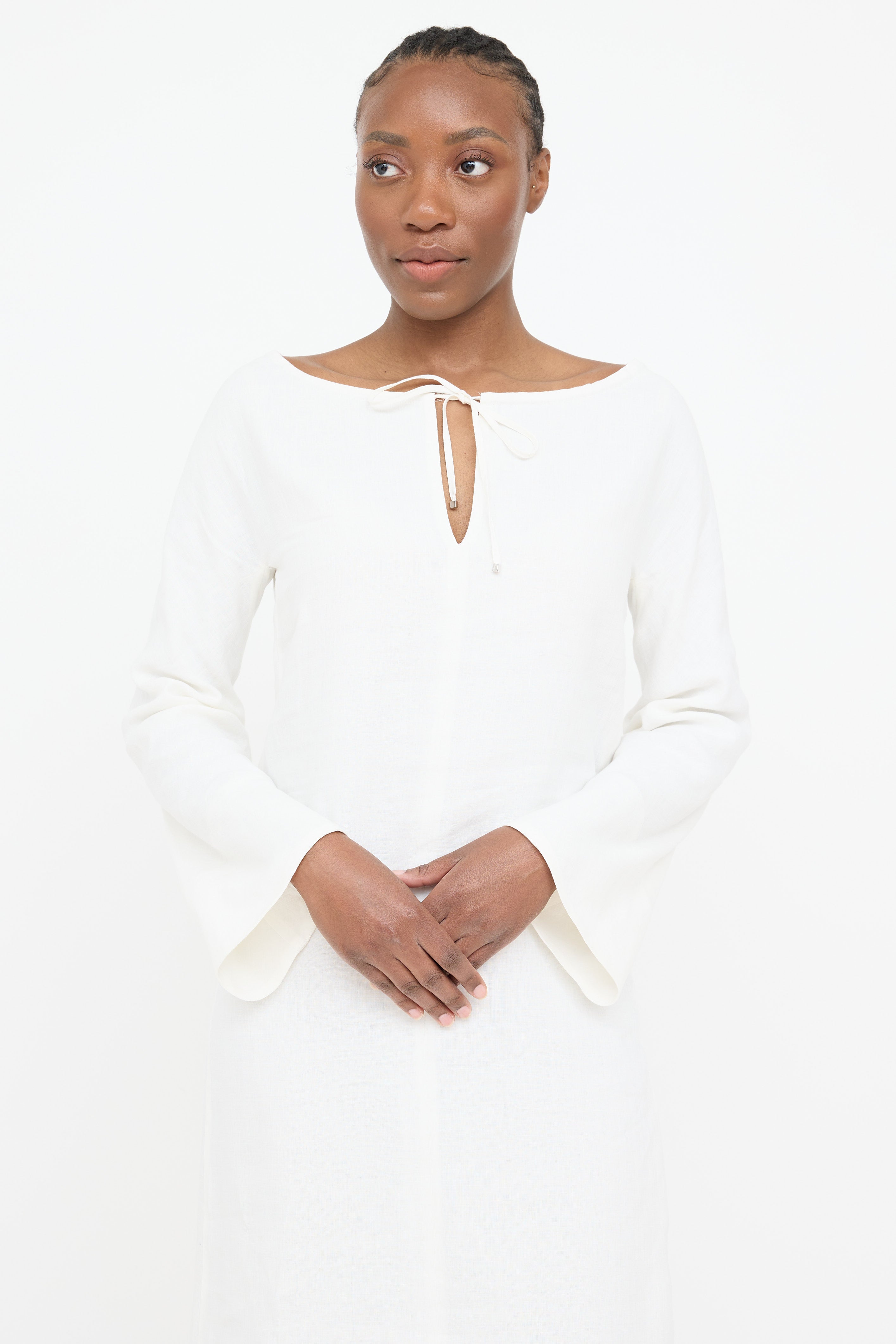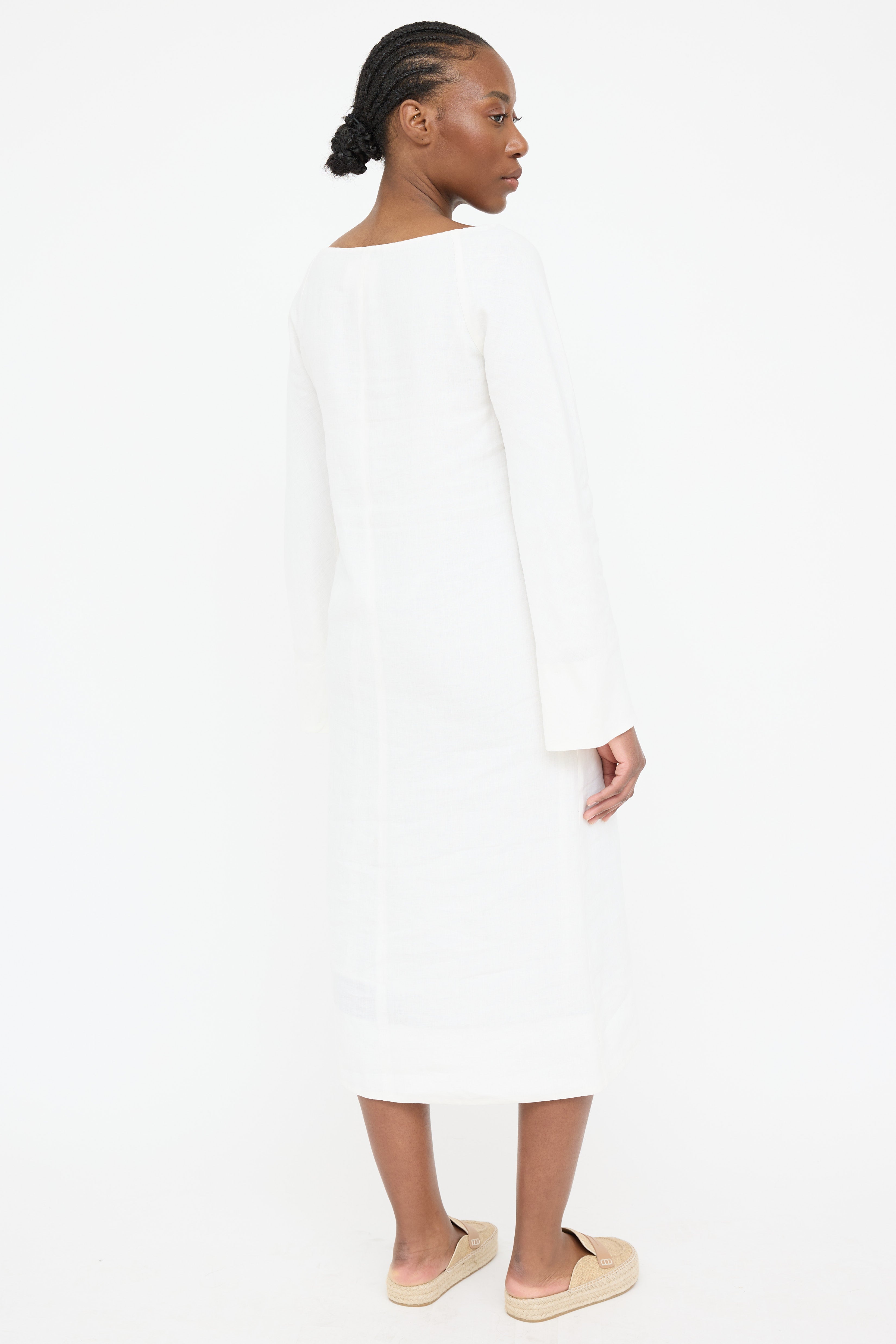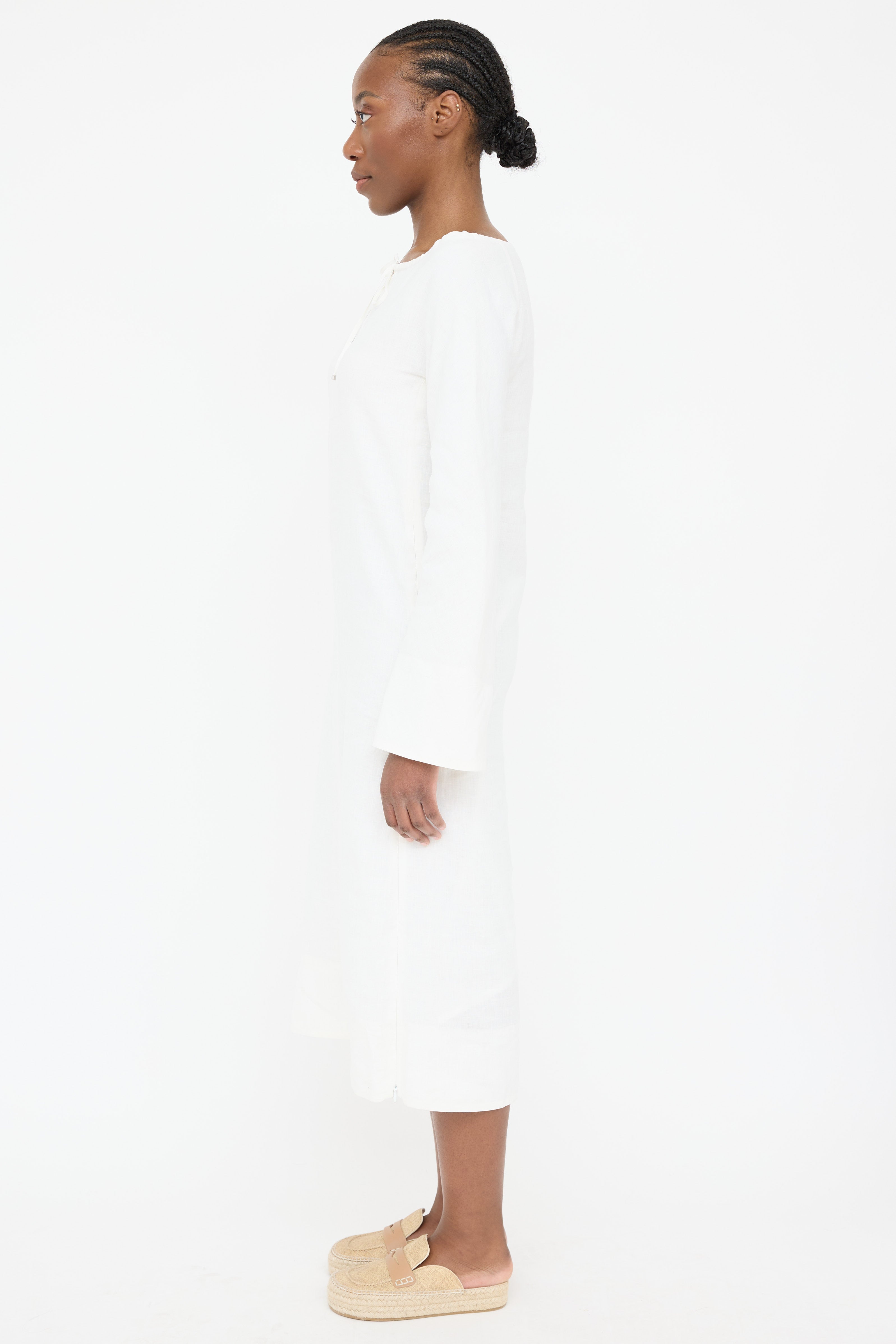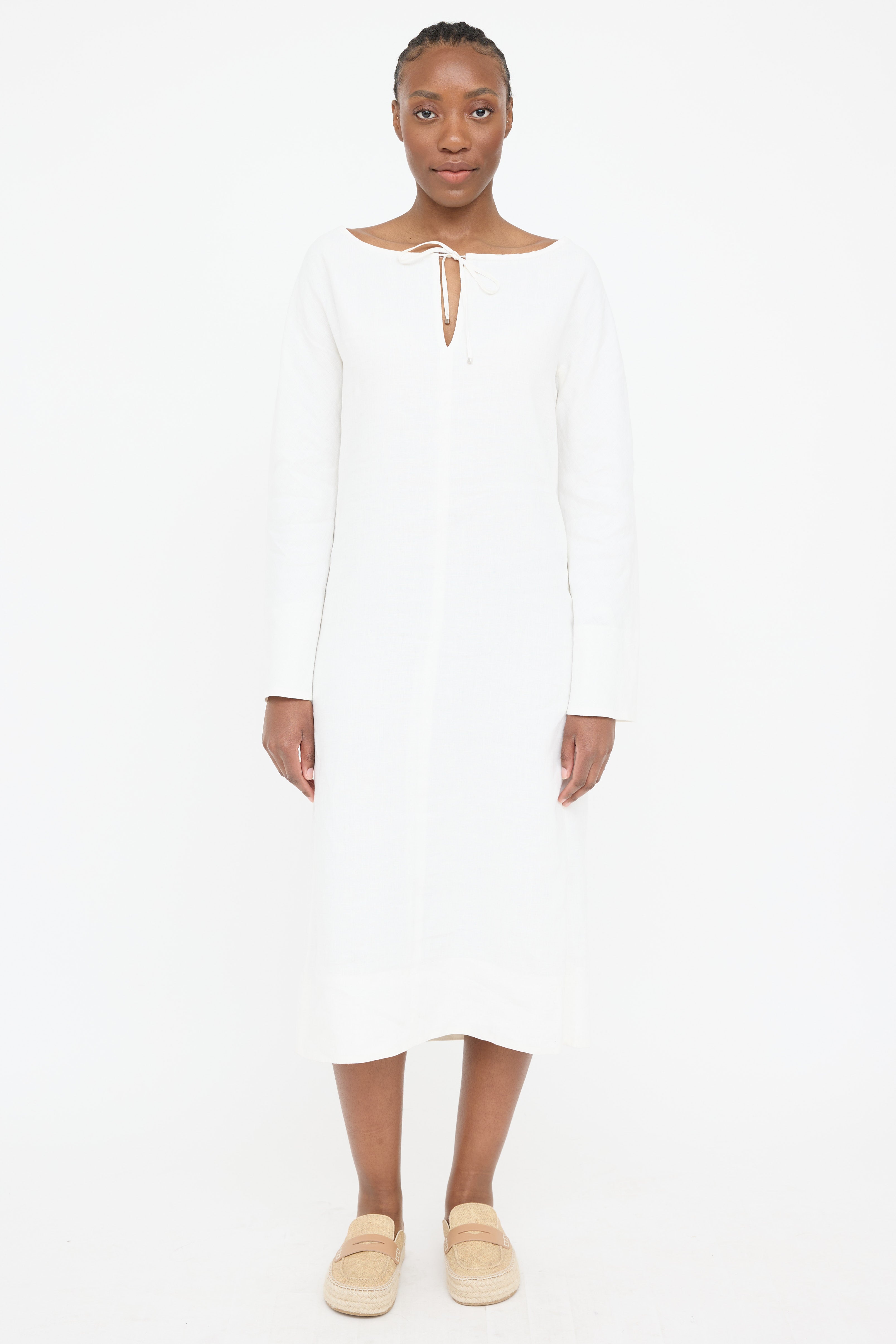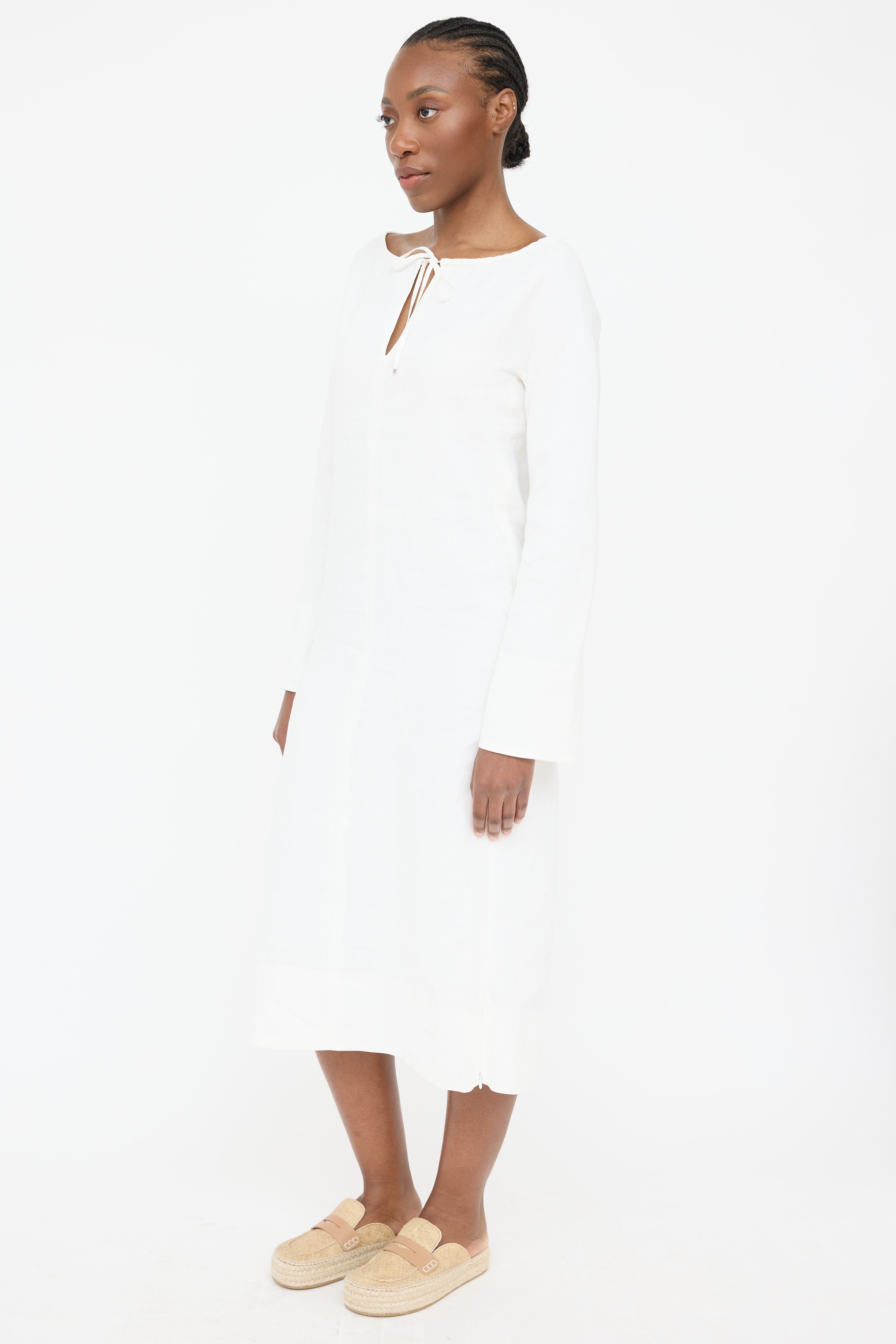 Pre-owned 'S Max Mara white linen dress featuring boat neckline, keyhole with tie up closure, long sleeves and zipper on left side seam. Lined.