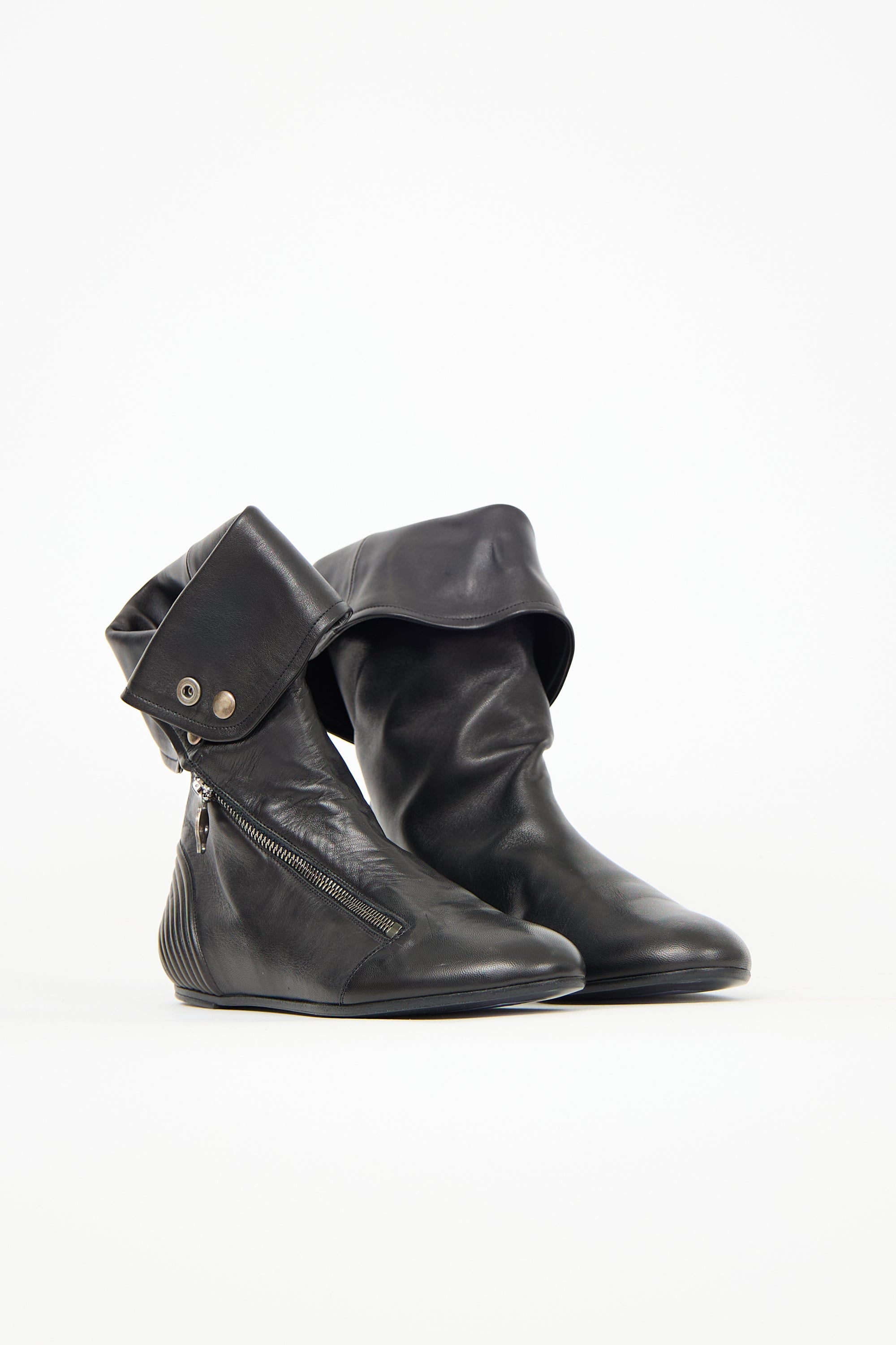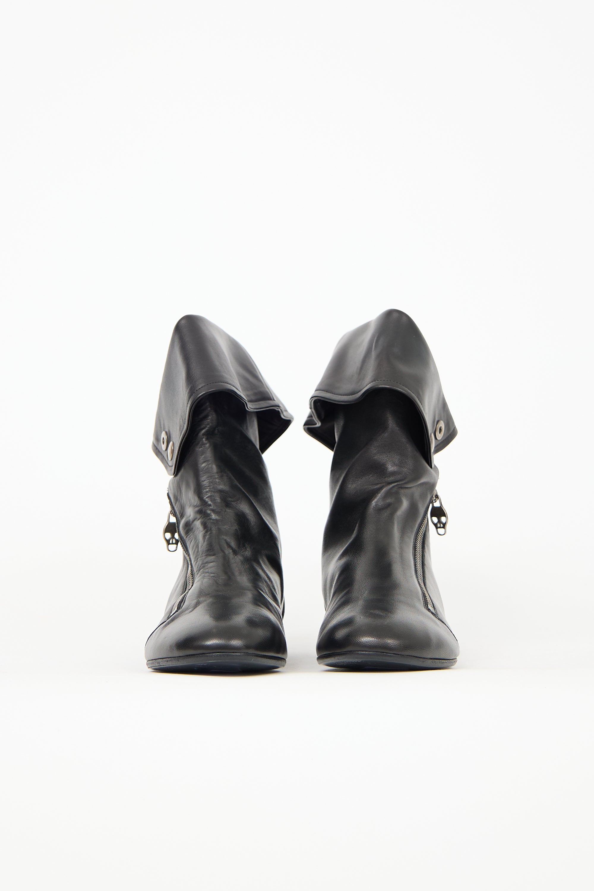 Pre-owned Alexander McQueen black leather Faithful boots featuring rounded toe, side zip and snap button closure, fold over shaft, and flat sole.