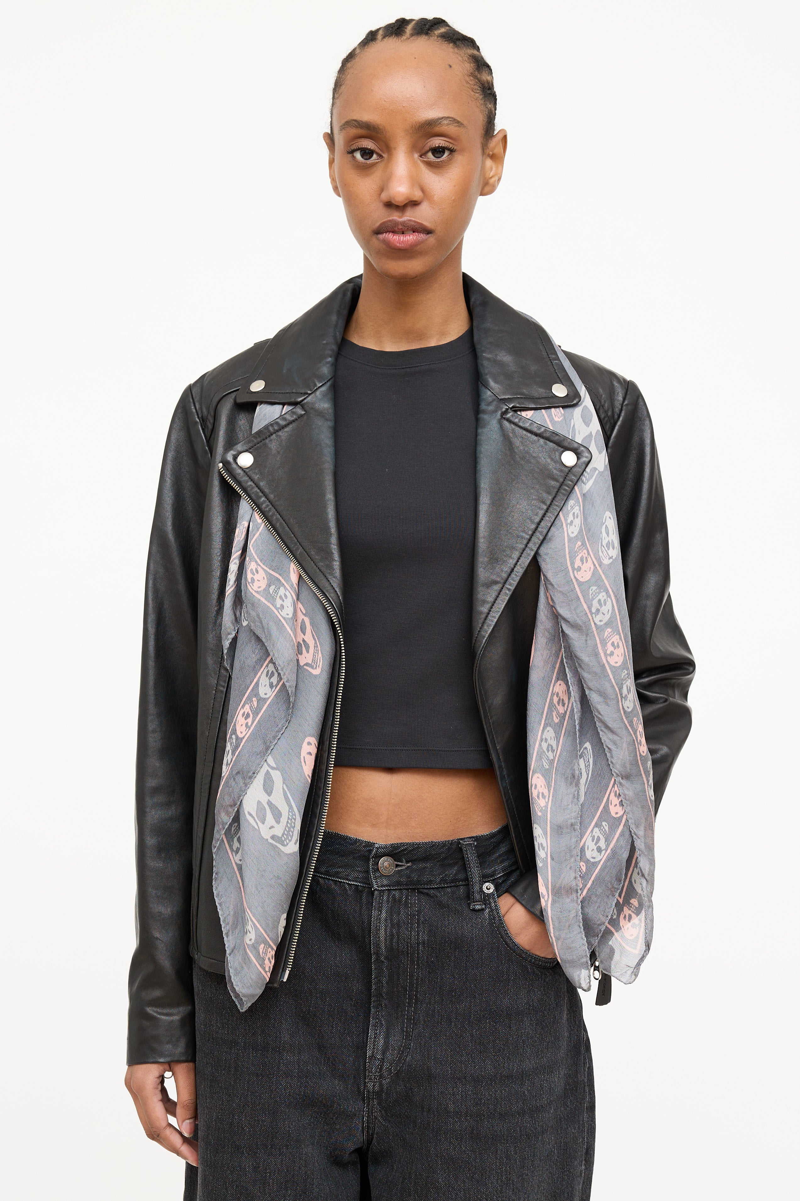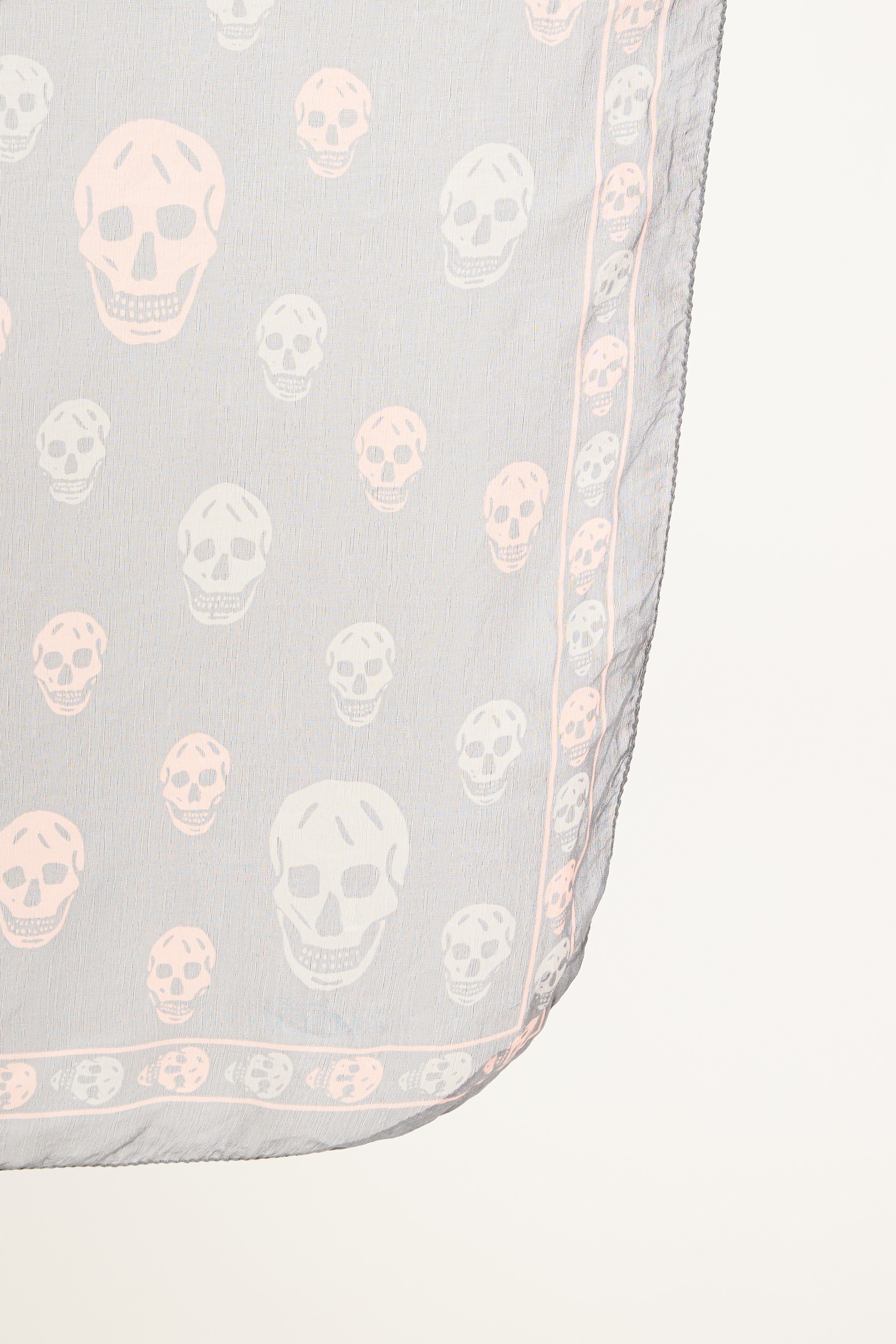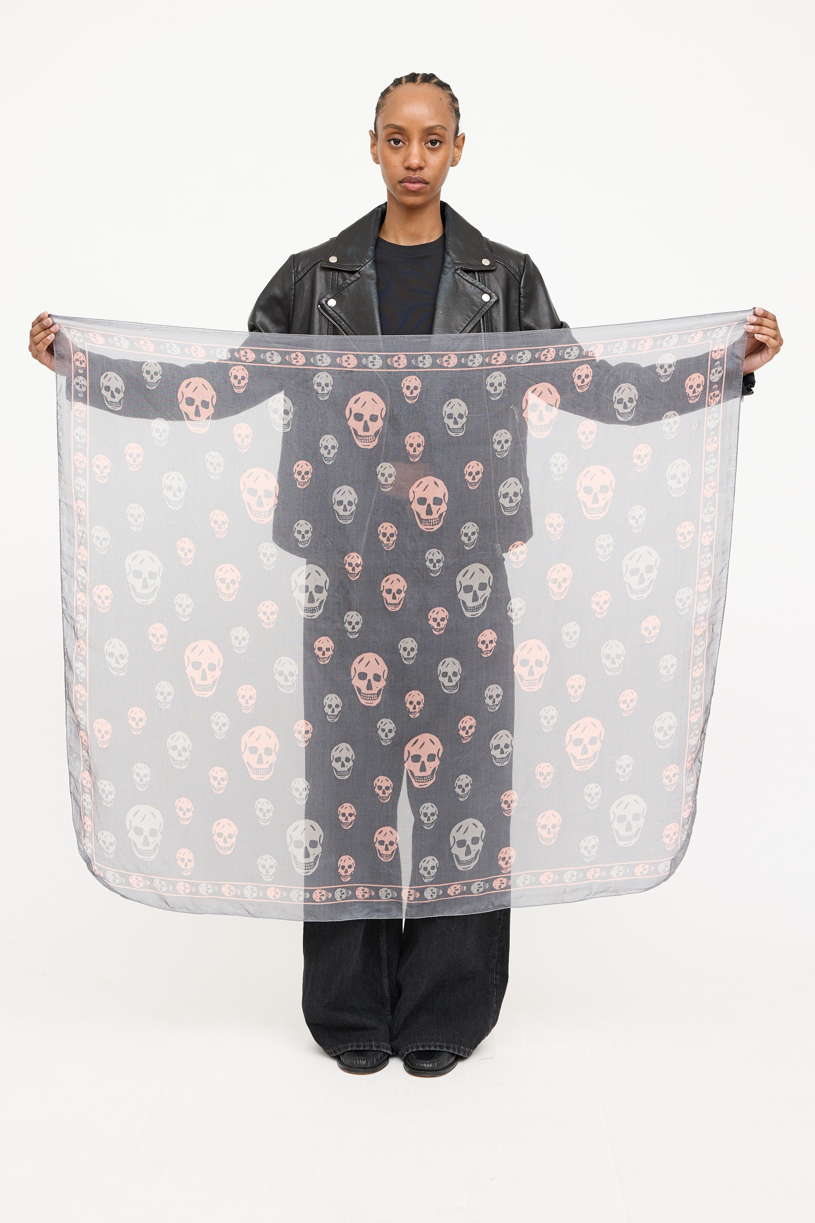 Pre-owned Alexander McQueen grey scarf featuring a tonal and pink skull pattern throughout, woven logo at corner, and hand rolled edges.