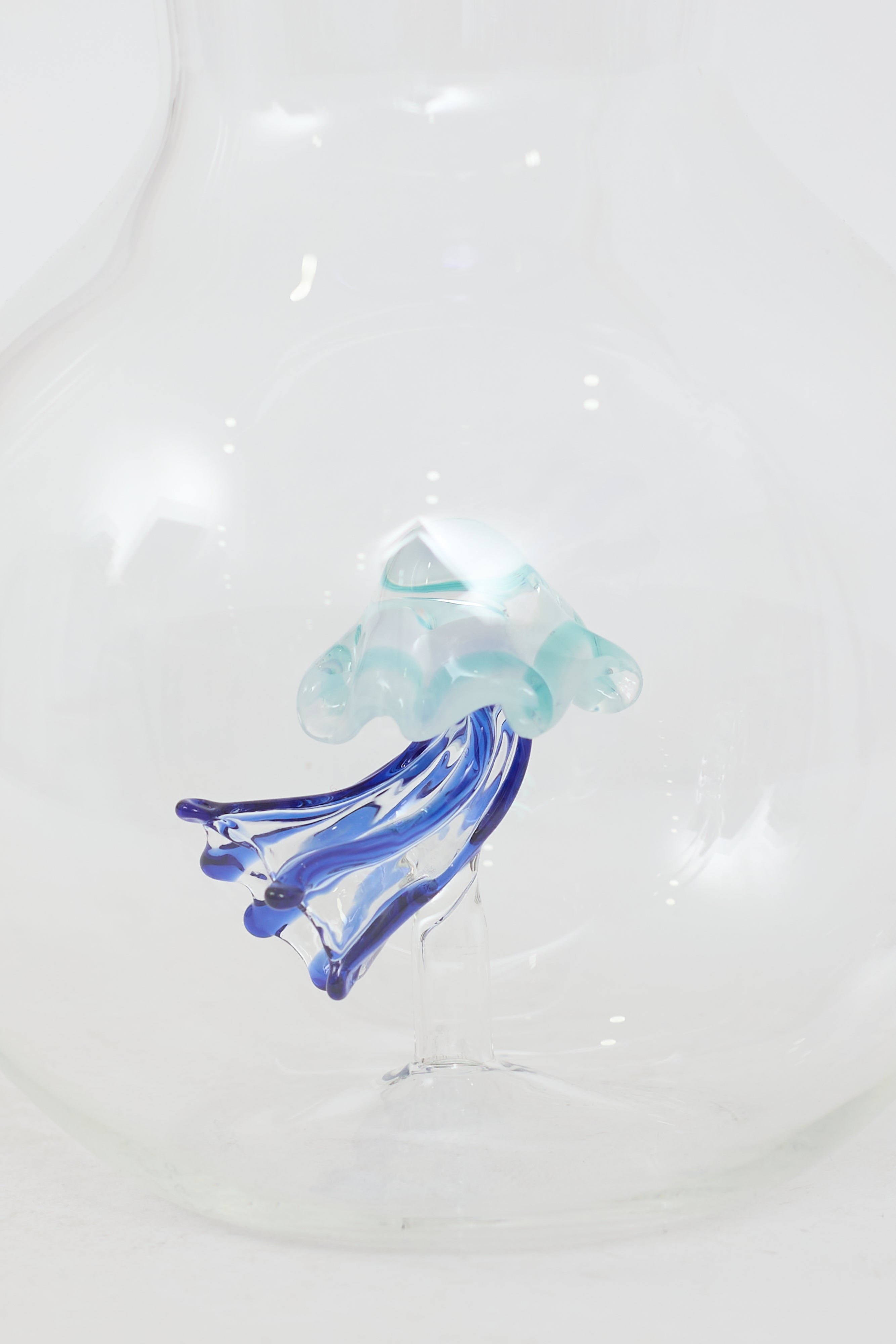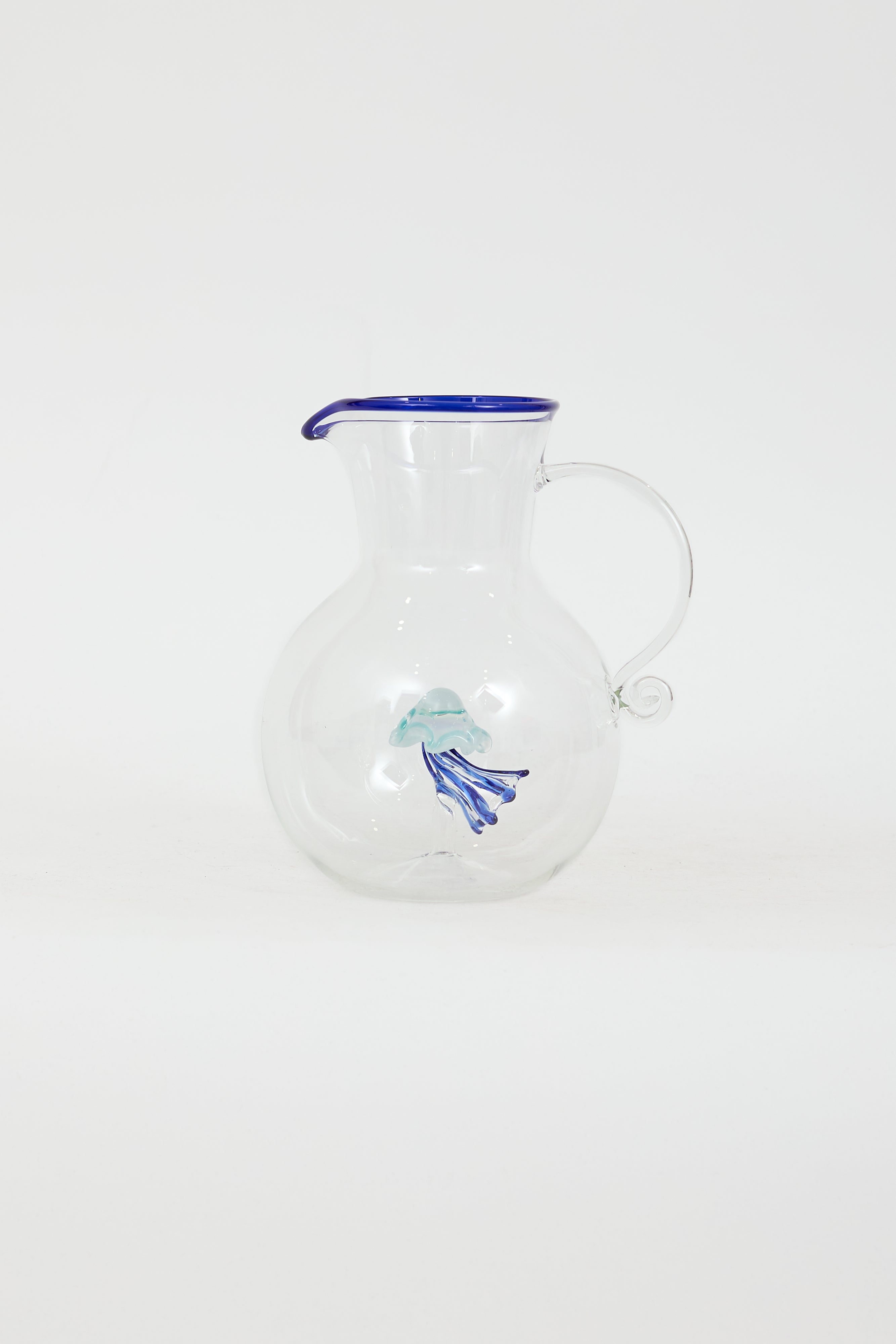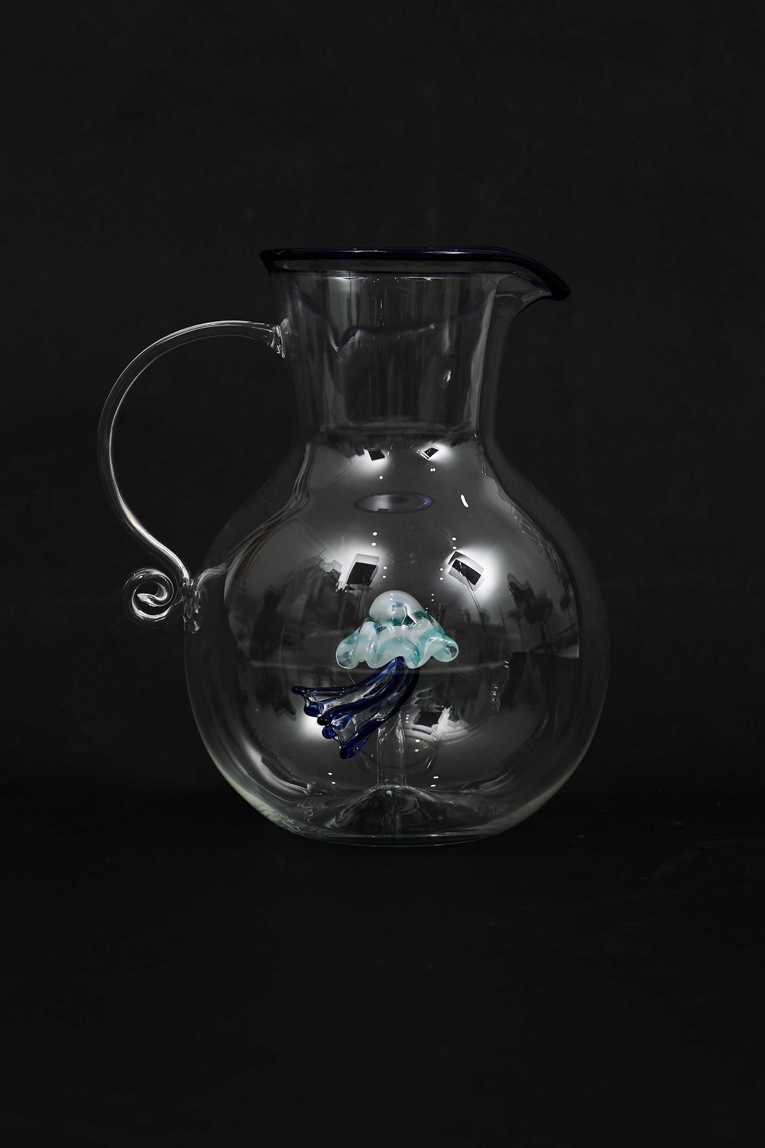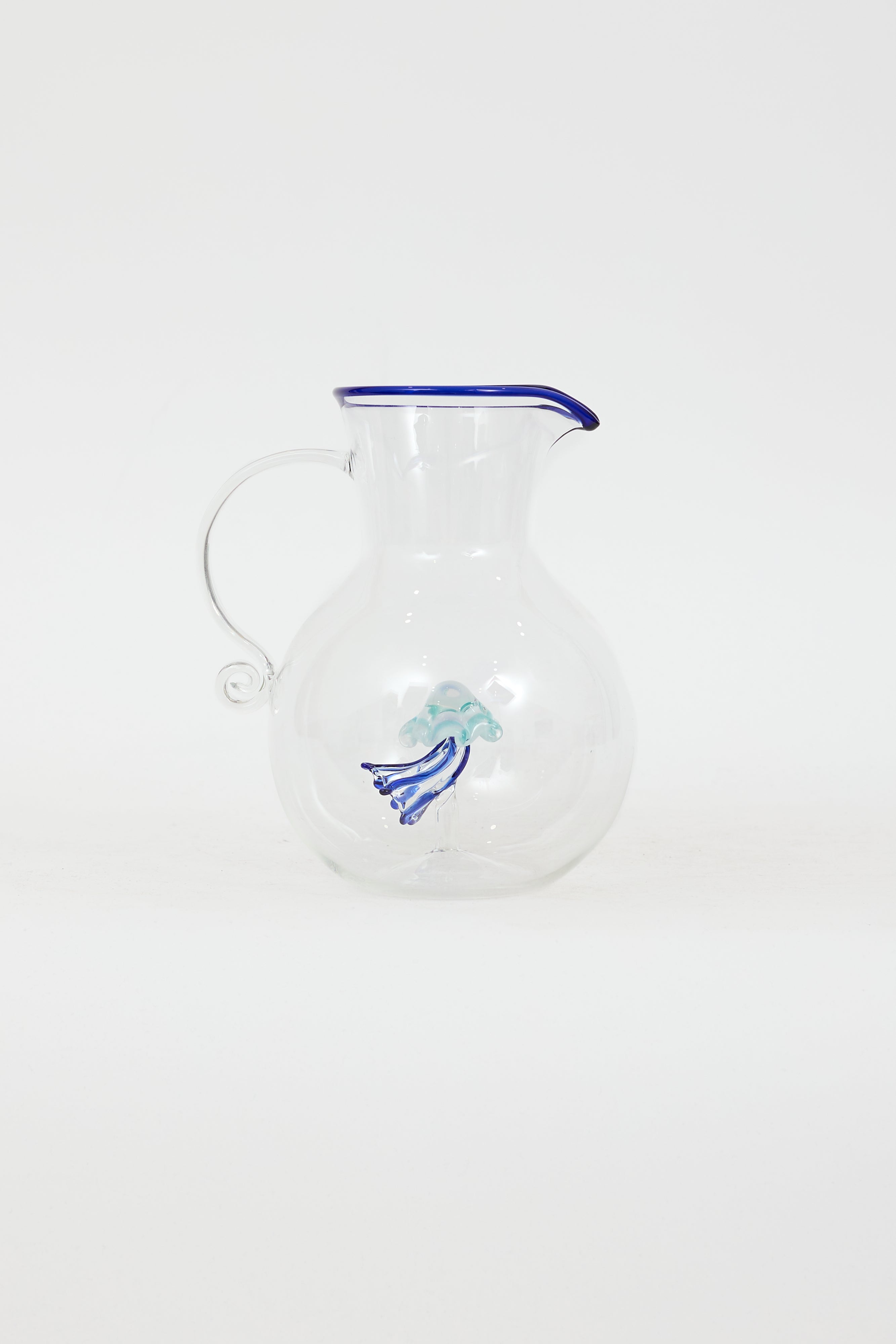 Pre-owned Dior Maison blue carafe jug featuring blue trim, hand blown transparent glass, engraved logo at bottom, and blue jellyfish inside. Comes with original box.