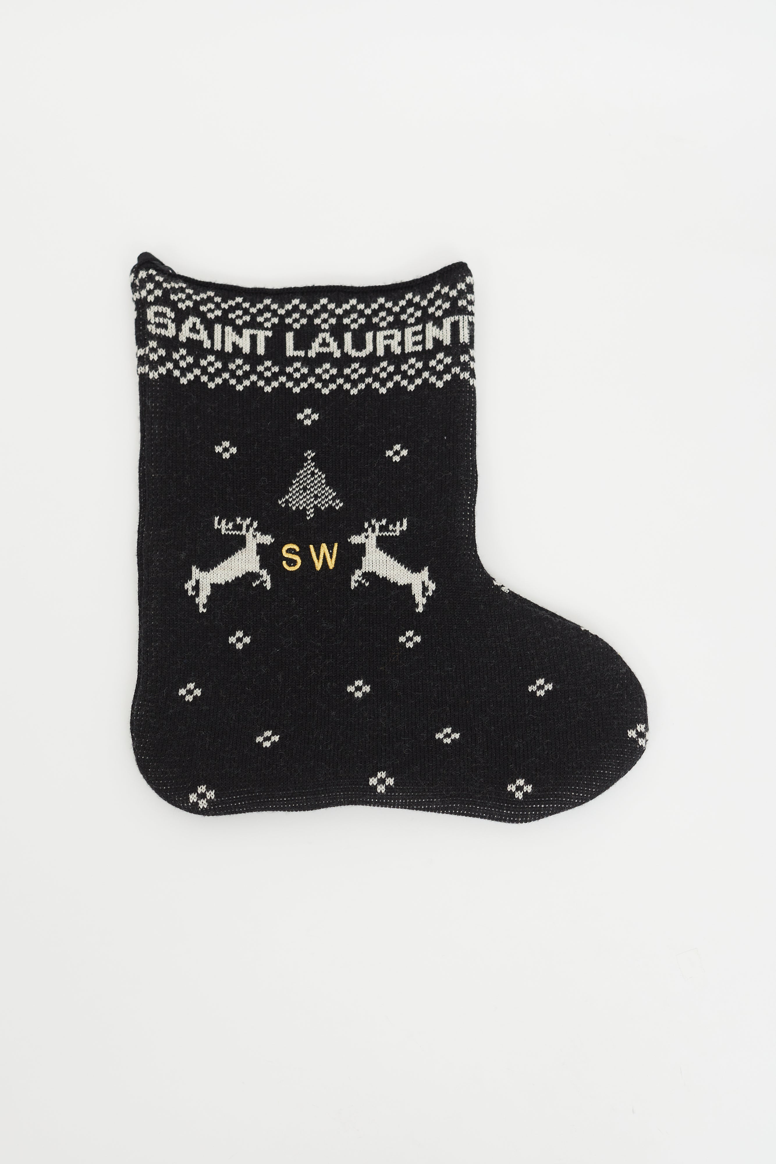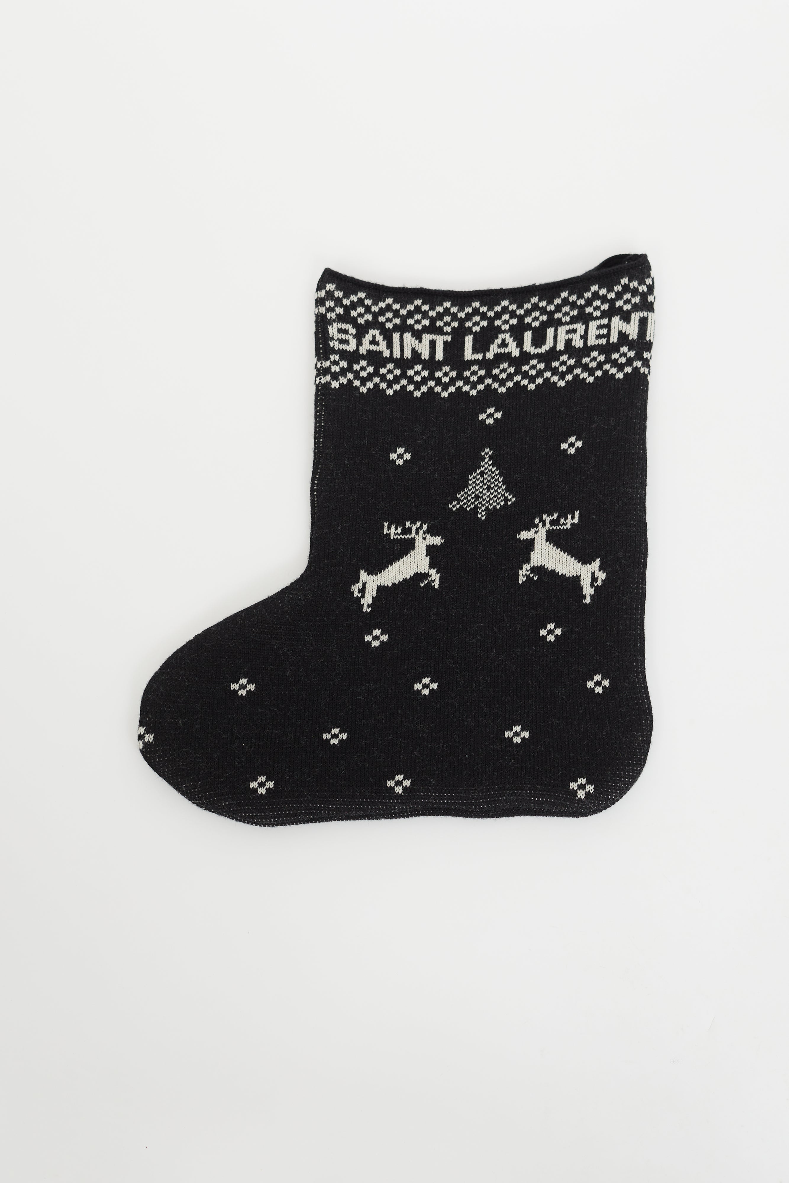Pre-owned Saint Laurent black stocking featuring gold embroidered "SW" anagram and white deer and logo intarsia throughout.