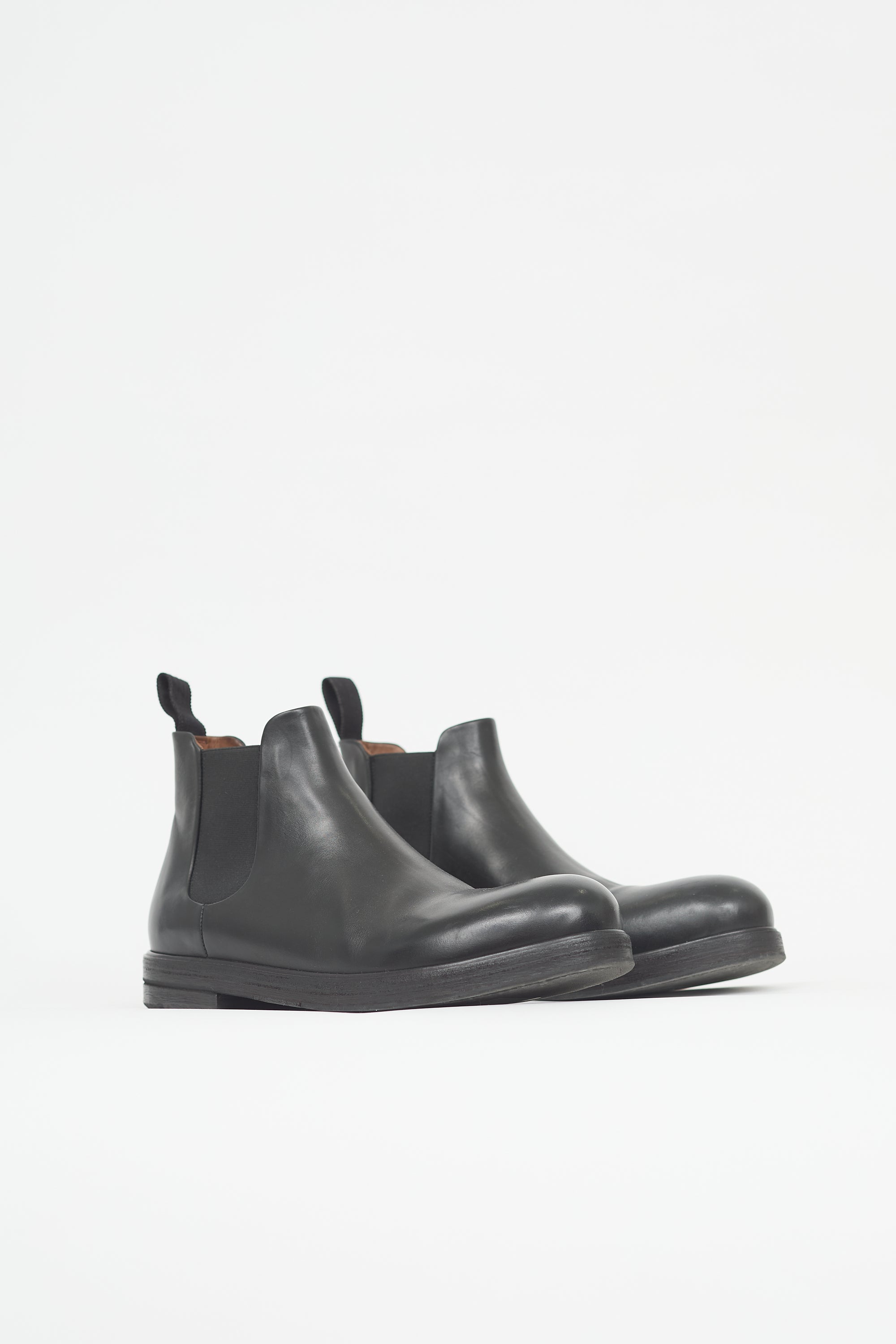 Pre-owned Marsèll black leather Chelsea ankle boots featuring rounded toe, elastic side panels, pull tab and counter, stacked sole and heel, and rubber outsole.