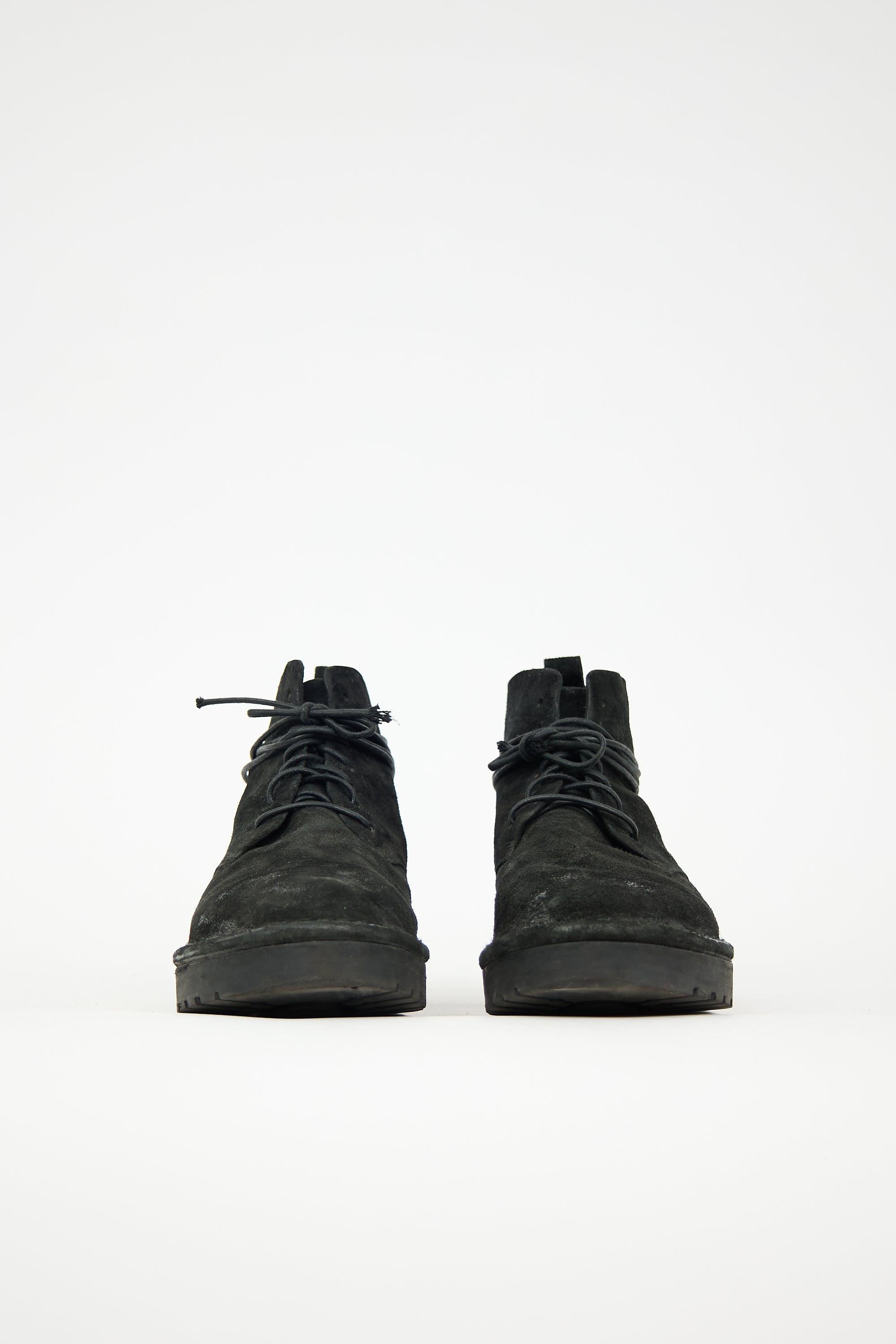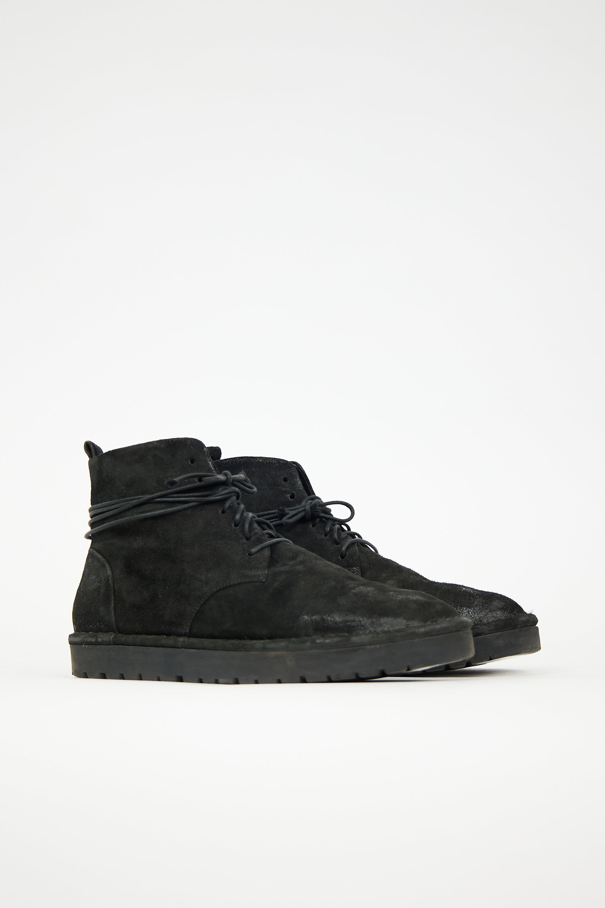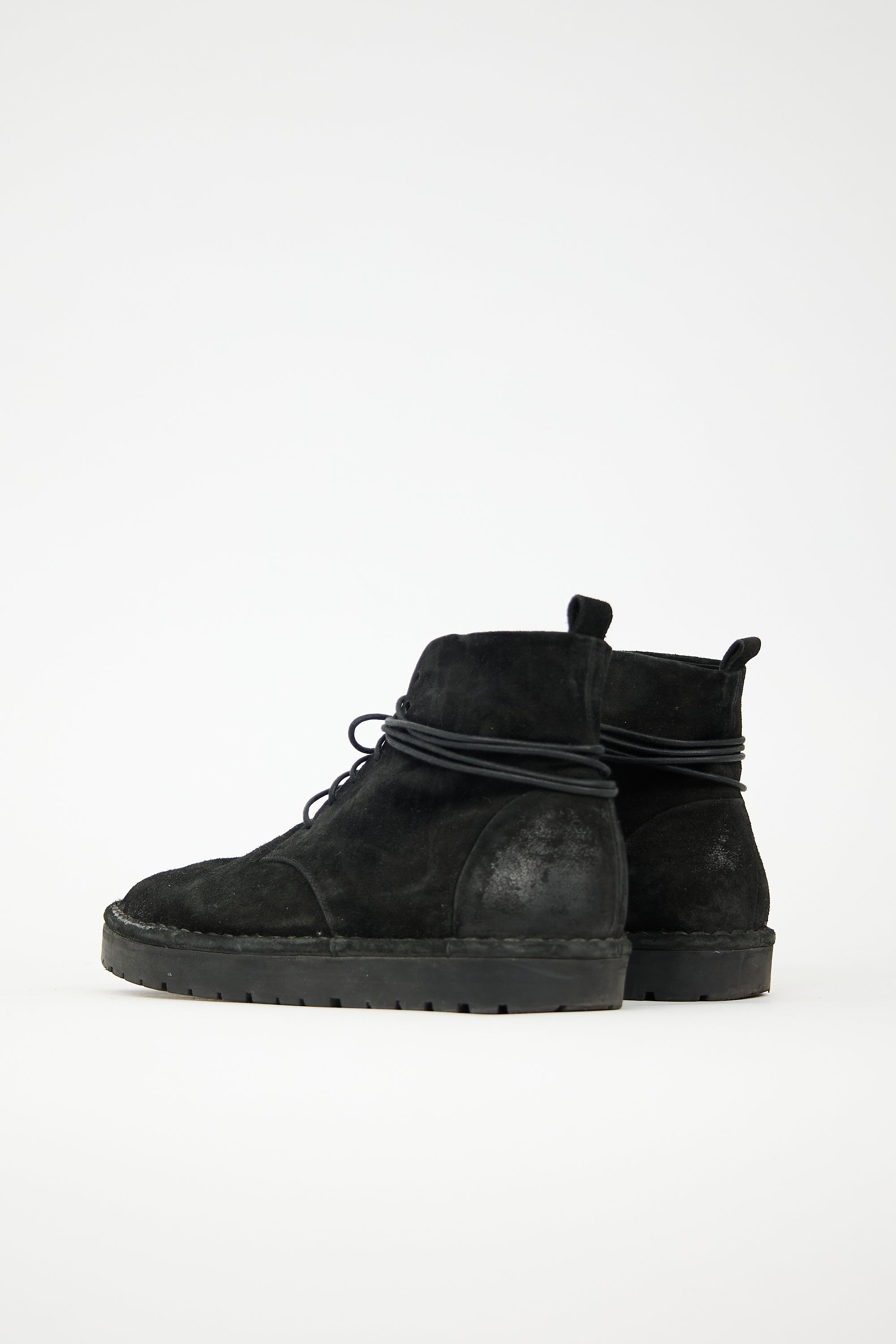 Pre-owned Marsèll black suede Sancrispa Alta boots featuring rounded toe, intentional distressing, lace up front, and lug sole.