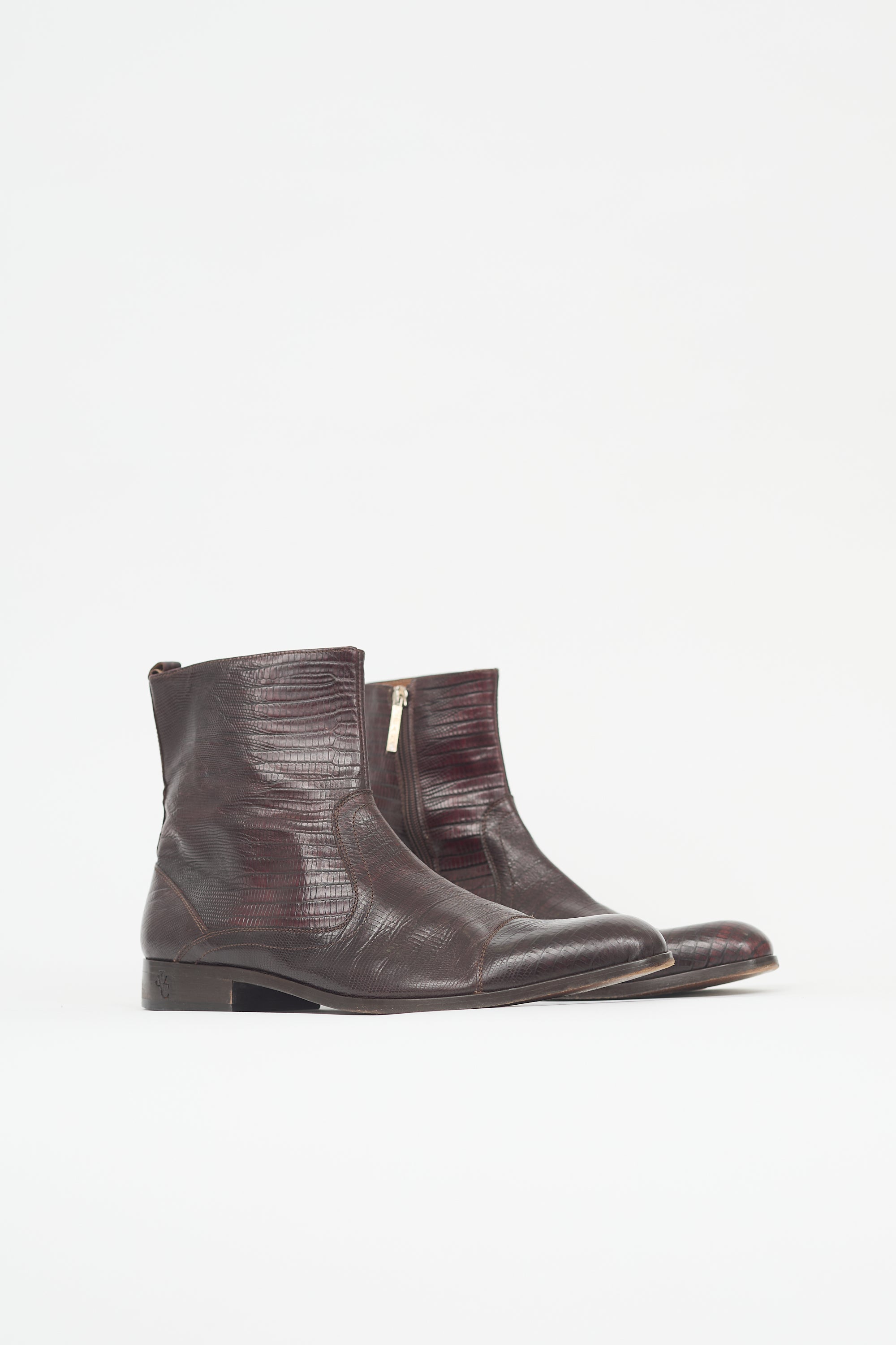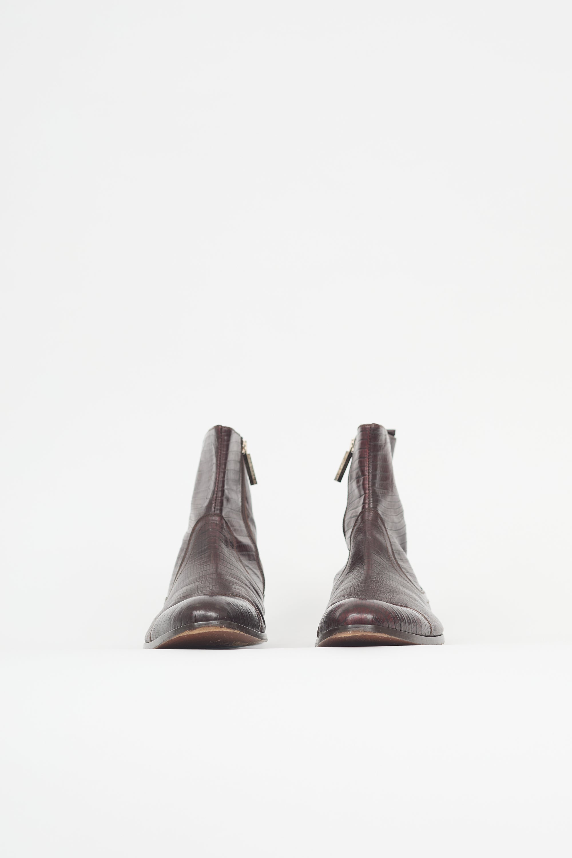 Pre-owned Versace Jeans Couture burgundy leather boots featuring almond toe, embossed upper, inner side zip closure, and stacked heel with debossed logo.