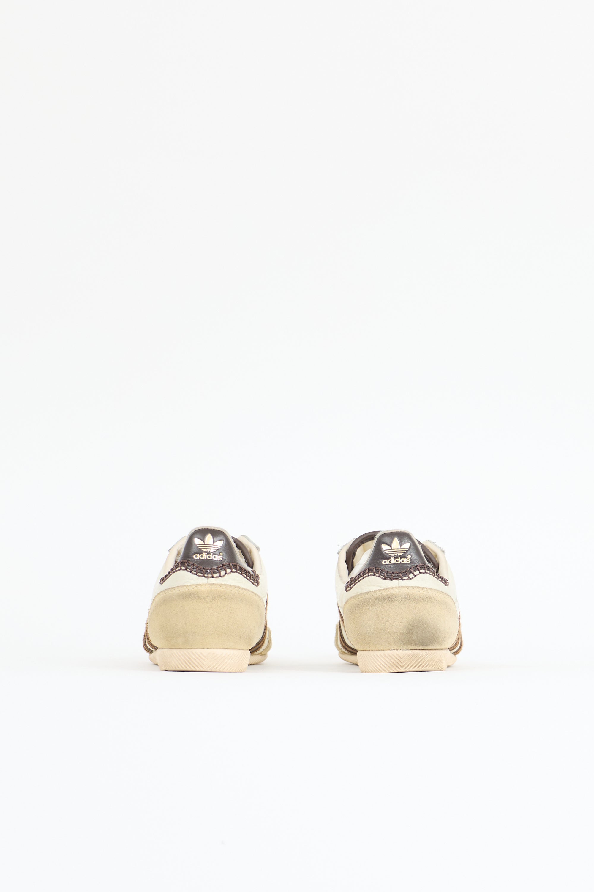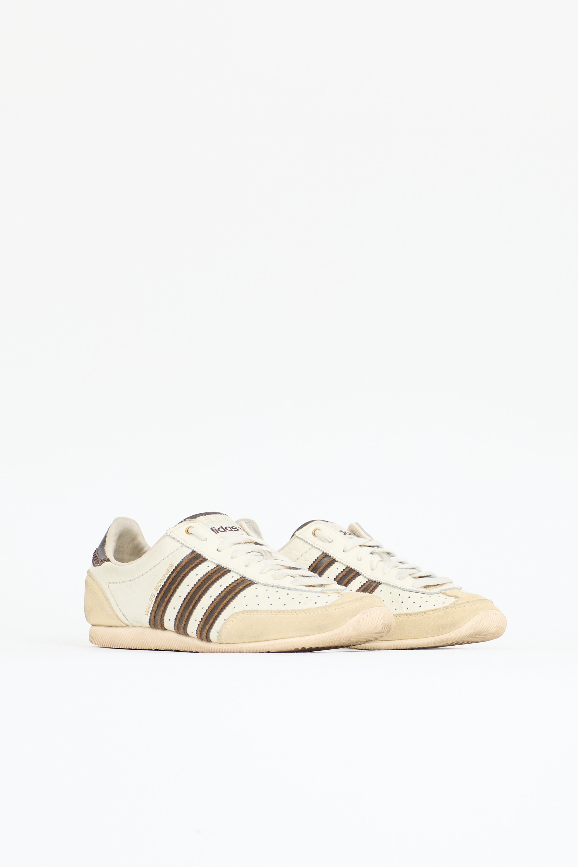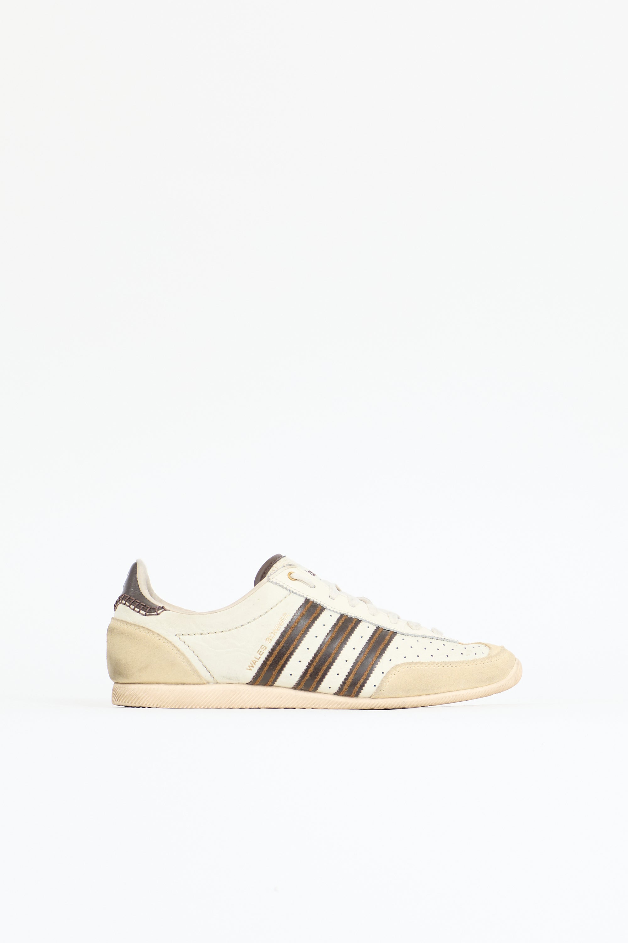 Pre-owned Wales Bonner x Adidas cream and brown Japan sneaker featuring a rounded toe, suede toe and heel cap, perforated front, lace up front, logo tag at knit tongue, signature stitched three stripes,gold tone stamp logo at outer sides and counter, and rubber sole.