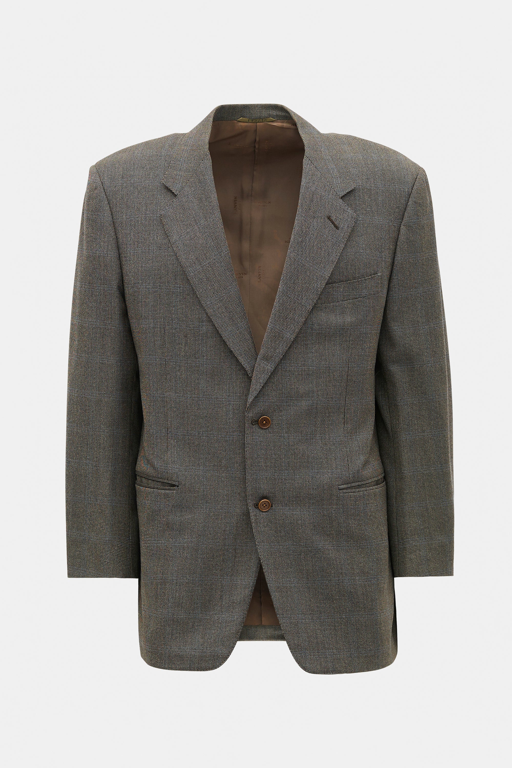 Pre-owned Lanvin brown wool tweed blazer featuring notched lapel, button up front, three front pockets, four interior pockets, padded shoulders, and buttoned cuffs. Lined.