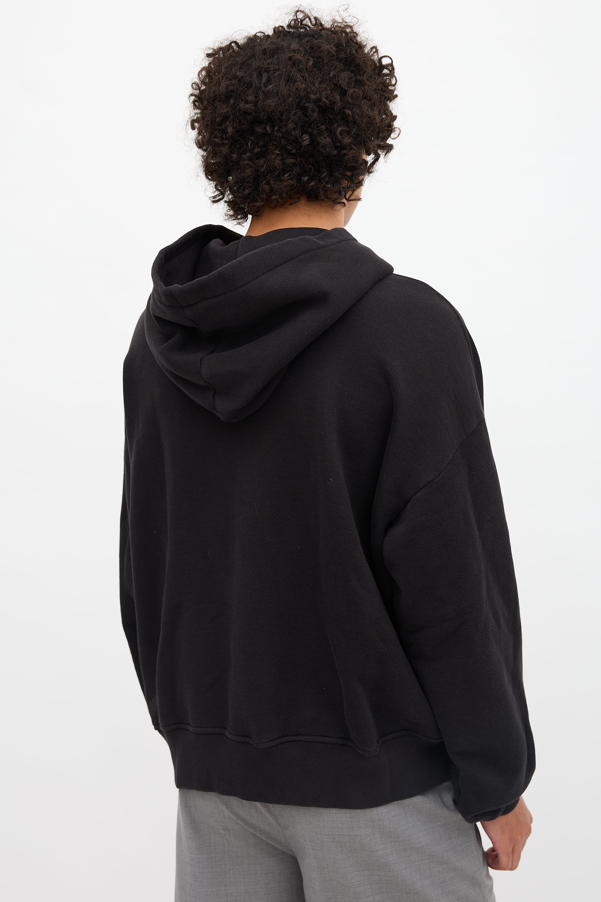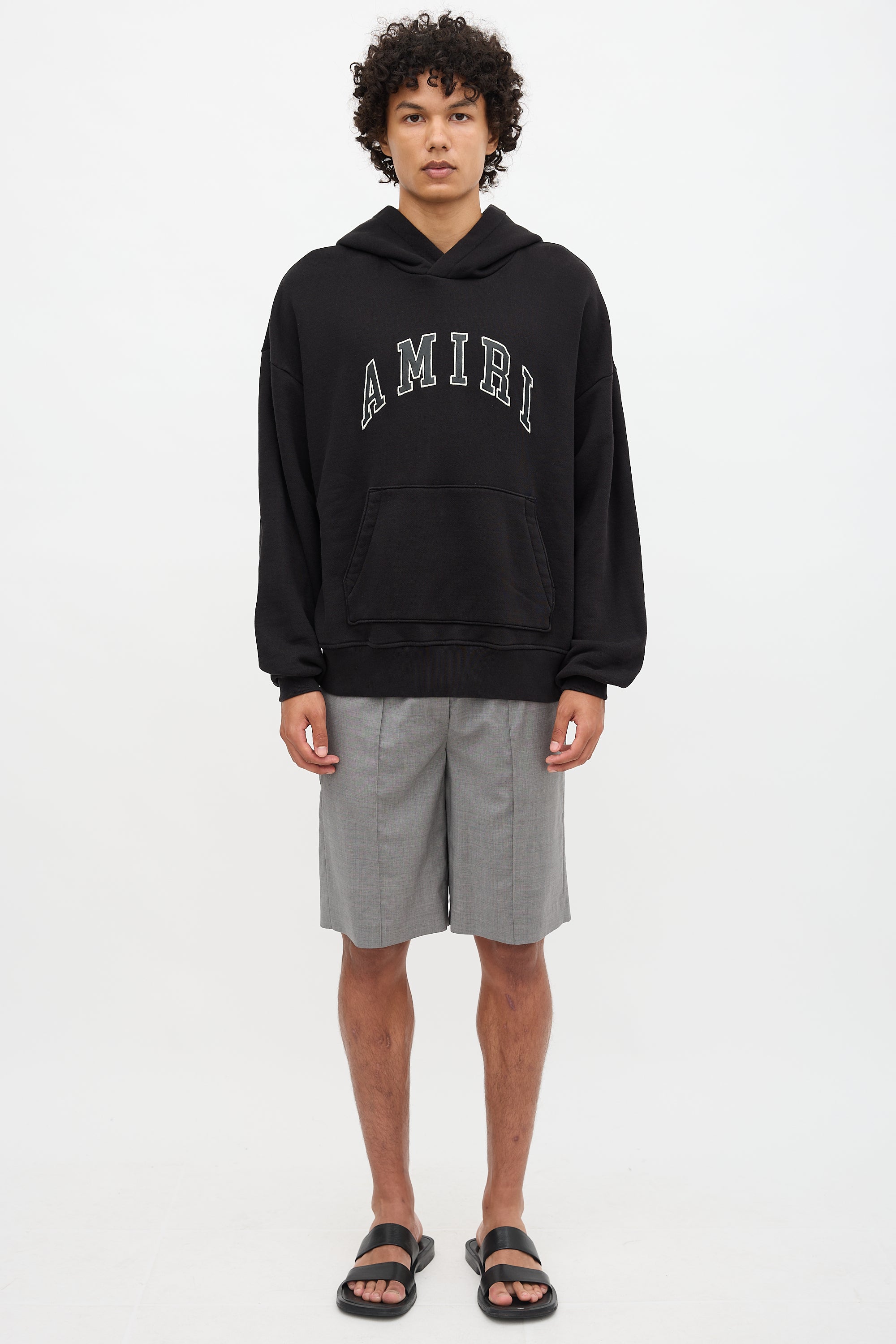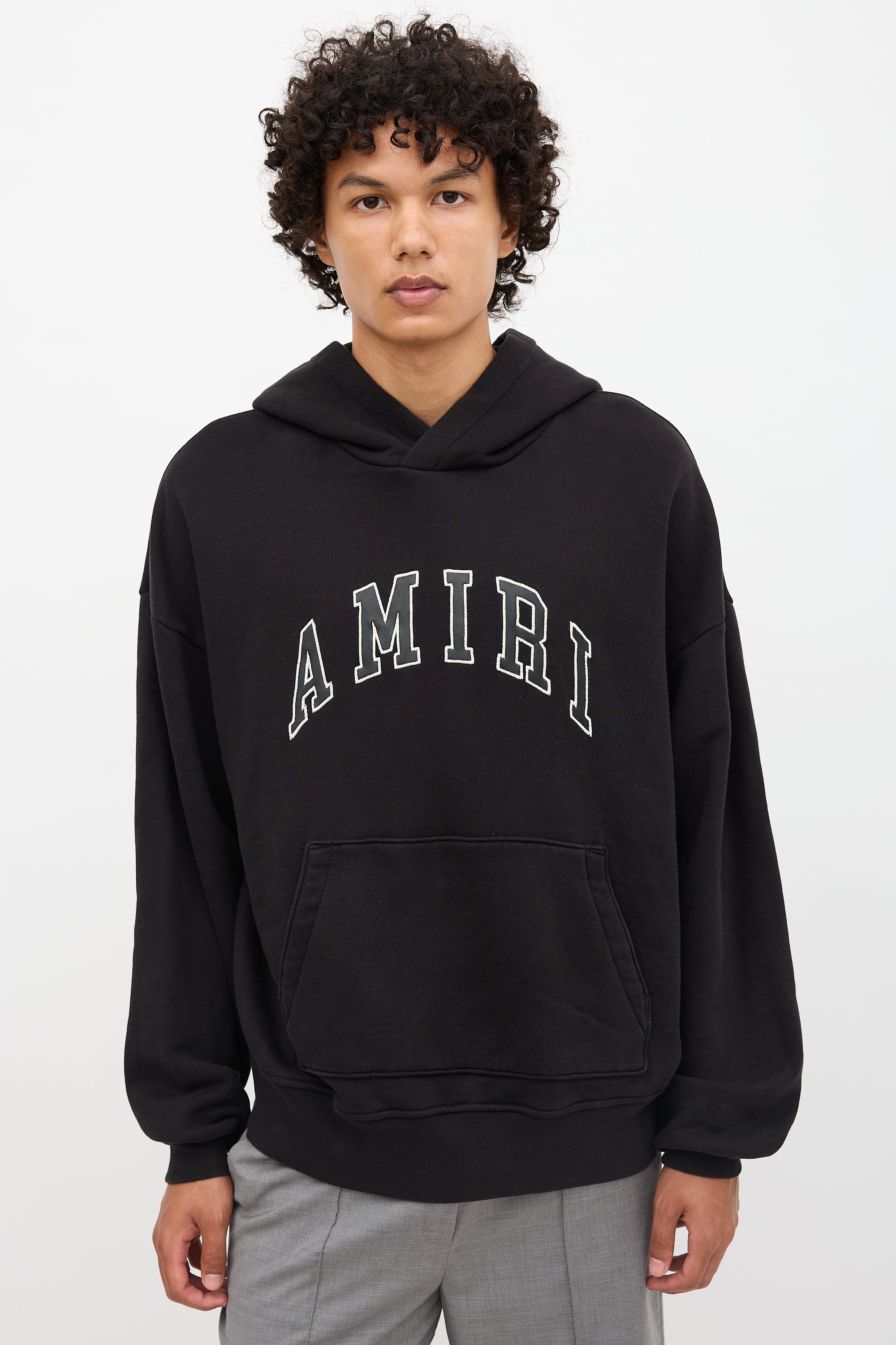 Pre-owned Amiri black hoodie featuring embroidered leather patch logo across chest, front kangaroo pocket, and ribbed hem and cuffs.