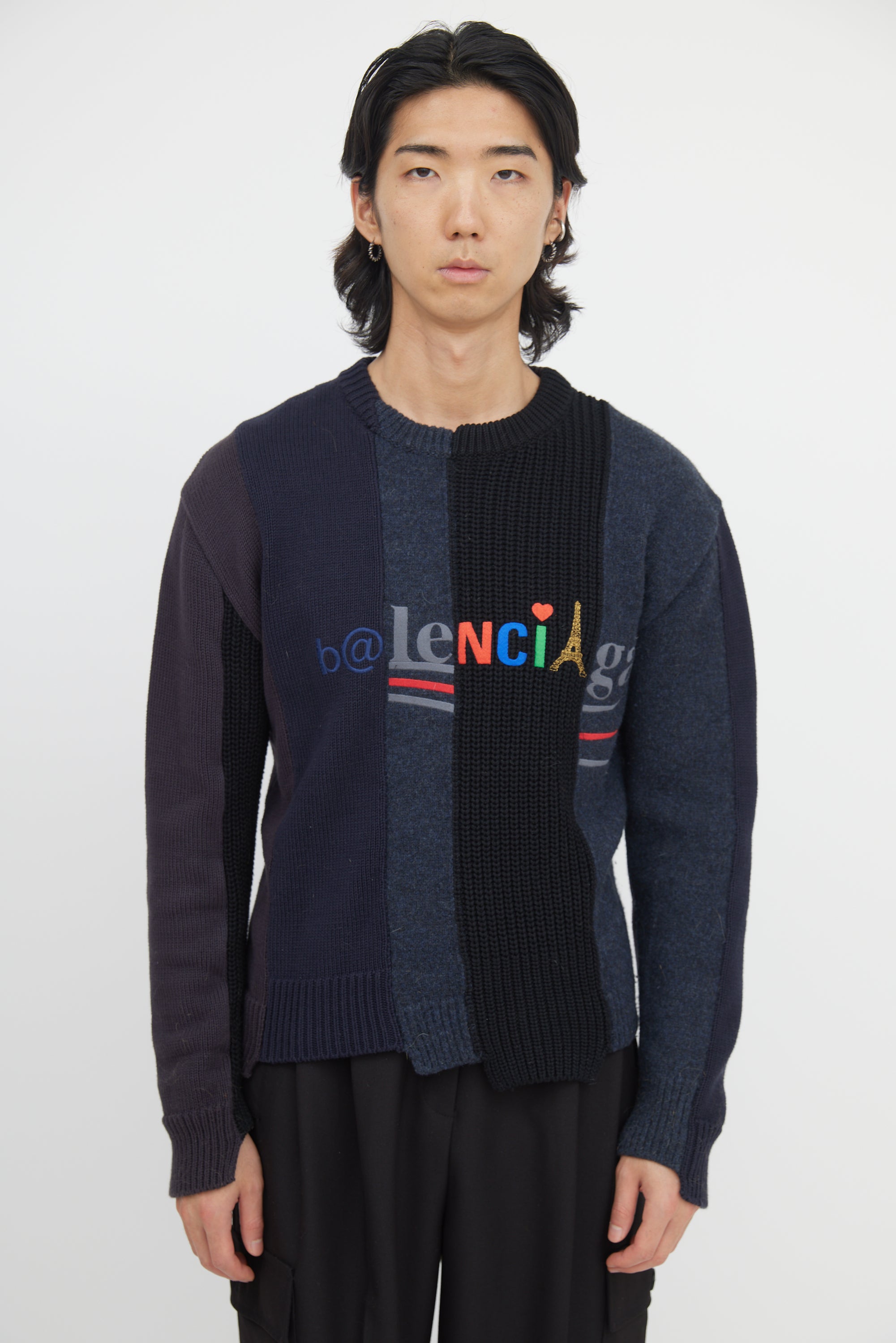 Pre-owned Balenciaga 2020 black and navy patchwork sweater featuring crewneck, cut up panel design, mixed embroidered front logo, and uneven hem and cuffs.