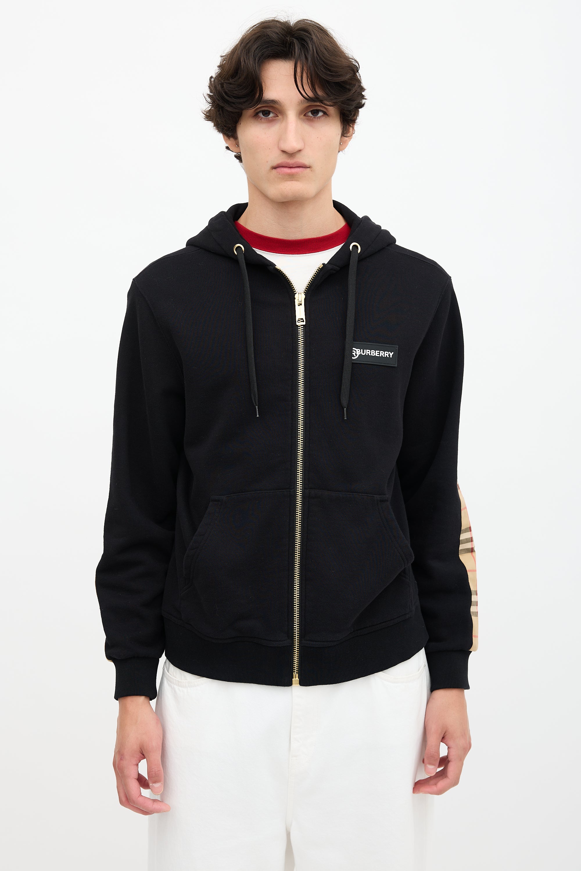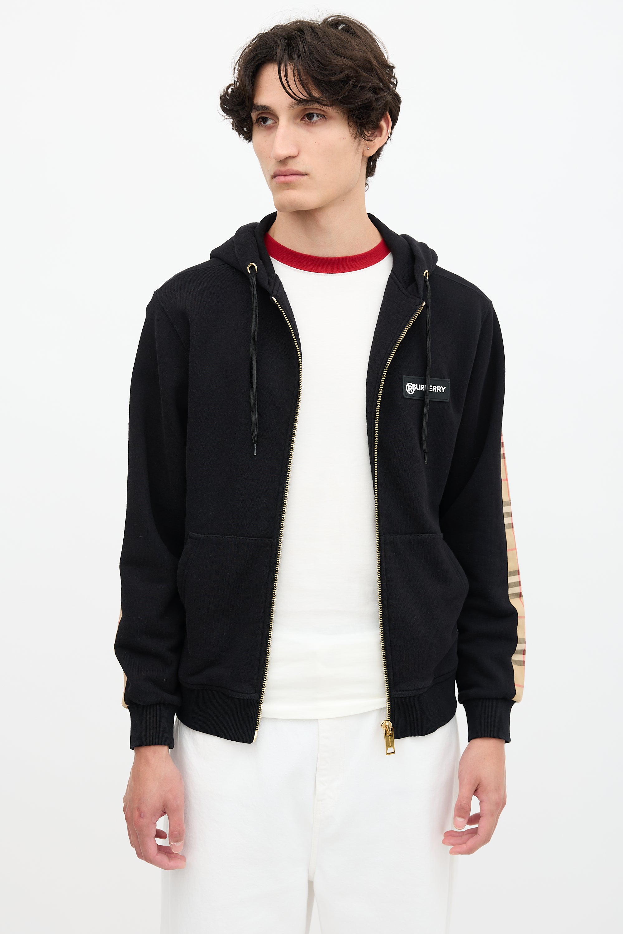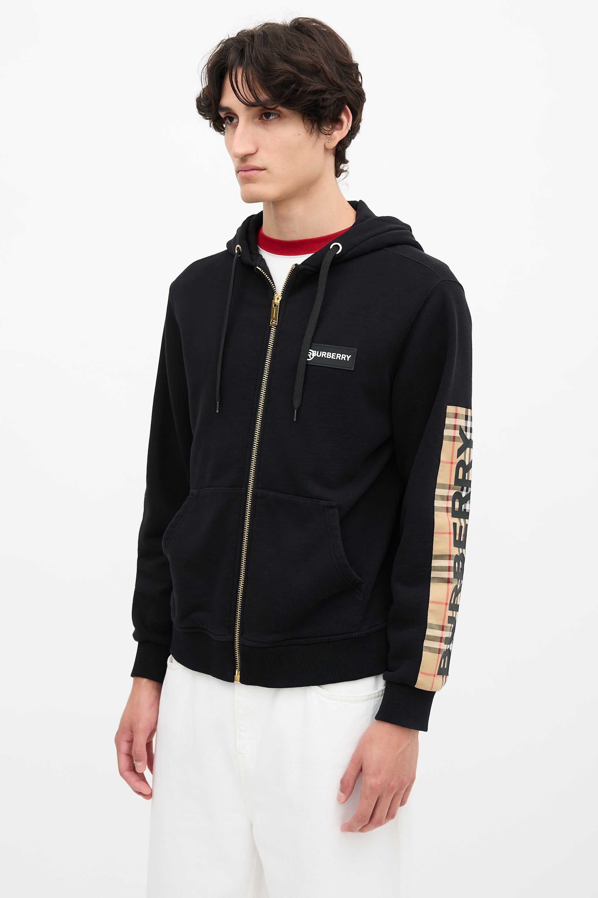 Pre-owned Burberry black hoodie featuring drawstring hood, zip up front, rubber logo tab at left chest, brown signature check panels with logo along sleeves, and ribbed hem and cuffs.