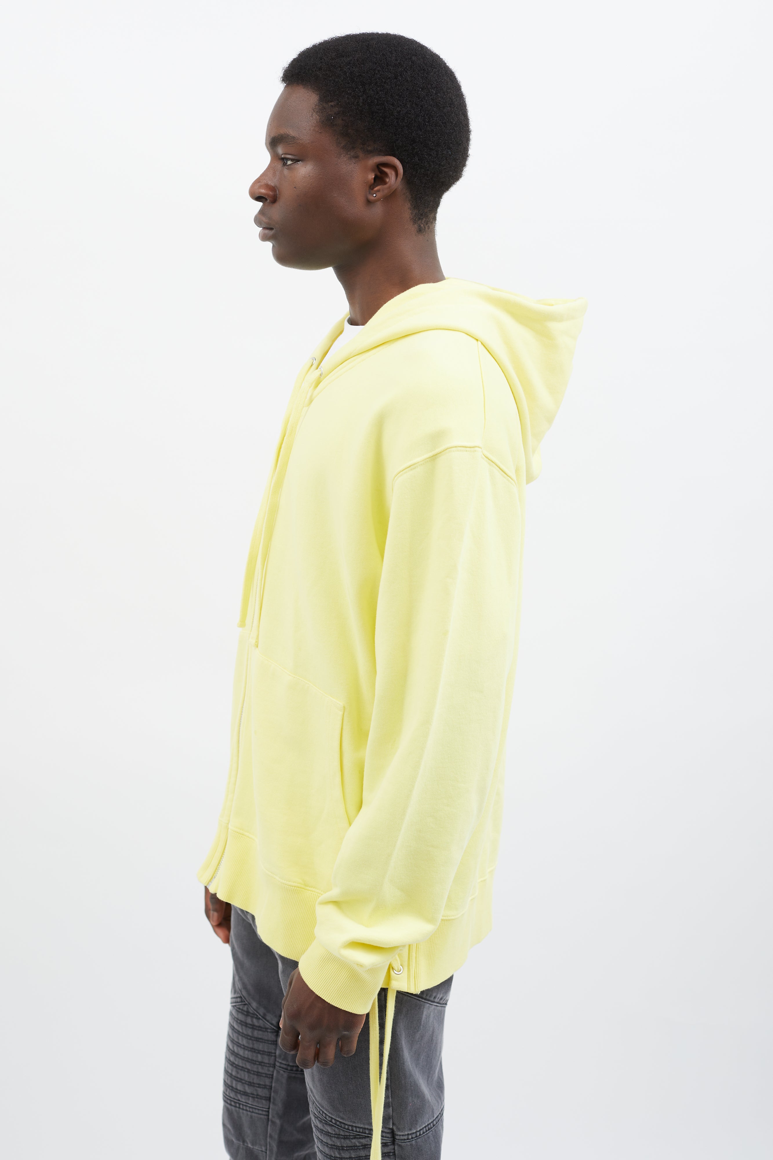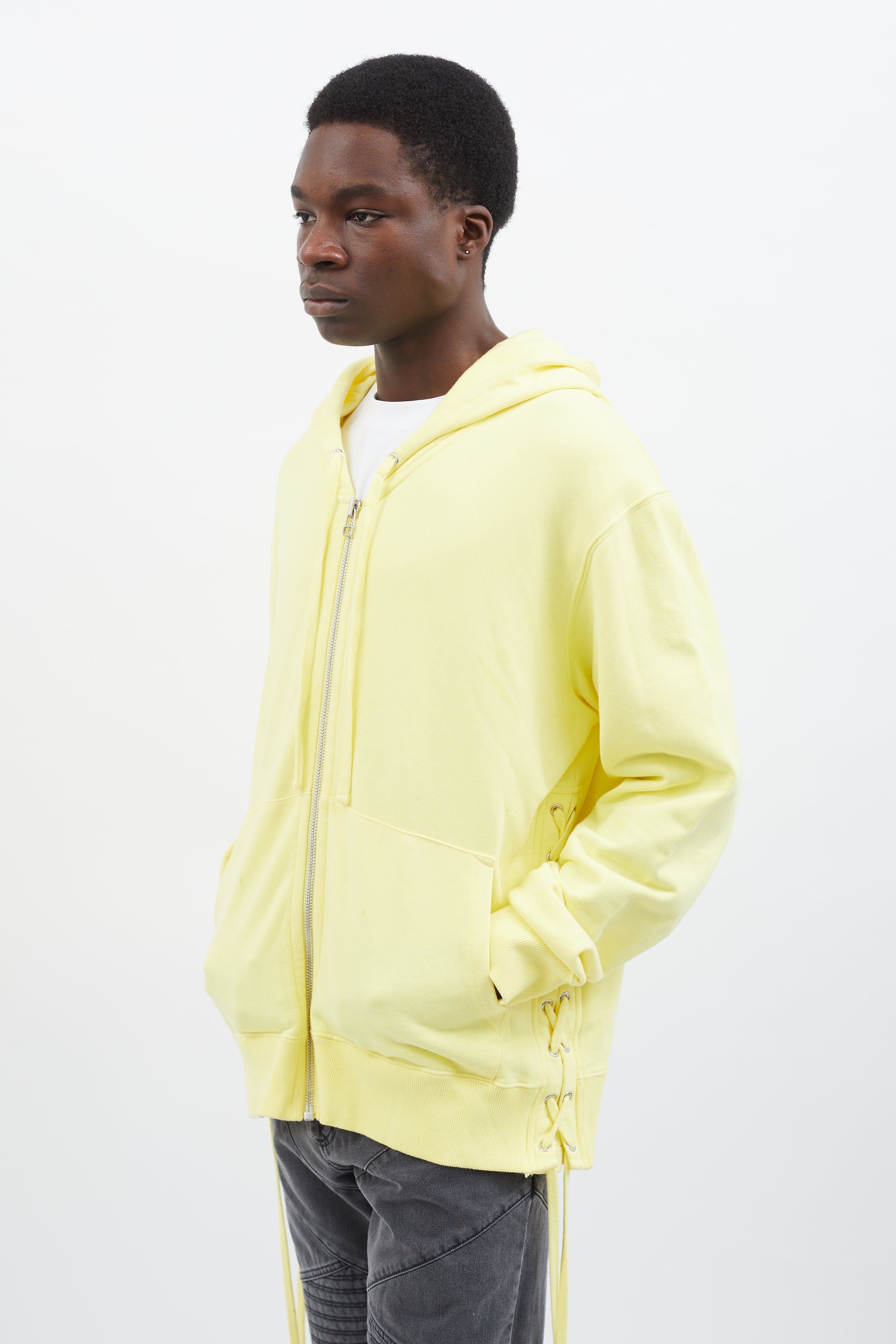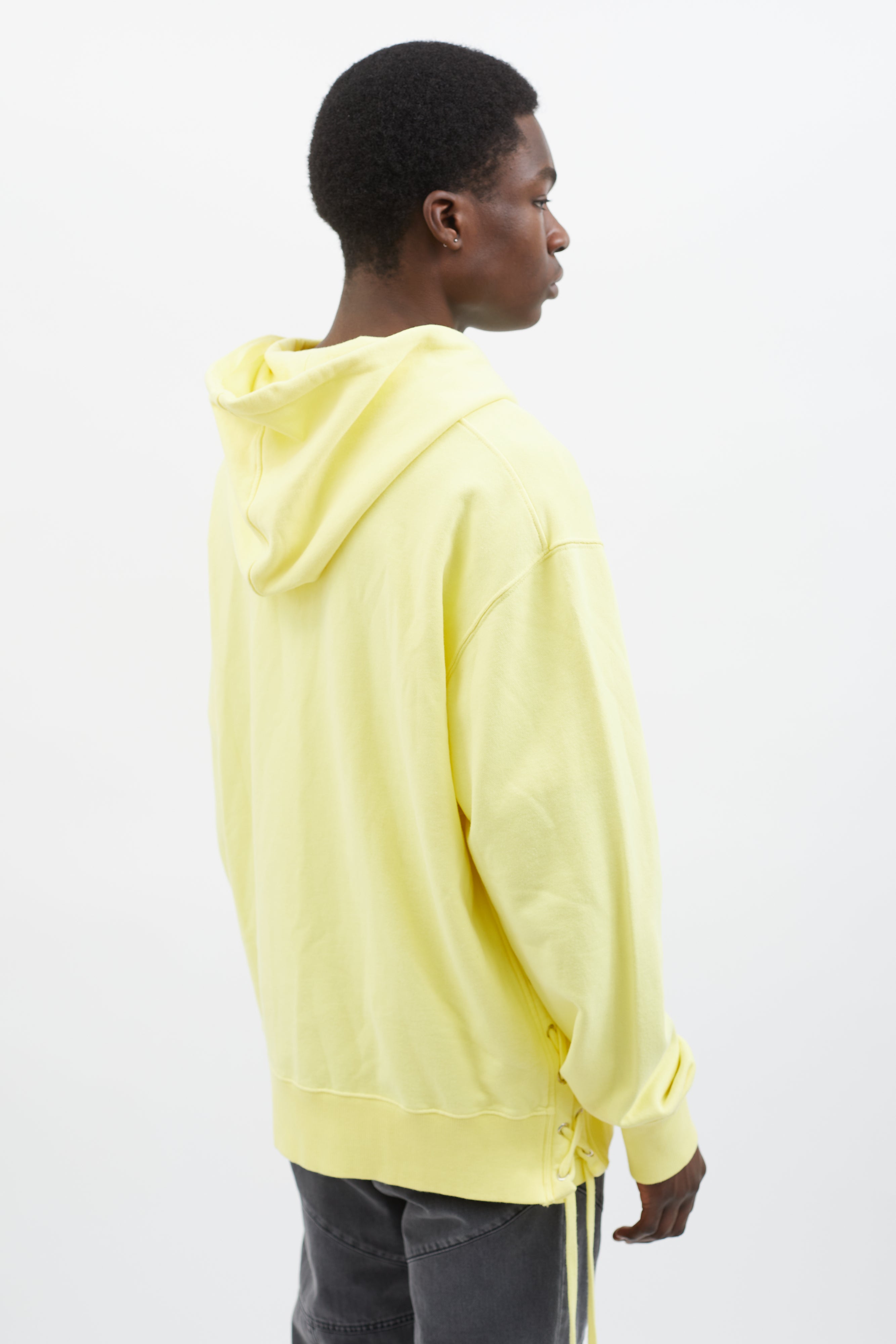 Pre-owned Faith Connexion hoodie in yellow featuring attached hood with drawstring fastener, silver-tone hardware, zipper closure at front, two pockets styling, ribbed cuff and hem, and lace-up details at back.