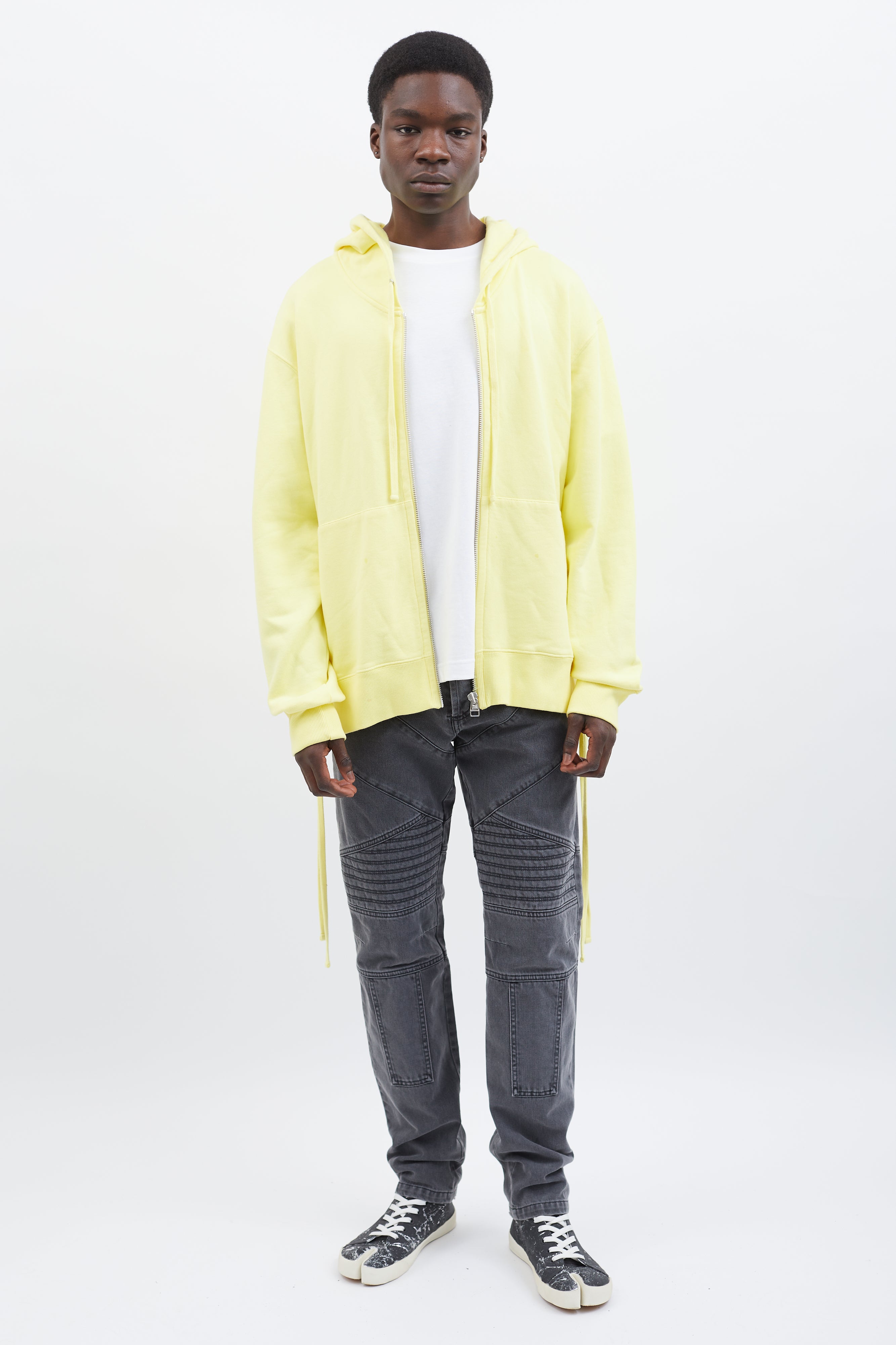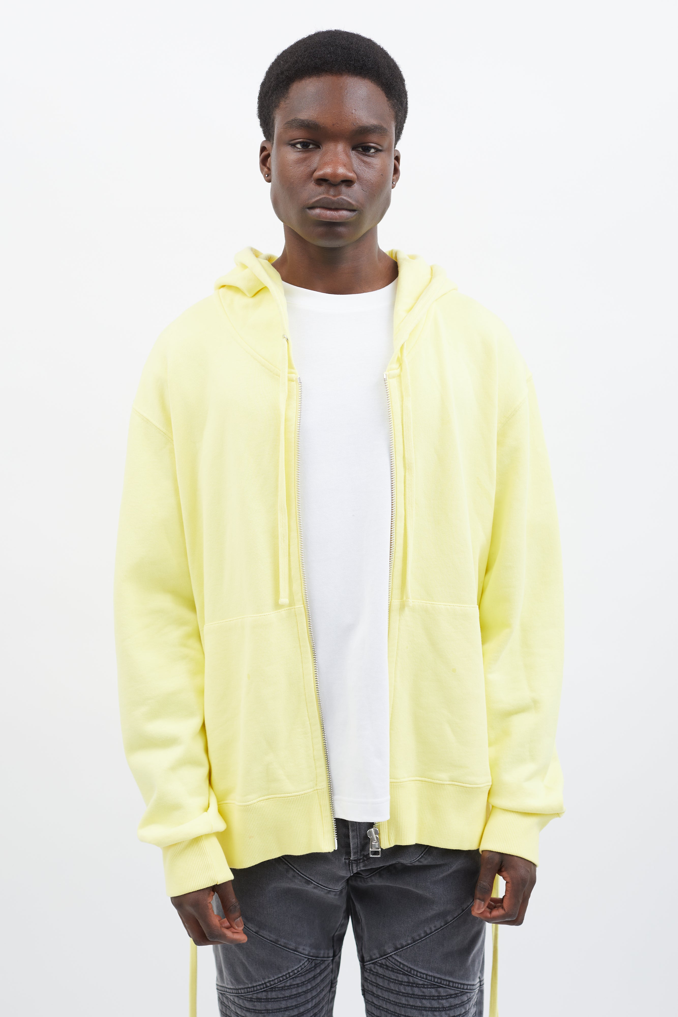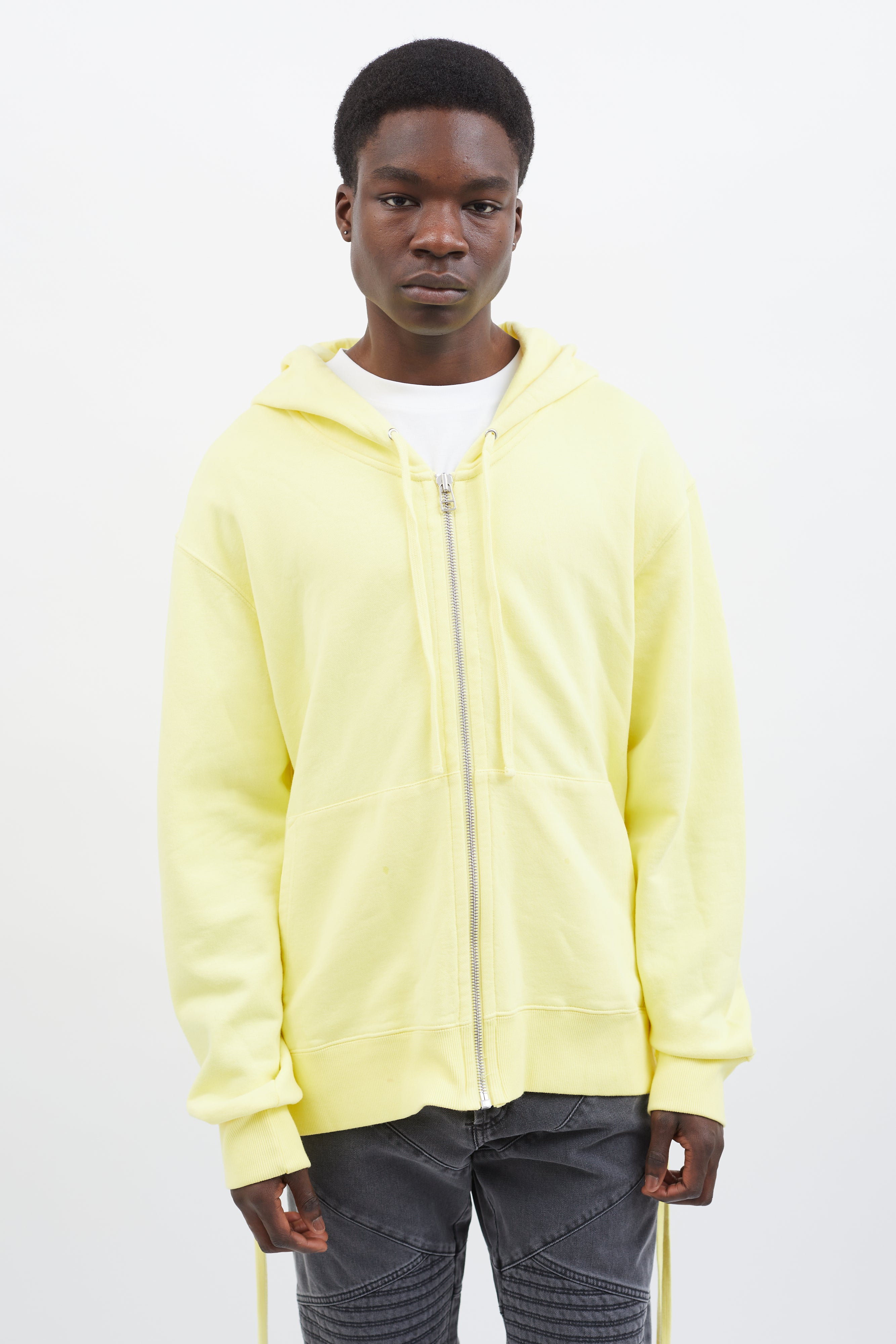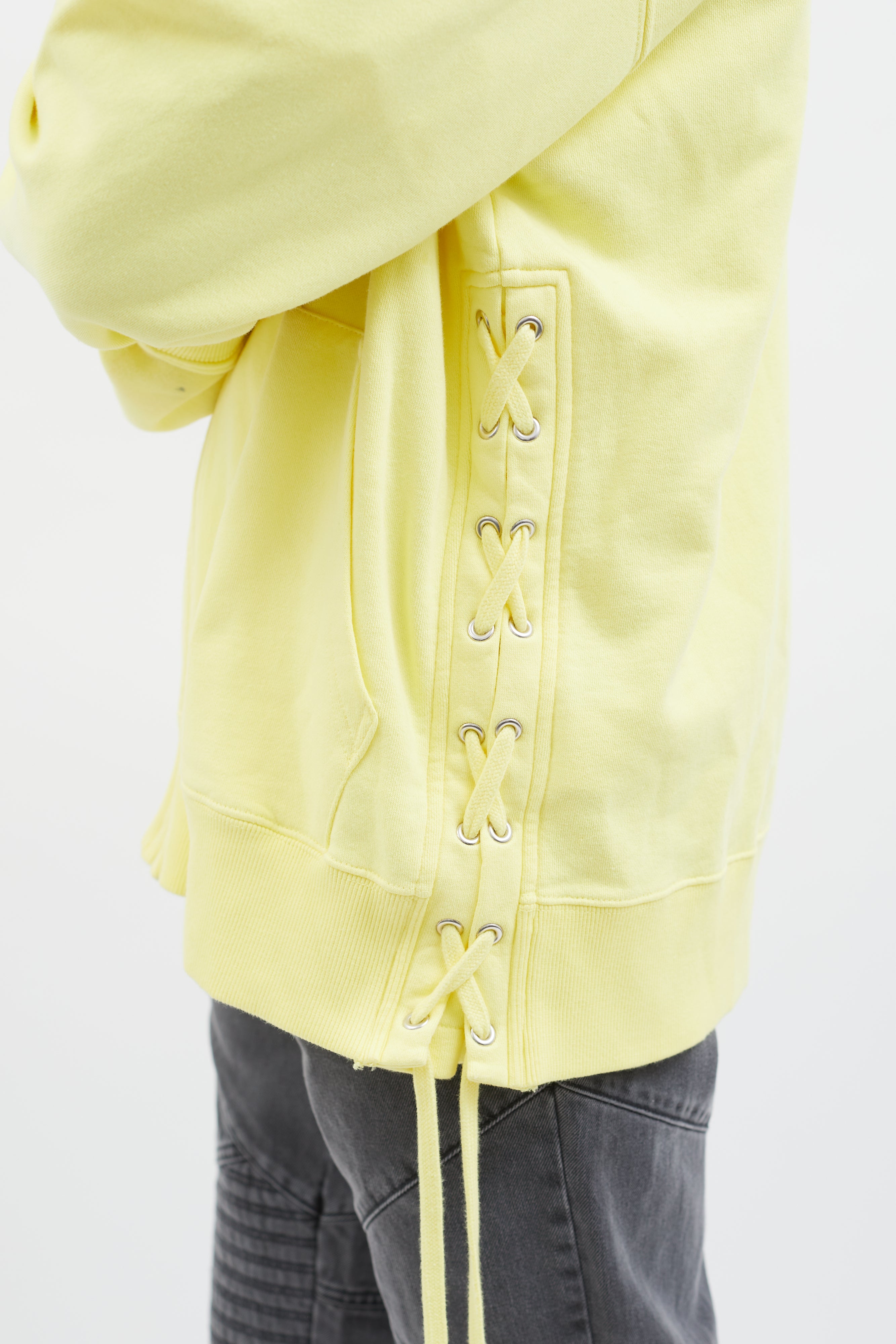 Pre-owned Faith Connexion hoodie in yellow featuring attached hood with drawstring fastener, silver-tone hardware, zipper closure at front, two pockets styling, ribbed cuff and hem, and lace-up details at back.